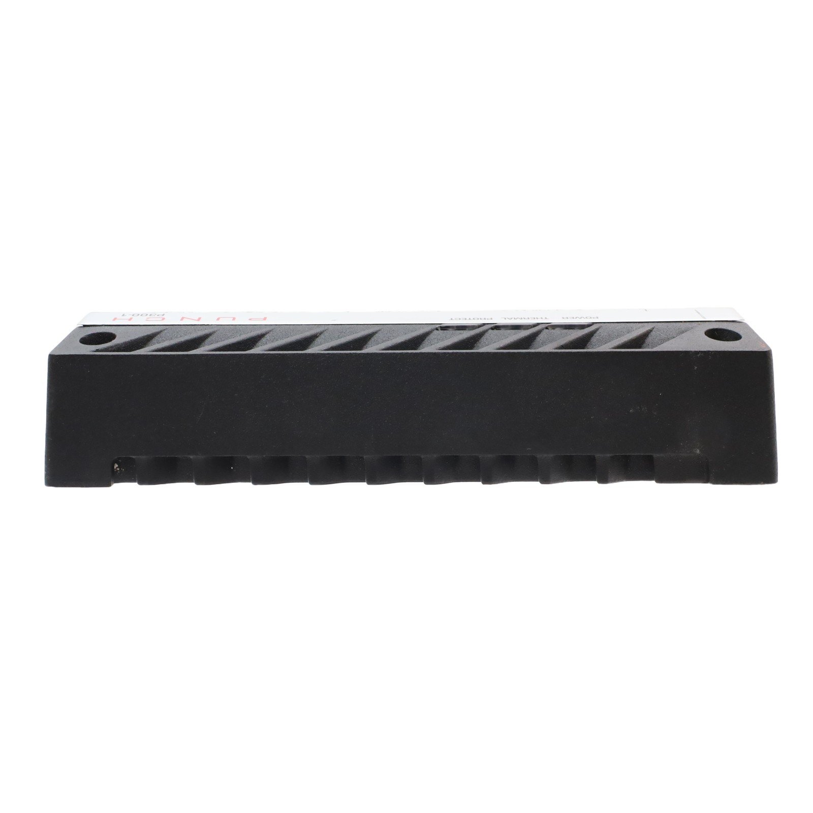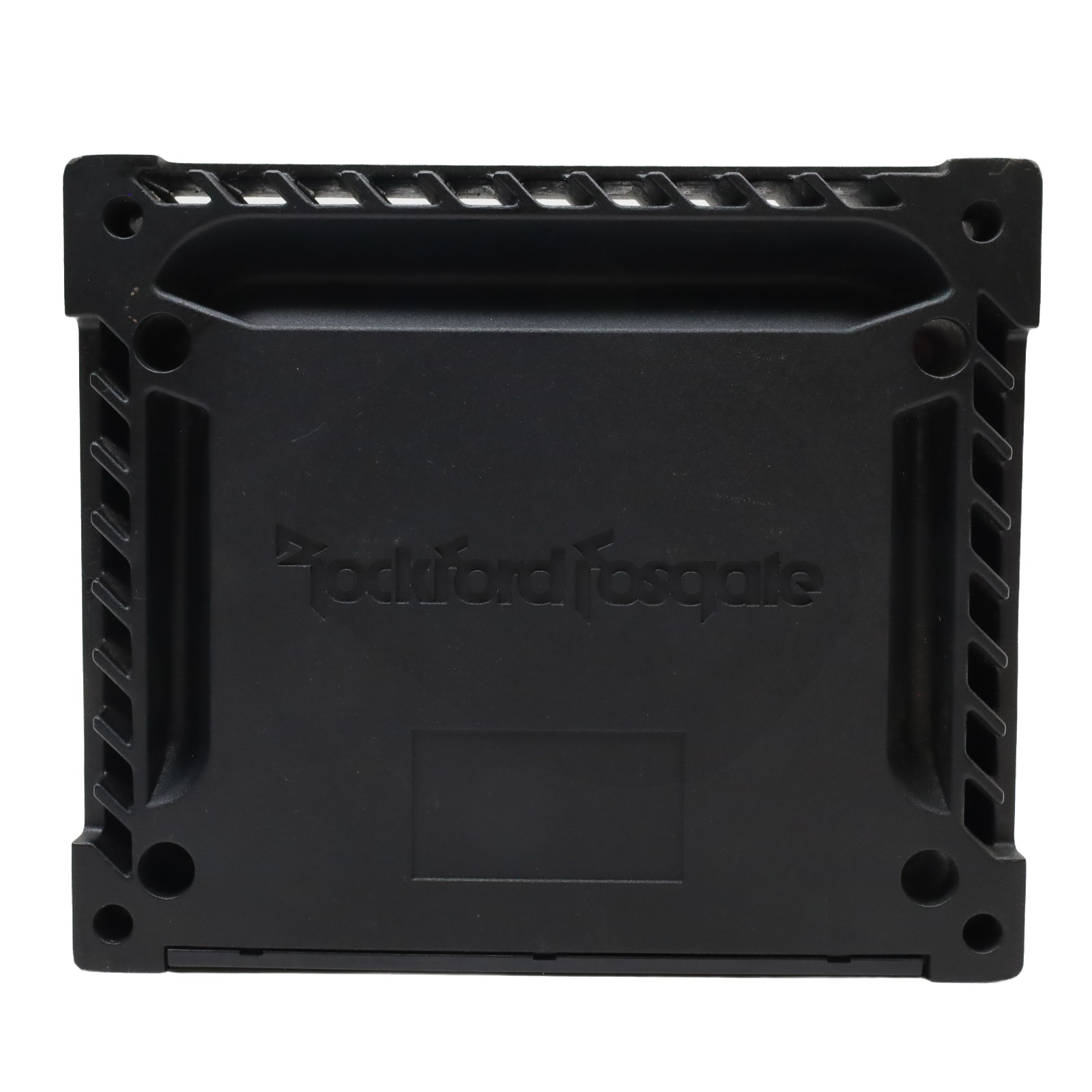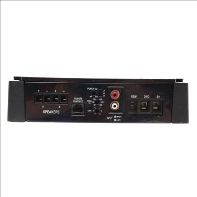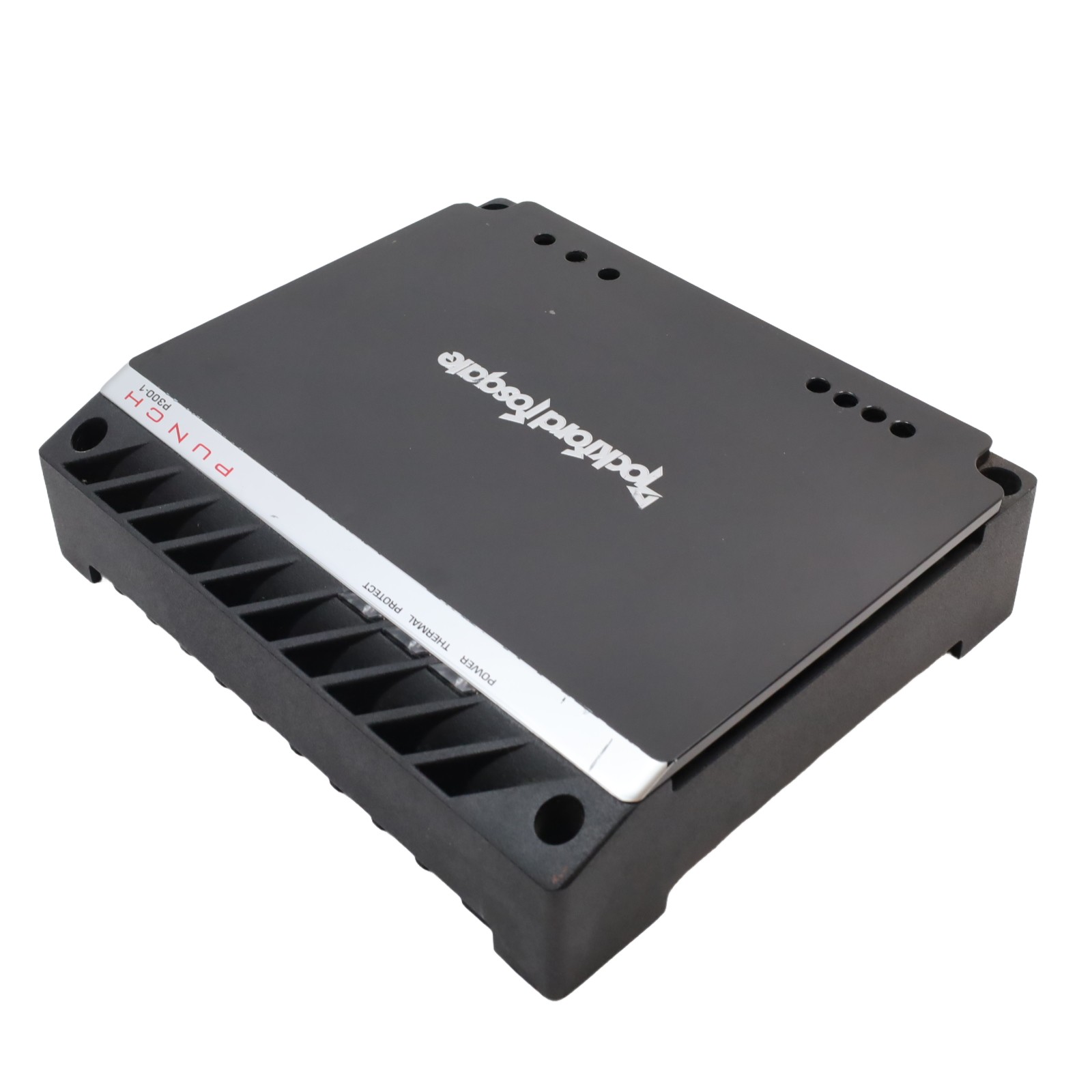A mono subwoofer amplifier delivering 150 watts RMS x 1 at 4 ohms, and 300 watts RMS x 1 at 2 ohms. It features a Class-AB amplifier design with MOSFET power and output stages, and incorporates a Dynamic Thermal Management cooling system to maintain optimal performance. Adjustable high- and low-pass filters (50-500 Hz, 12 dB/octave) are included, alongside variable bass and treble boost controls (0-18 dB at 45 Hz, 0-12 dB at 12K Hz).