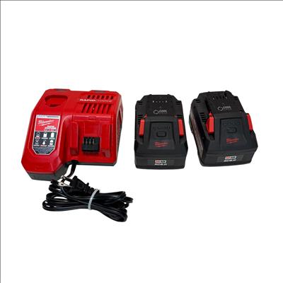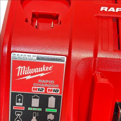 Milwaukee 48-59-1808 M18 & M12 Rapid Charger with 2 M18 XC8.0 REDLITHIUM Batteries delivers fast and efficient charging for both 12-volt and 18-volt lithium-ion power tools. Designed with advanced cooling technology and dual voltage compatibility, this charger optimizes battery performance and lifespan while supporting high-capacity XC8.0 battery packs.