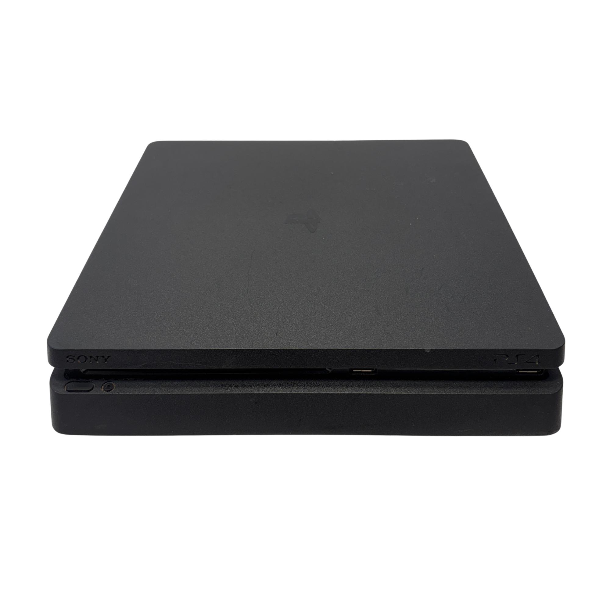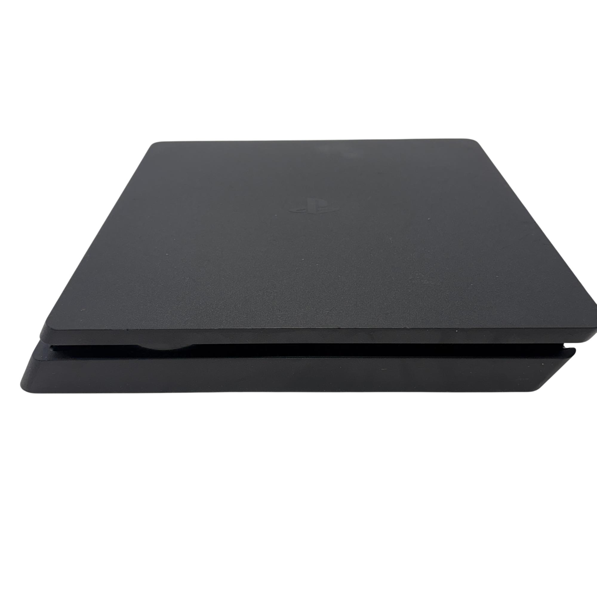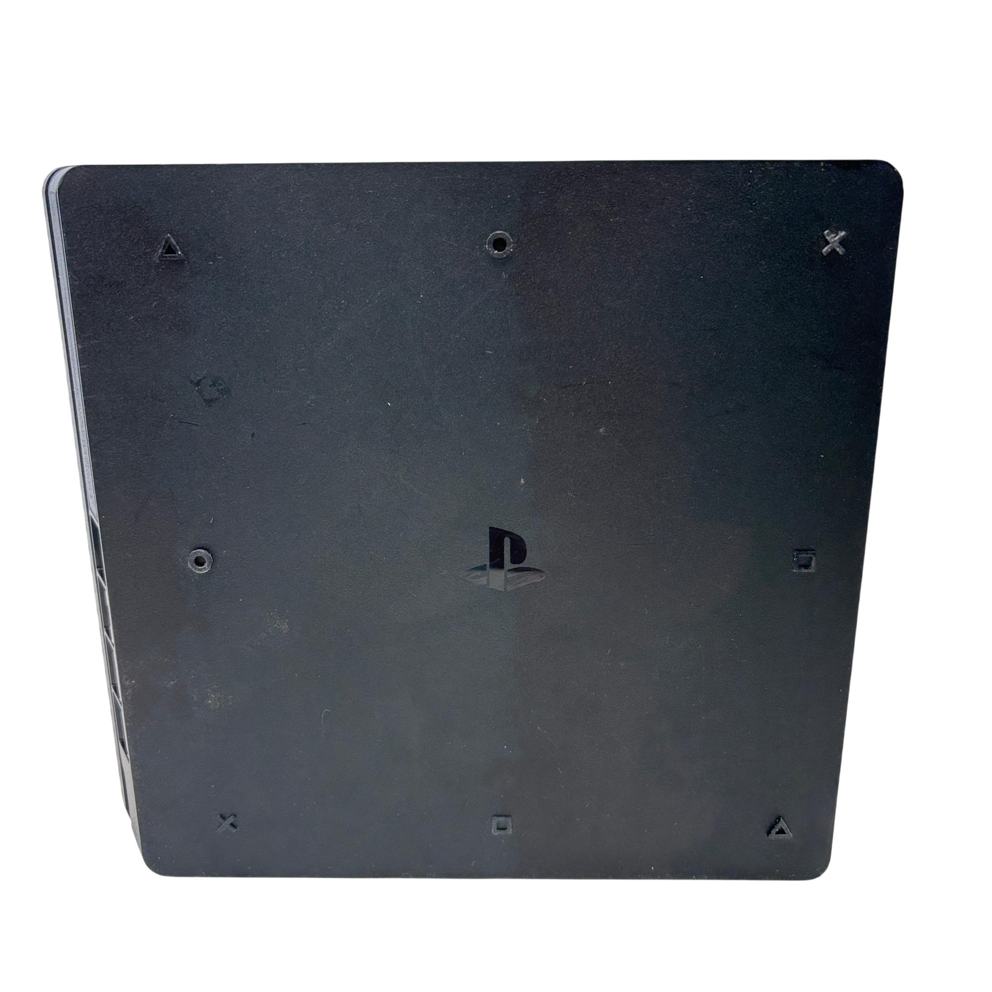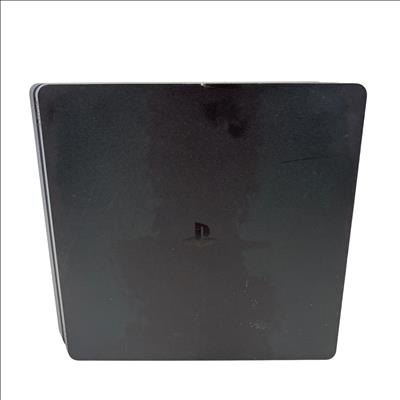 The Sony PlayStation 4 Slim Gaming Console features a sleek matte black design that complements any entertainment setup. This compact console delivers powerful gaming performance with a spacious 1TB hard drive for ample game storage. It combines a modern aesthetic with reliable hardware to enhance the video game experience.