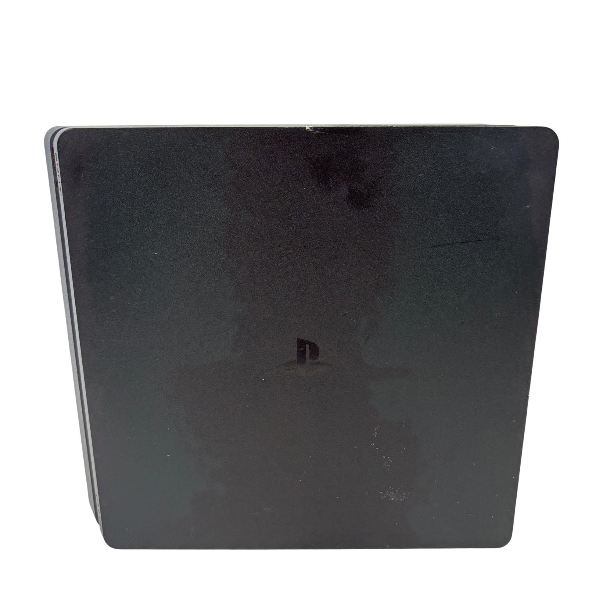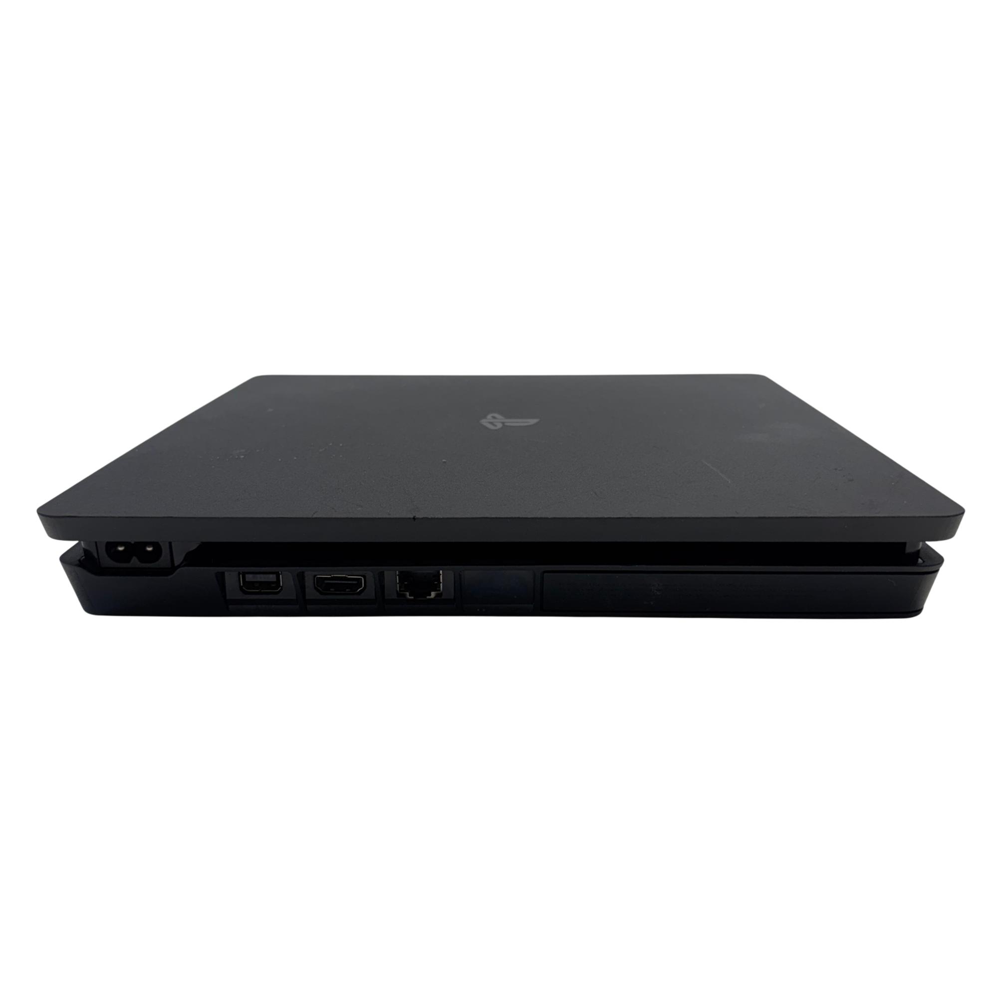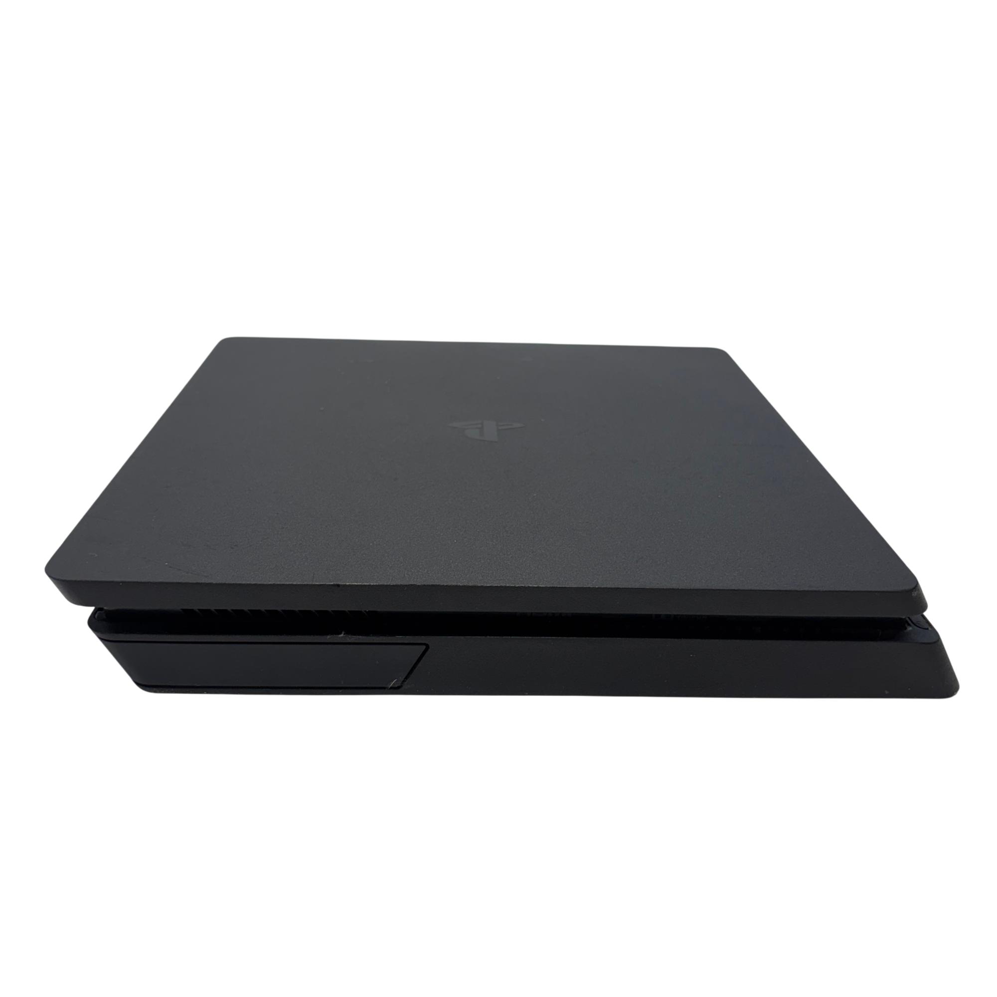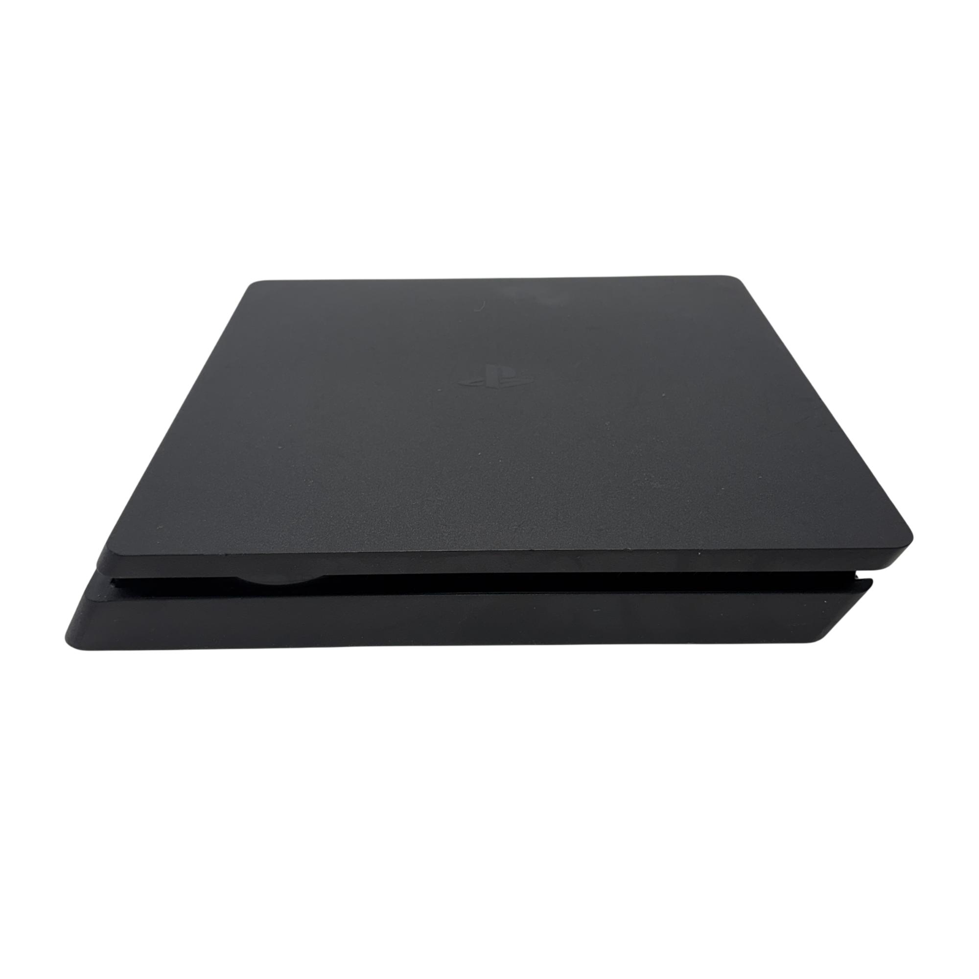 The Sony PlayStation 4 Slim Gaming Console features a sleek matte black design that complements any entertainment setup. This compact console delivers powerful gaming performance with a spacious 1TB hard drive for ample game storage. It combines a modern aesthetic with reliable hardware to enhance the video game experience.
