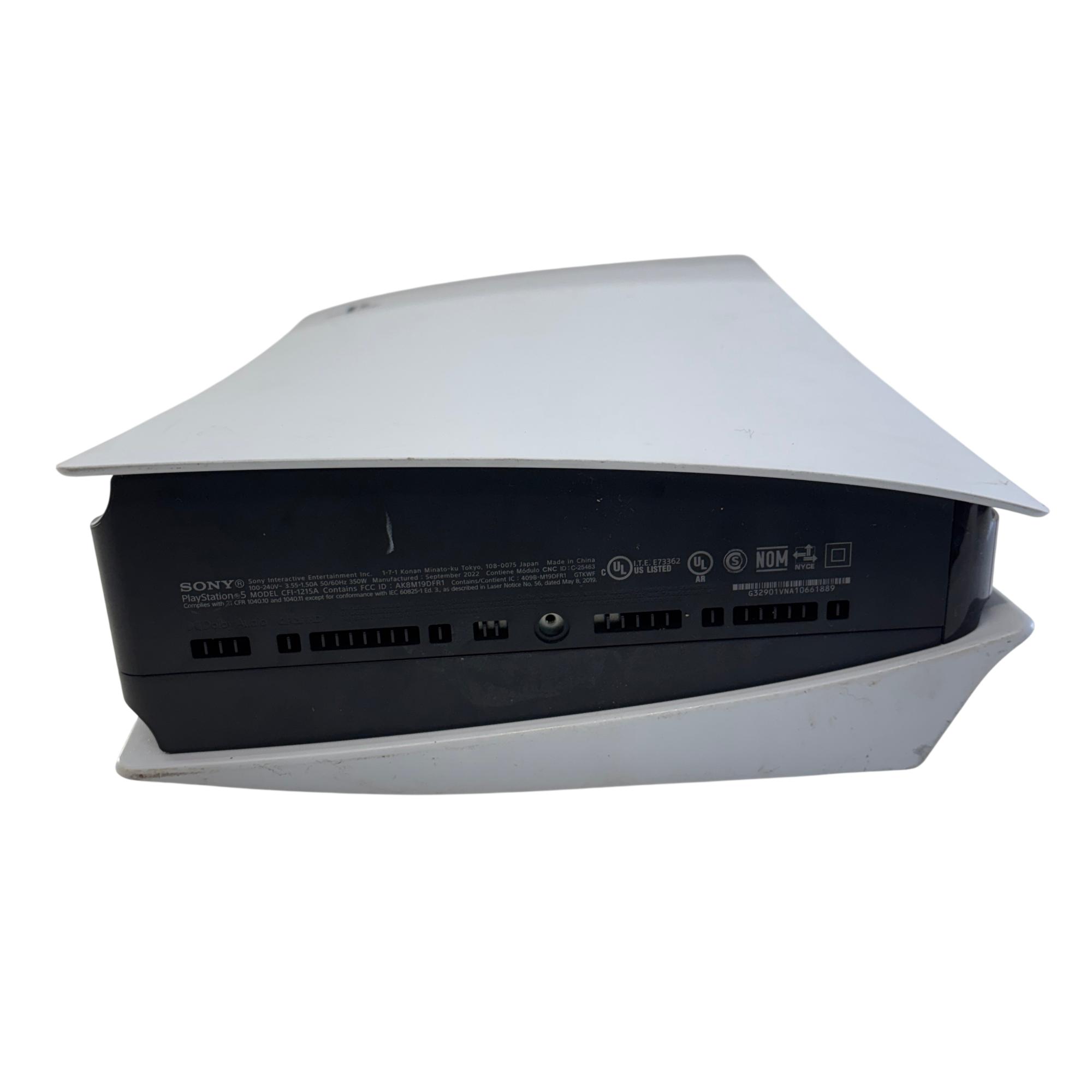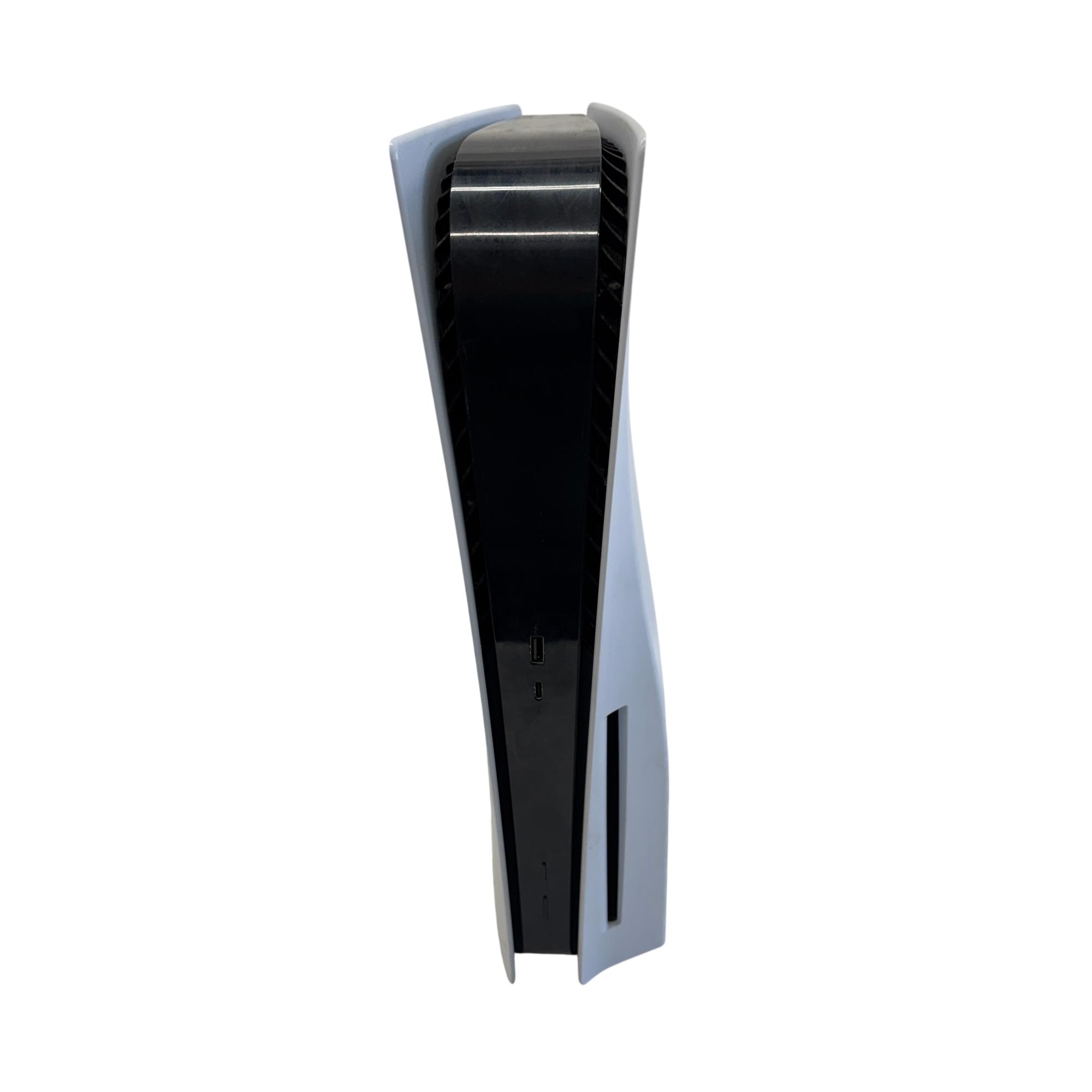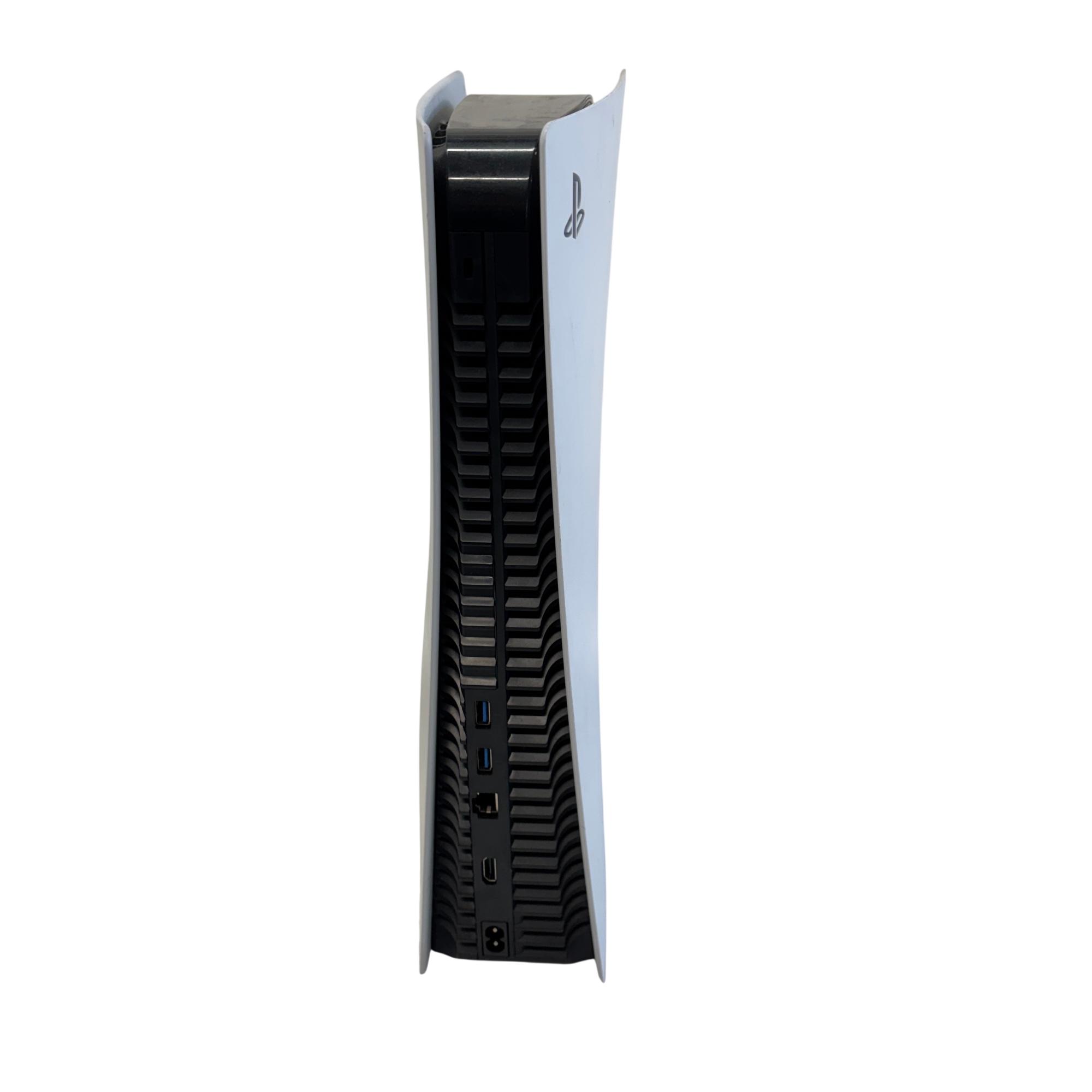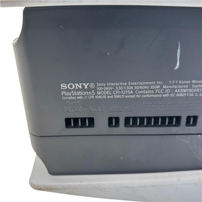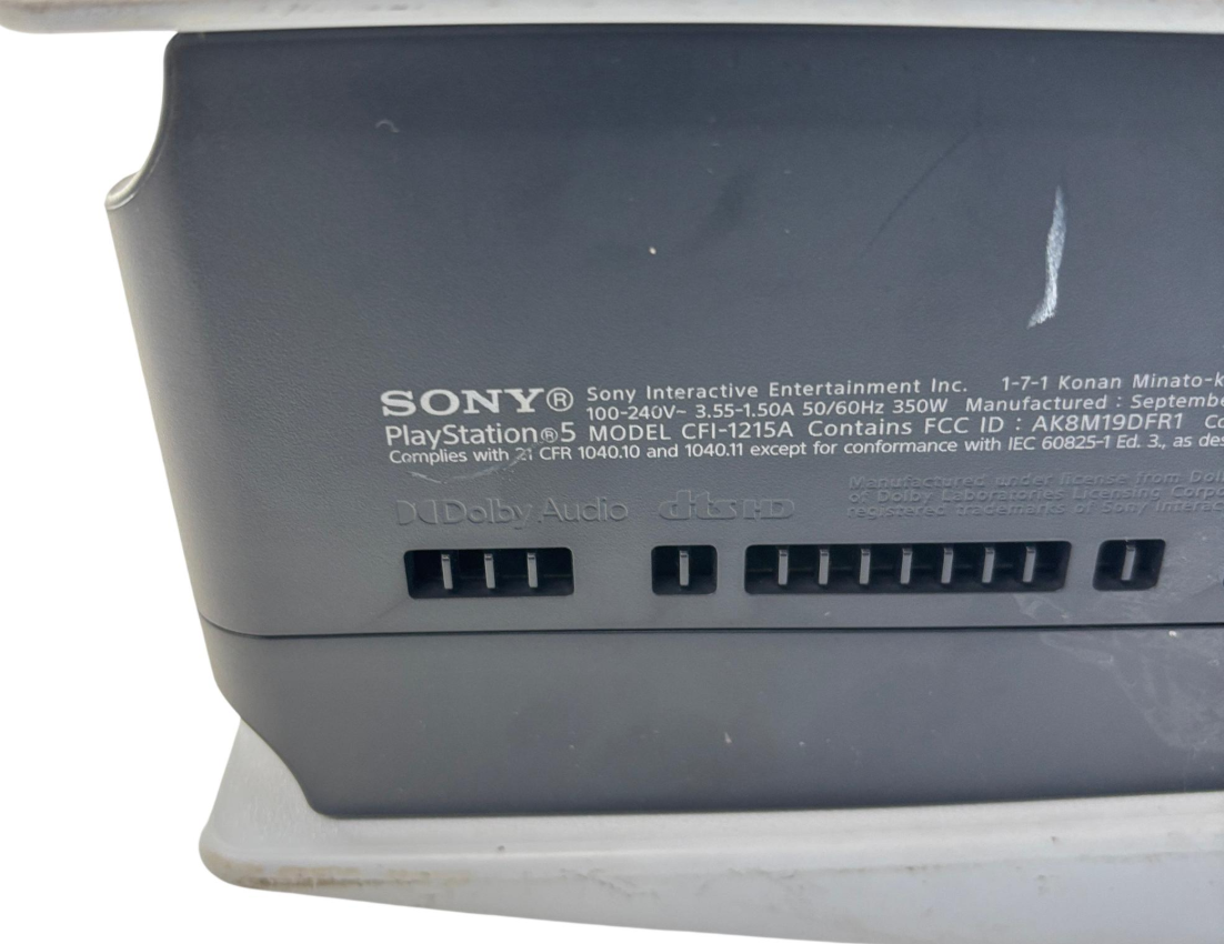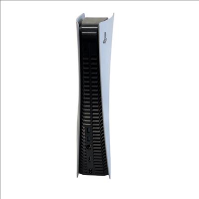 Sony PlayStation 5 Disc Edition Console, Model CFI-1215A, features a sleek black and white design complementing modern gaming setups. This version includes a built-in disc drive for physical game media and supports 4K graphics for an immersive gaming experience. Its design incorporates a distinctive rectangular form with a streamlined structure and subtle branding details.