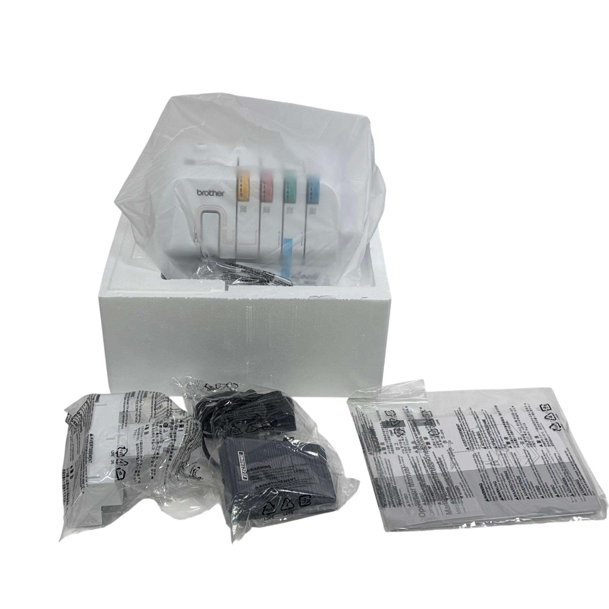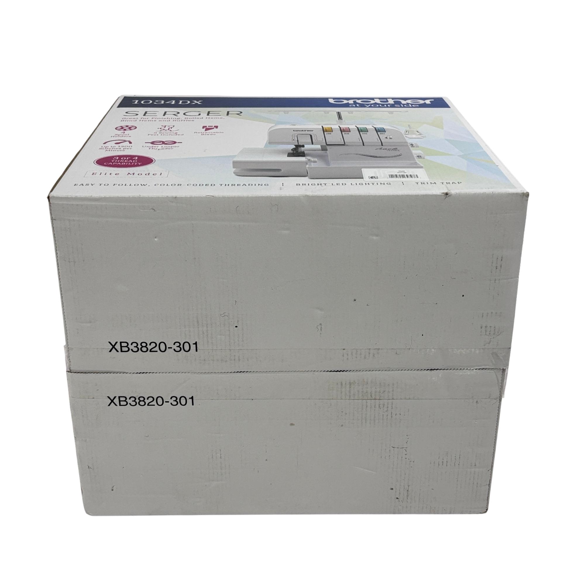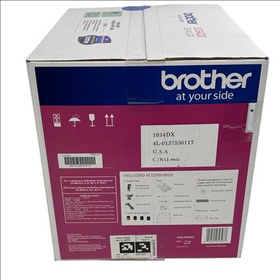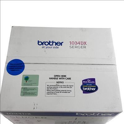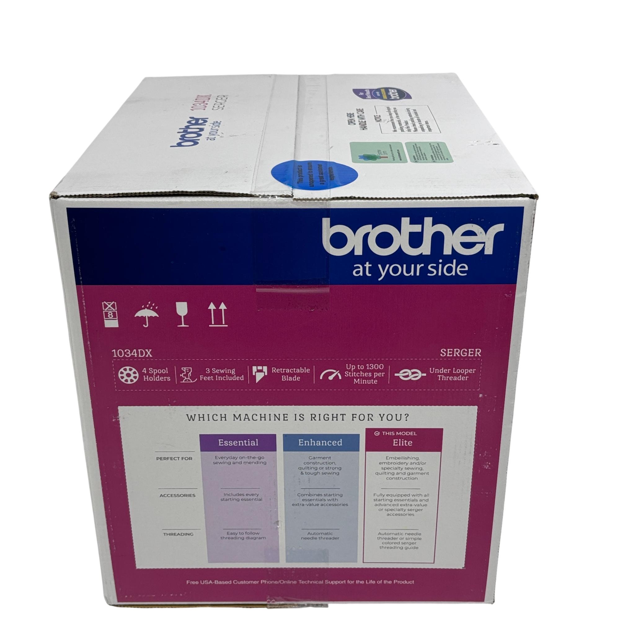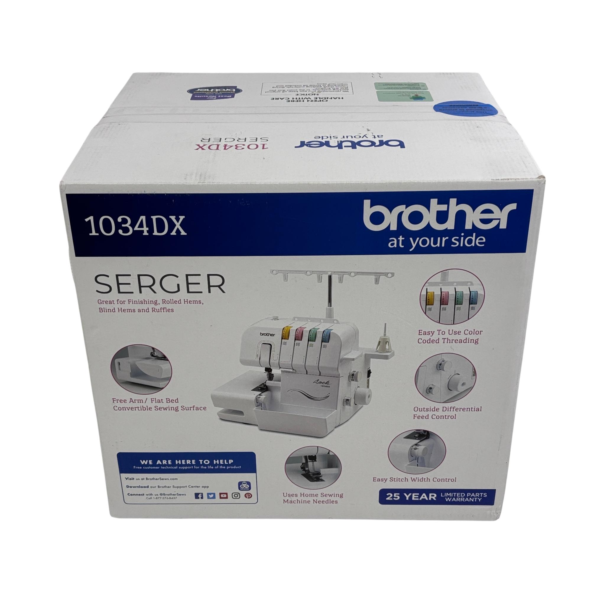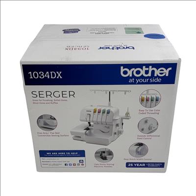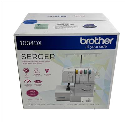 Brother 1034DX Serger Sewing Machine - 3/4 Thread Capability, Elite Model offers versatile stitching with easy-to-use color-coded threading and up to 1300 stitches per minute. Designed with a durable metal frame and differential feed, it excels at finishing, rolled hems, blind hems, and ruffles, making it ideal for home sewing projects.