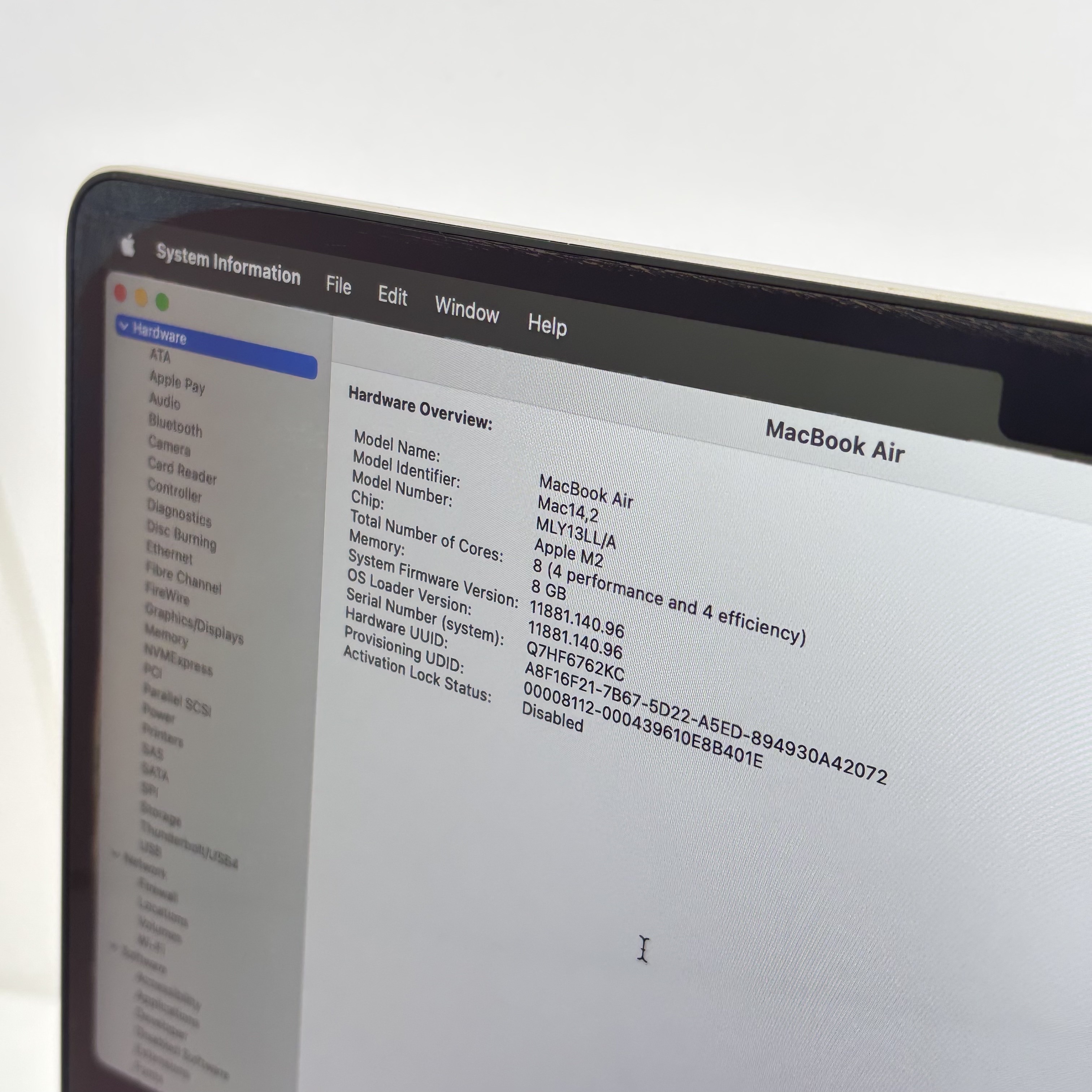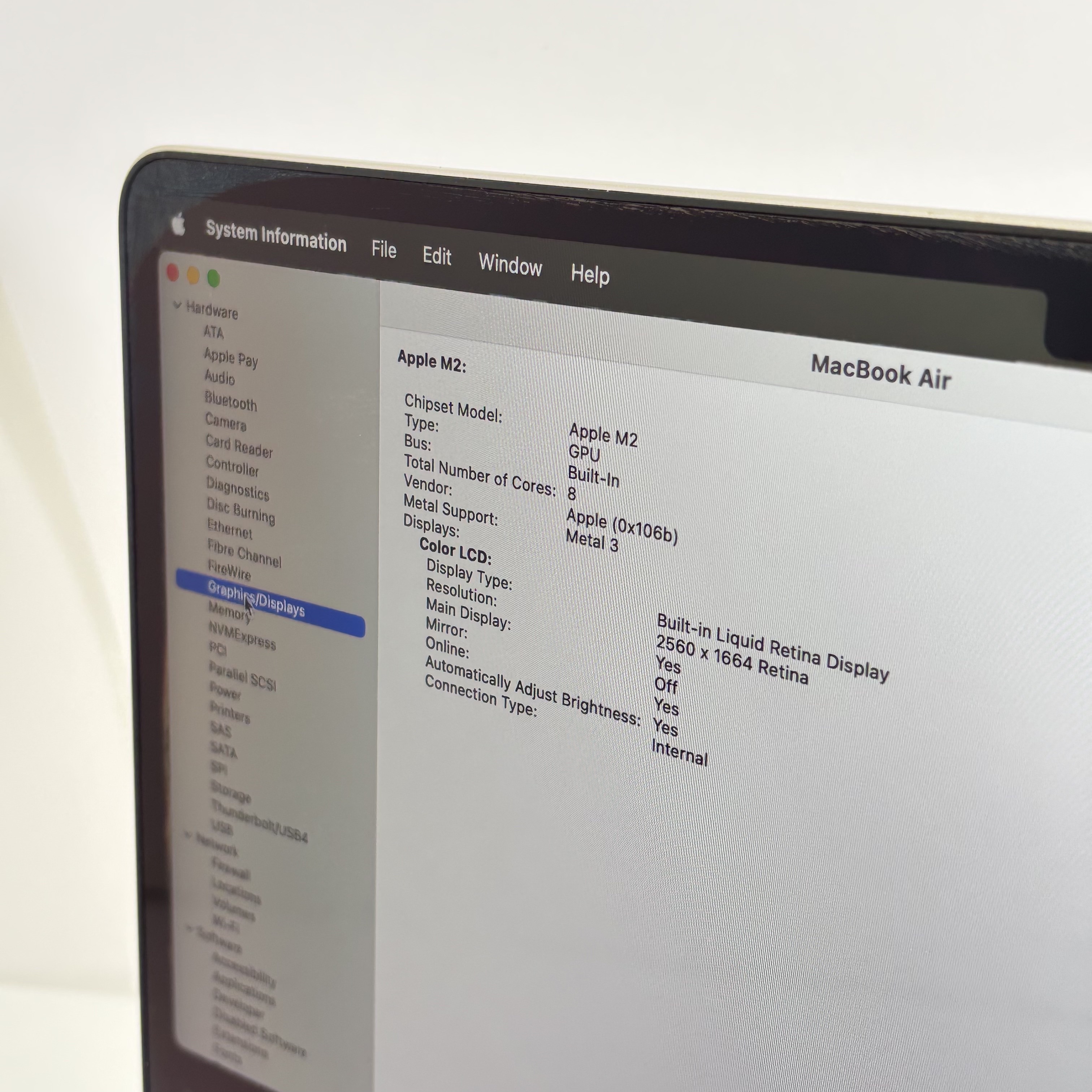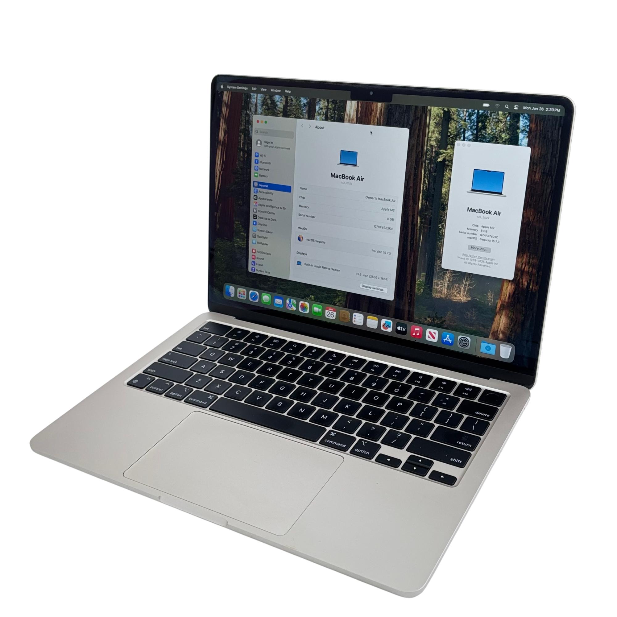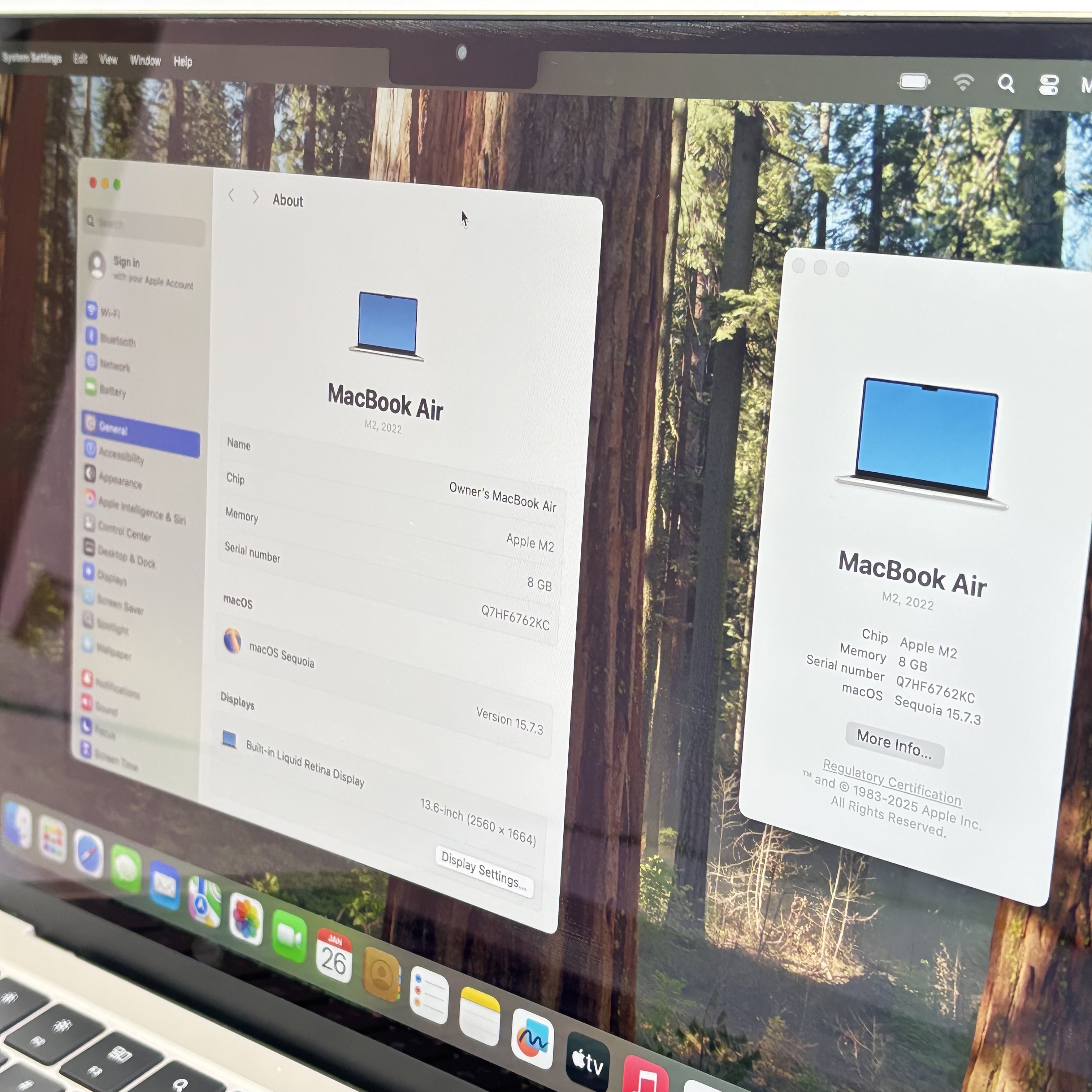 Apple MacBook Air 13" (2022) features the powerful M2 chip, delivering efficient performance paired with 8GB of RAM and a 256GB SSD for fast storage. This lightweight laptop offers a 13.6-inch Liquid Retina display with a 2560 x 1664 resolution, providing vibrant and sharp visuals ideal for both work and entertainment. Running macOS Sequoia 15.7, it ensures a smooth and intuitive user experience with advanced system settings and accessibility options.