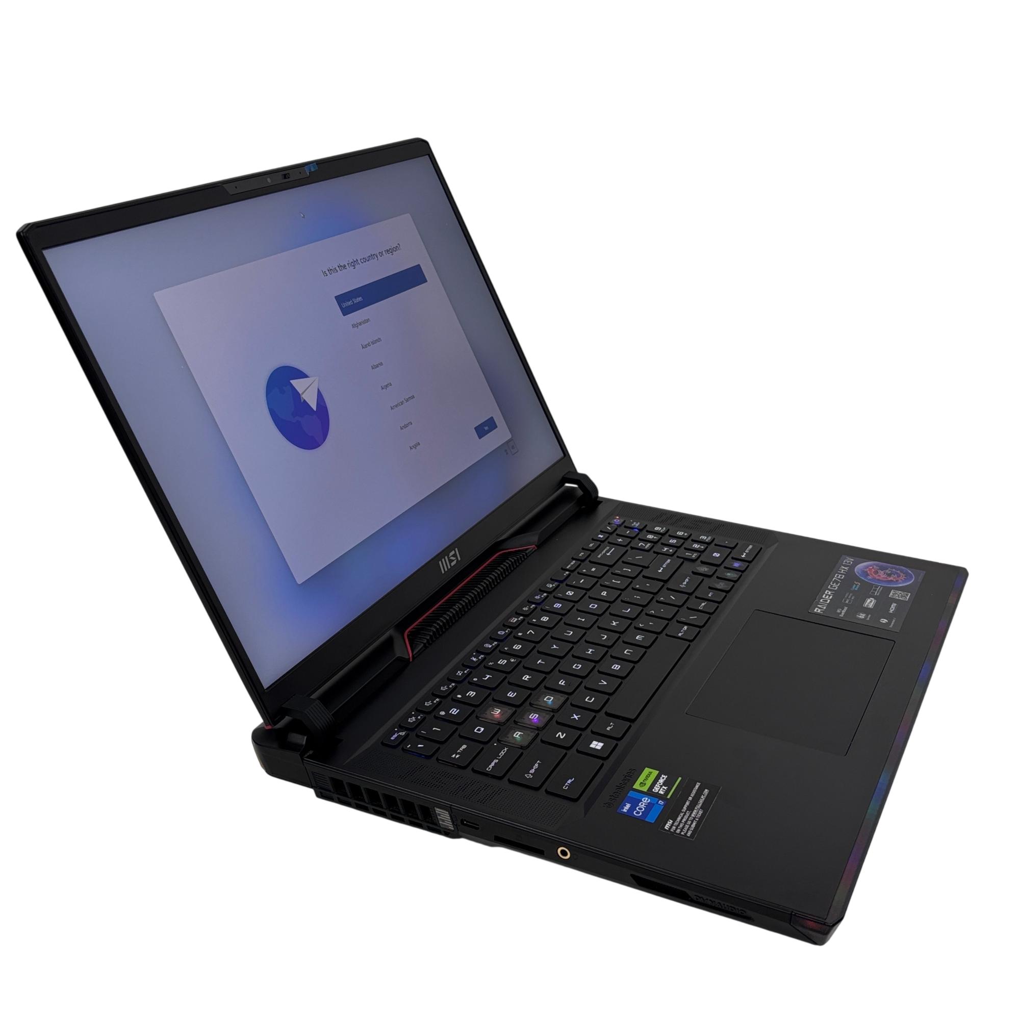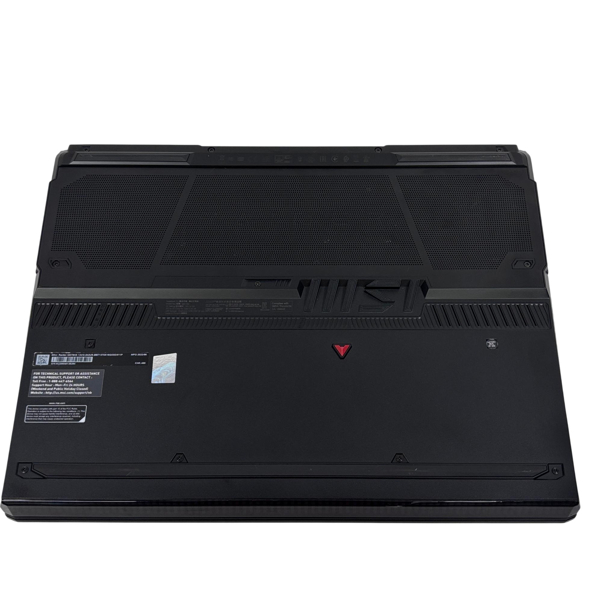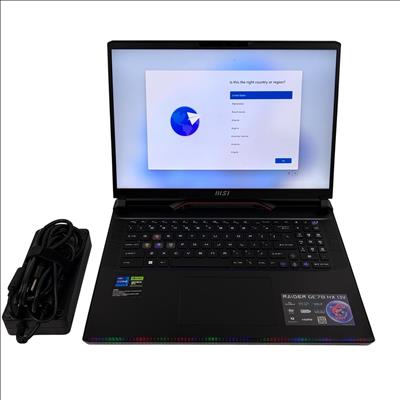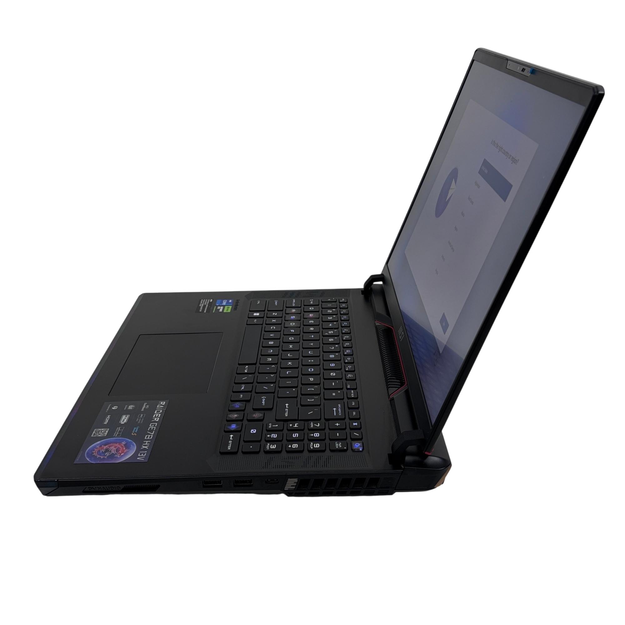 MSI Raider GE78 HX 13V Gaming Laptop features a powerful Intel Core processor and NVIDIA GeForce graphics, designed for high-performance gaming and multimedia tasks. This 17-inch black laptop combines advanced hardware components with a sleek design to deliver immersive visuals and smooth gameplay experiences optimized for serious gamers.
