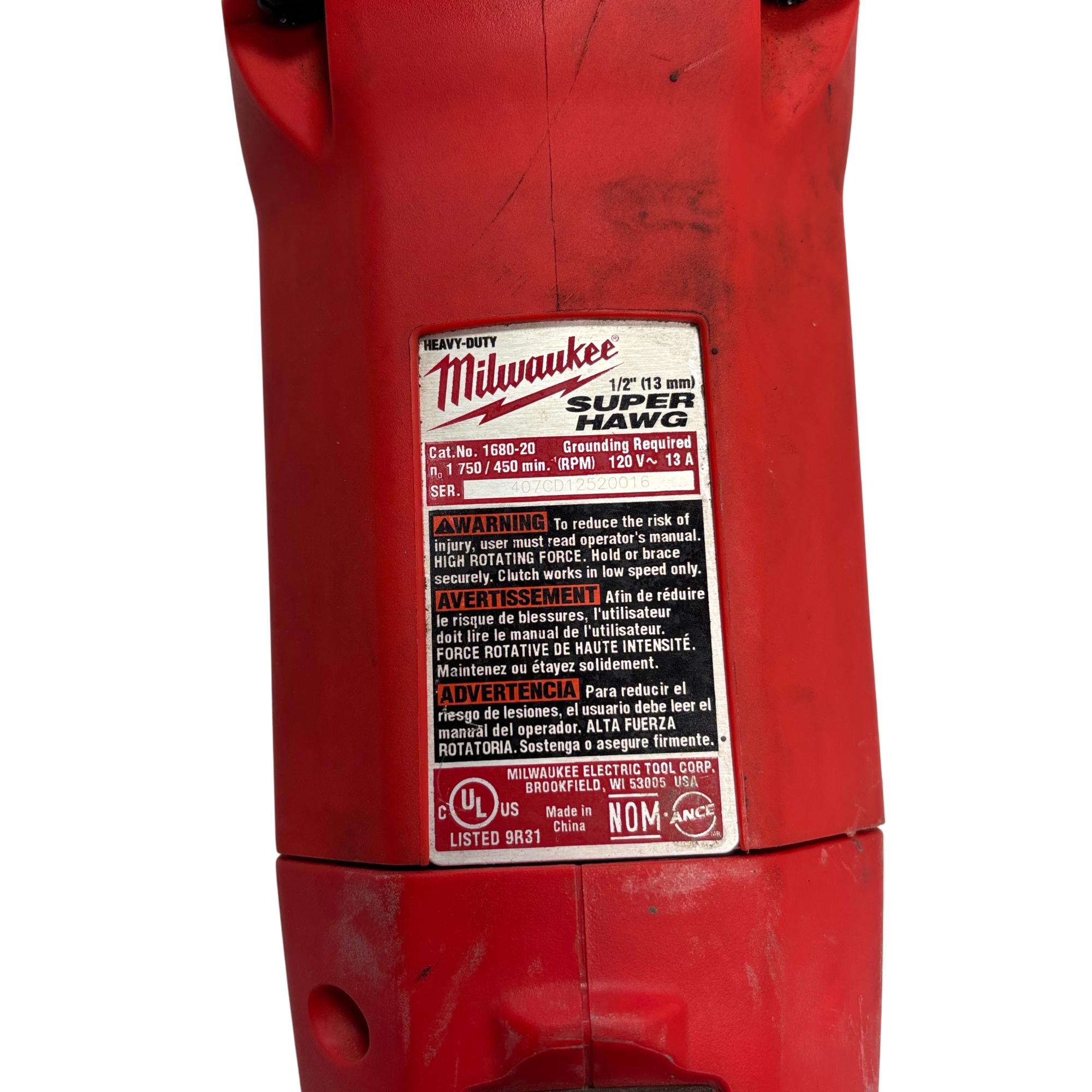 The Milwaukee 1680-20 1/2" Super Hawg Corded Right Angle Drill offers a powerful 13-amp motor designed for demanding drilling applications. Its corded design and right-angle configuration allow for easy handling and precision in tight spaces, making it ideal for heavy construction and professional use.