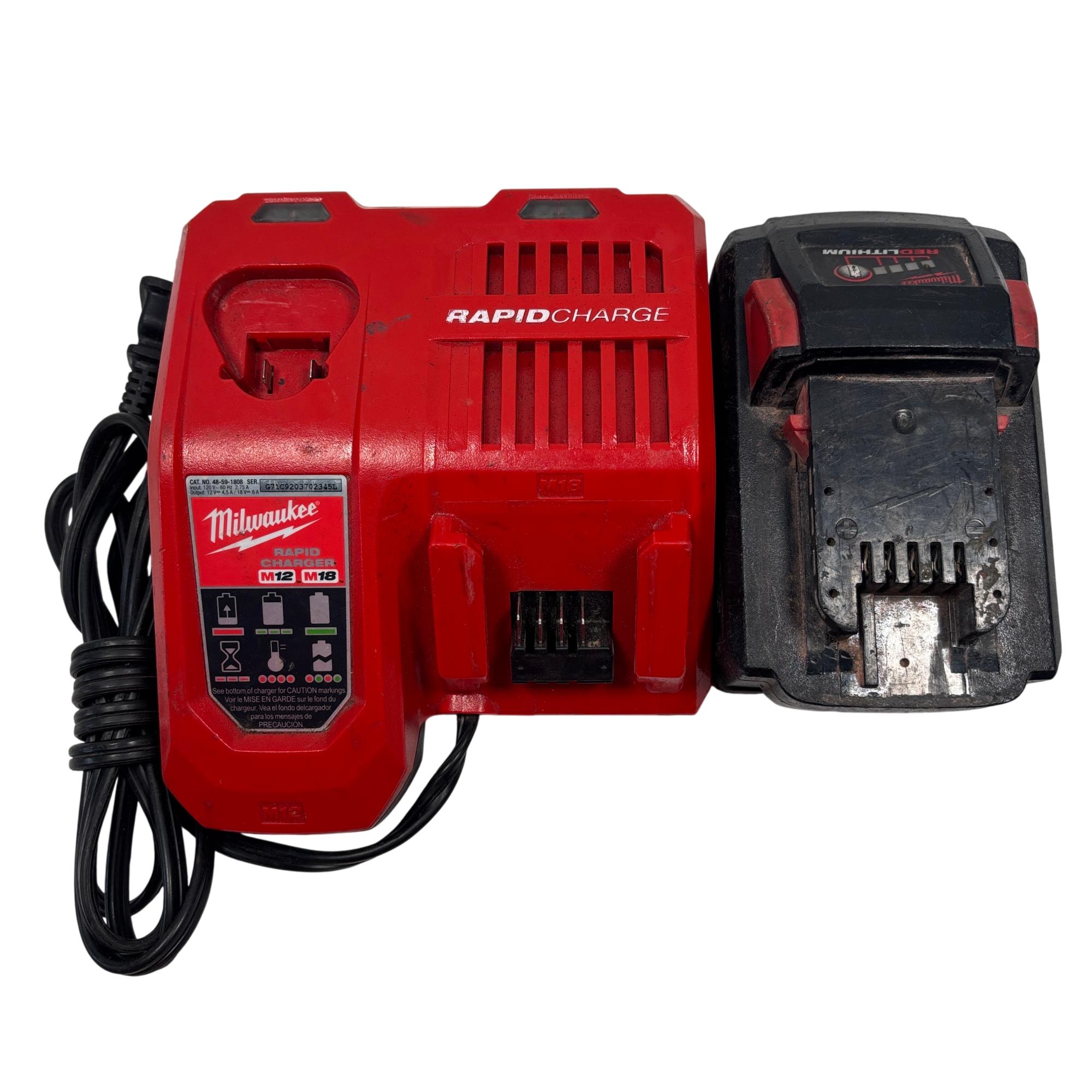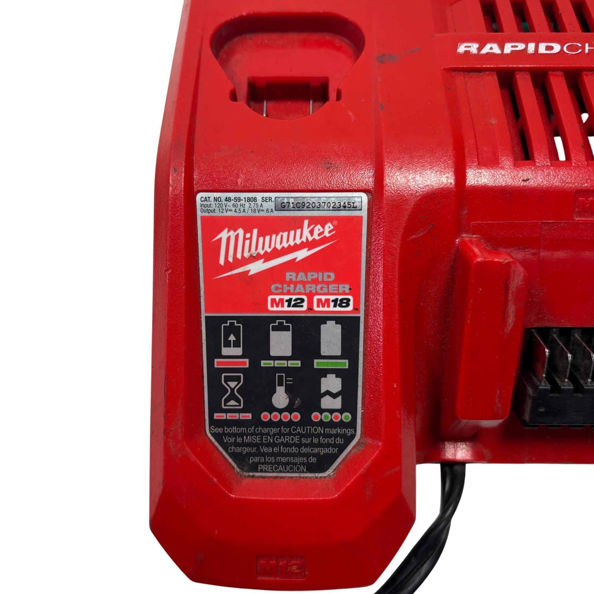 The Milwaukee 48-59-1808 M12/M18 Rapid Charger delivers high output charging performance compatible with both 12 volt and 18 volt Milwaukee batteries. Designed for efficient and rapid power tool battery charging, this charger supports REDLITHIUM battery technology with optimized current output for reliable recharge cycles.