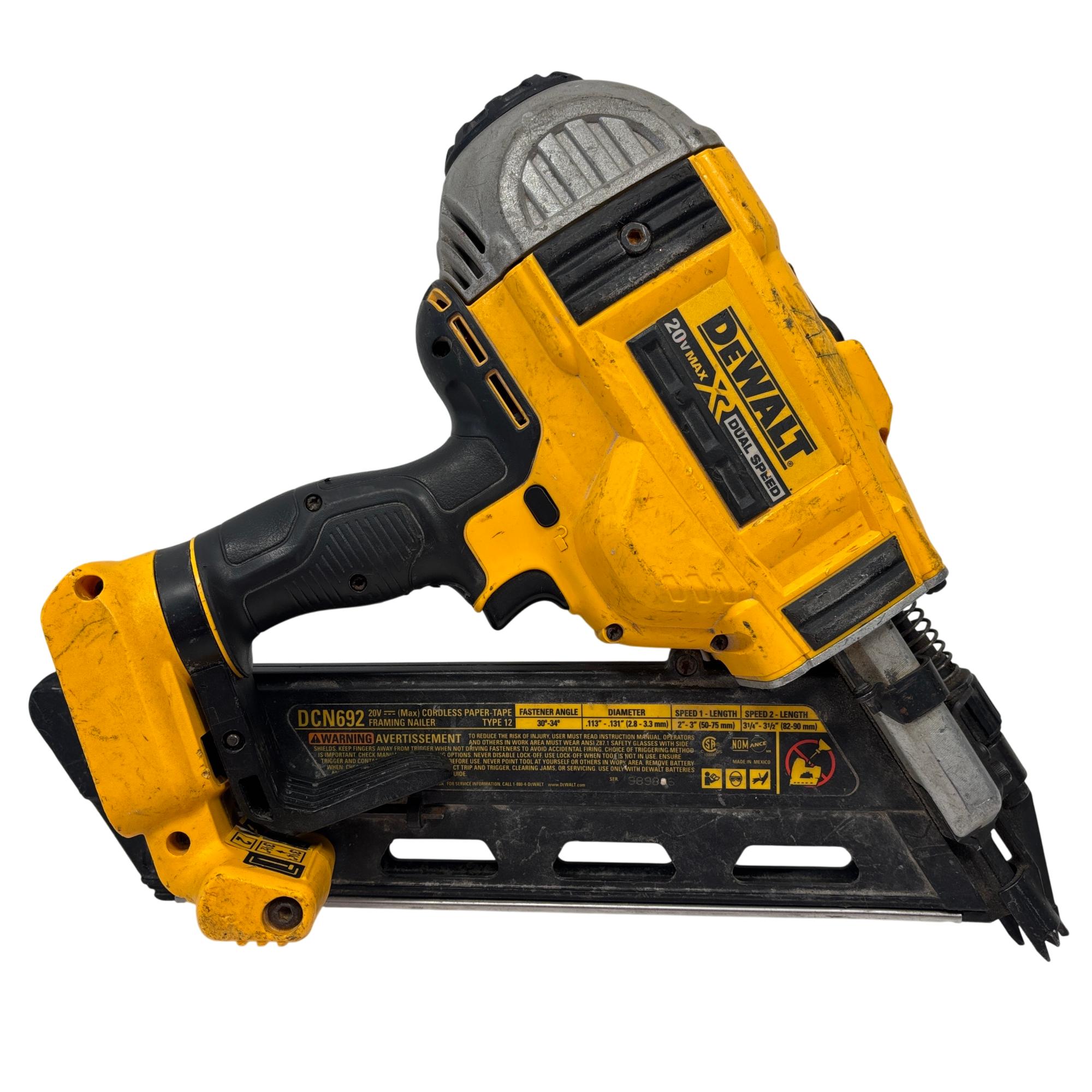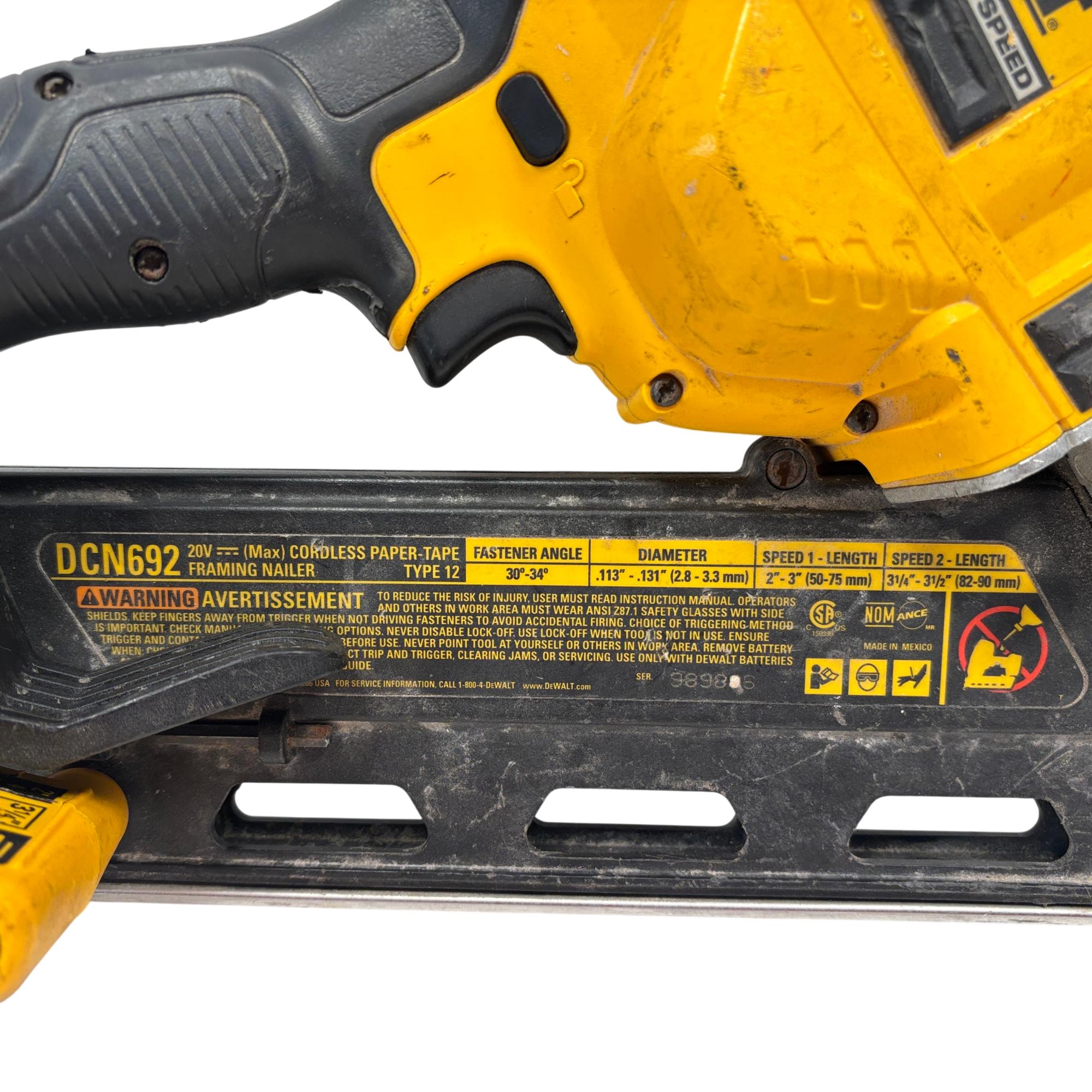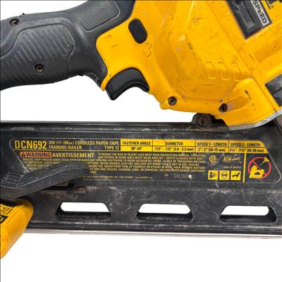 The DeWalt DCN692 20V MAX XR Brushless Cordless 30° Paper Collated Framing Nailer delivers powerful performance with its dual-speed motor for versatile nailing applications. Designed for framing tasks, this cordless nailer offers cordless convenience and a robust build ideal for professional construction use. Its compact design and 20V MAX battery platform ensure durability and efficiency on the job site.