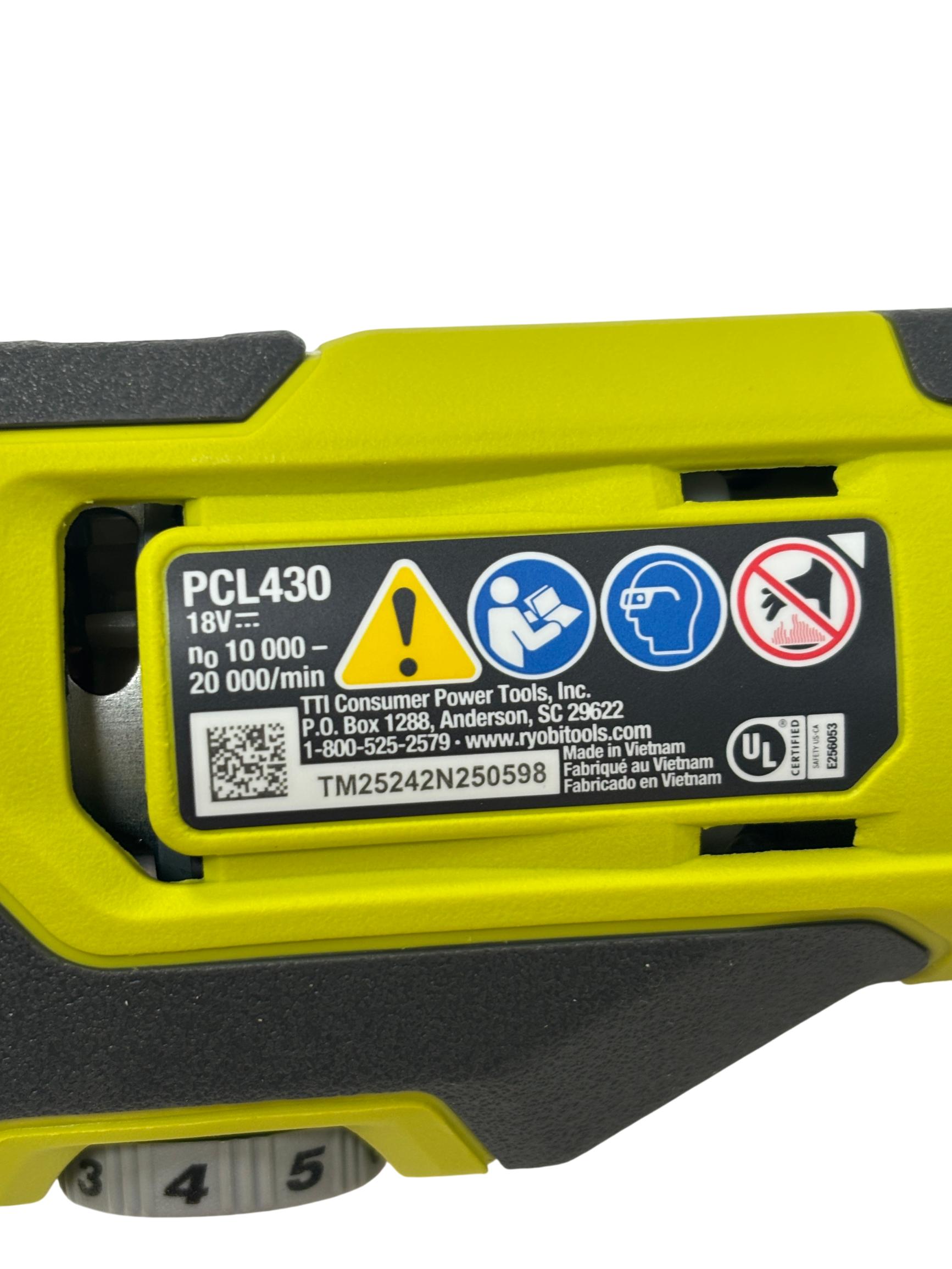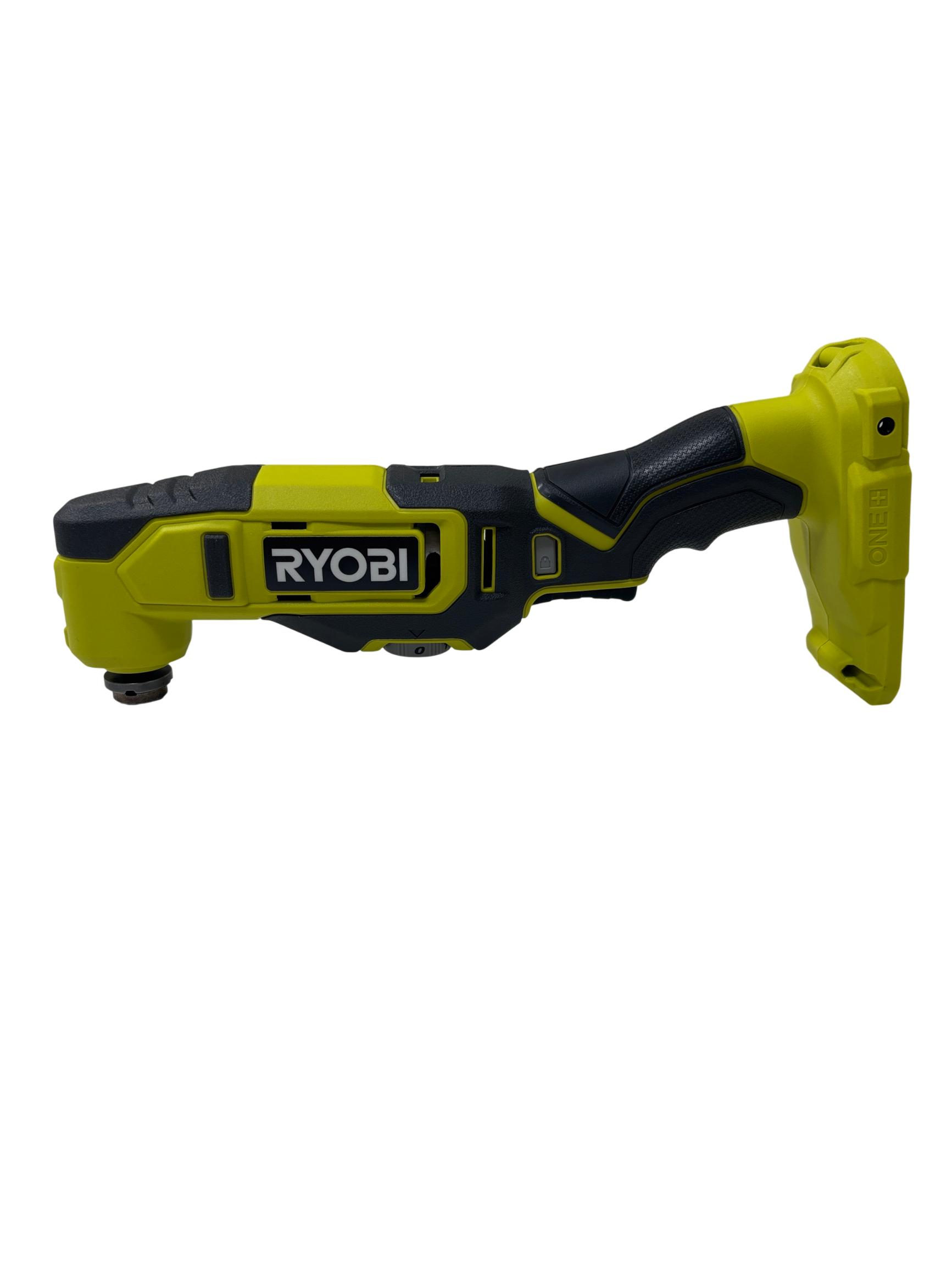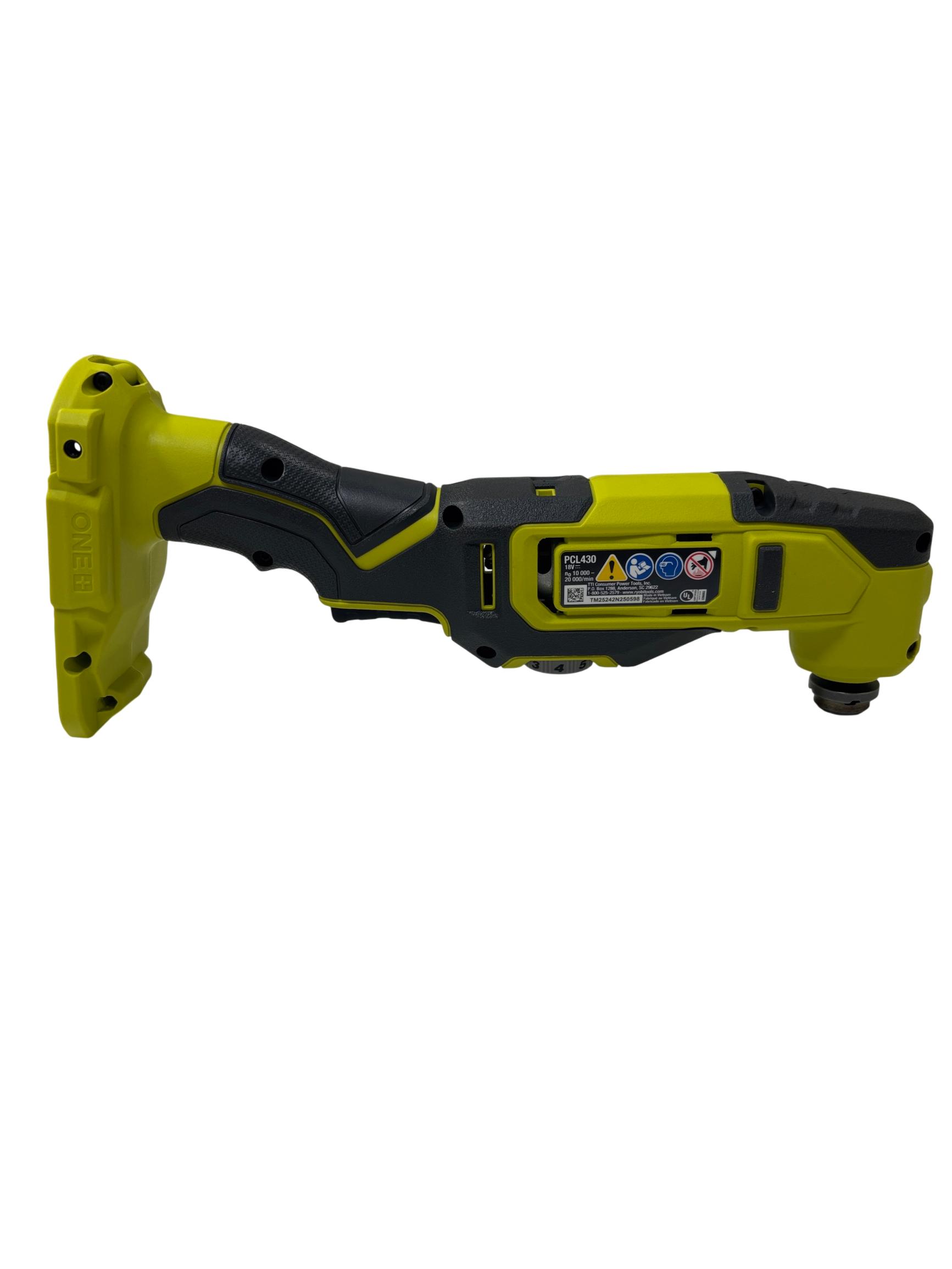 The Ryobi PCL430 ONE+ 18-Volt Lithium-Ion Compact Cordless Multi-Tool offers fast cutting with up to 20,000 OPM and features the lowest vibration in its class for smooth operation. Its ergonomic design and lock-on button reduce user fatigue, while the variable speed dial adapts to various applications. Equipped with convenient on-board hex key storage and an LED worklight, this multi-tool ensures precision and visibility for versatile tasks.
