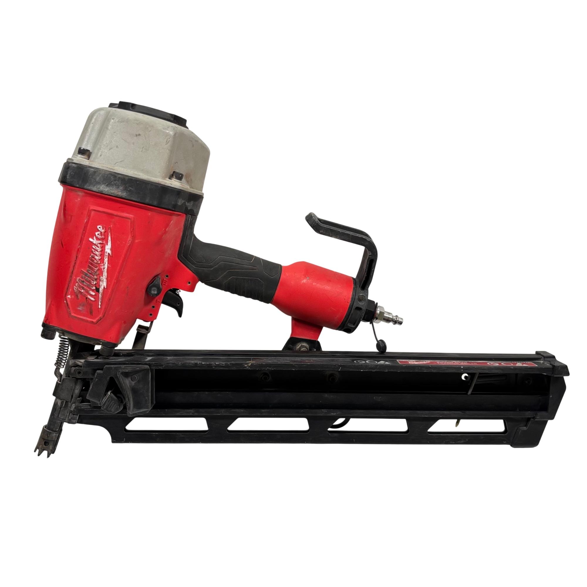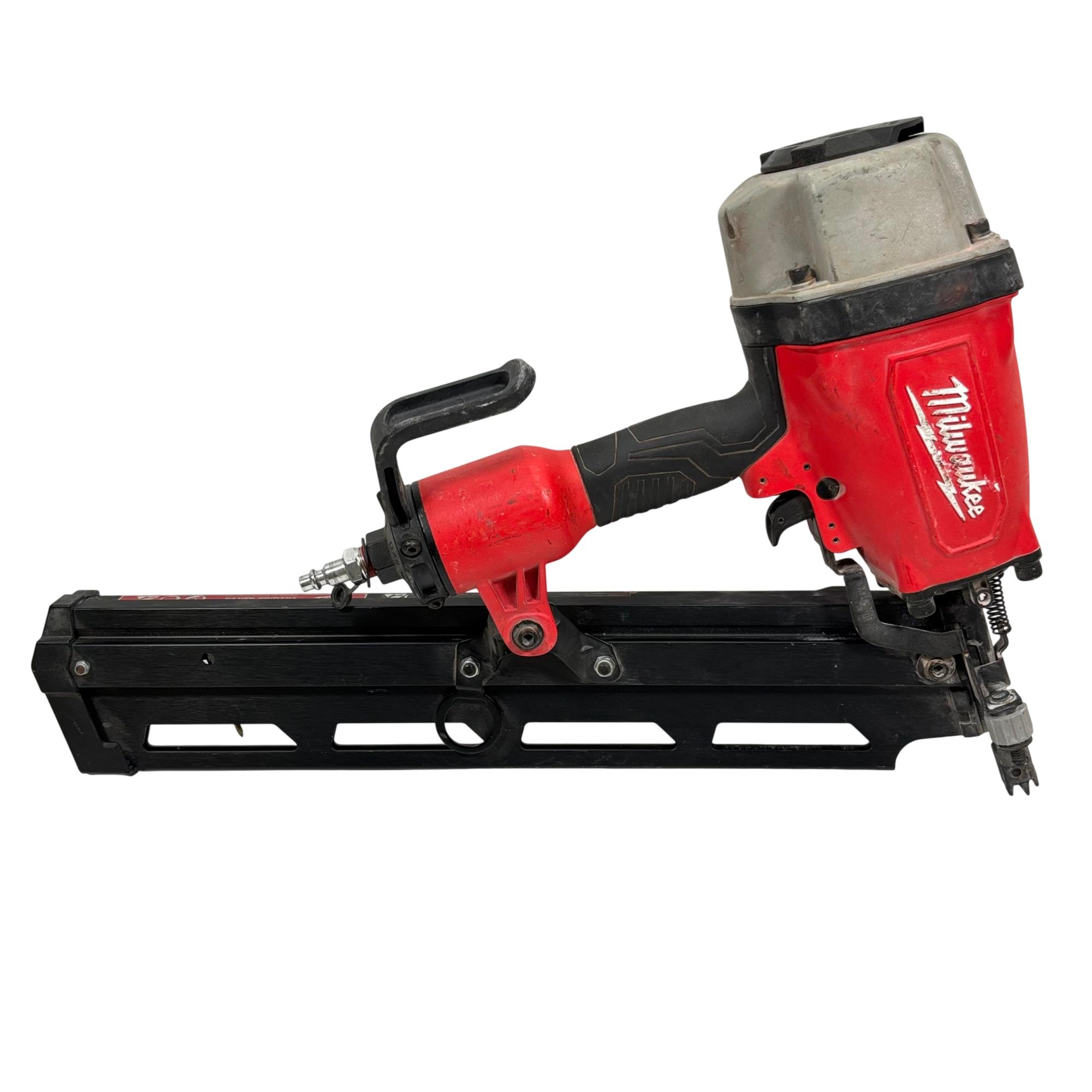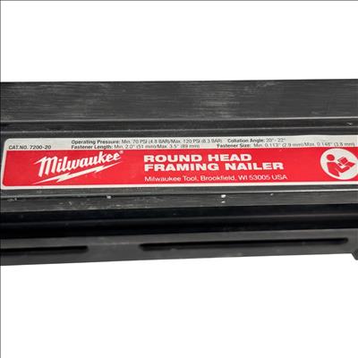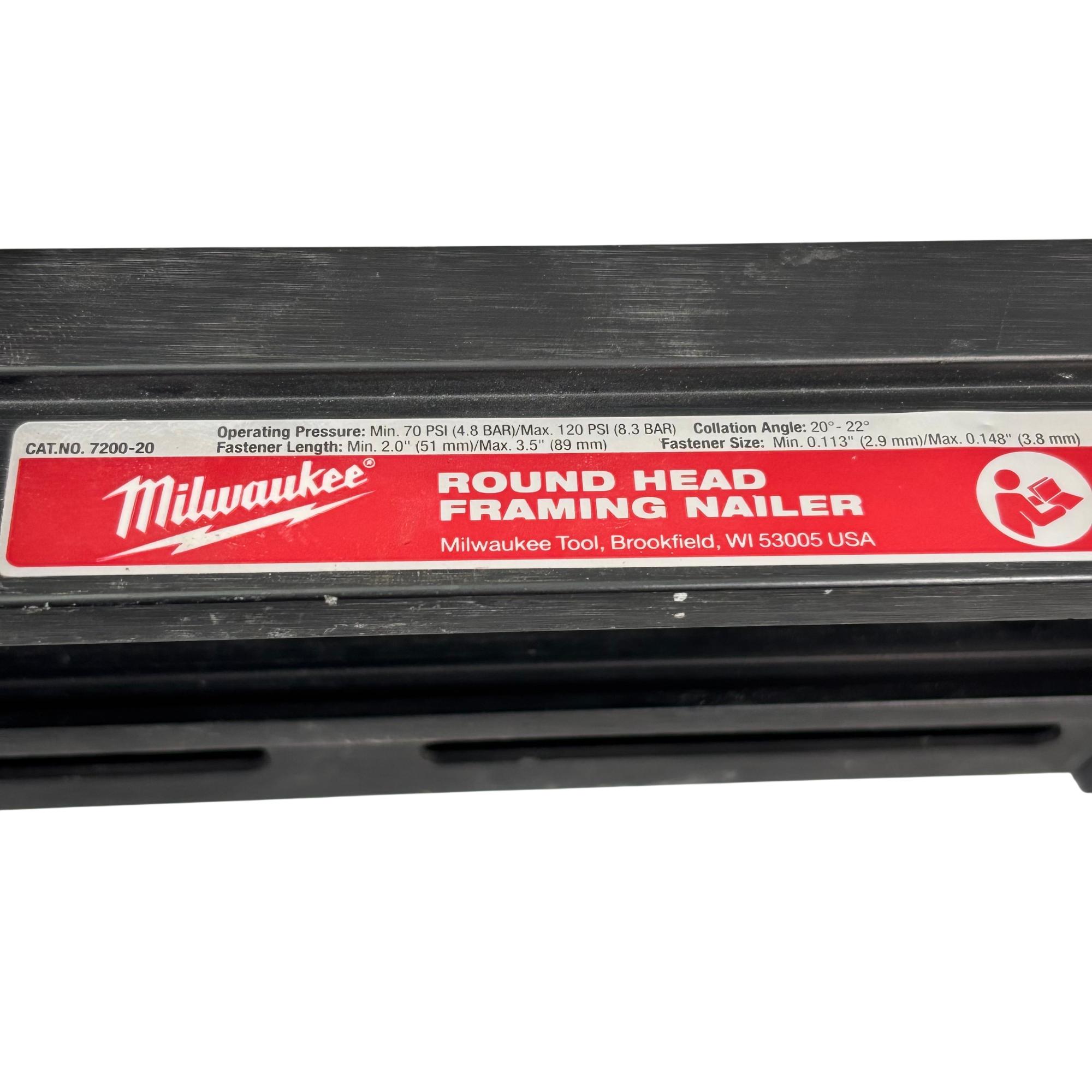 Milwaukee 7200-20 3-1/2" Full Round Head Framing Nailer is a pneumatic tool designed for heavy-duty framing applications. It delivers precise and consistent nail placement with a durable build, ideal for professional contractors and woodworking projects requiring full round head nails up to 3-1/2 inches.
