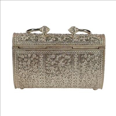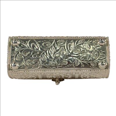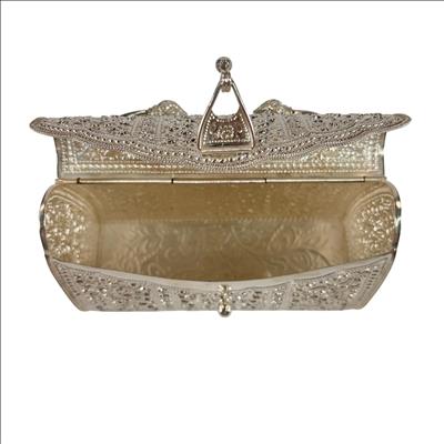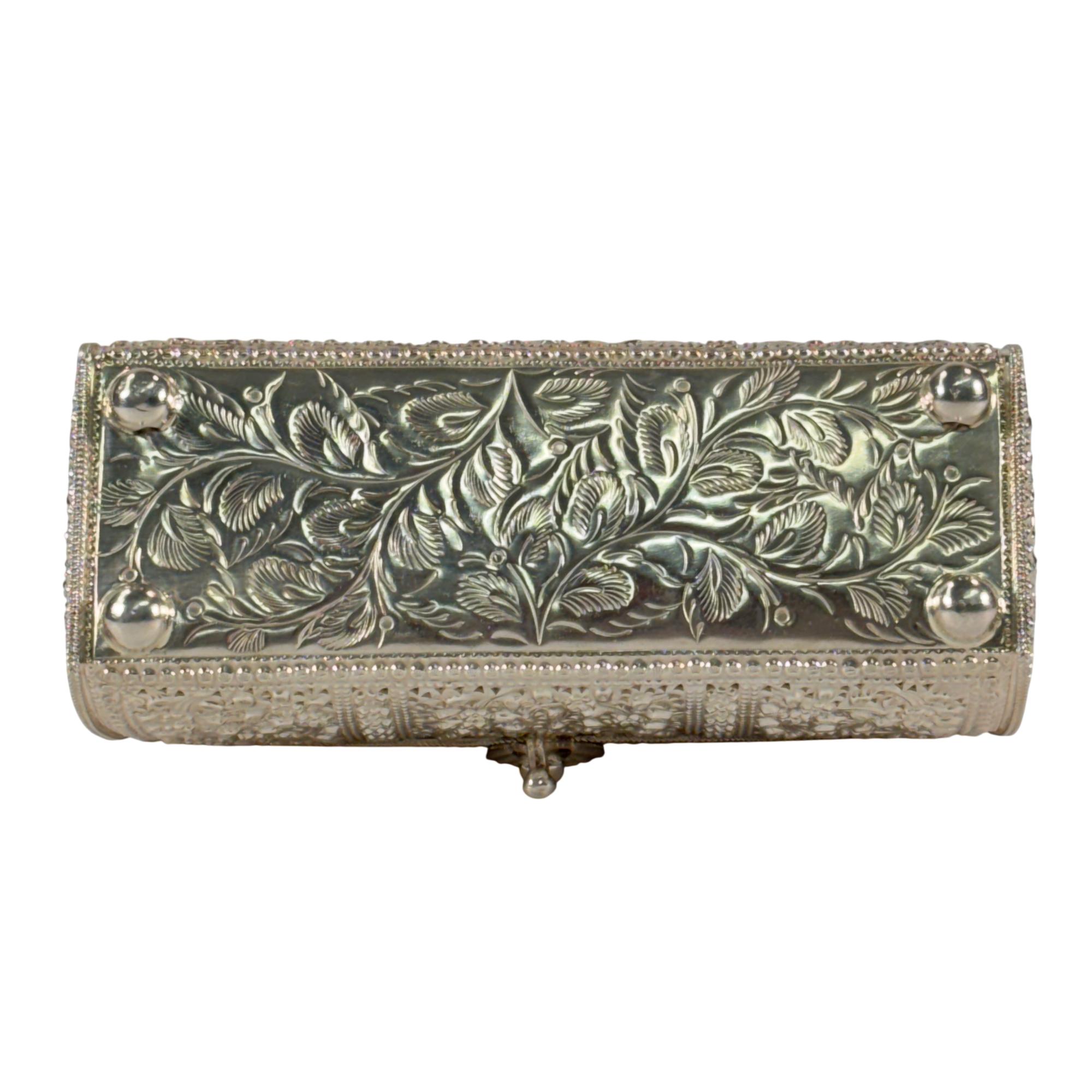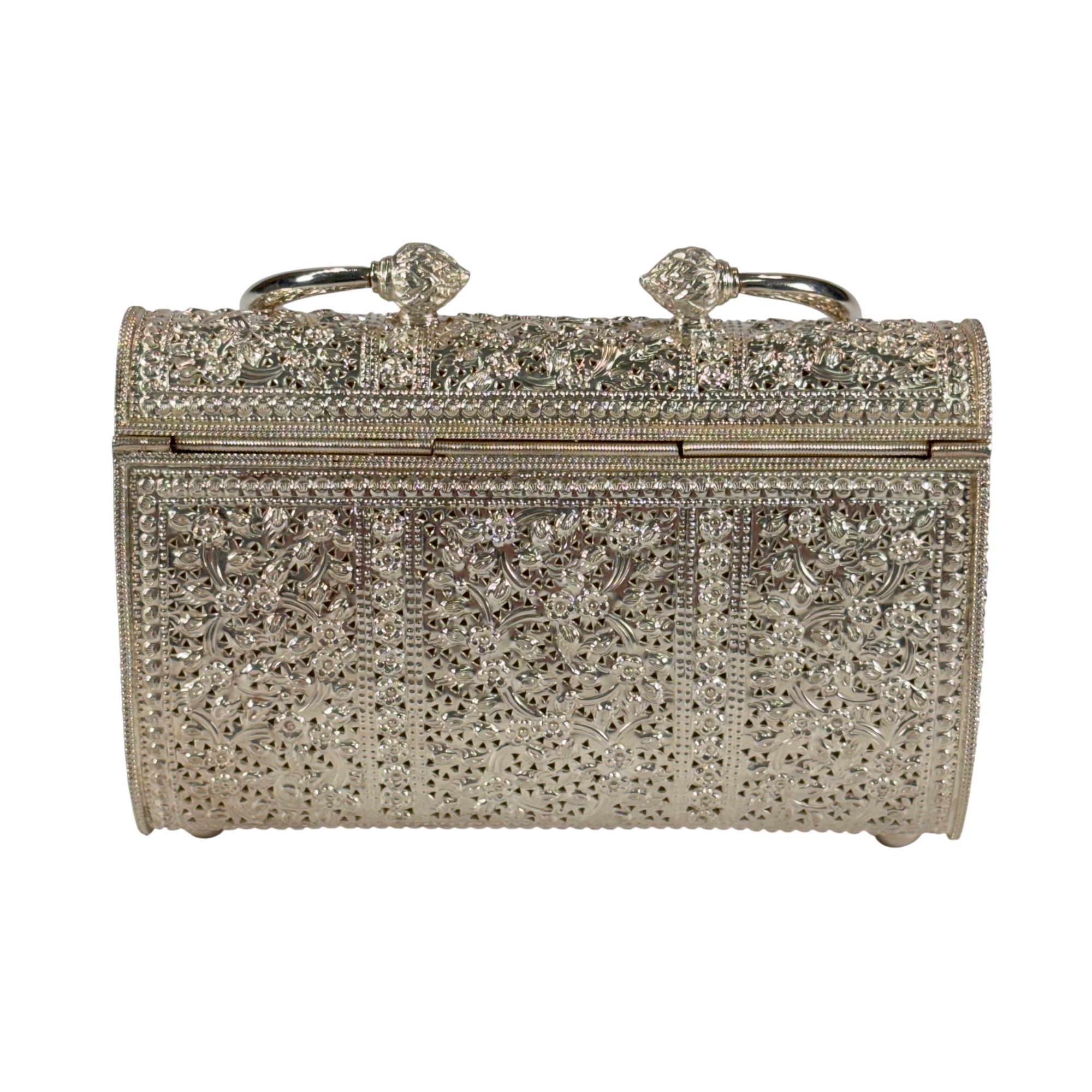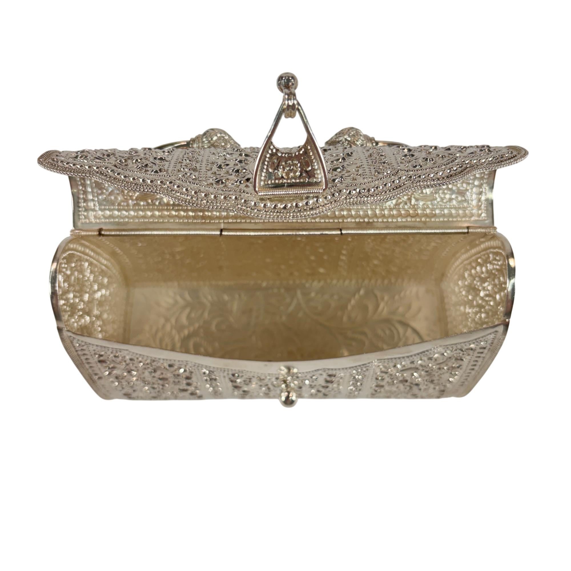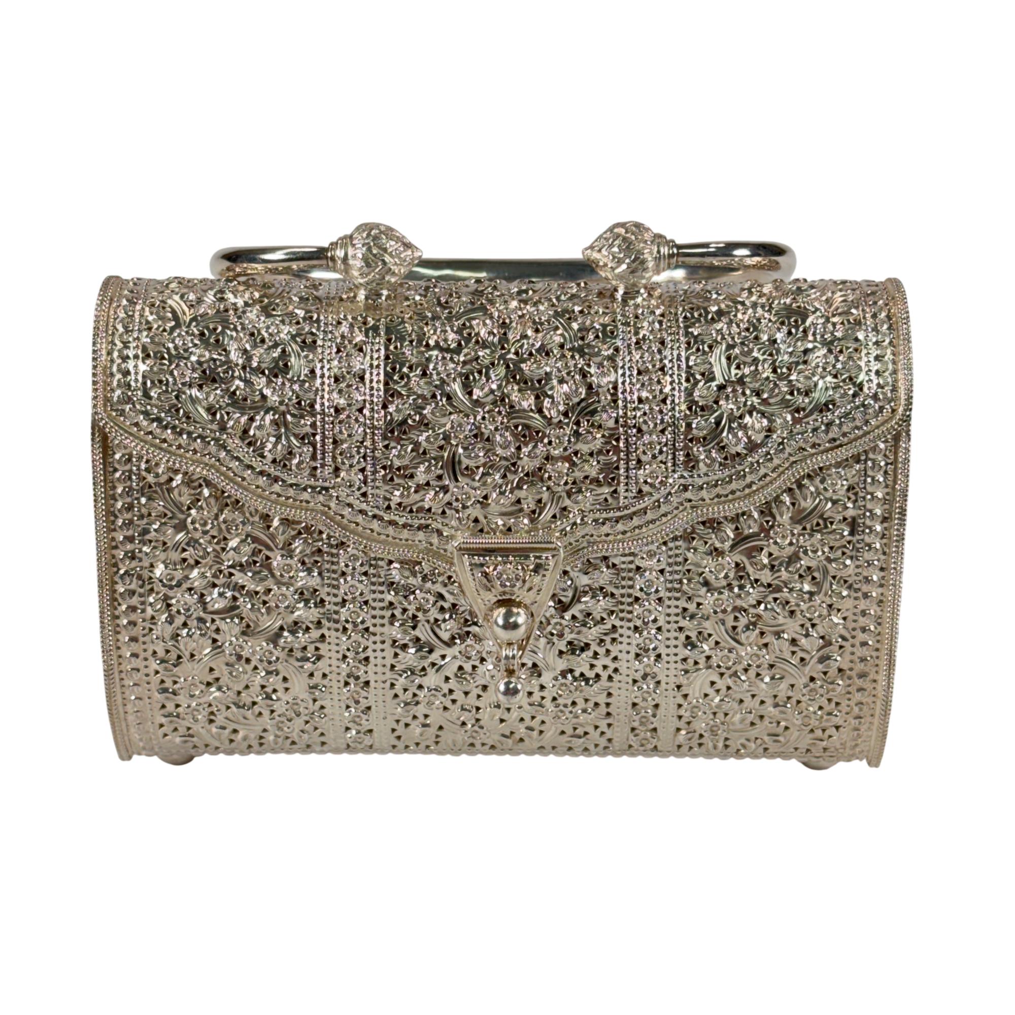 This vintage ornate sterling silver 925 filigree handbag features intricate hand-engraved floral patterns that showcase exquisite craftsmanship. The elegant clutch purse combines antique design with a delicate metalwork structure, making it a unique fashion accessory for special occasions and collectors alike. Weighs 327.1 grams.