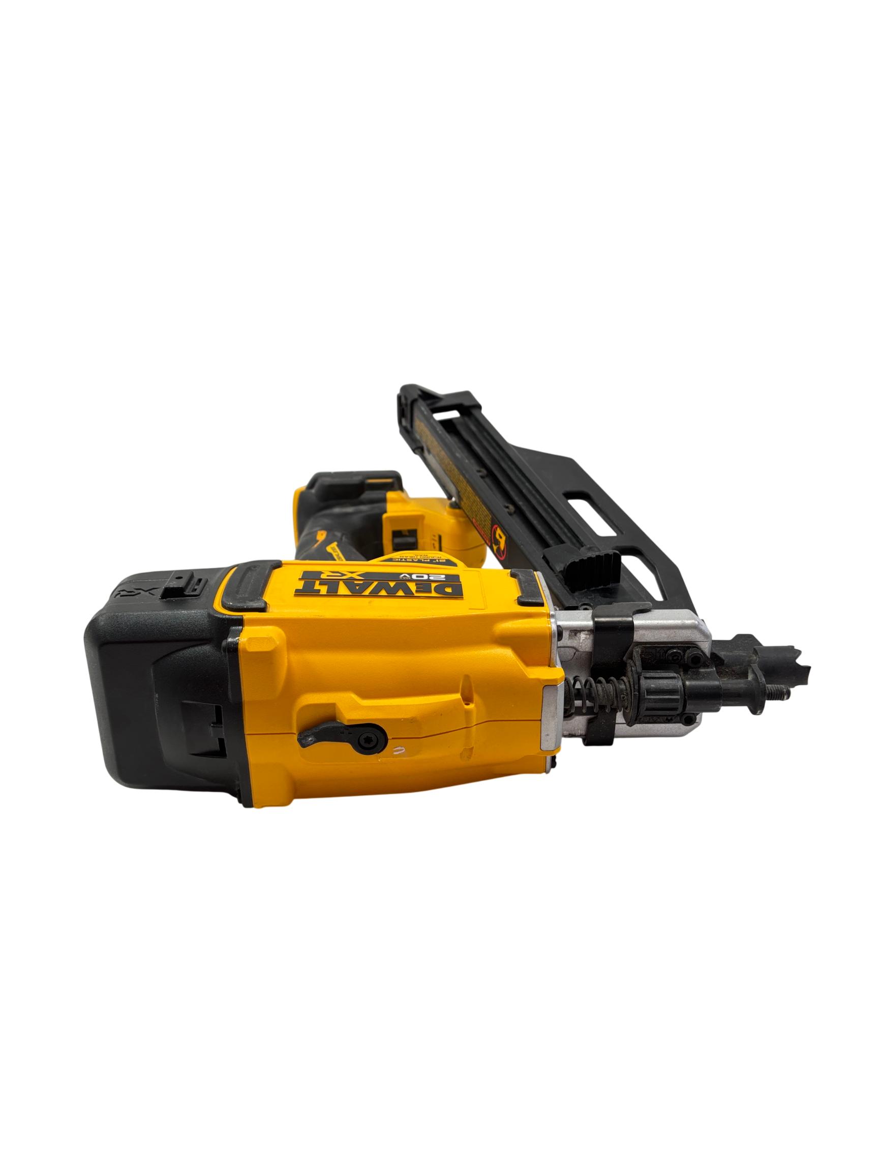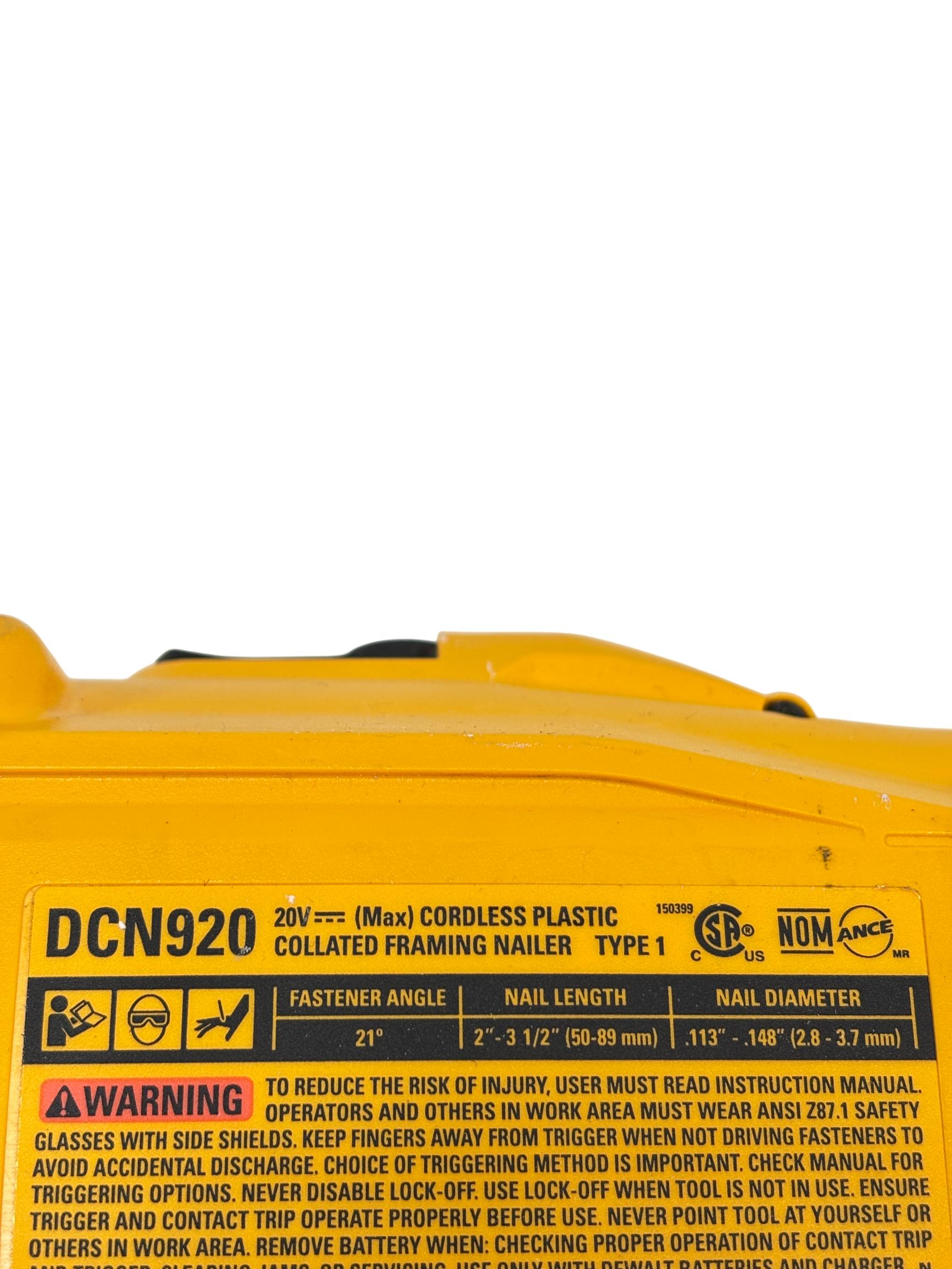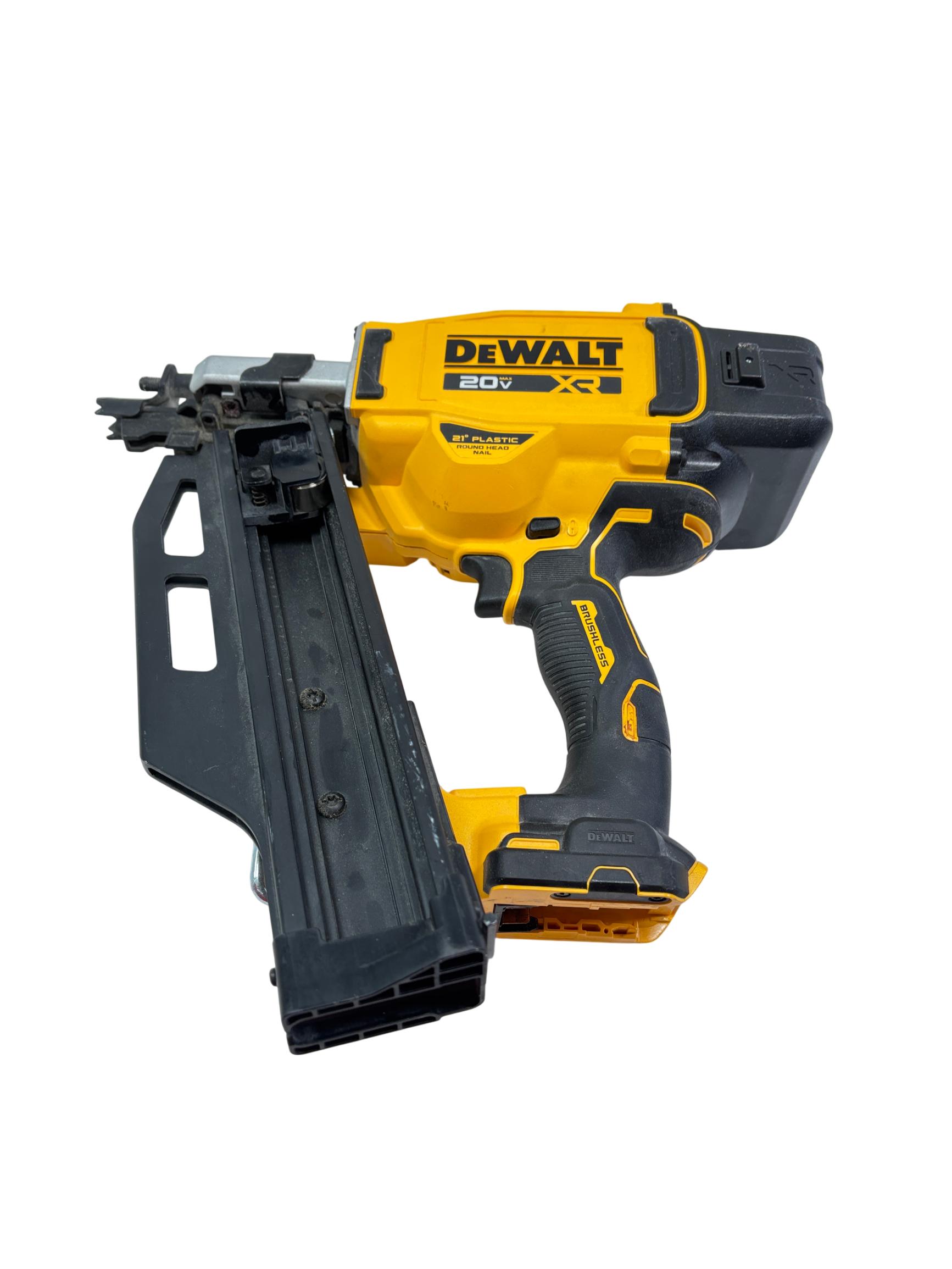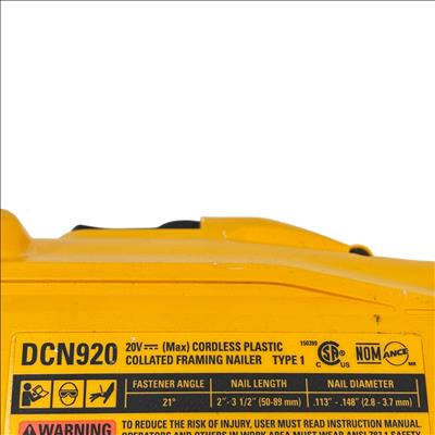 DEWALT 20V MAX XR Brushless 21-Degree Plastic Framing Nailer (DCN920) delivers high-performance framing with a brushless motor designed for increased efficiency and longer tool life. This cordless framing nailer features a 21-degree plastic round-head magazine that allows for versatile nail placement in various construction applications. Engineered for durability and precision, it is an essential power tool for professional builders and contractors.