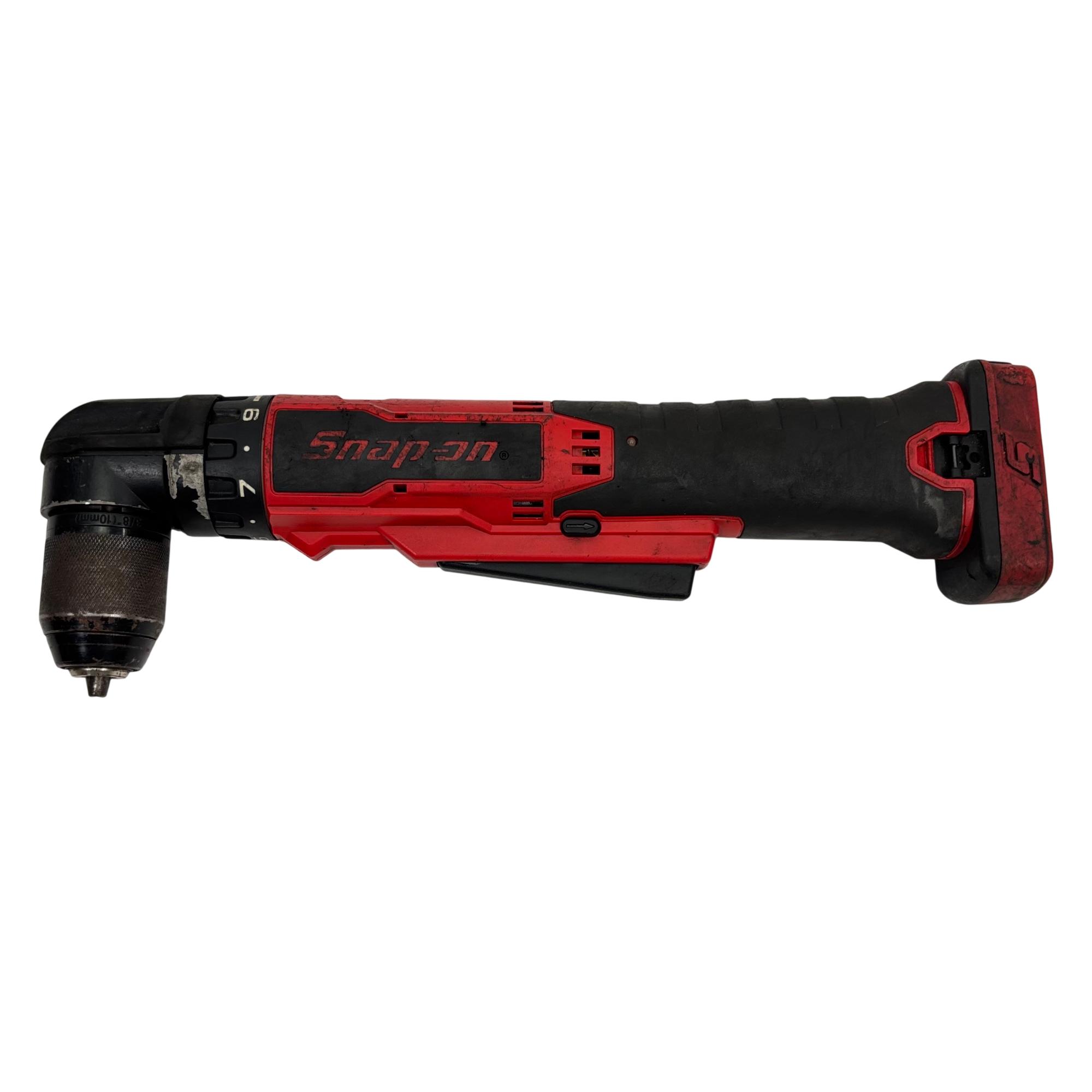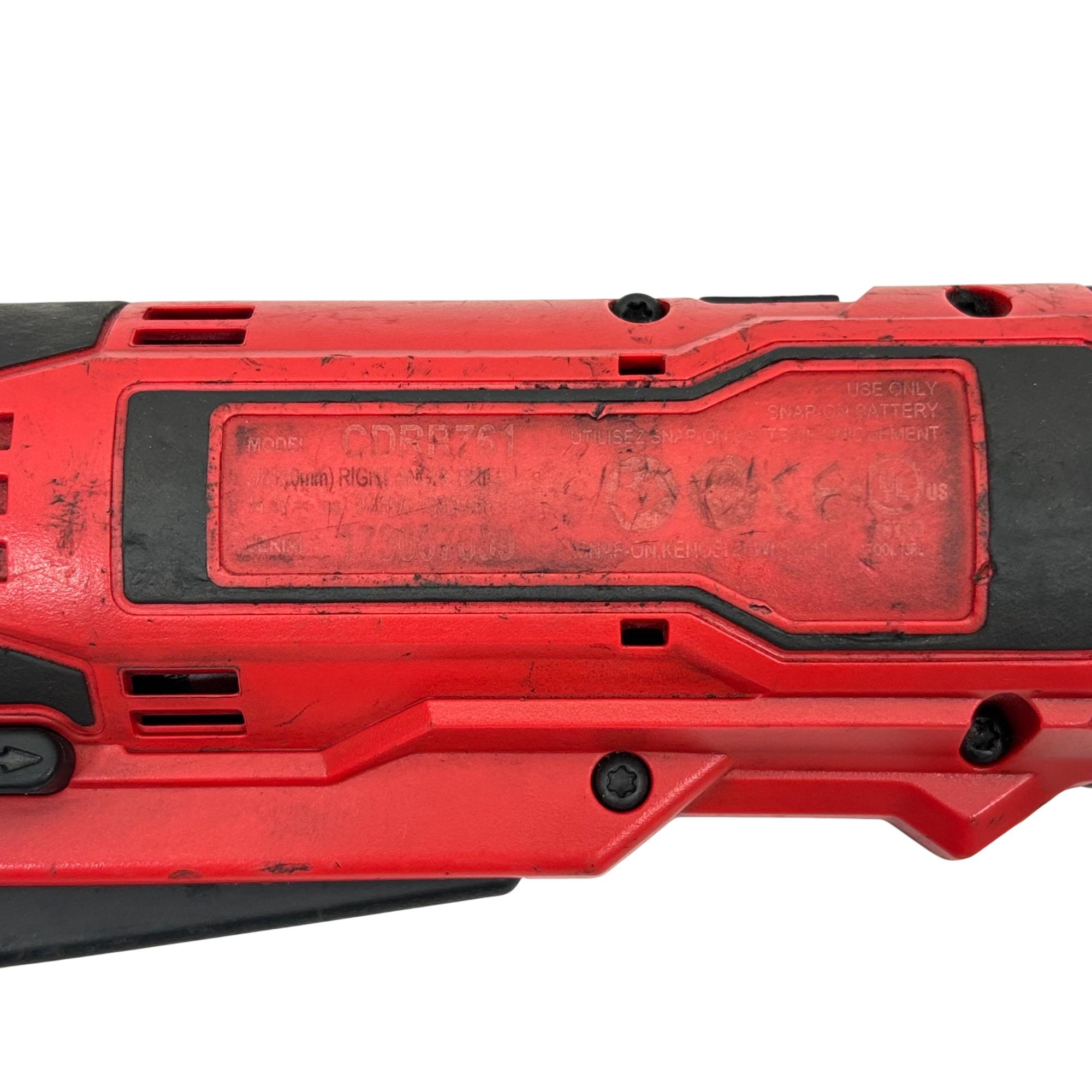 Snap-on CDRR761 14.4V Cordless 3/8" (10mm) Right Angle Drill delivers powerful and precise performance for tight or hard-to-reach spaces. This red and black cordless drill features a compact right angle design, making it ideal for various professional and DIY applications requiring maneuverability and torque in confined areas.