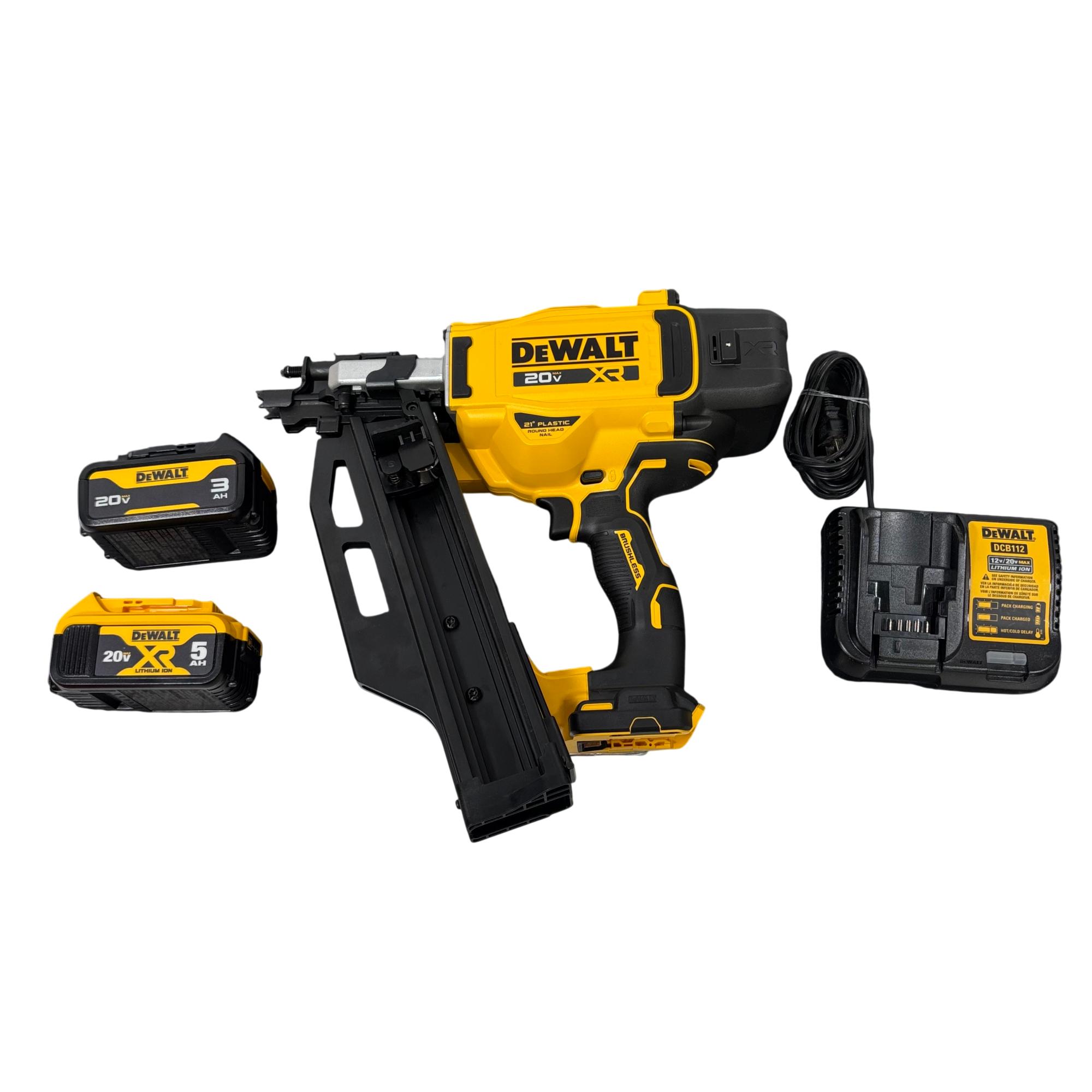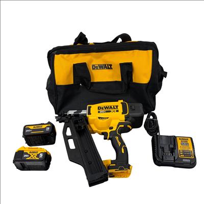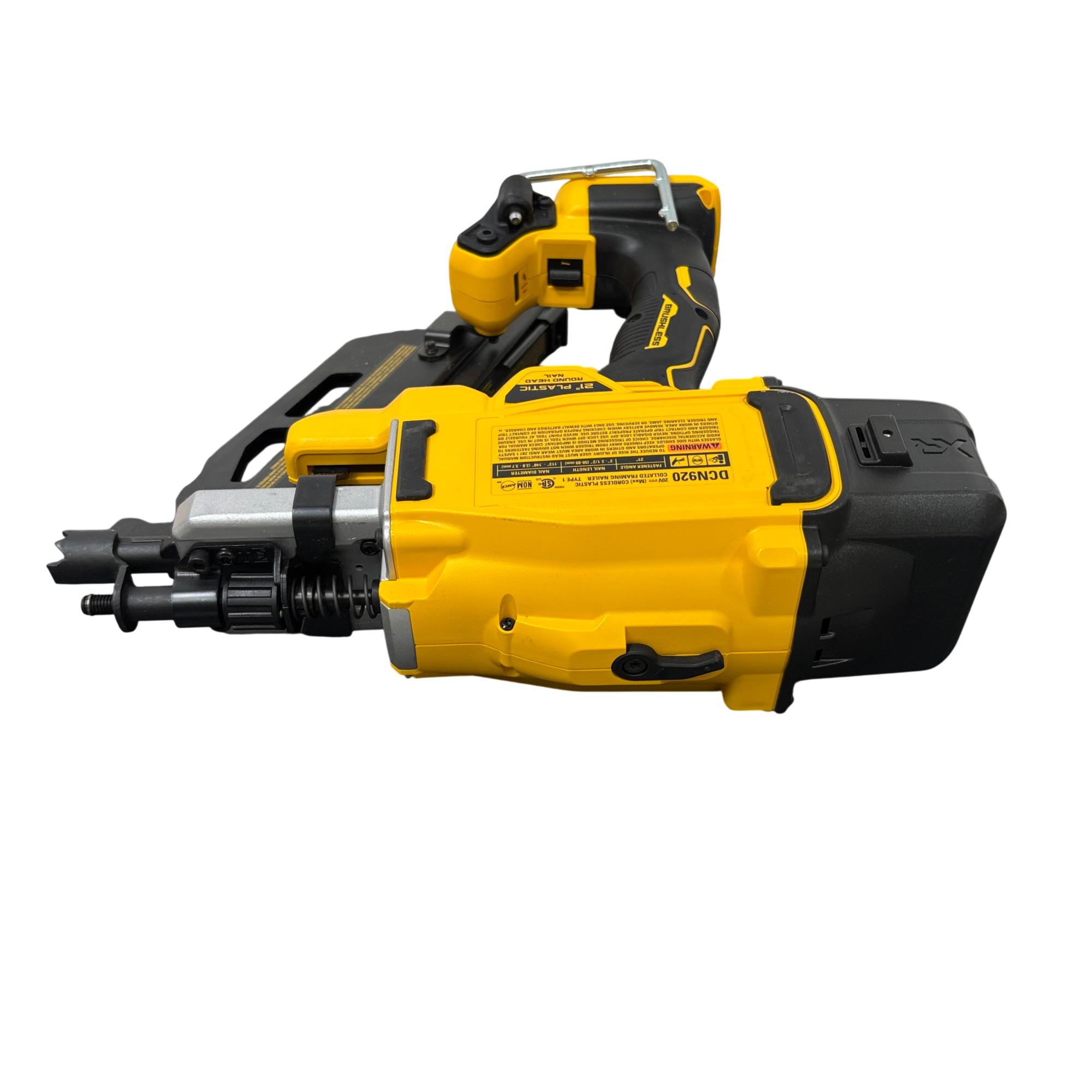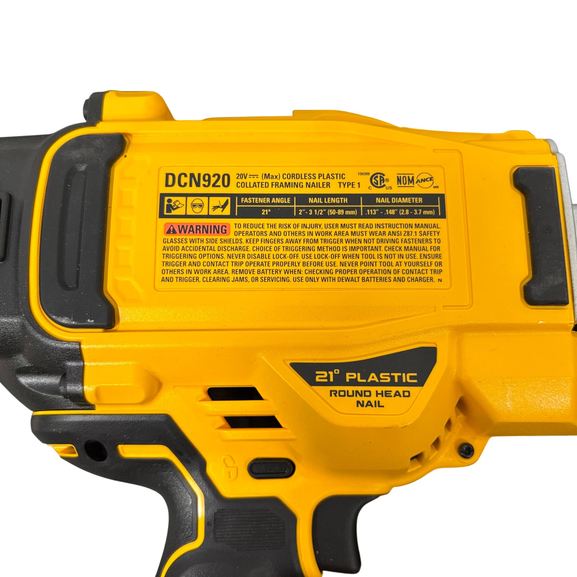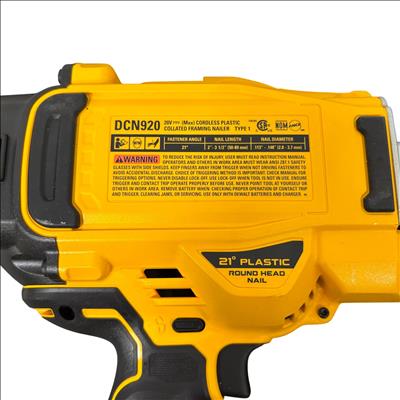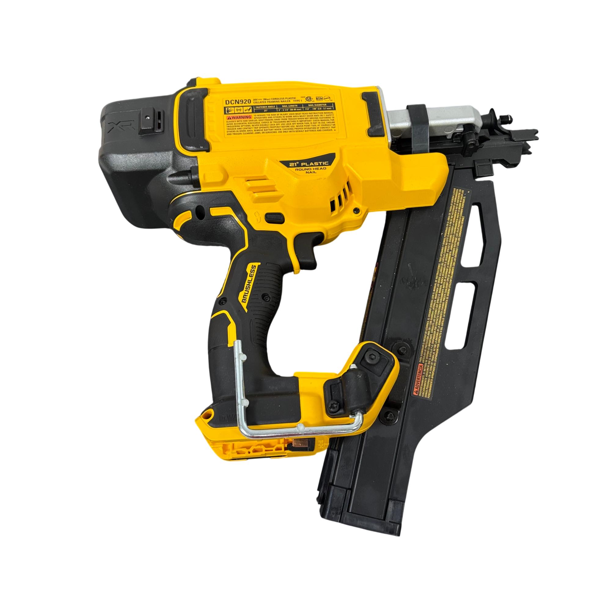 DeWalt DCN920 20V MAX XR 21° Cordless Framing Nailer Kit features a brushless motor designed for high efficiency and durability in framing applications. This cordless nailer operates on a 20-volt platform, providing powerful performance and improved runtime suitable for professional construction and woodworking projects.