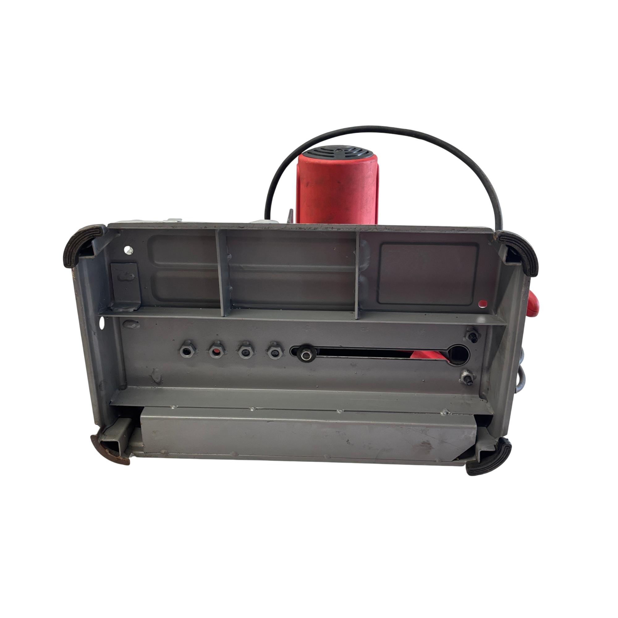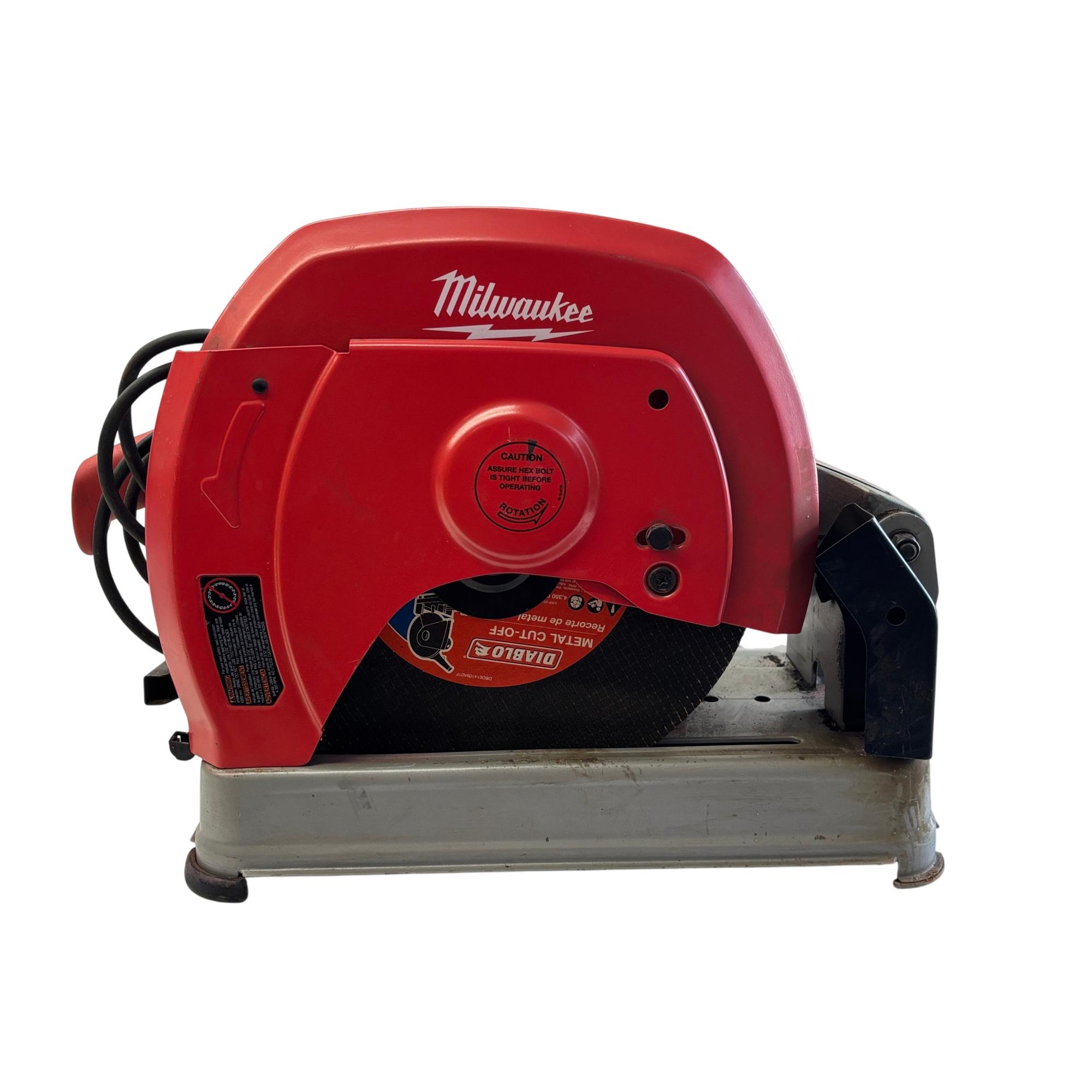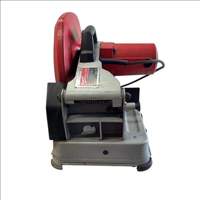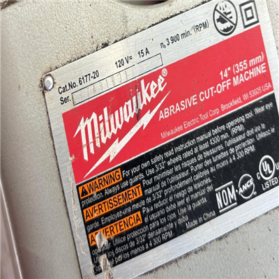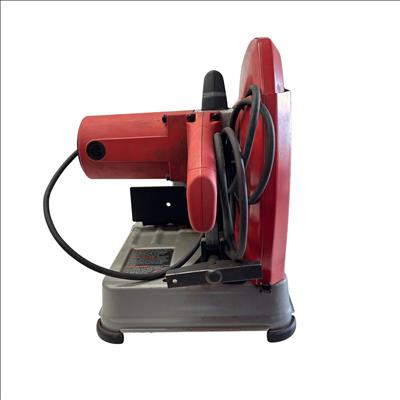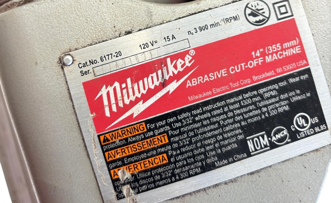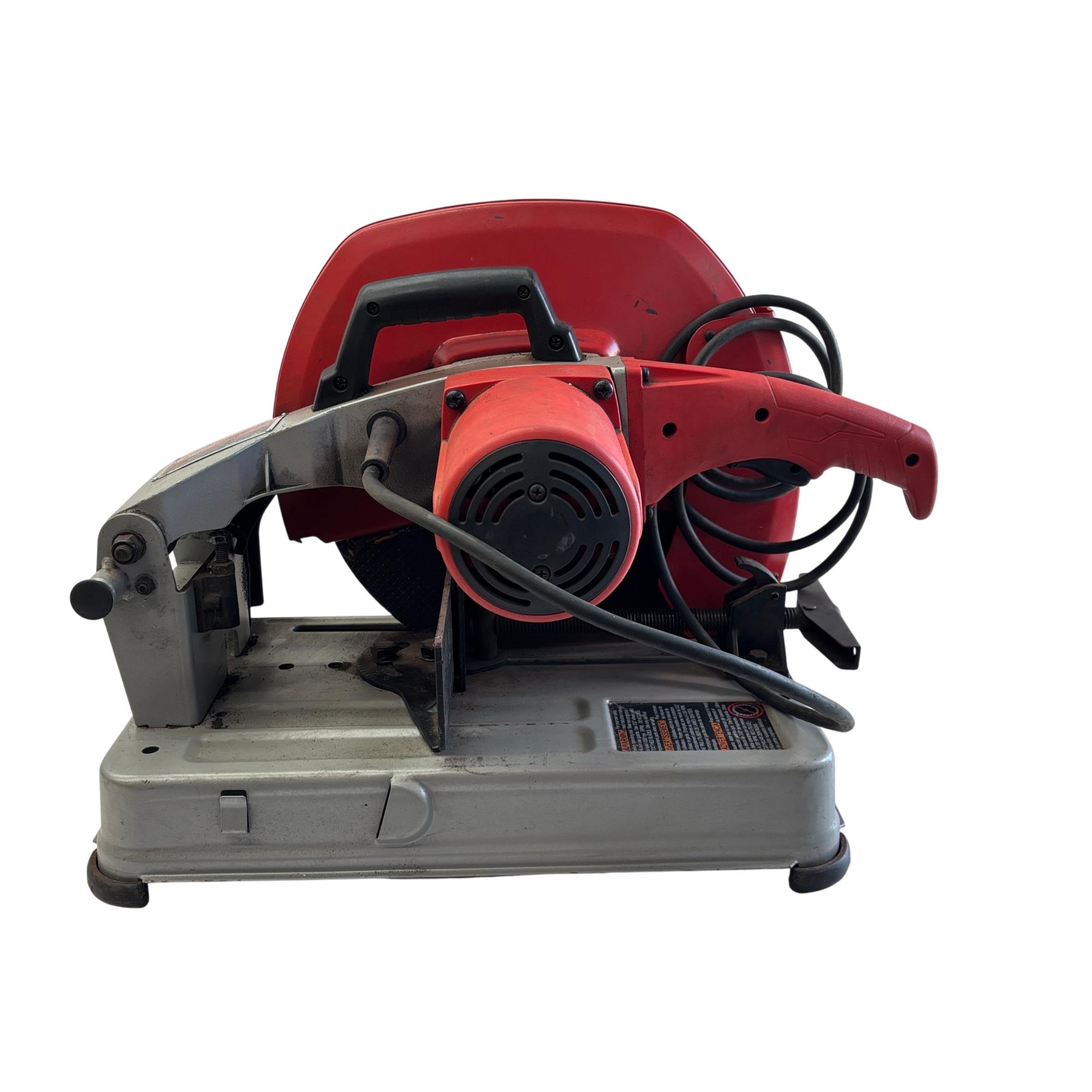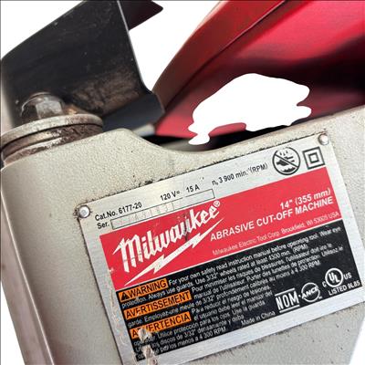 Milwaukee 6177-20 14" (355mm) Abrasive Cut-Off Machine is a powerful 15-amp tool designed for precise metal cutting tasks. It operates at 120 volts with a no-load speed of 3,900 RPM, ensuring efficient abrasive cutting performance. This robust machine features a red and grey casing and is engineered for durability and safety during heavy-duty applications.