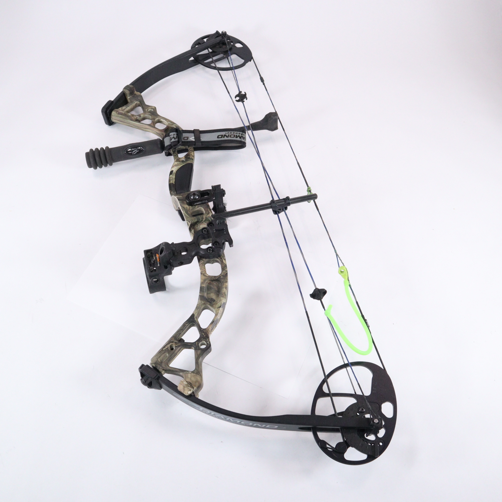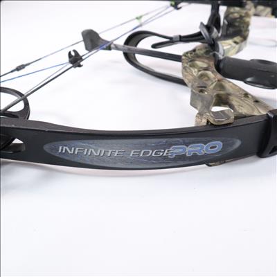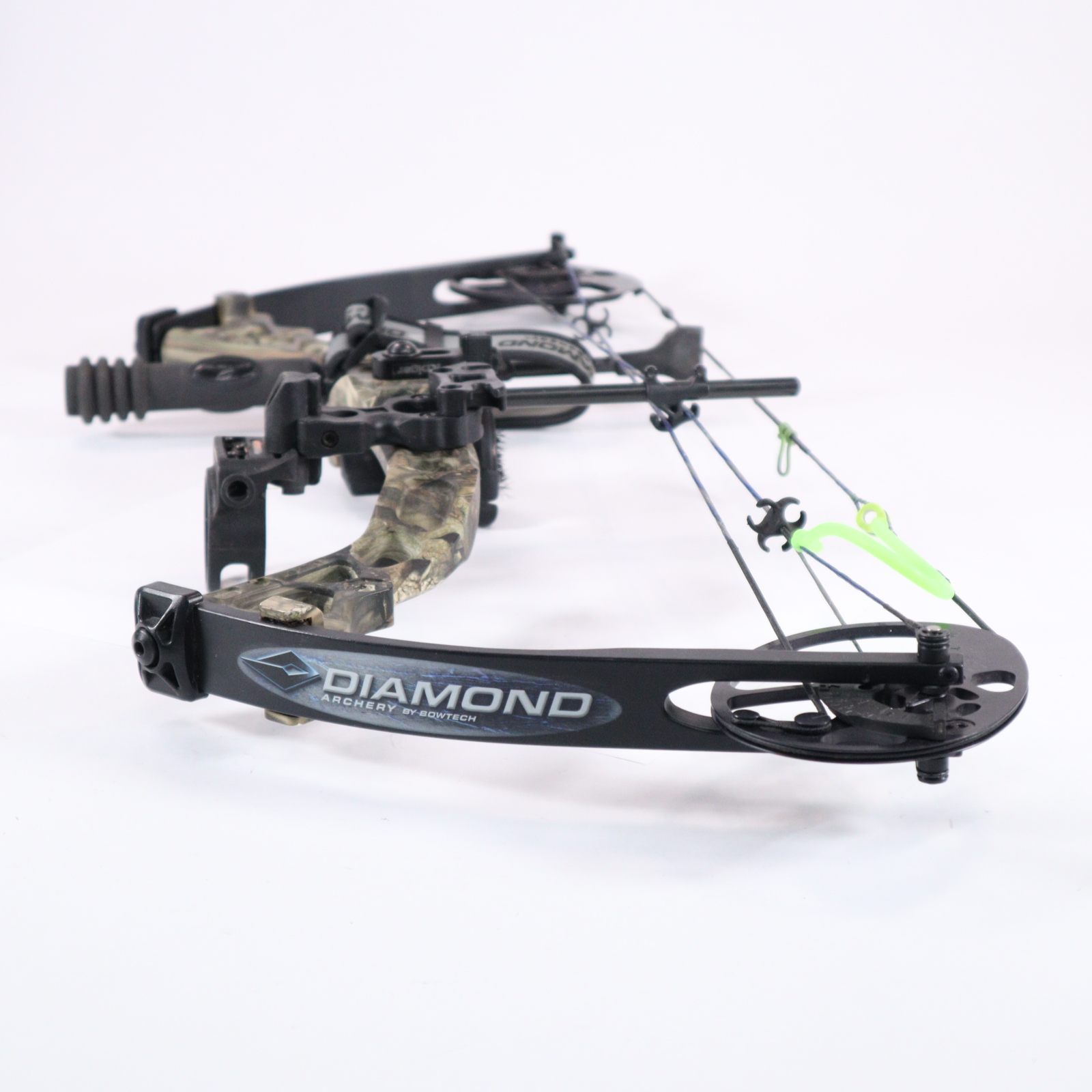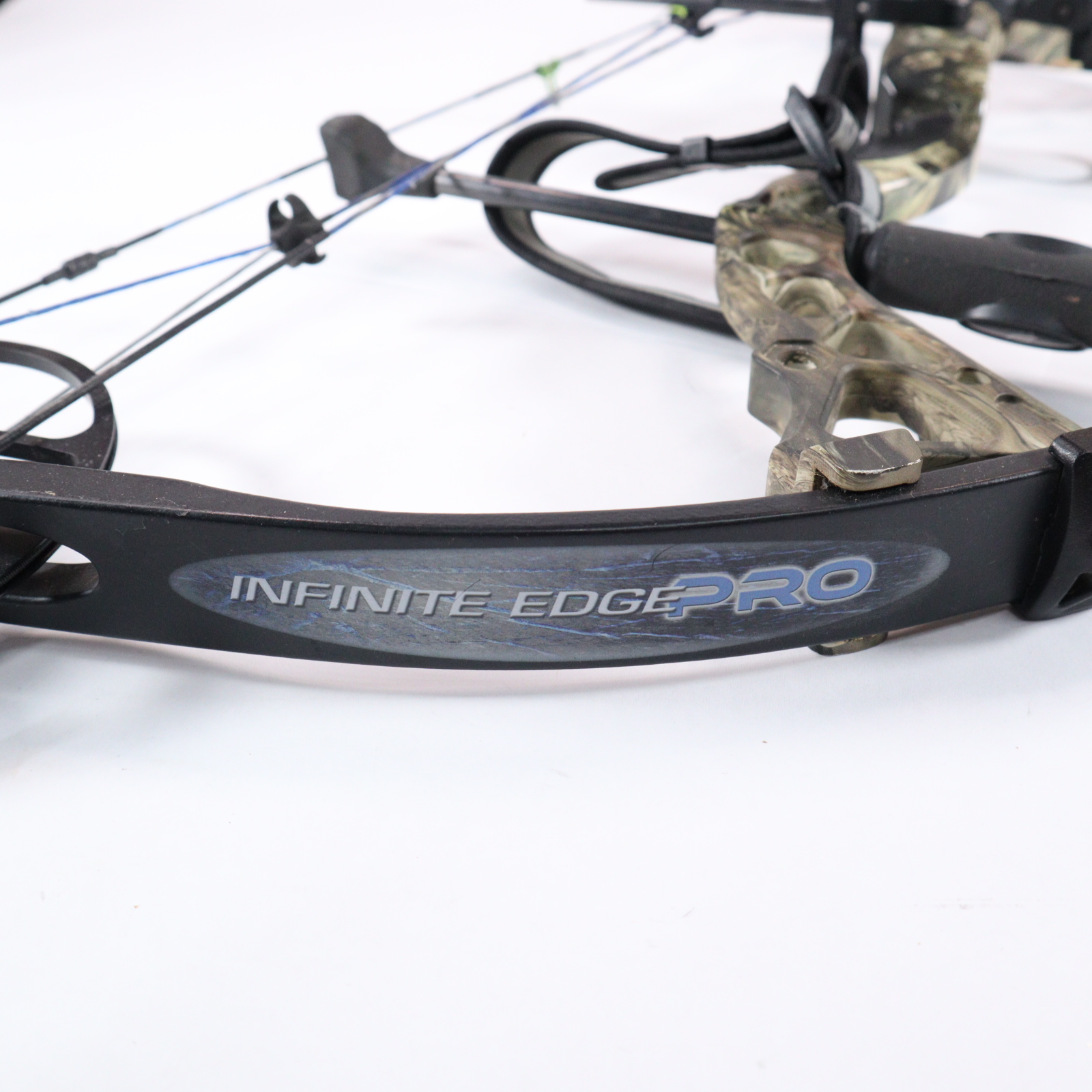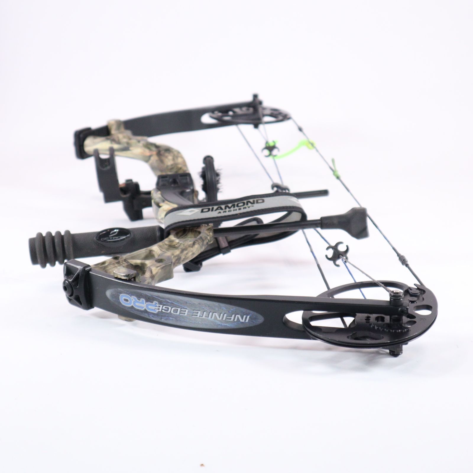 The Diamond by Bowtech Infinite Edge Pro right-handed hunting compound bow offers adjustable performance with a 26.5-inch draw length and 60 lbs. draw weight, adaptable to a wide range of archers. Its versatile design delivers smooth draw cycles and consistent accuracy, making it suitable for both beginners and experienced hunters.