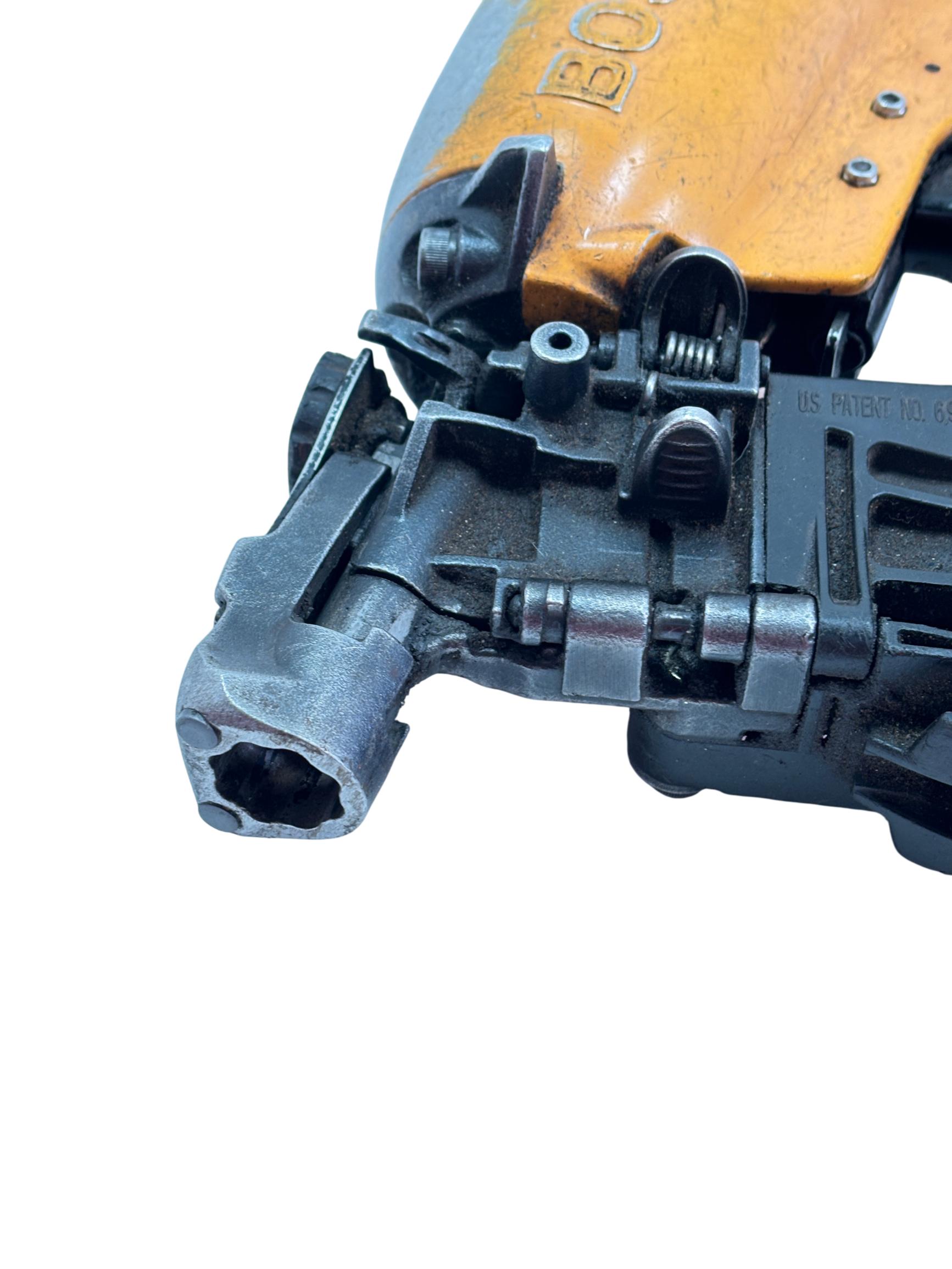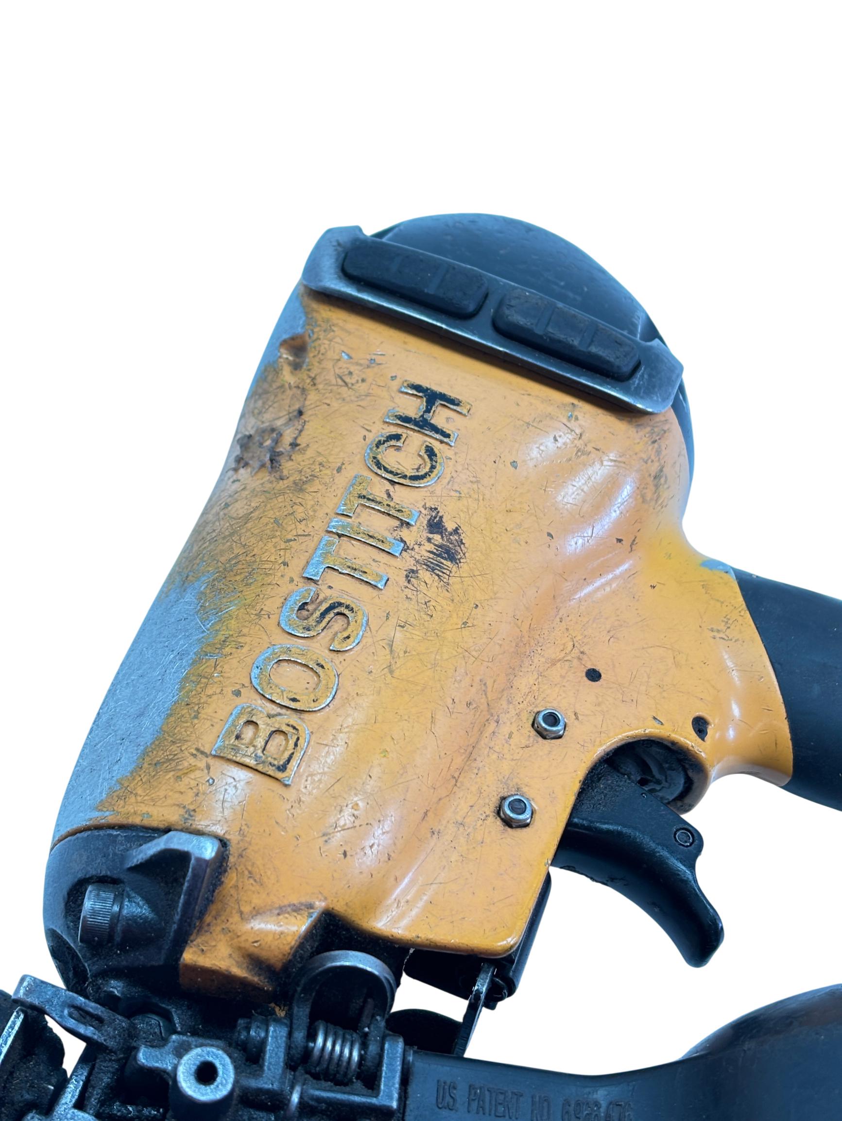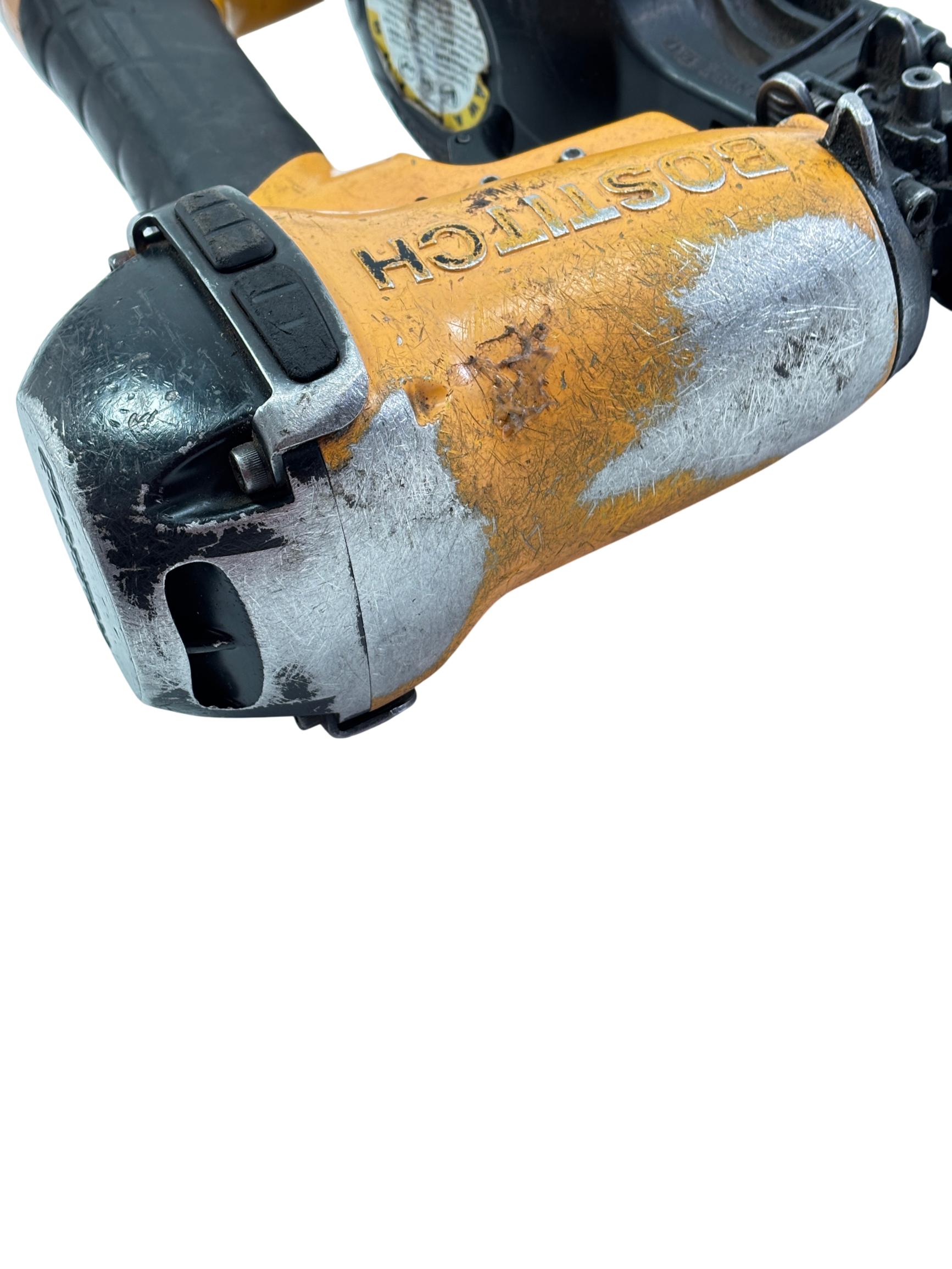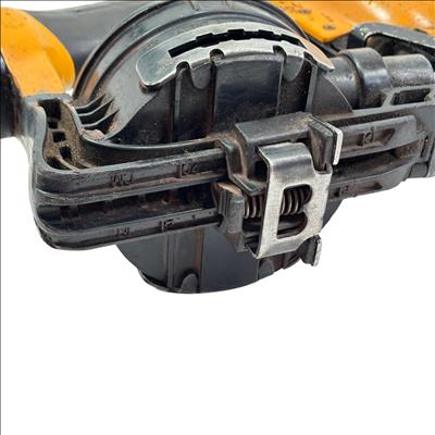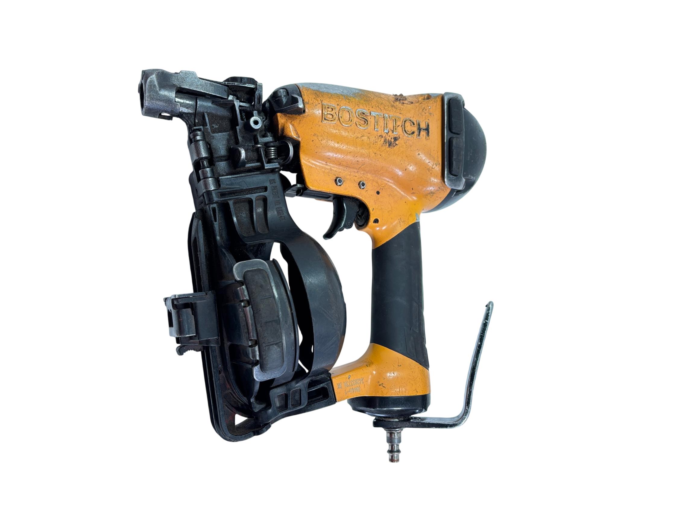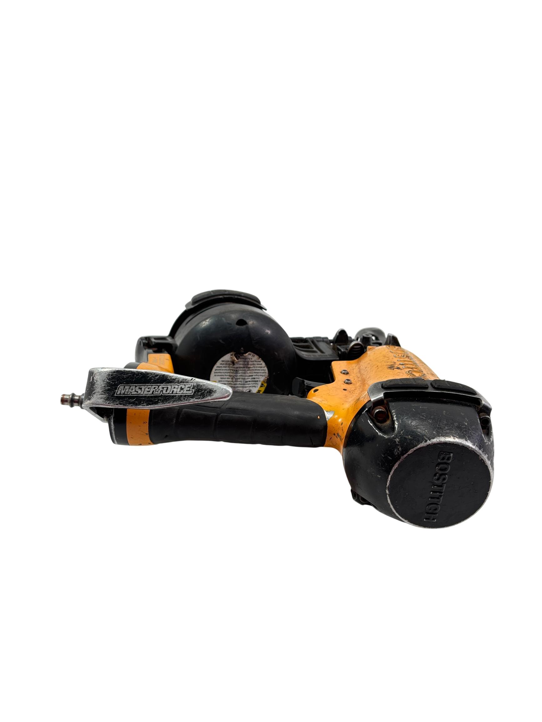 Bostitch RN46-1 15-Degree Pneumatic Coil Roofing Nailer is designed with an aluminum housing for durability and lightweight handling. This powerful pneumatic tool operates at a 15-degree angle to efficiently drive 11-gauge nails ranging from 3/4 inch to 1-3/4 inches, making it ideal for roofing and siding applications. Its ergonomic yellow and black design provides enhanced control and comfort during extended use.
