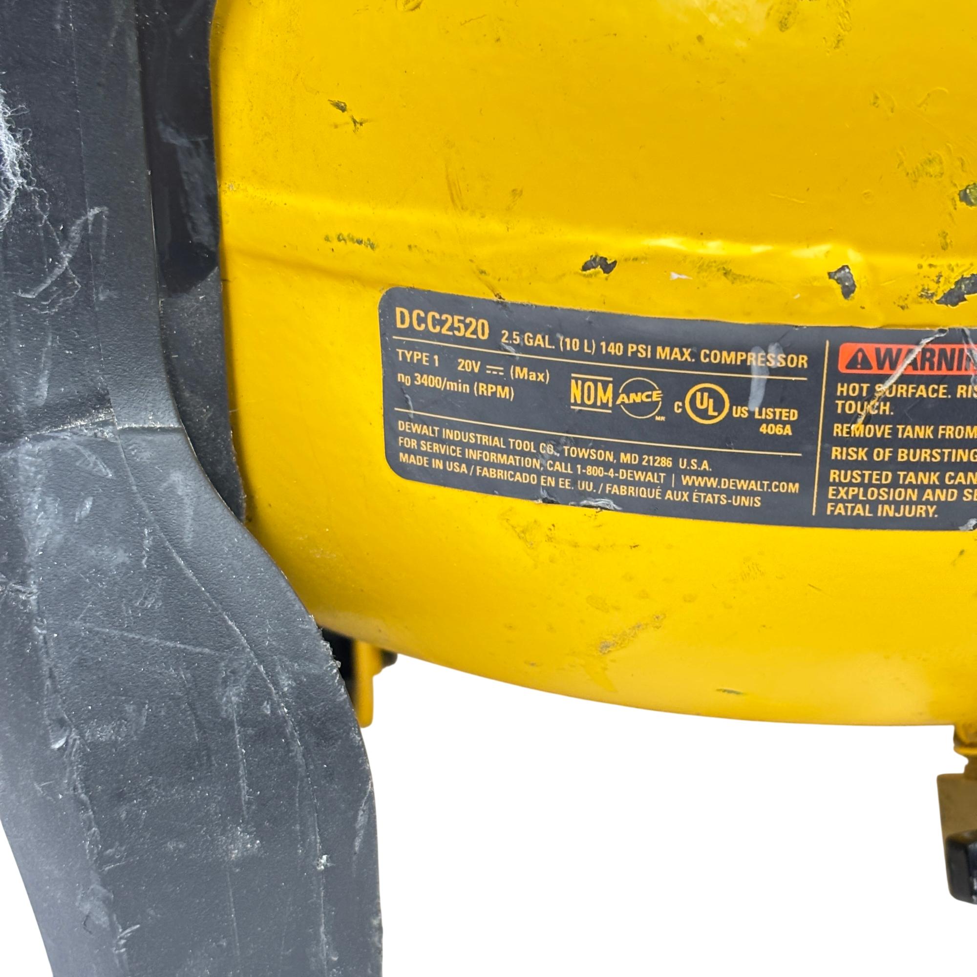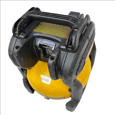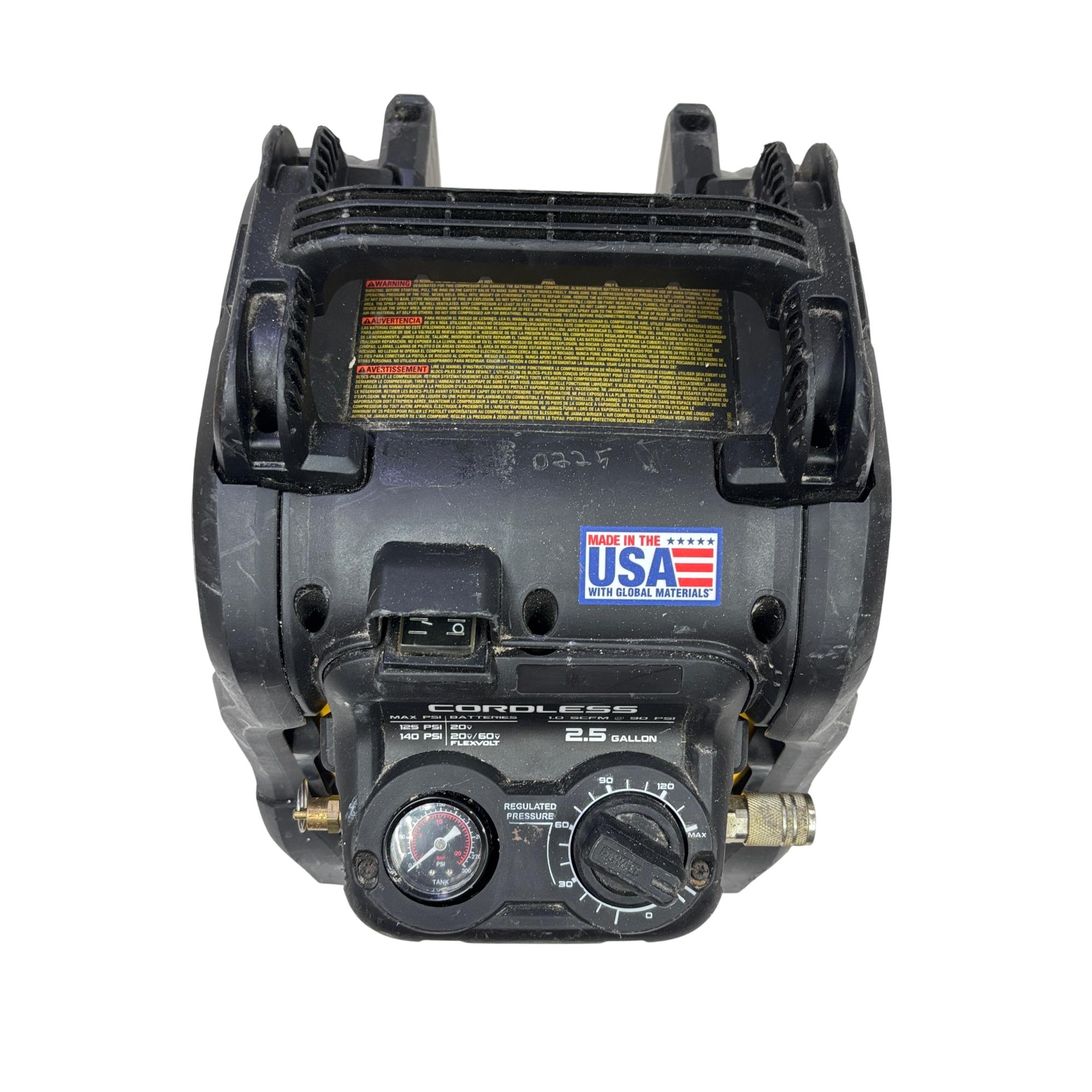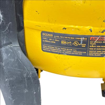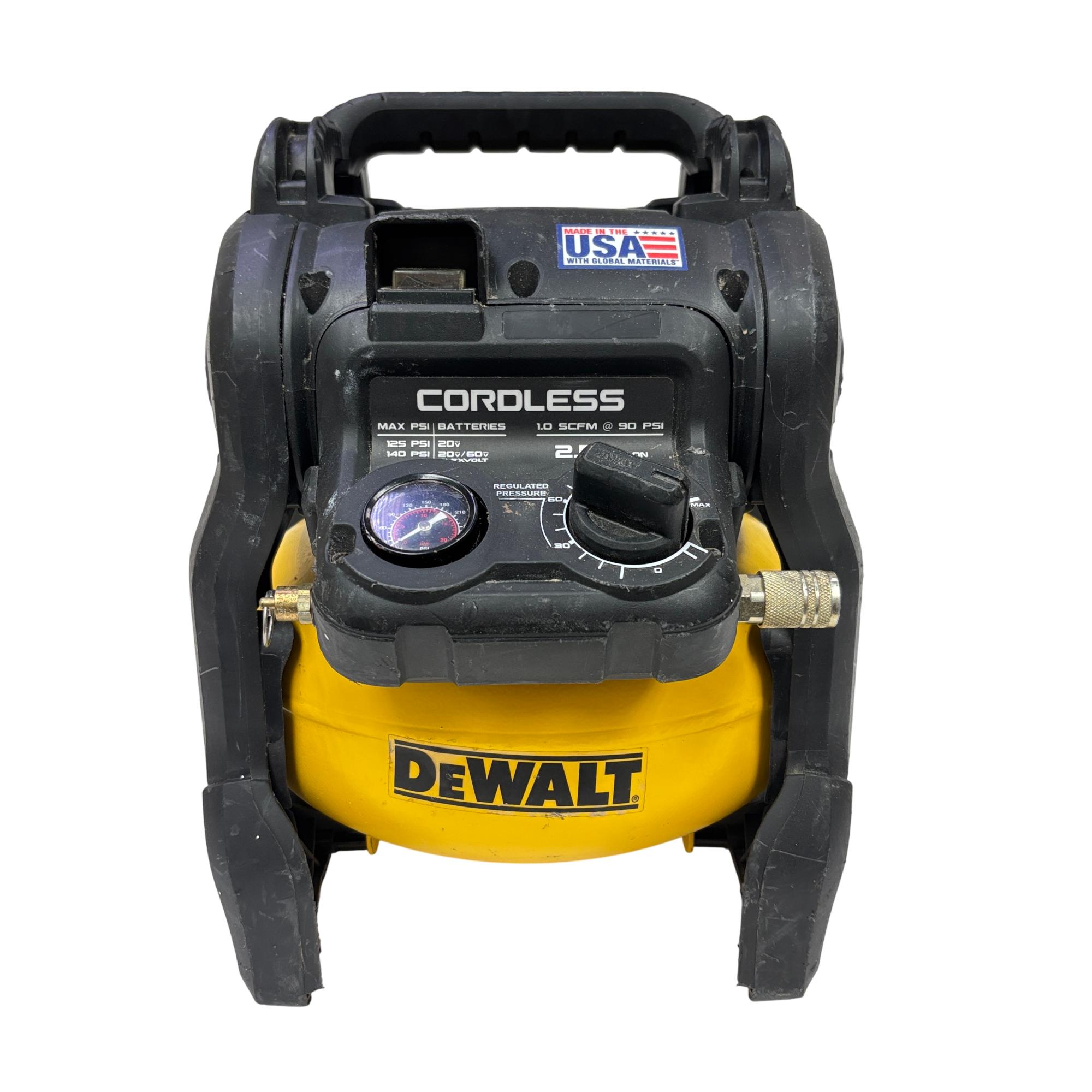 This DeWALT 20V MAX Cordless Air Compressor features a 2.5 gallon tank and delivers regulated pressure with a maximum of 140 PSI at 20 volts. Designed for portability and convenience, this yellow and black cordless air compressor is constructed with global materials and made in the USA, combining durability with efficient performance for various inflation and pneumatic tasks.
