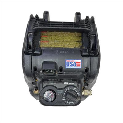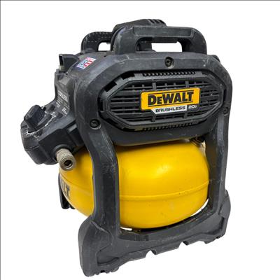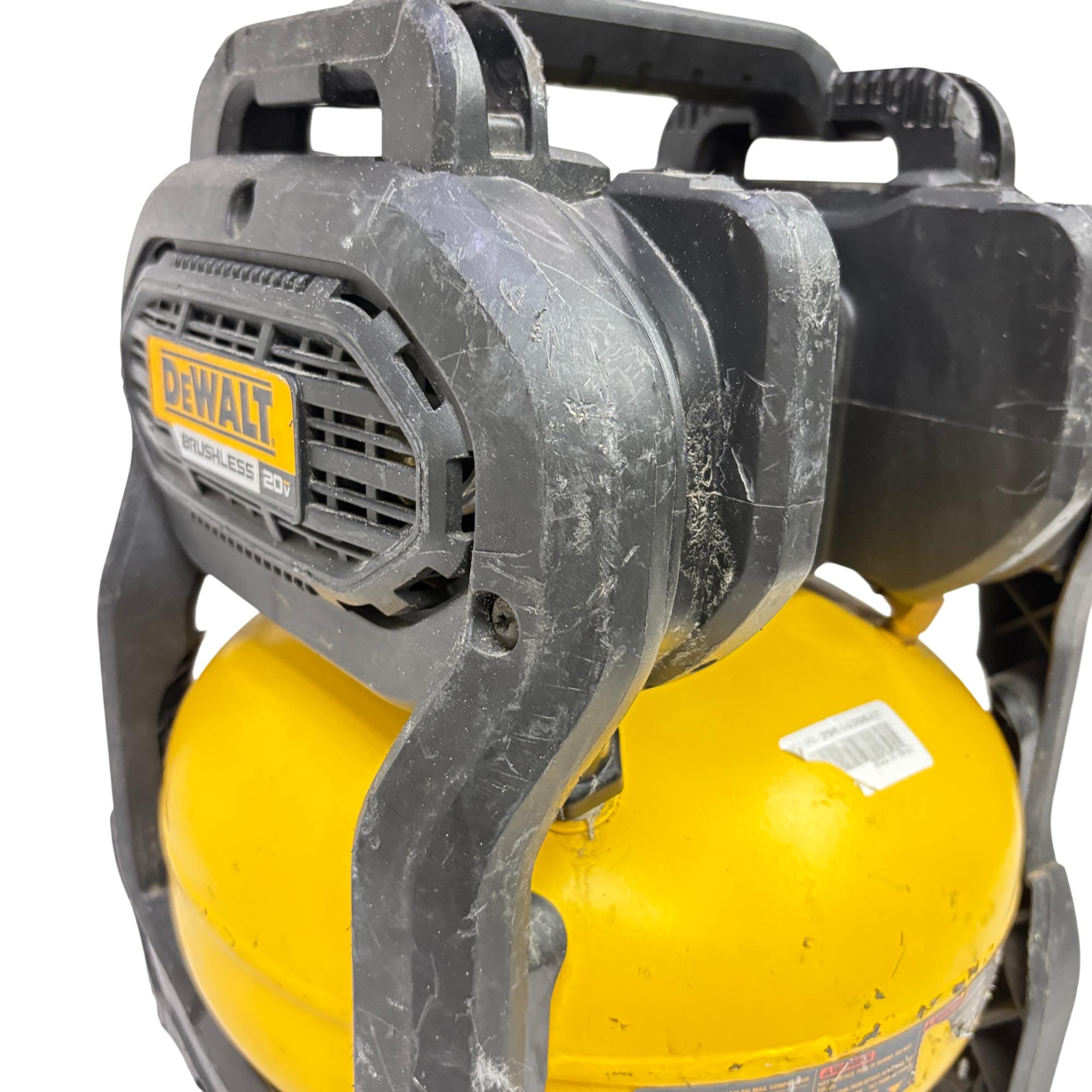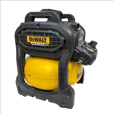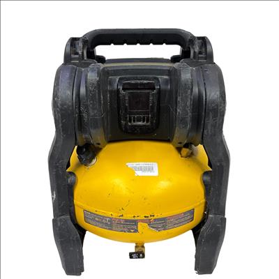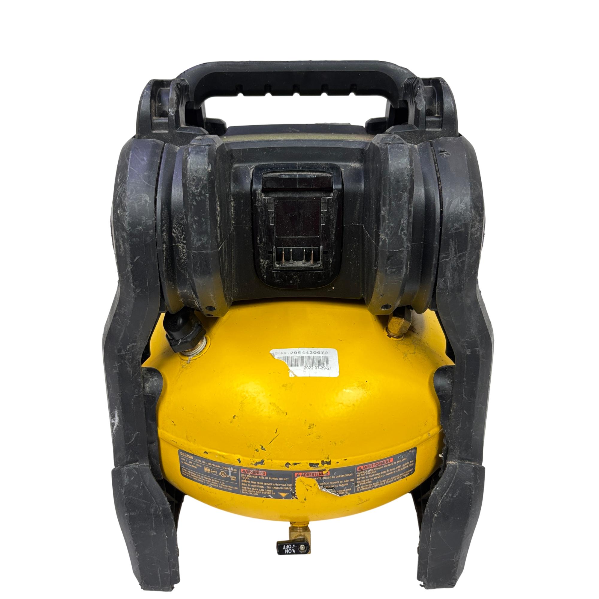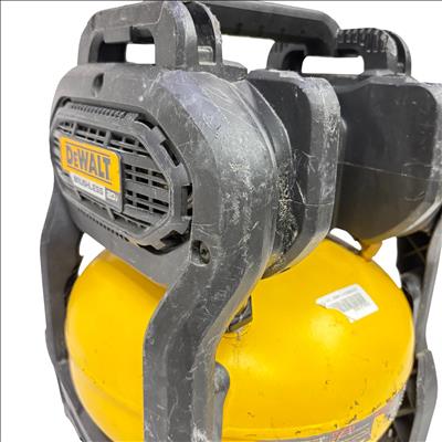 This DeWALT 20V MAX Cordless Air Compressor features a 2.5 gallon tank and delivers regulated pressure with a maximum of 140 PSI at 20 volts. Designed for portability and convenience, this yellow and black cordless air compressor is constructed with global materials and made in the USA, combining durability with efficient performance for various inflation and pneumatic tasks.