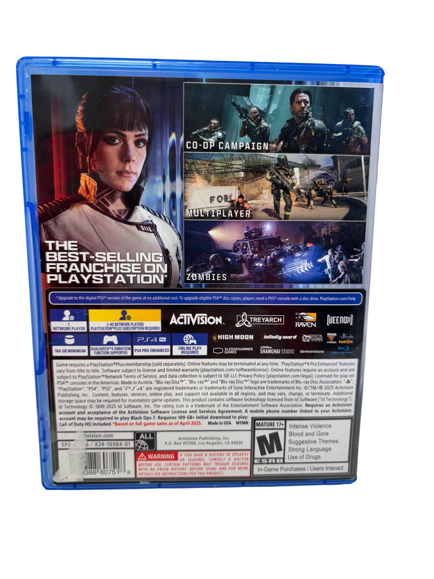 Call of Duty: Black Ops 7 features intense first-person shooter gameplay developed by Activision and Treyarch. This game offers immersive graphics and a gripping storyline set in a modern warfare environment, optimized for the PS4 console. It delivers high-quality visuals and dynamic multiplayer modes designed to engage both casual and competitive players.