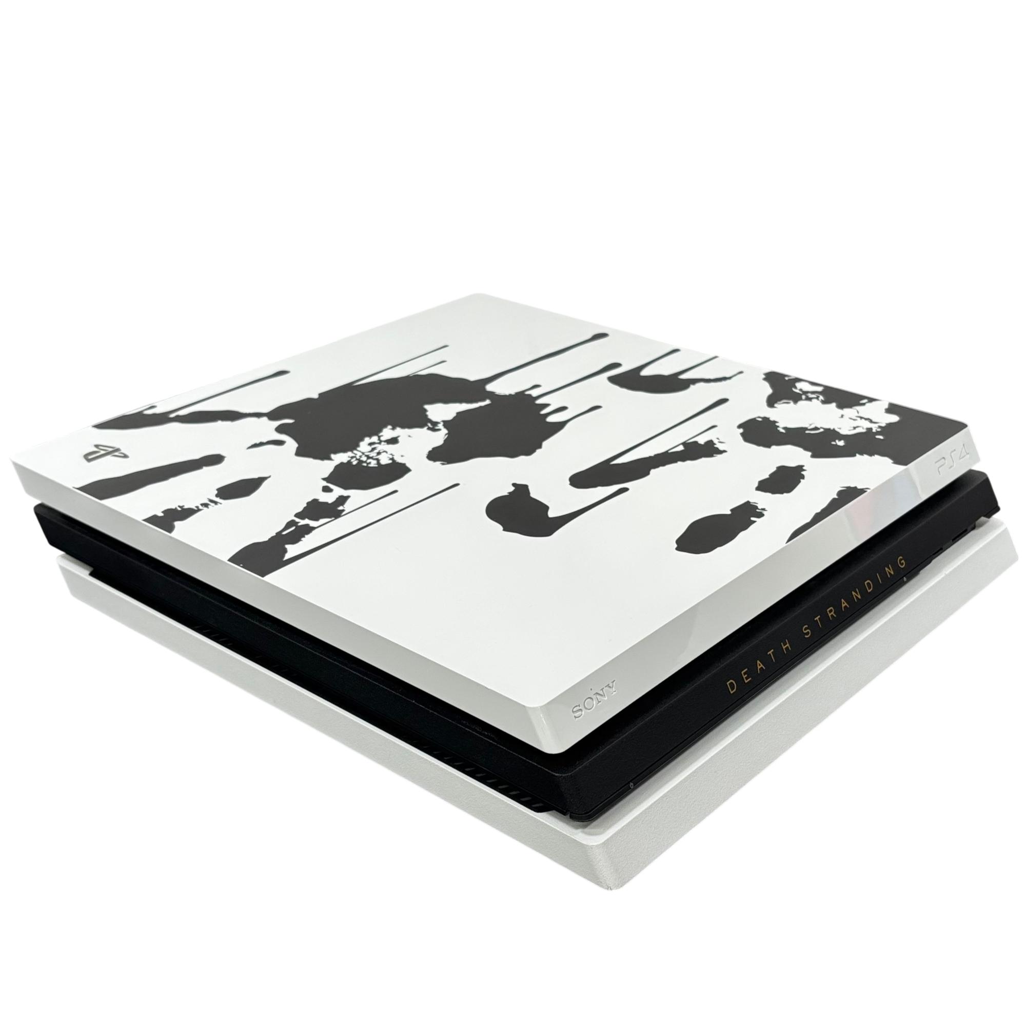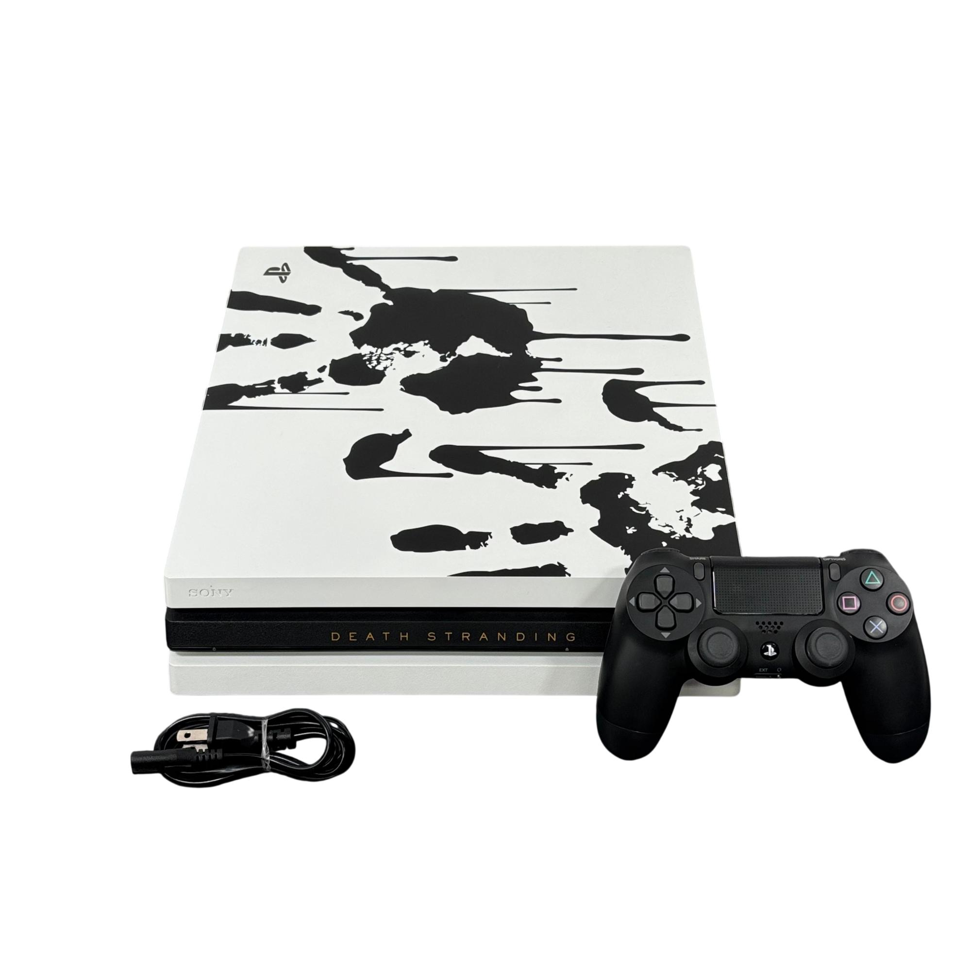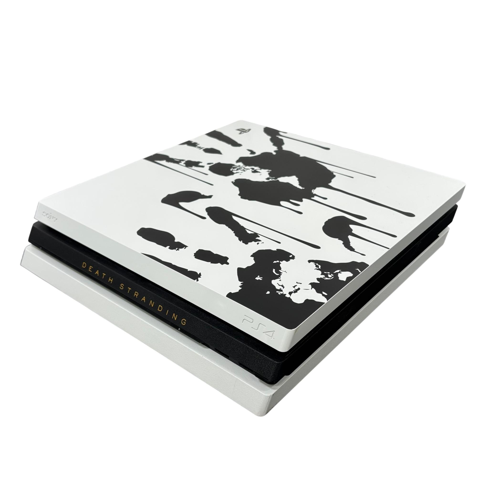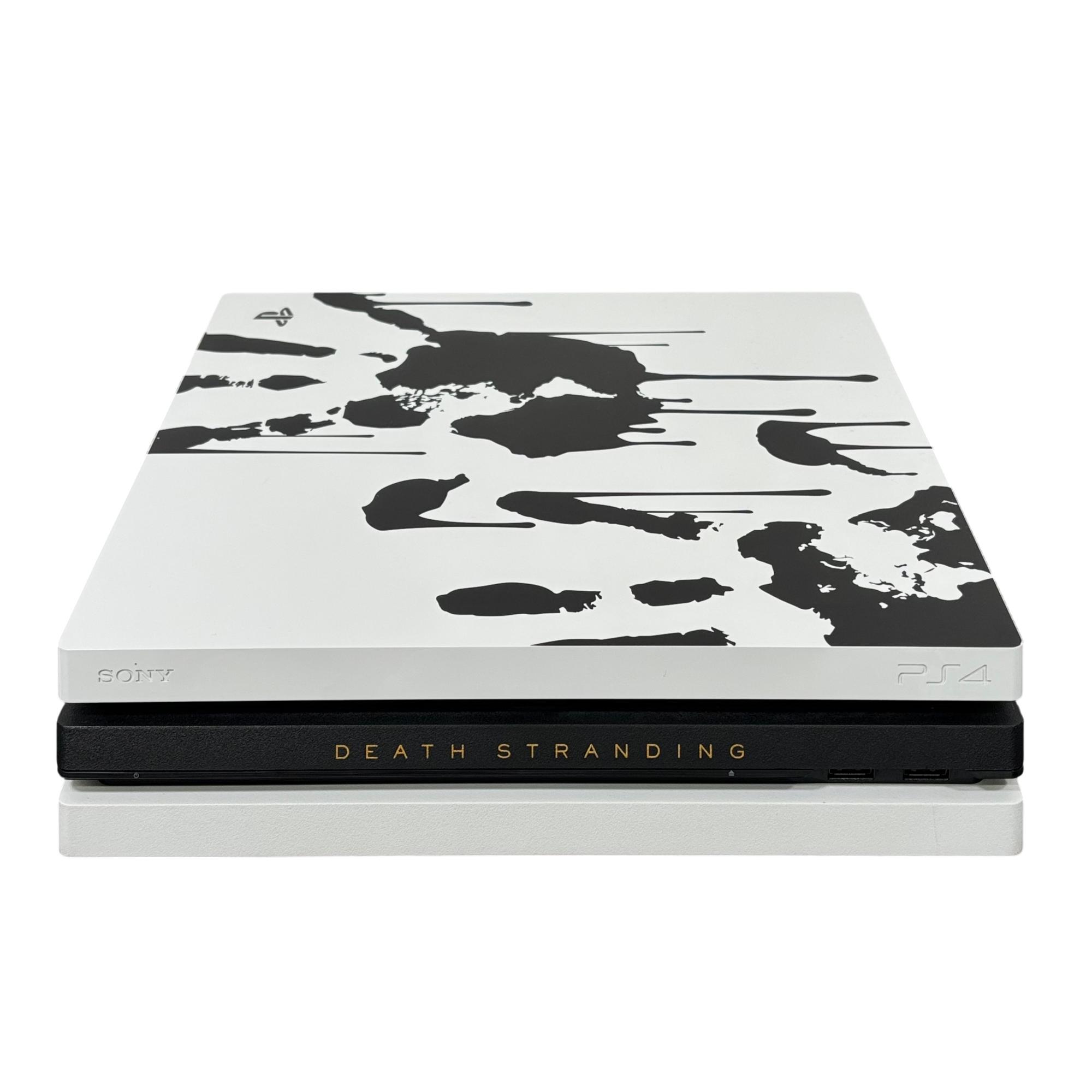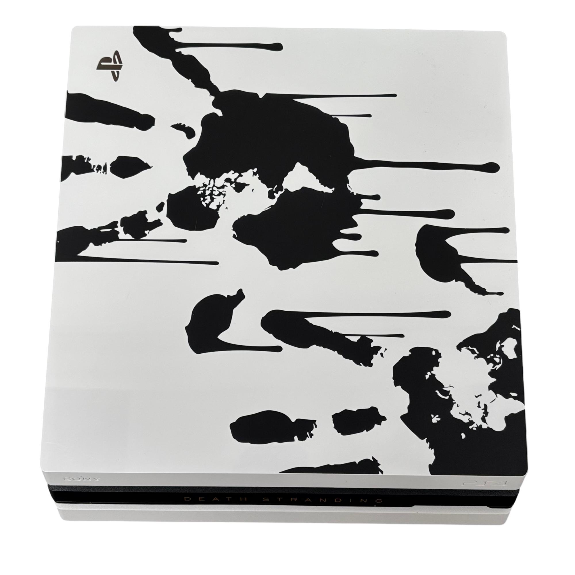 Sony PlayStation 4 Pro 1TB Death Stranding Limited Edition Console (Model CUHJ-10033) features a distinctive black and white design inspired by the Death Stranding game. This gaming console offers enhanced graphics and performance with a 1TB hard drive, making it ideal for immersive gameplay and high-definition entertainment. Its unique artwork and branding make it a standout collectors item for fans and gamers alike.