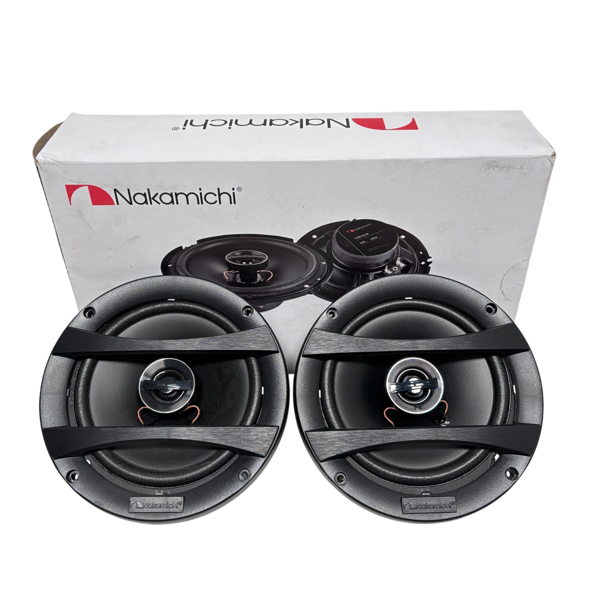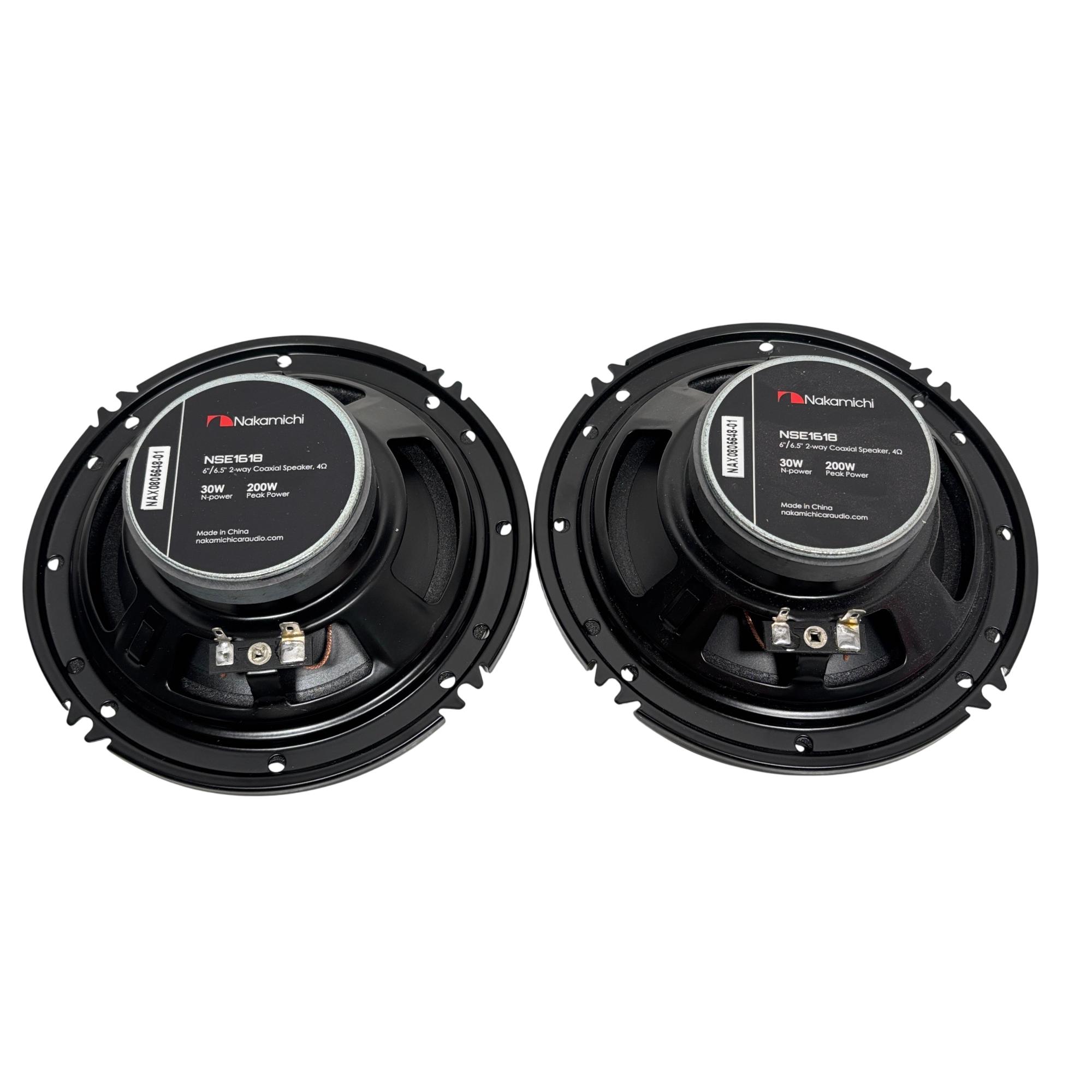 Nakamichi NSE1618 6"/6.5" 2-Way Coaxial Car Speakers deliver clear and powerful sound with a 30W RMS output and 200W peak power handling. These black coaxial speakers feature a 2-way design that enhances audio performance, making them ideal for in-car entertainment systems.
