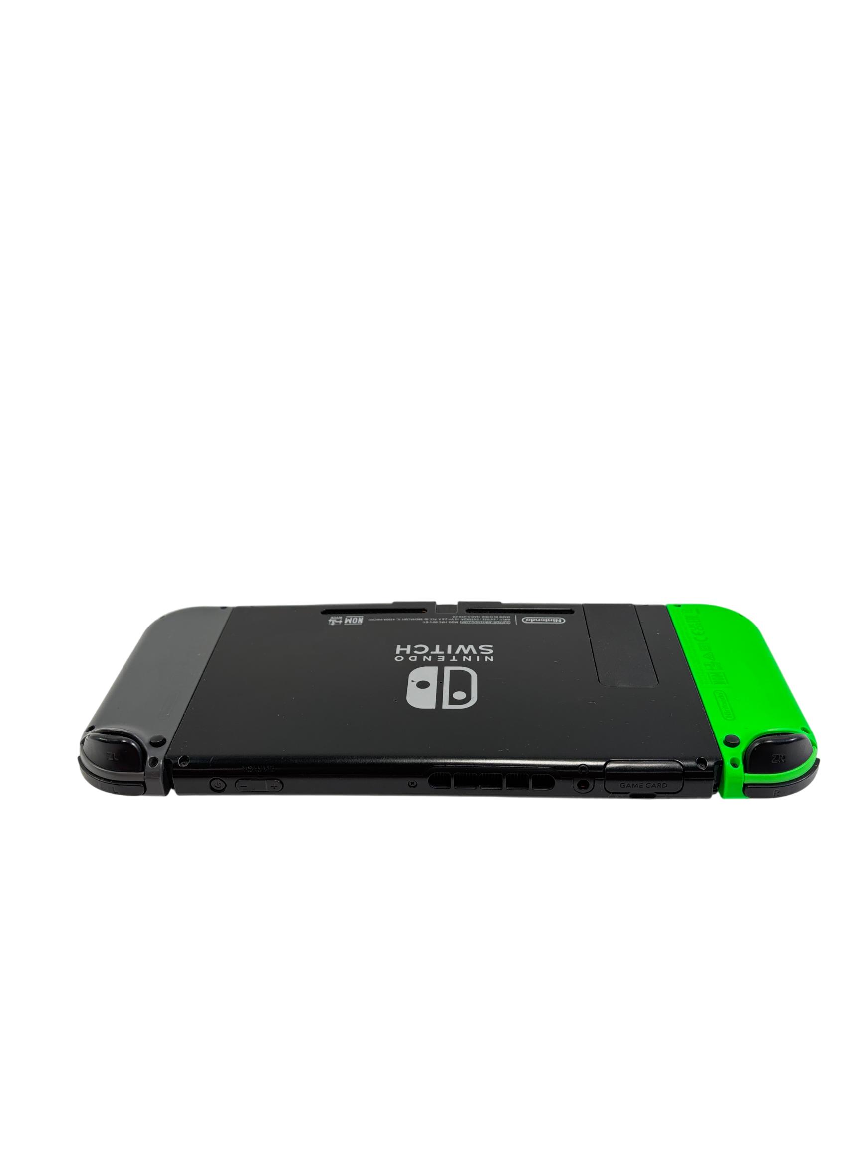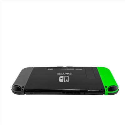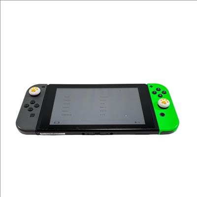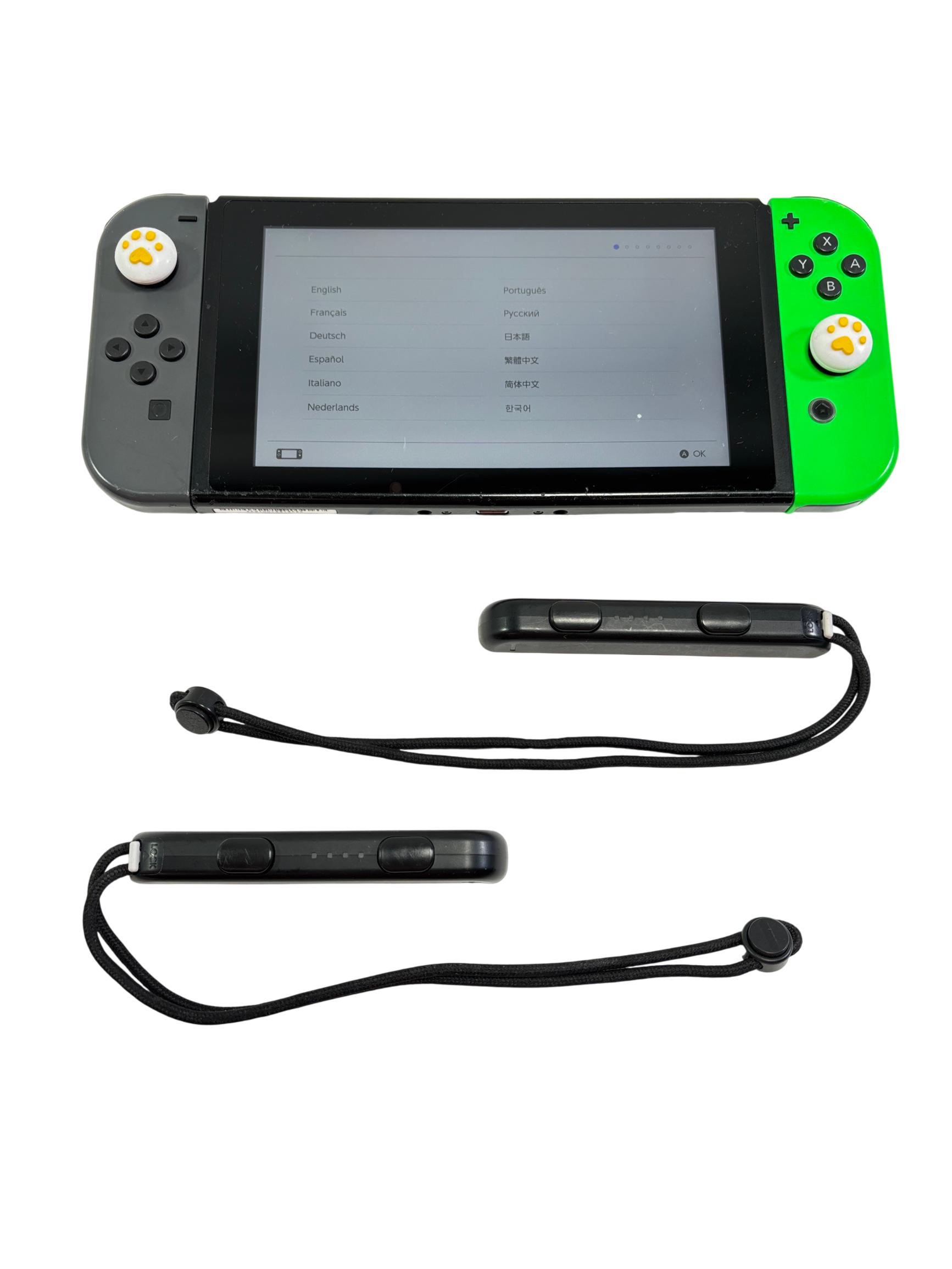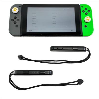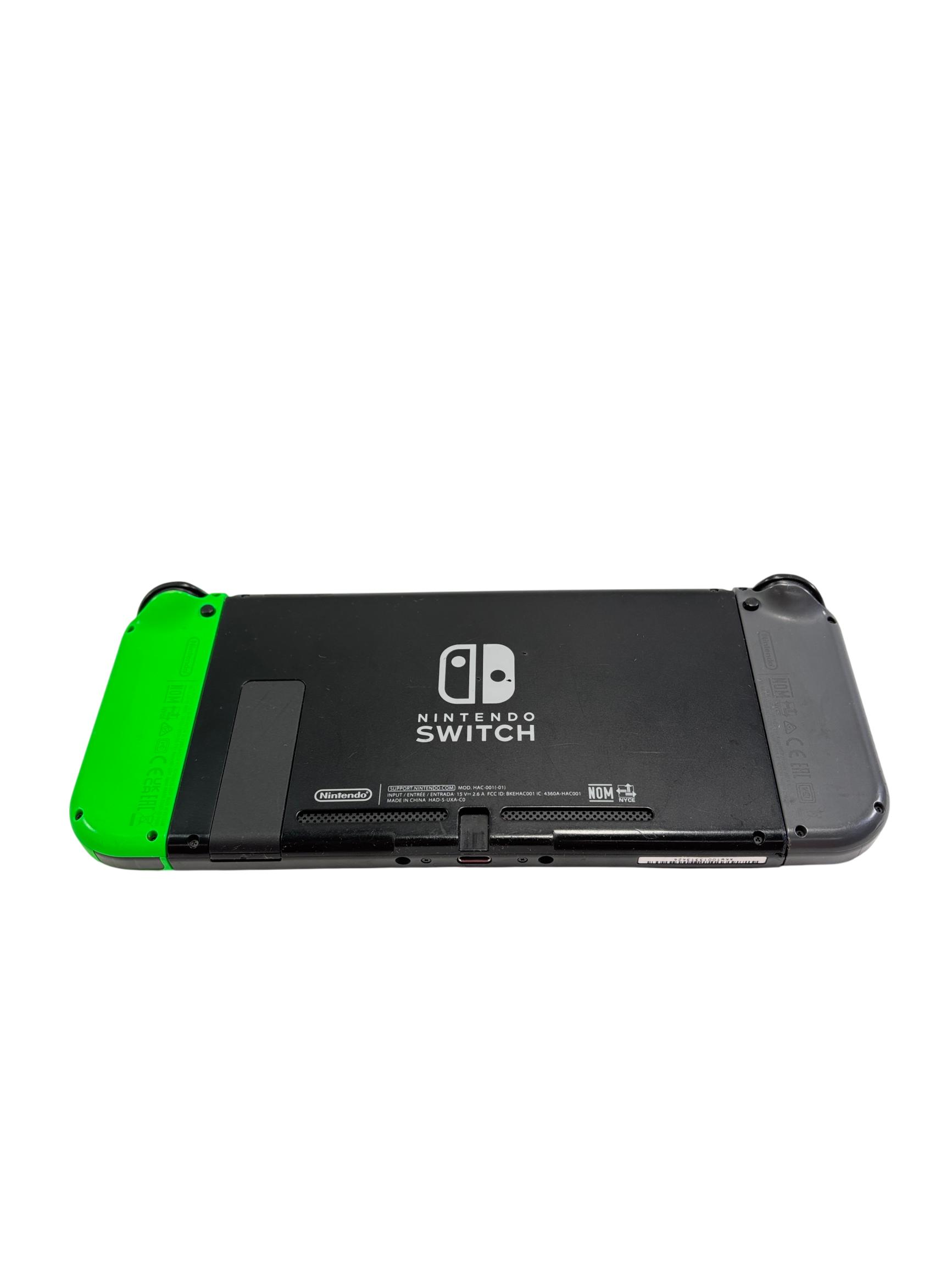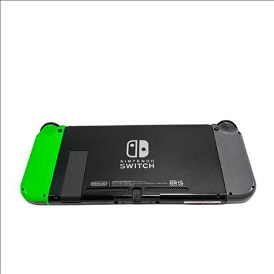 Nintendo Switch Console HAC-001(-01) features a sleek design with black and neon green Joy-Con controllers, offering versatile gameplay options. This model supports multiple languages and includes various input methods, ensuring compatibility and ease of use for a wide range of players.