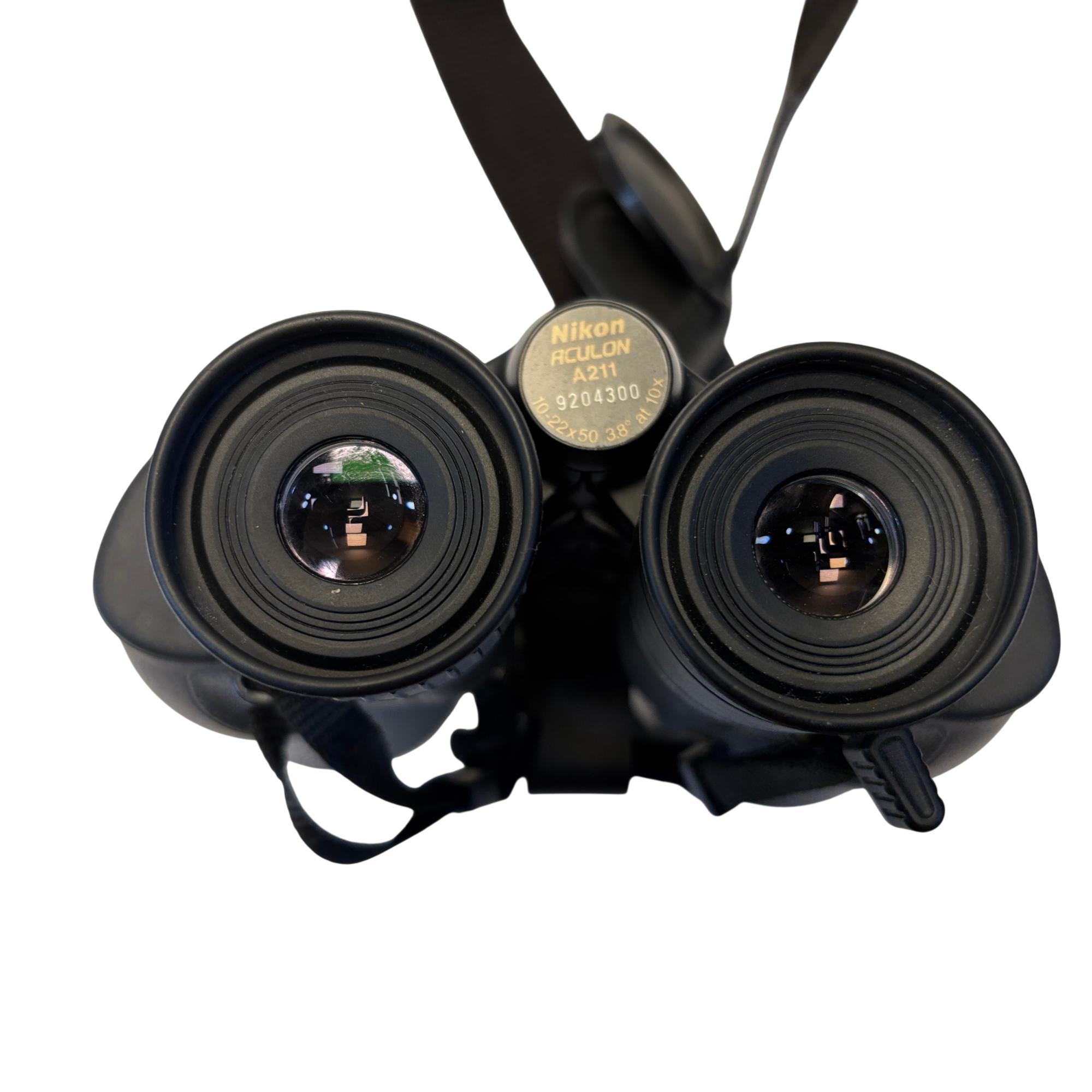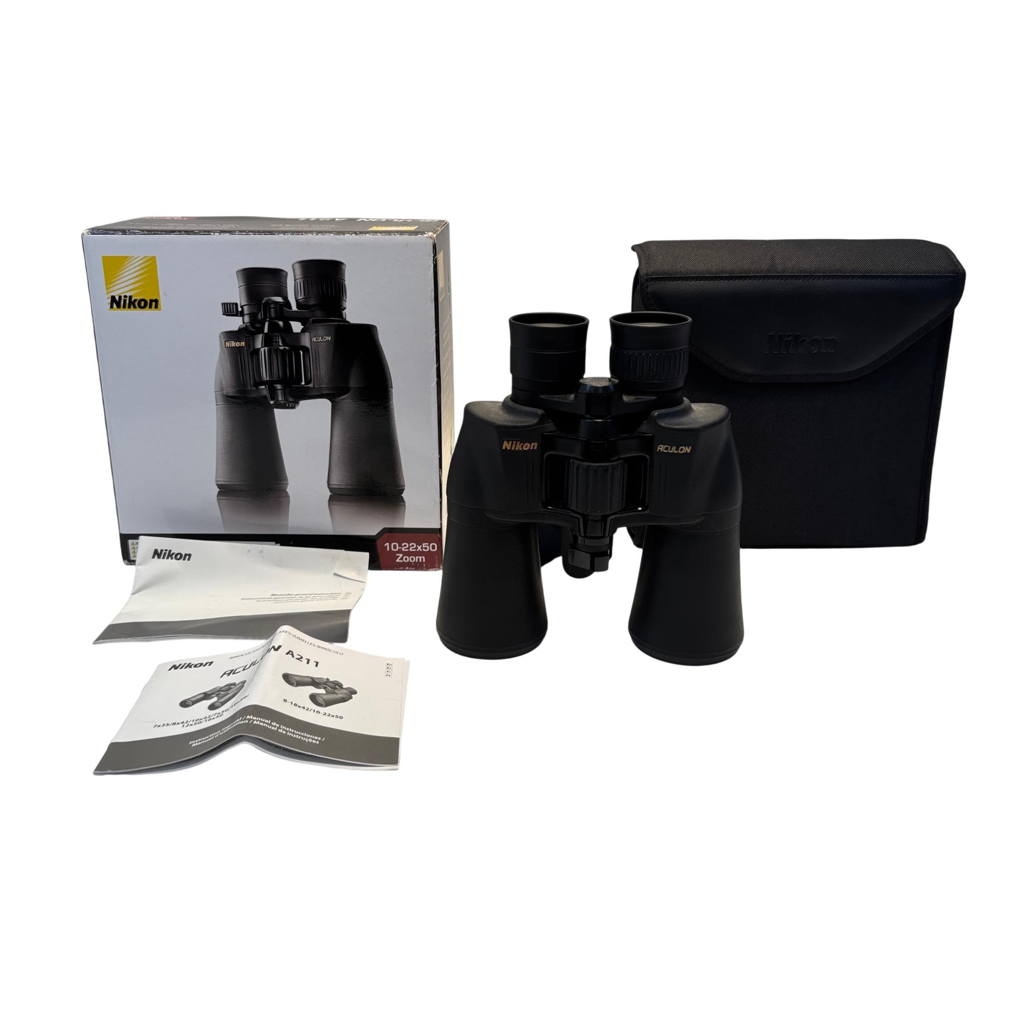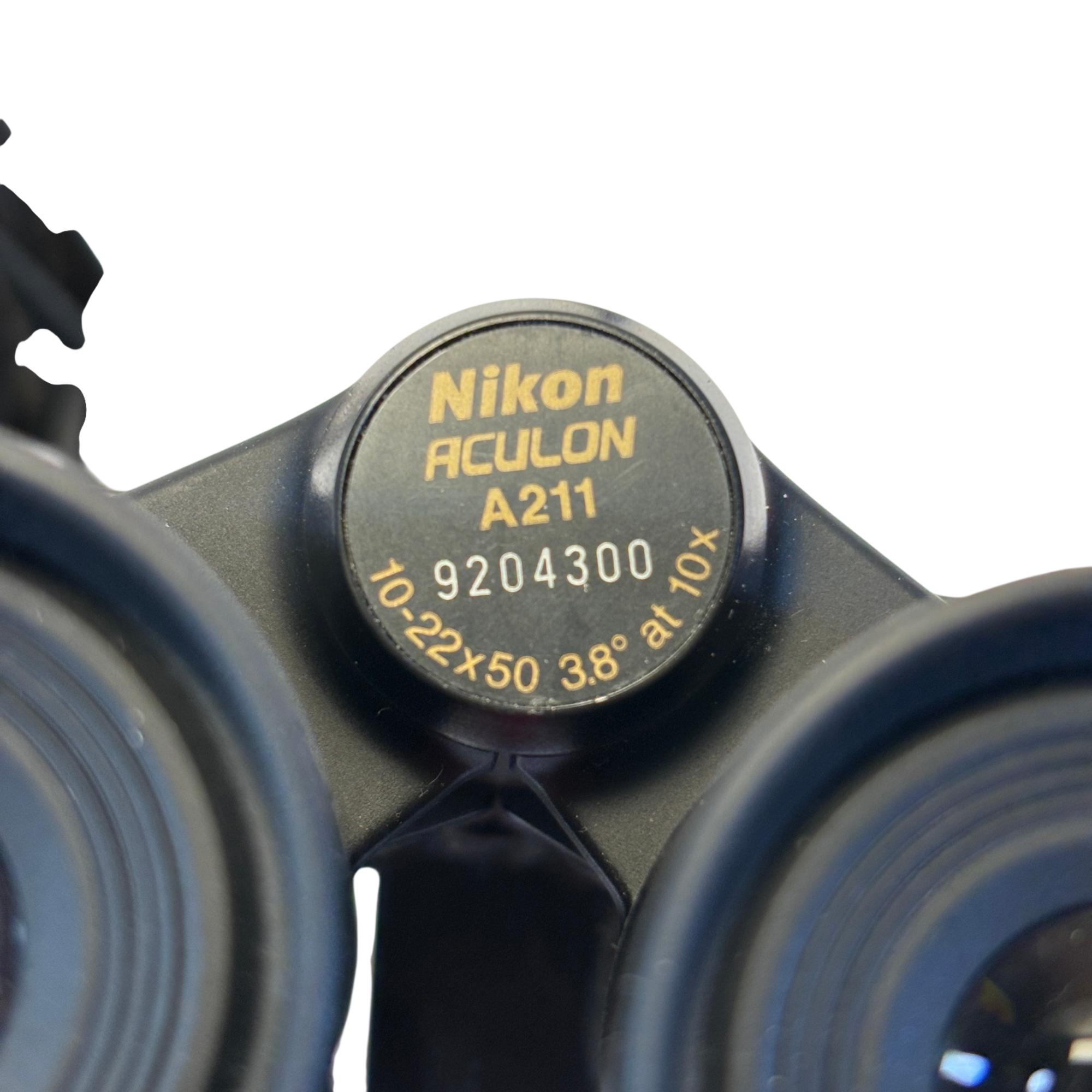 The Nikon ACULON A211 10-22x50 Zoom Binoculars deliver versatile magnification with a zoom range from 10x to 22x, combined with large 50mm objective lenses for bright, clear viewing in various lighting conditions. The Porro prism design enhances depth perception and provides a sharp, detailed image ideal for outdoor activities, birdwatching, and sports events. Constructed with ergonomic features including a comfortable black matte finish and adjustable eyepieces, these binoculars are built for extended use and easy handling.