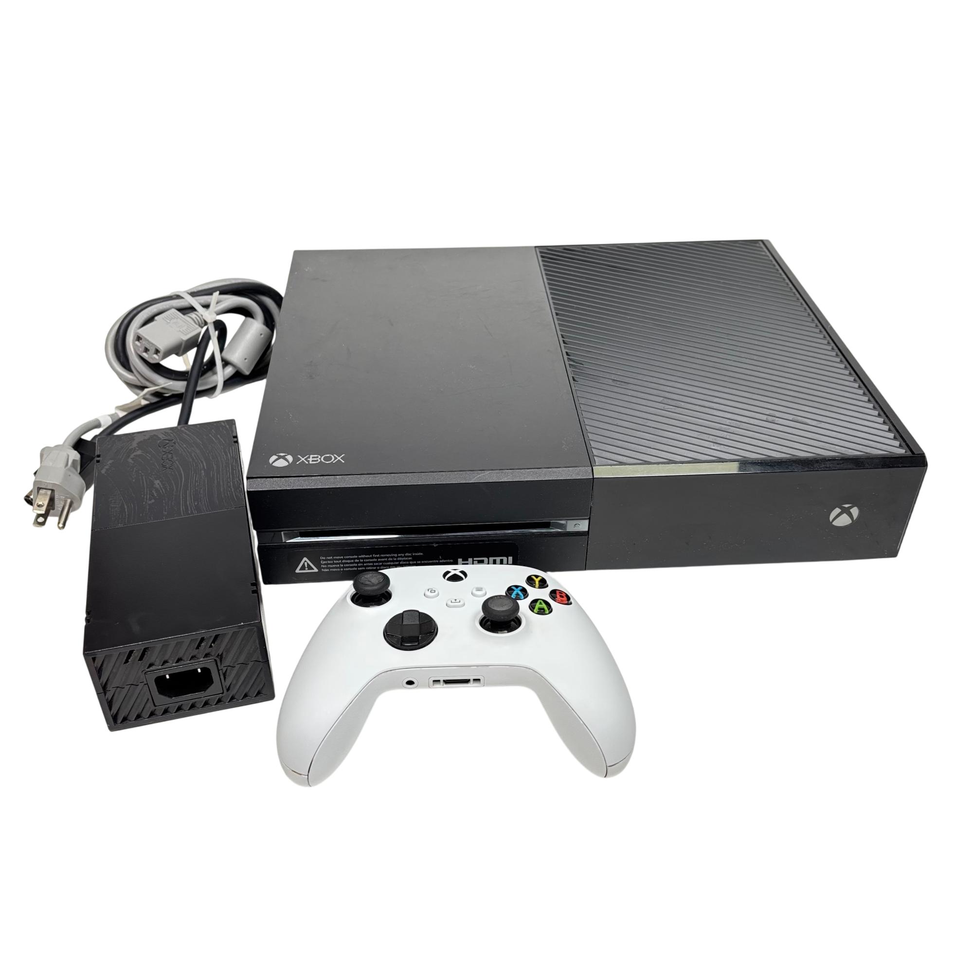 Microsoft Xbox One Model 1540 500GB Black Console offers a sleek and powerful gaming experience with a spacious 500GB hard drive and a modern black design accented by silver stripes. This console features a streamlined interface and supports a wide range of games with high-definition graphics, complemented by a responsive white wireless controller for seamless gameplay.