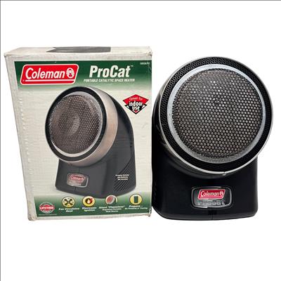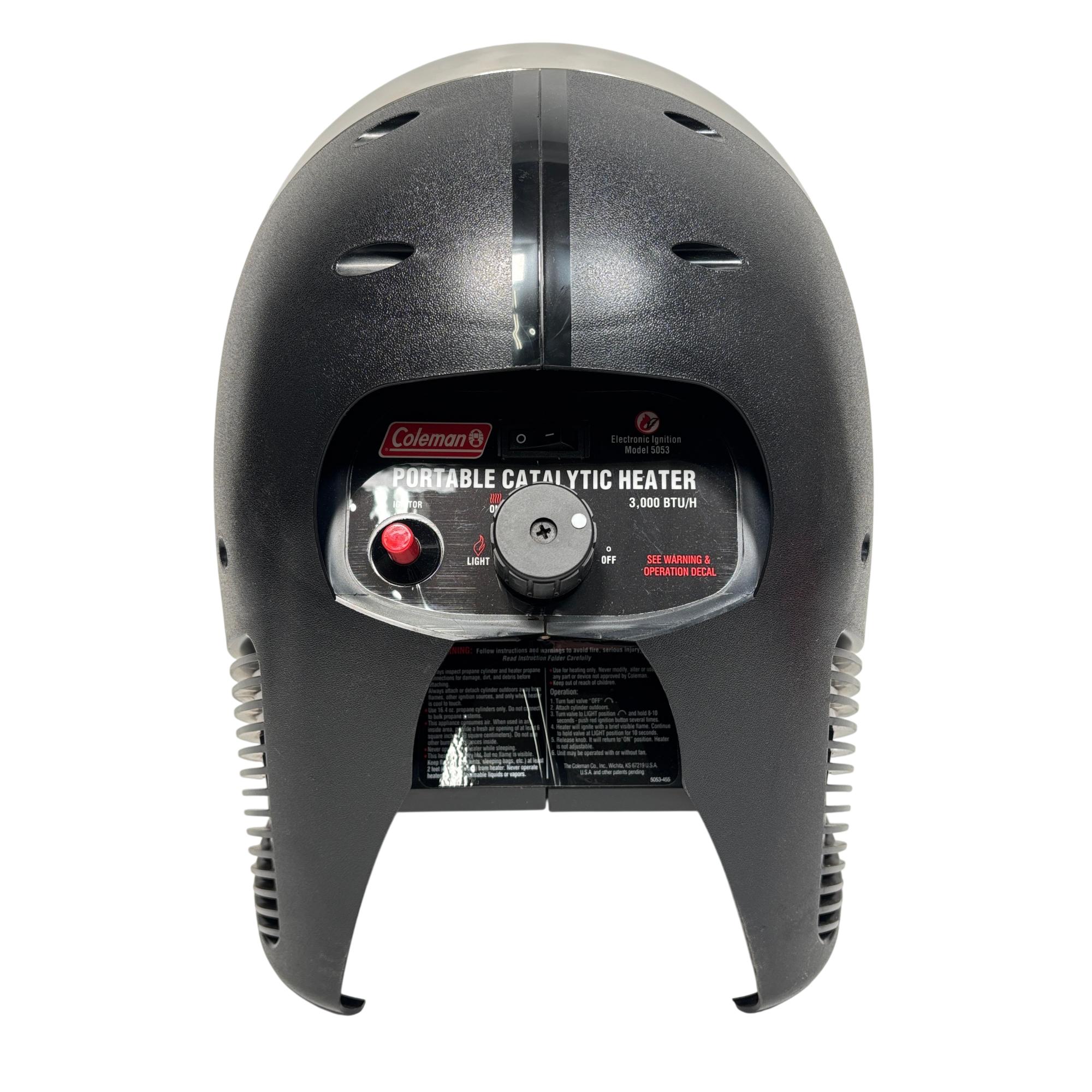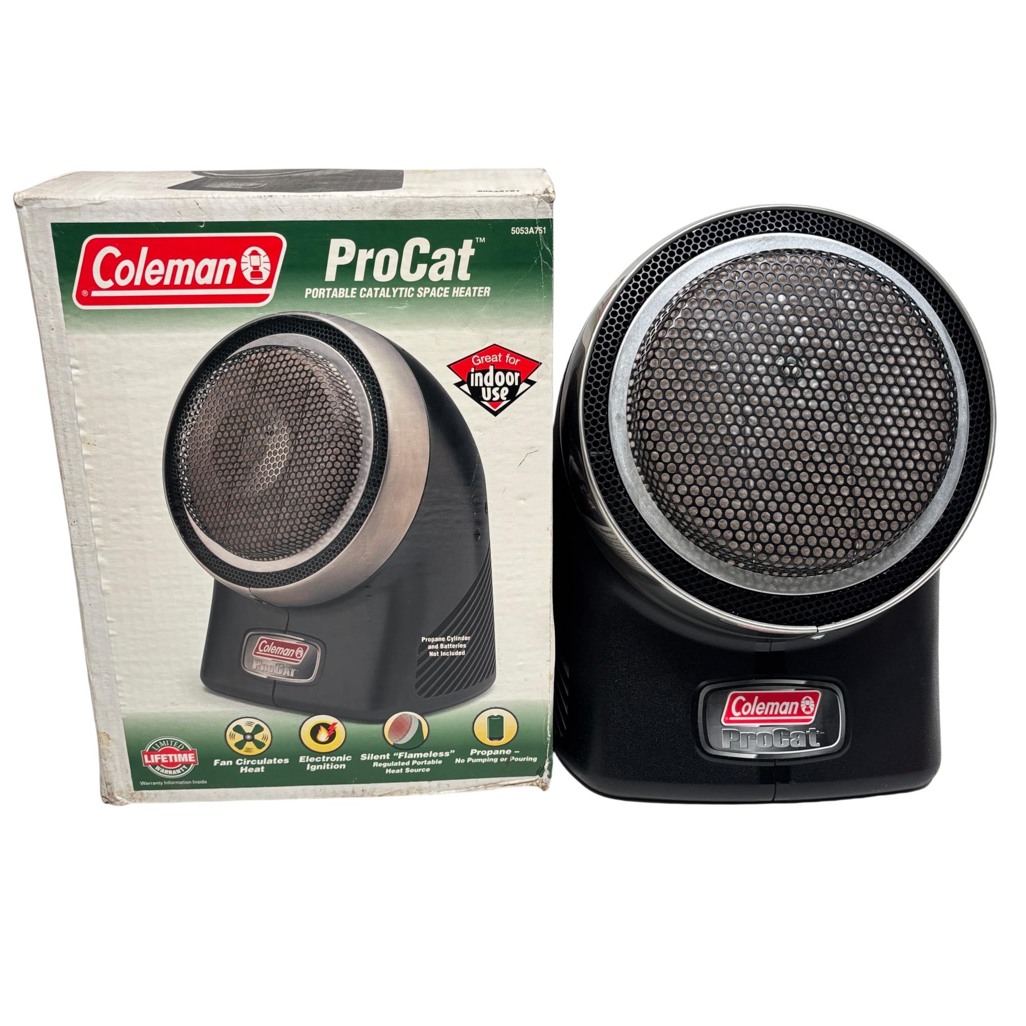 Coleman ProCat Portable Catalytic Heater Model 5053 with Fan, 3,000 BTU/H provides efficient and silent flameless heating ideal for indoor use. This portable heater features an electronic ignition system and operates on propane, delivering consistent warmth with a built-in fan for enhanced heat circulation. Designed for safe operation, it includes multiple safety warnings and is suitable for use in enclosed spaces where controlled heating is needed.