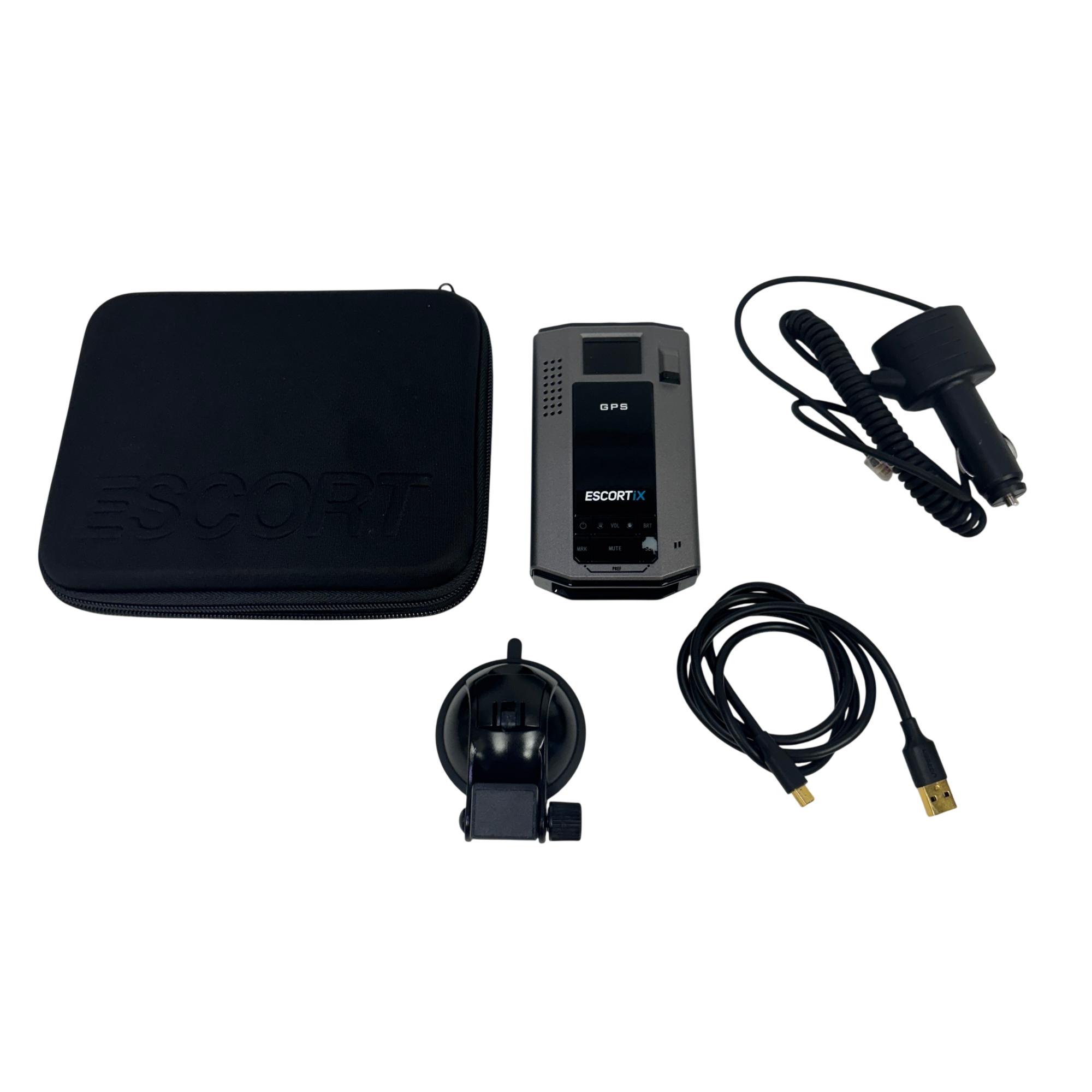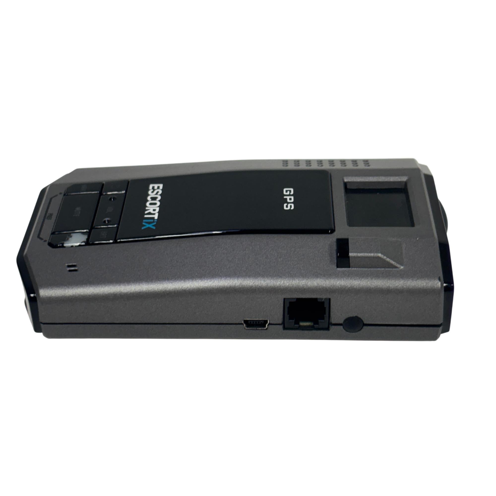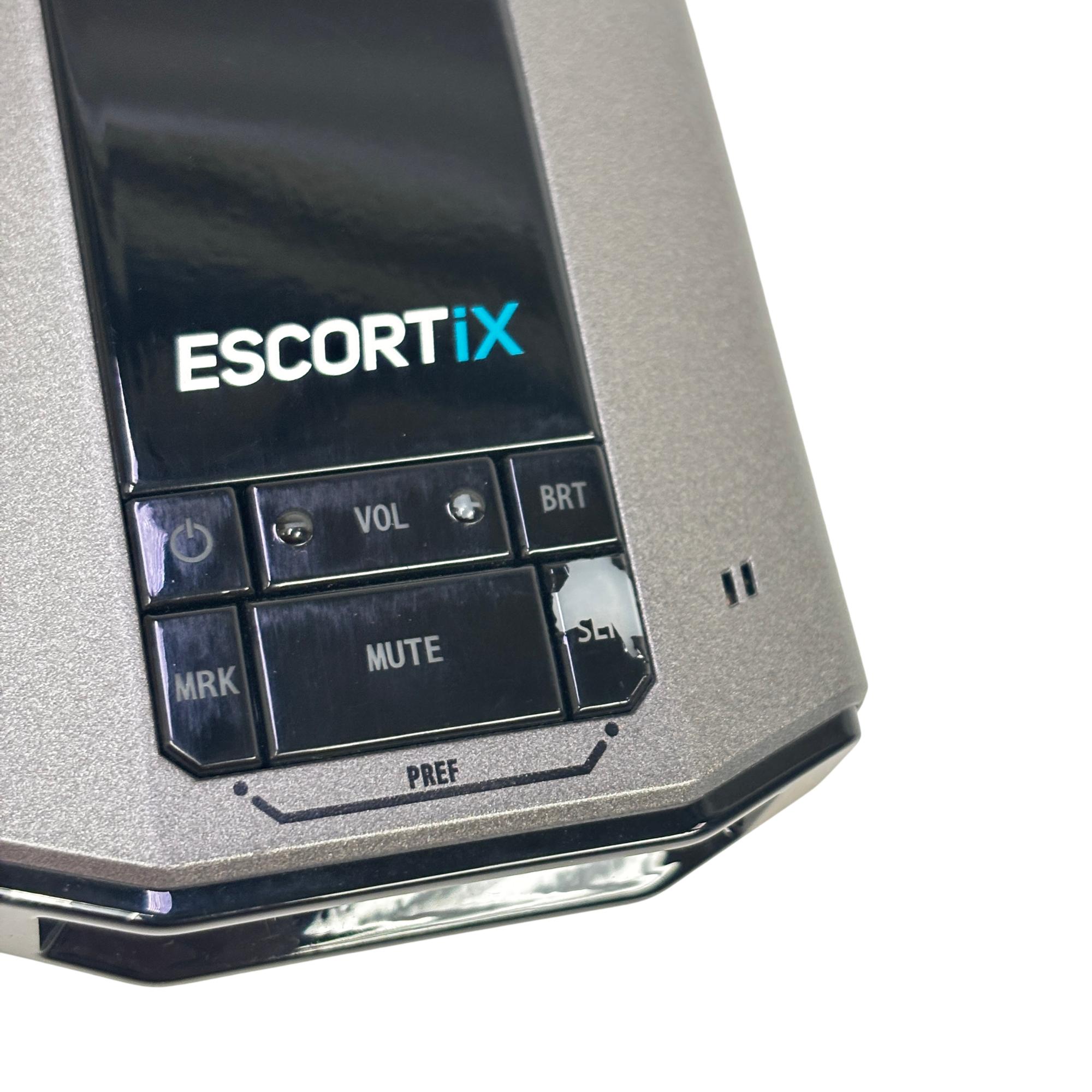 This Escort iX Radar and Laser Detector with GPS offers advanced detection capabilities with a clear black design featuring an intuitive keypad and multiple function buttons for volume, mute, and preset controls. This compact electronic device integrates GPS technology to enhance radar and laser signal identification, ensuring reliable performance and real-time updates for improved driving safety.