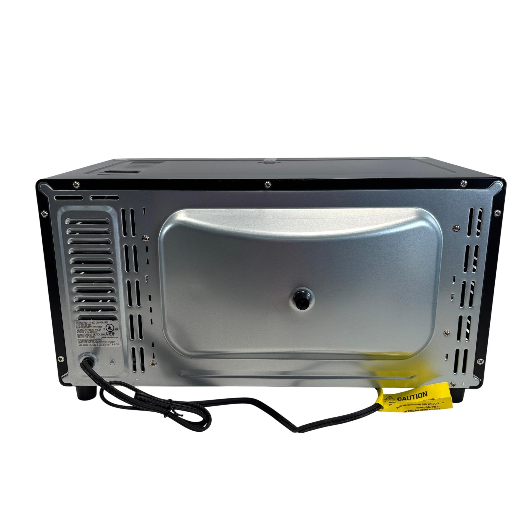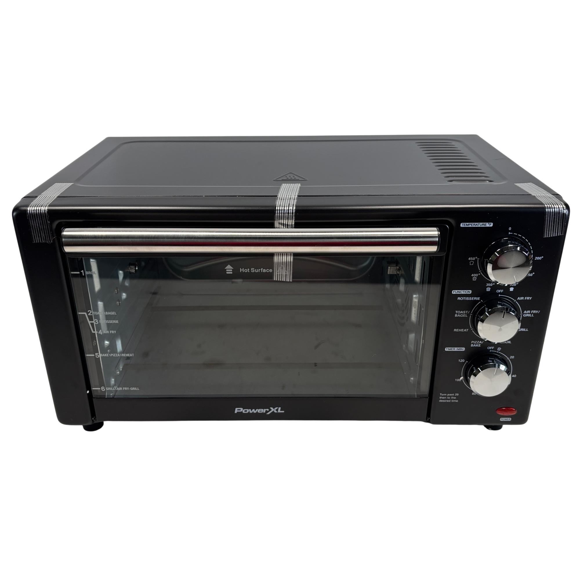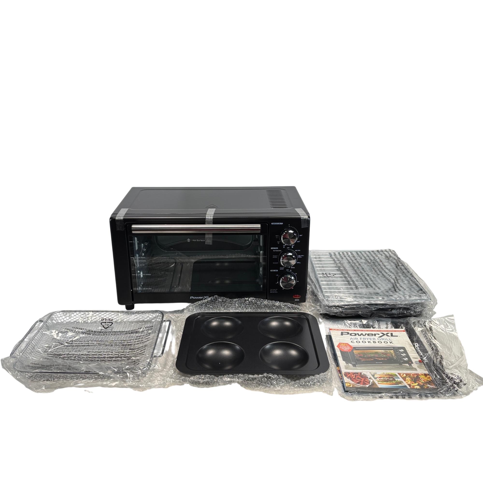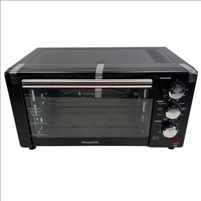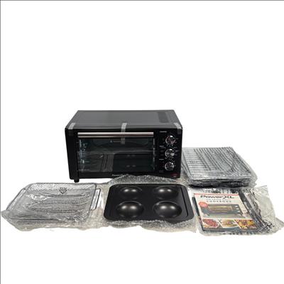 The PowerXL Air Fryer Toaster Oven Grill B-AFO-002G is a versatile kitchen appliance designed for roasting, baking, and grilling with convection technology. Featuring a sleek black design with multiple vented surfaces for optimal heat circulation, it combines the functionality of an air fryer and toaster oven into one compact machine. This appliance enhances cooking efficiency for a variety of meals while maintaining a modern and practical aesthetic.