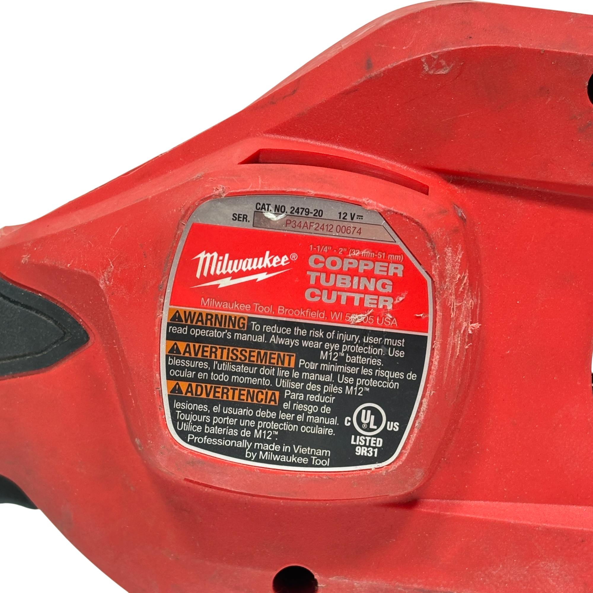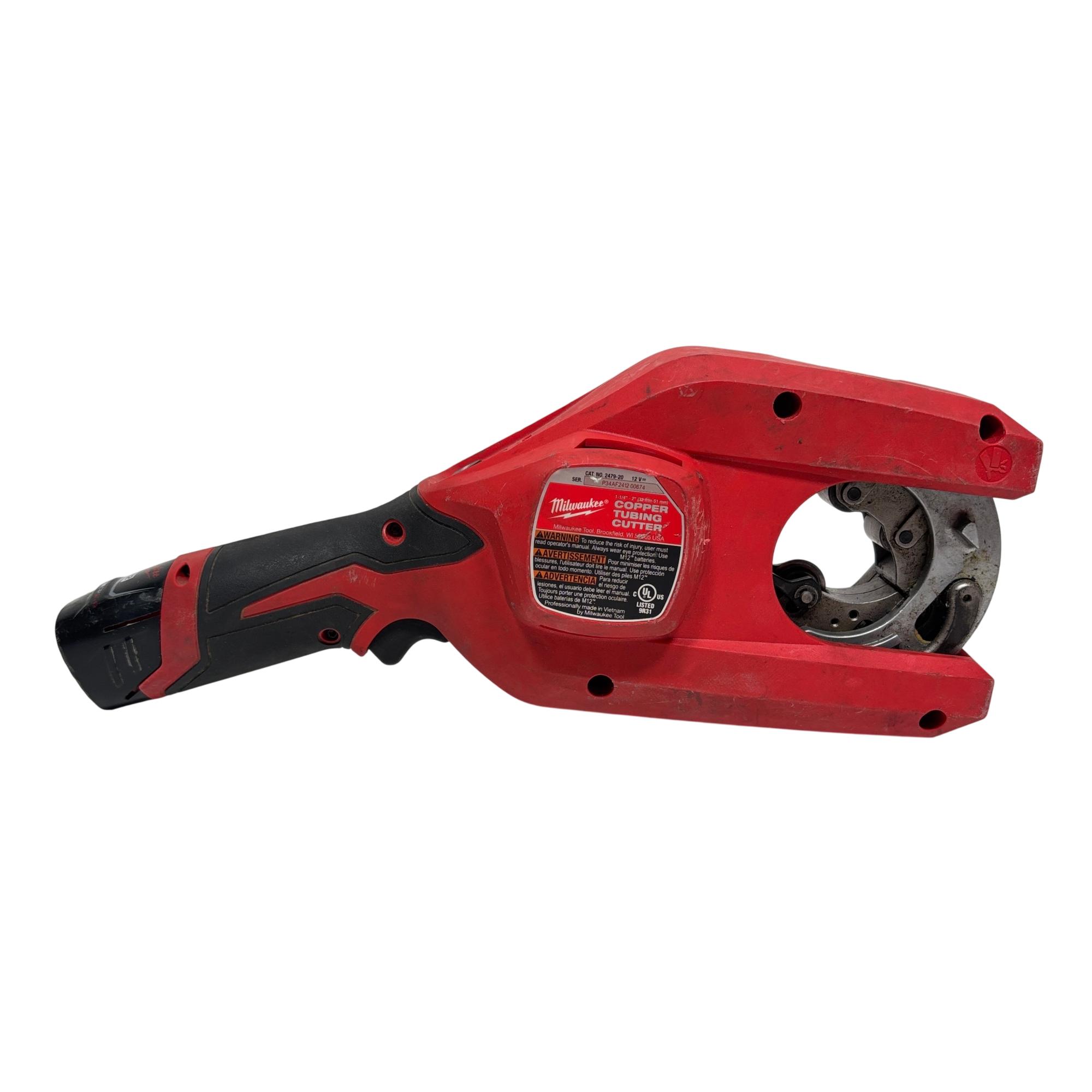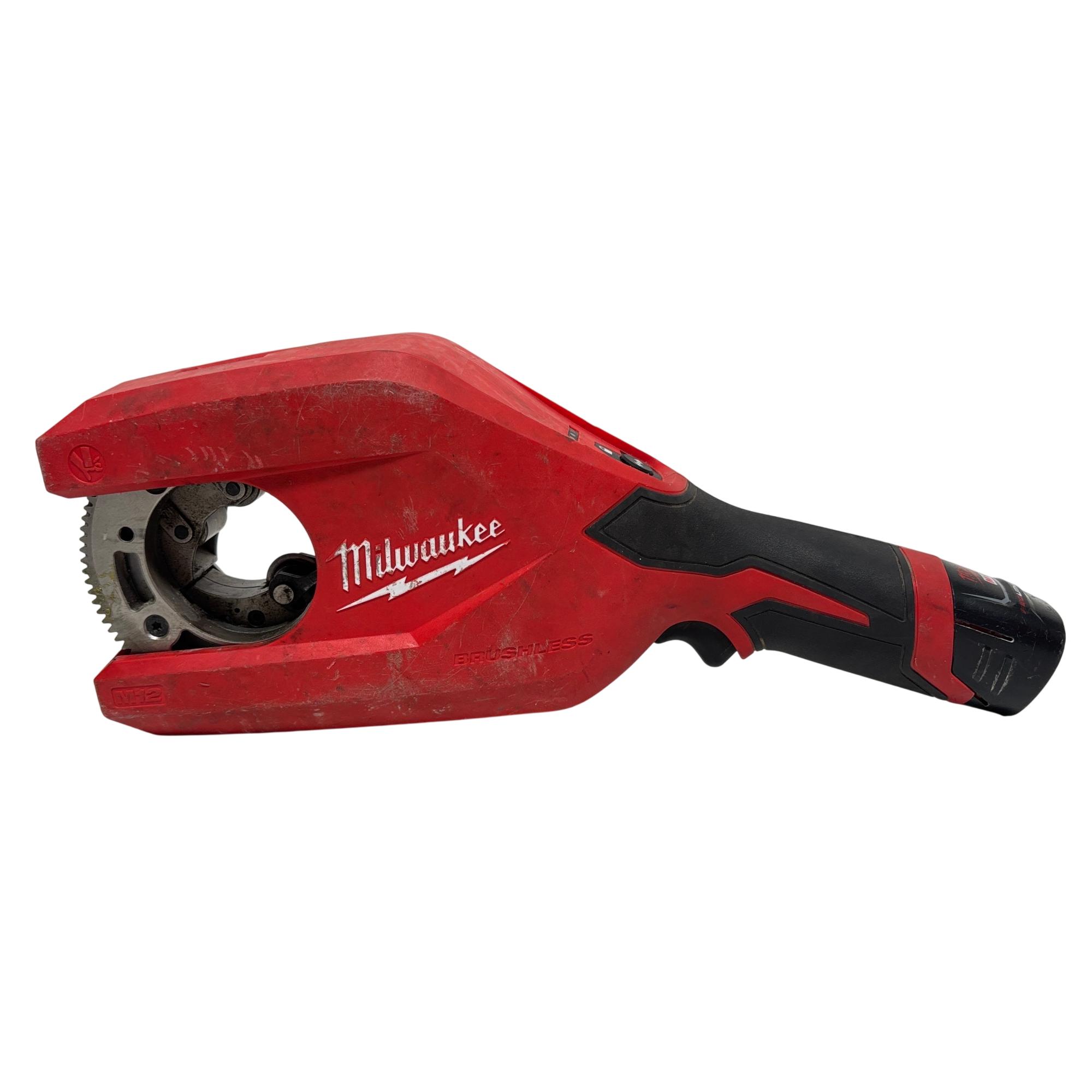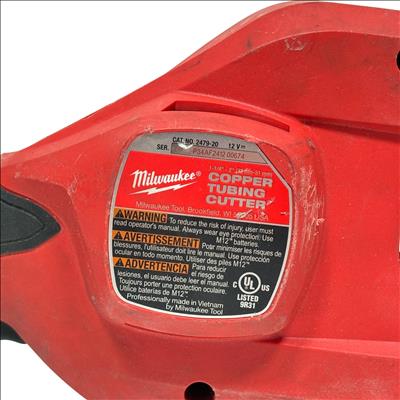 Milwaukee 2479-20 M12 Brushless Copper Tubing Cutter is a powerful and compact cordless tool designed for cutting copper tubing ranging from 1-1/4 inches to 2 inches in diameter. Featuring a brushless motor, this red and black device ensures efficient and precise cuts, making it ideal for professional pipe fitting and plumbing tasks.
