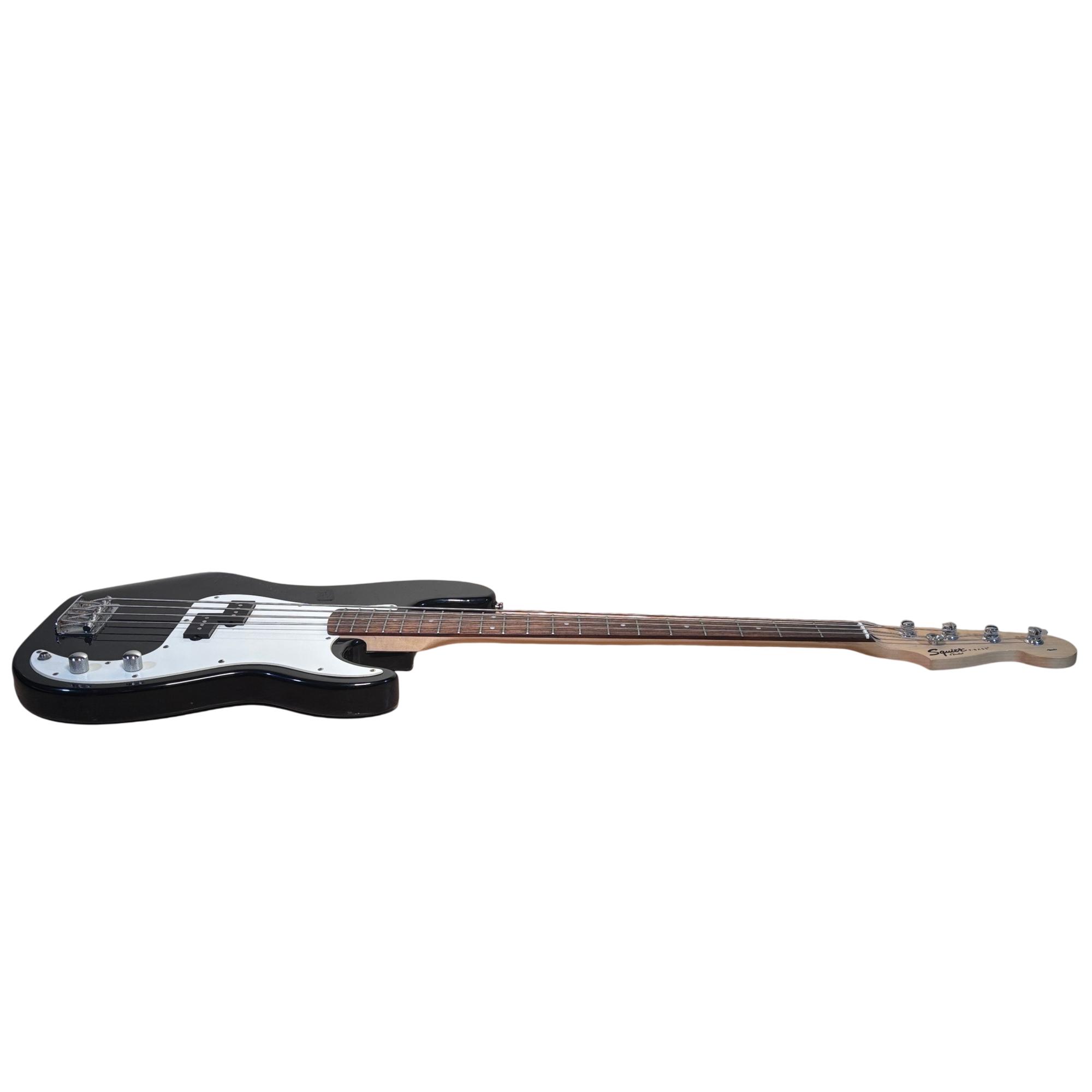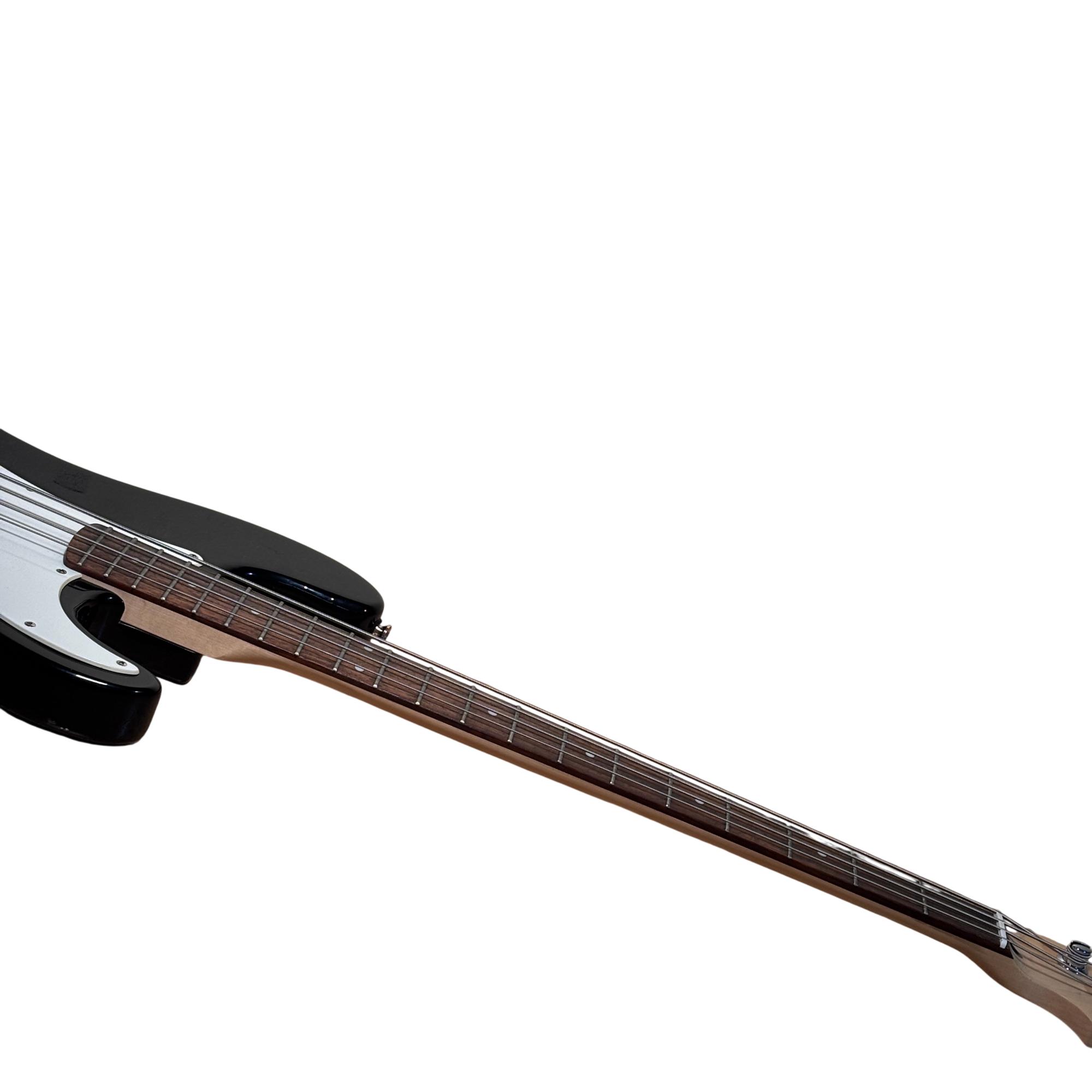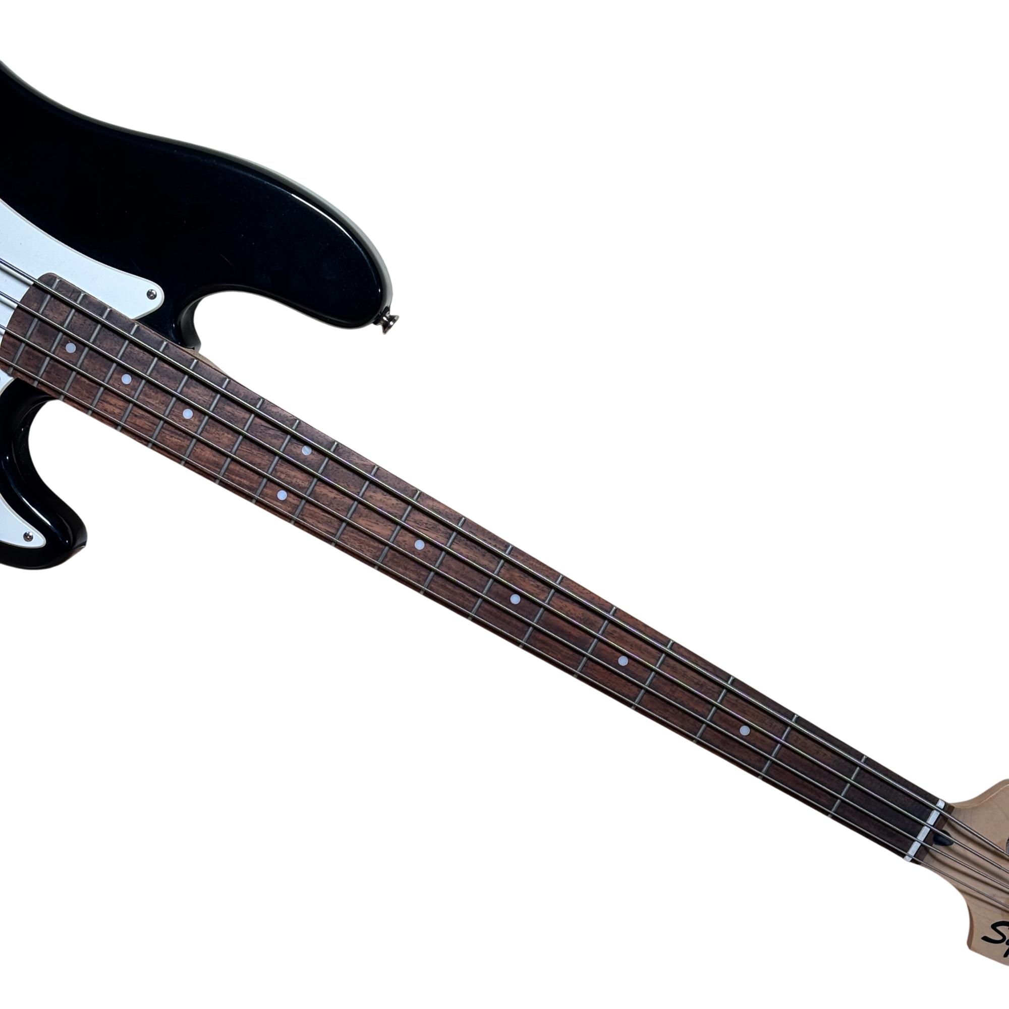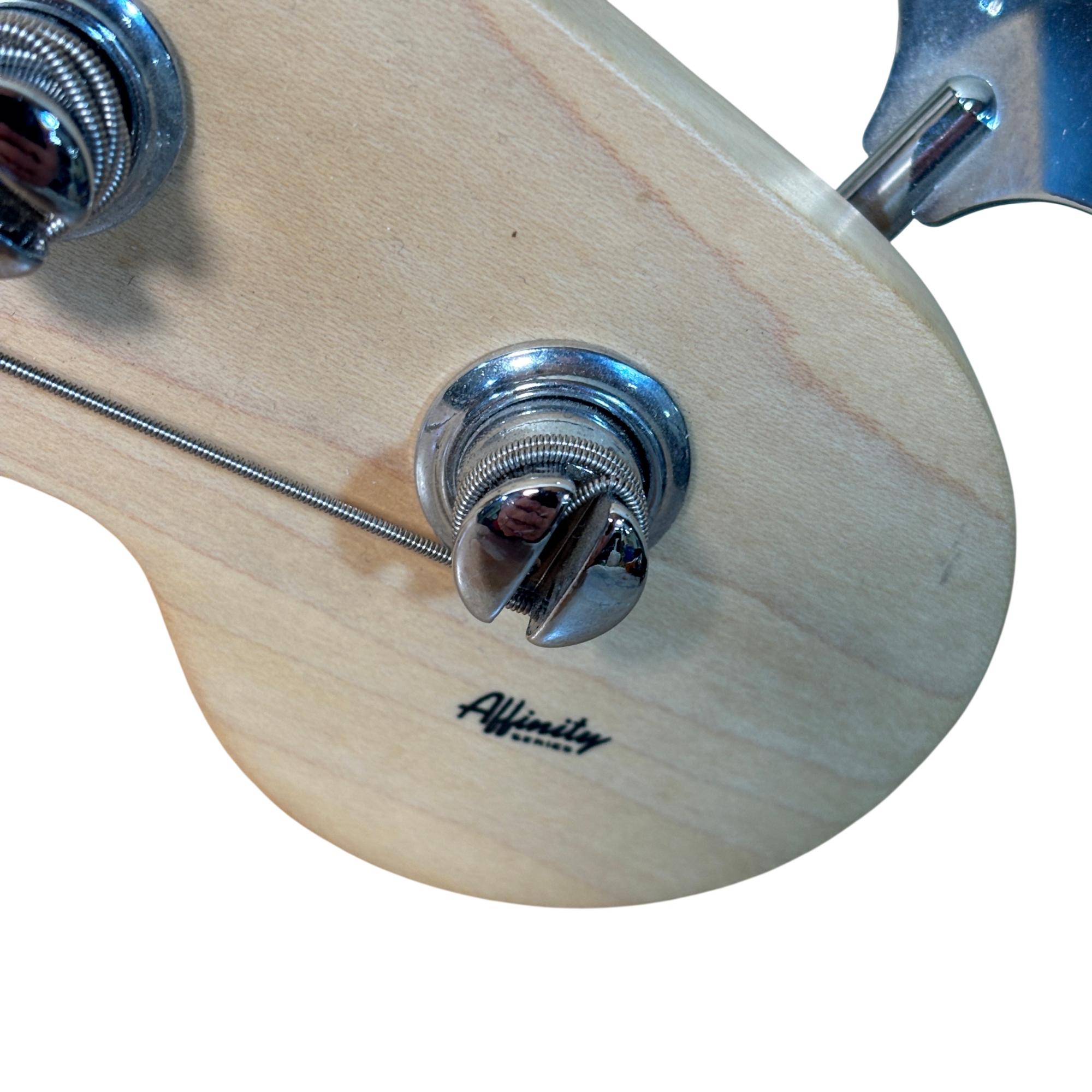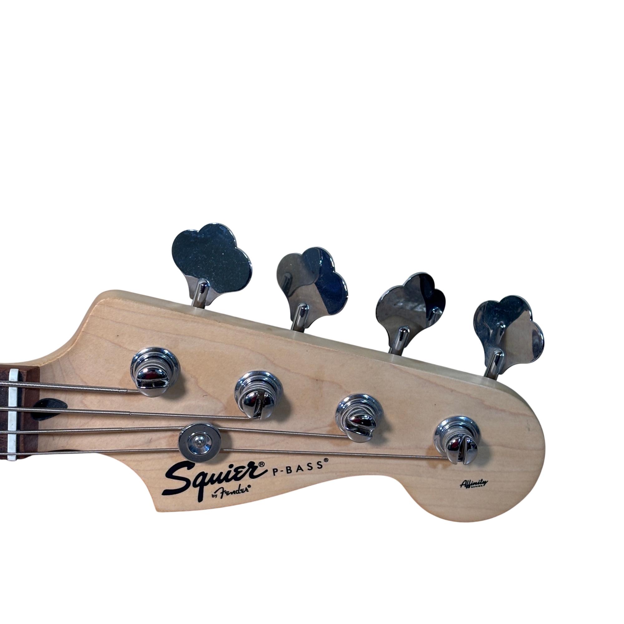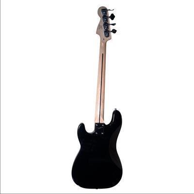 Squier Affinity Series Precision Bass (P-Bass) in Black features a classic design with a laurel fingerboard that provides a smooth playing experience. This electric bass guitar is known for its solid construction and traditional split-coil pickup, delivering warm, punchy tones ideal for various music styles. Its sleek black finish and comfortable neck make it a reliable choice for both beginners and experienced players seeking an affordable precision bass.