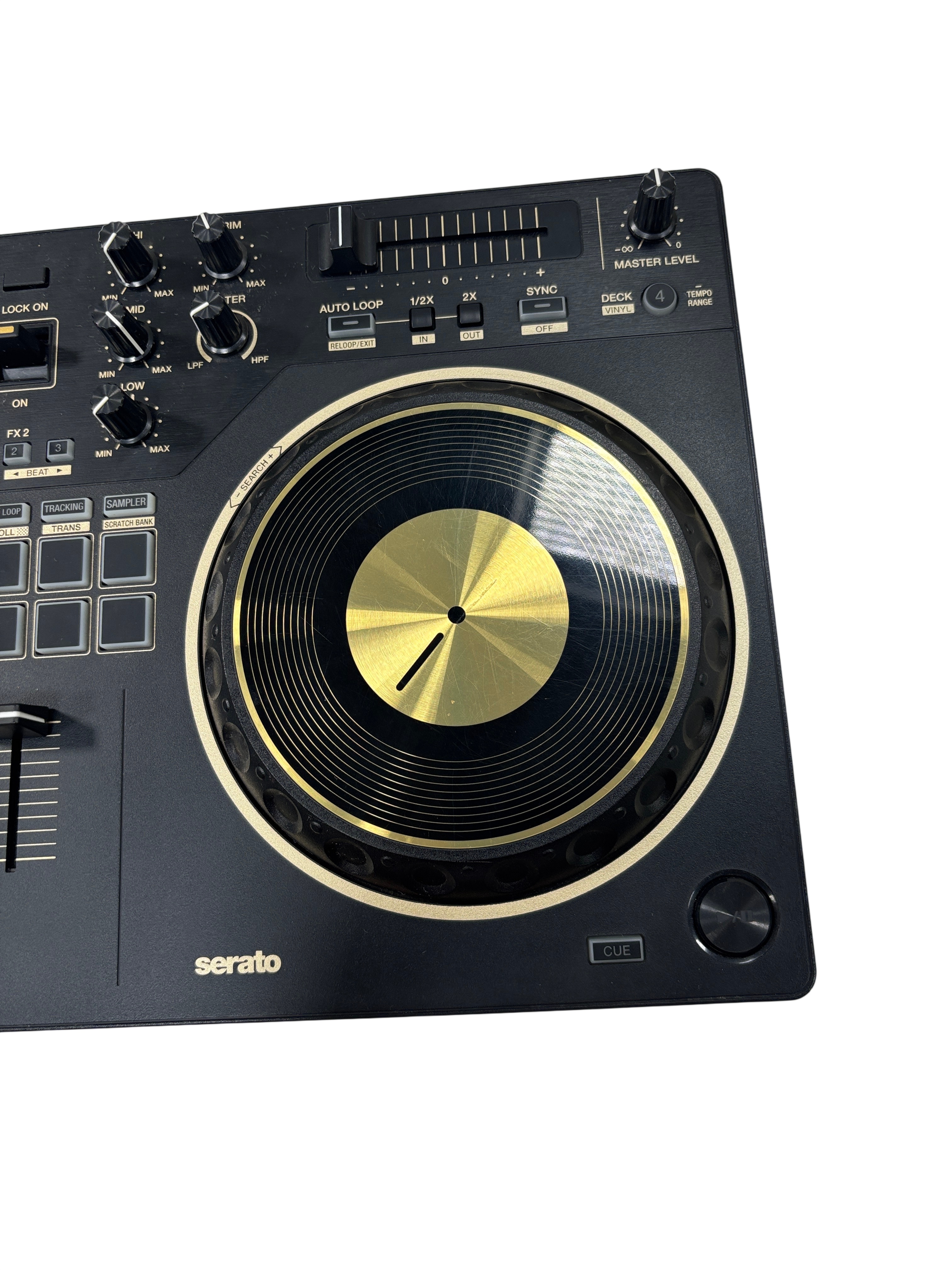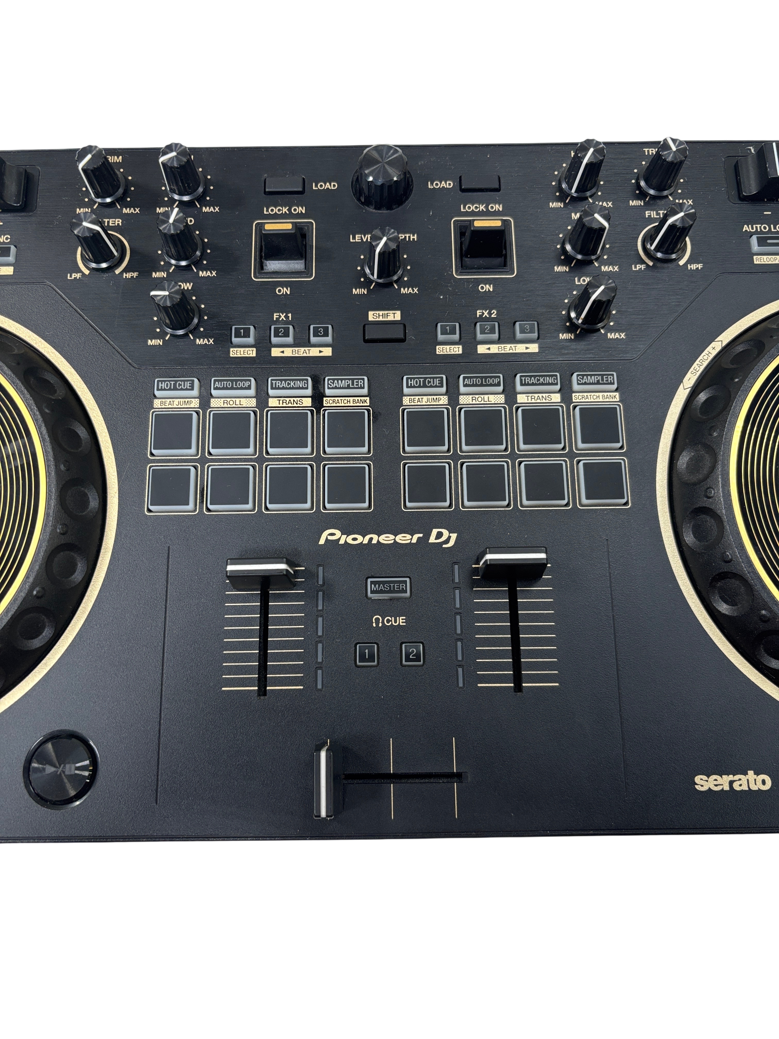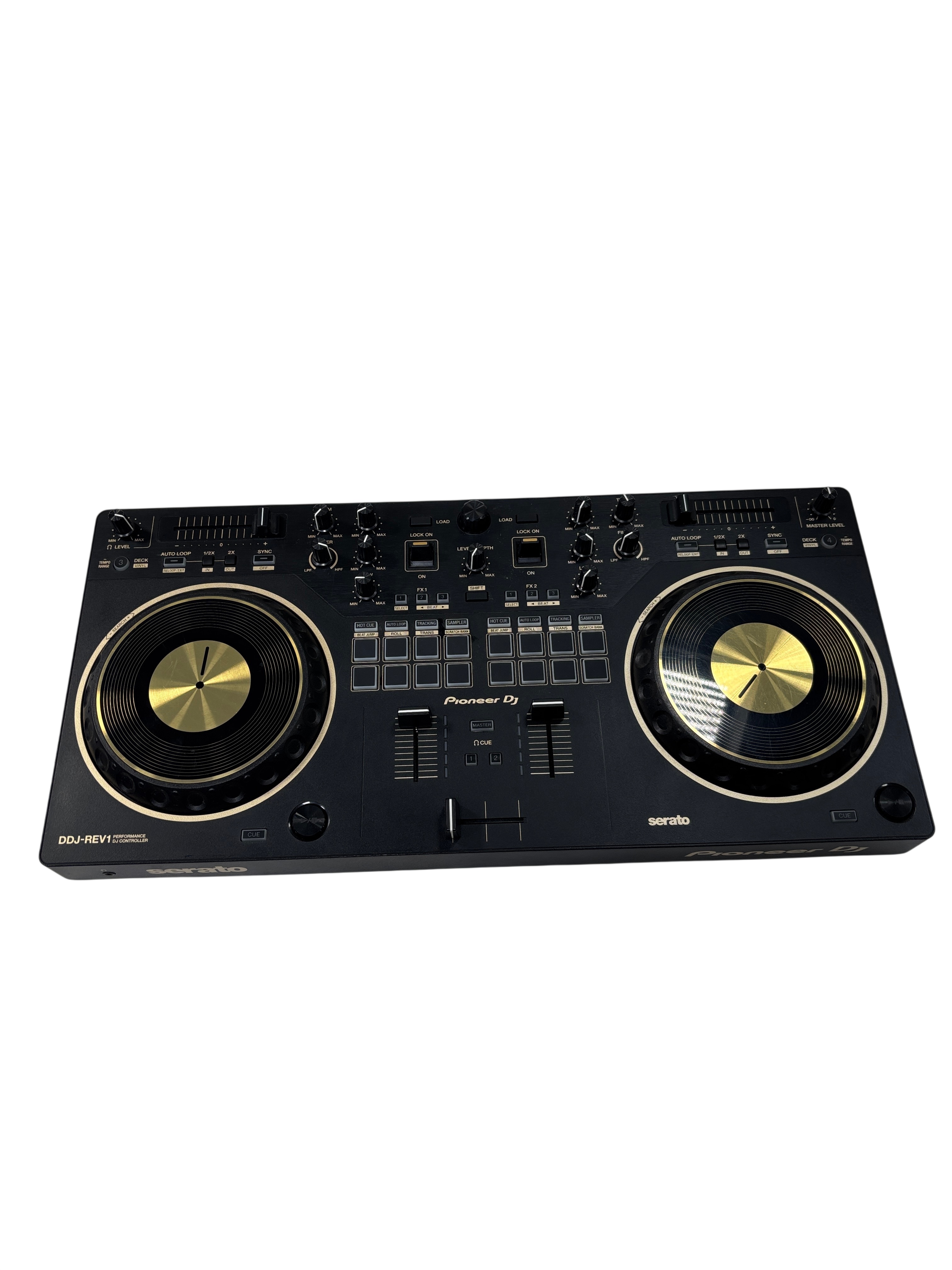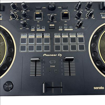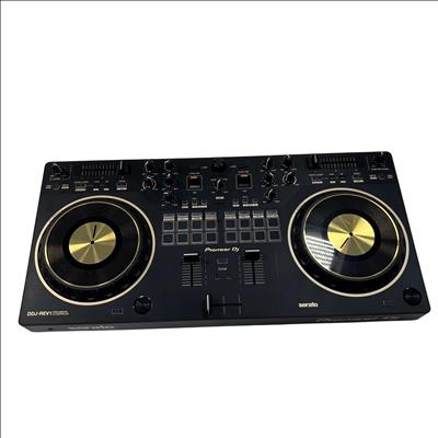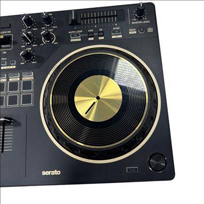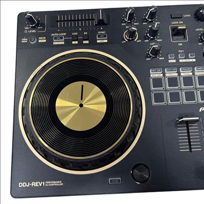 A 2-channel scratch-style DJ controller that mimics the setup of professional battle DJs with an interface designed to emulate PLX turntables and a DJM-S series mixer. With dimensions of 526 mm in width, 59.2 mm in height, and 255.5 mm in depth, and weighing 2.1 kg, this controller features a 24 bit/48 kHz soundcard, a signal-to-noise ratio of 103 dB, and a distortion rate of less than 0.005%. It supports a frequency range of 20 - 20000 Hz and is powered via USB Type-B, consuming 5V 500mA. The DDJ-REV1 offers expanded control for mixing and scratching with its 60mm tempo sliders placed horizontally above the decks for precise speed adjustments, and Performance Pads located in the mixer section for intuitive effects combination, sample triggering, and track scratching. Lever FX allows dynamic texture addition to music, with the ability to apply effects from Serato DJ Lite either in short bursts or locked on for continuous play, facilitating hands-free operation for scratching or track browsing.