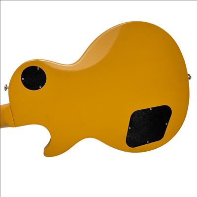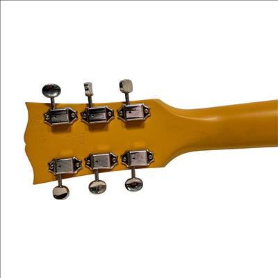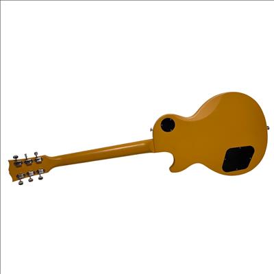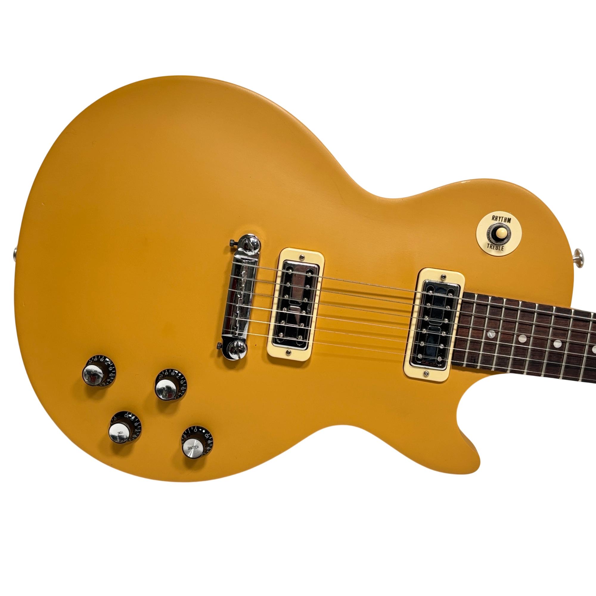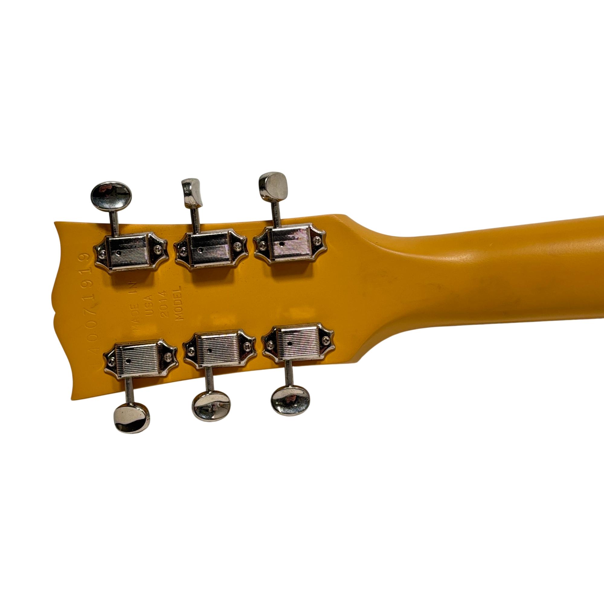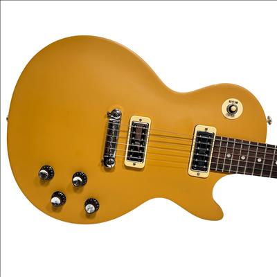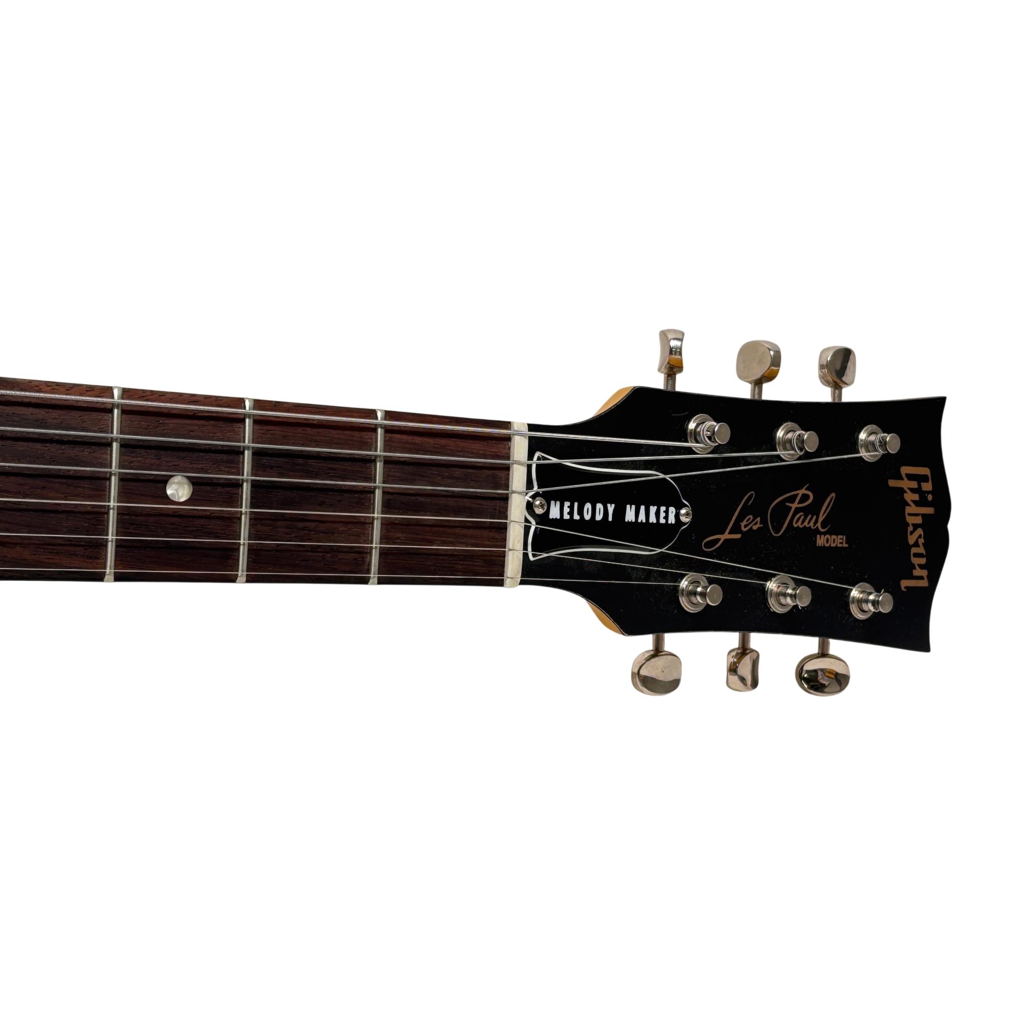 2014 Gibson Les Paul Melody Maker 120th Anniversary Gold Top Electric Guitar features a solid body design with a vibrant gold top finish and classic Les Paul neck. This electric guitar includes multiple control knobs and switches for versatile tone shaping, along with black strings that complement its vintage-inspired aesthetic. Known for its comfortable playability and distinctive sound, it is suitable for players seeking a reliable and stylish instrument.