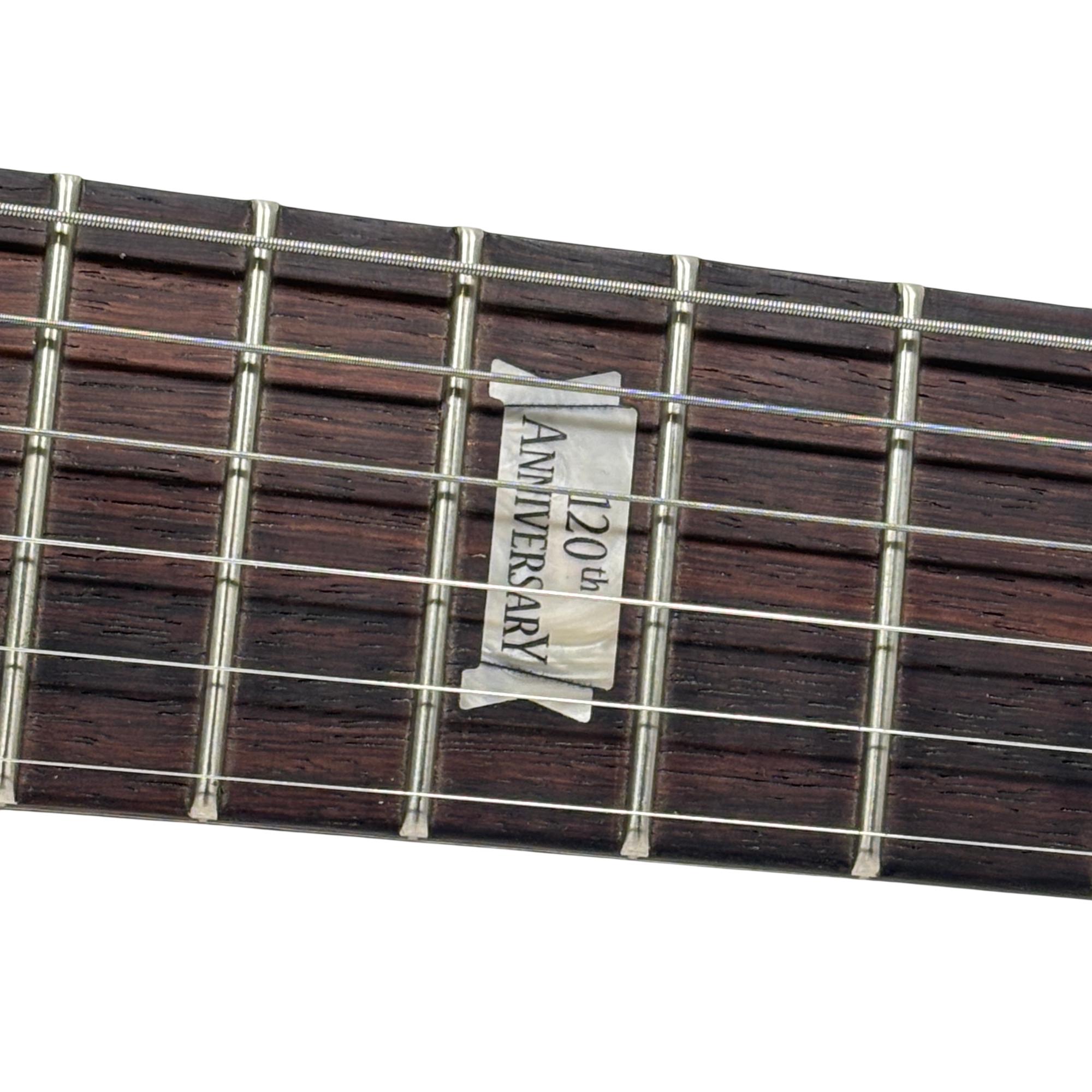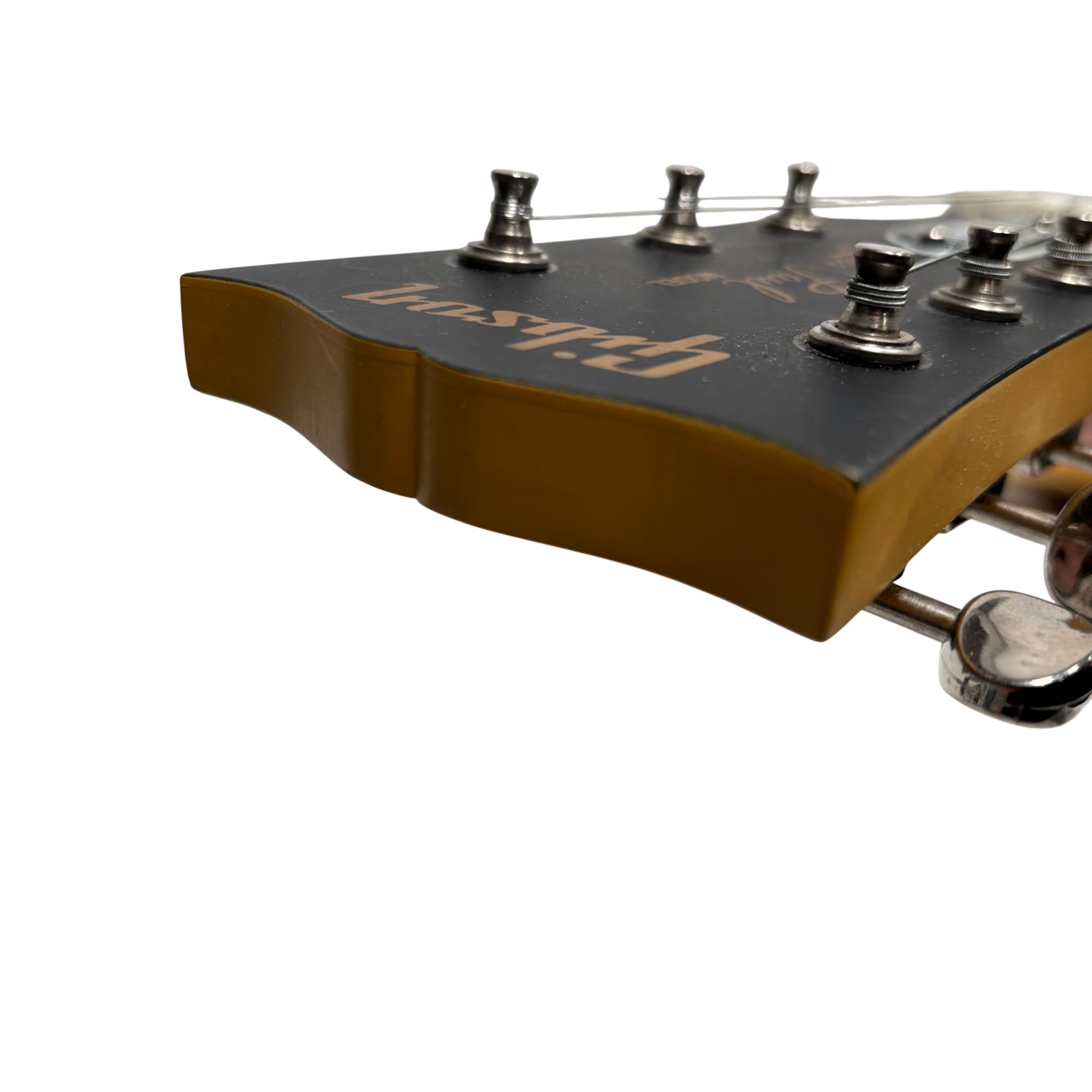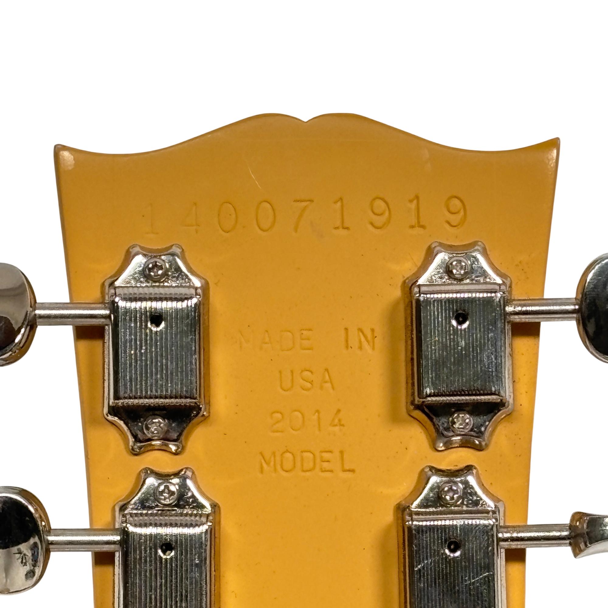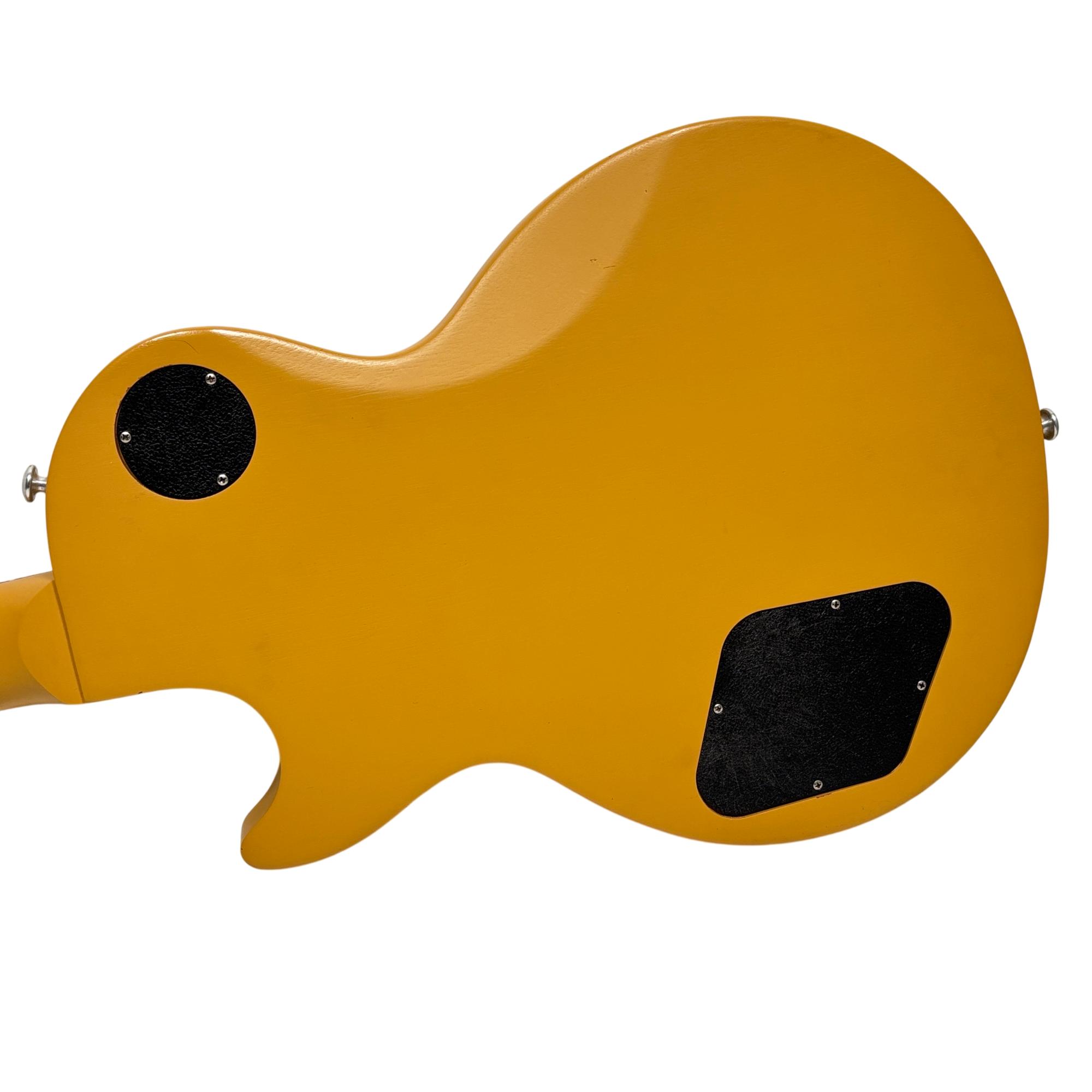 2014 Gibson Les Paul Melody Maker 120th Anniversary Gold Top Electric Guitar features a solid body design with a vibrant gold top finish and classic Les Paul neck. This electric guitar includes multiple control knobs and switches for versatile tone shaping, along with black strings that complement its vintage-inspired aesthetic. Known for its comfortable playability and distinctive sound, it is suitable for players seeking a reliable and stylish instrument.