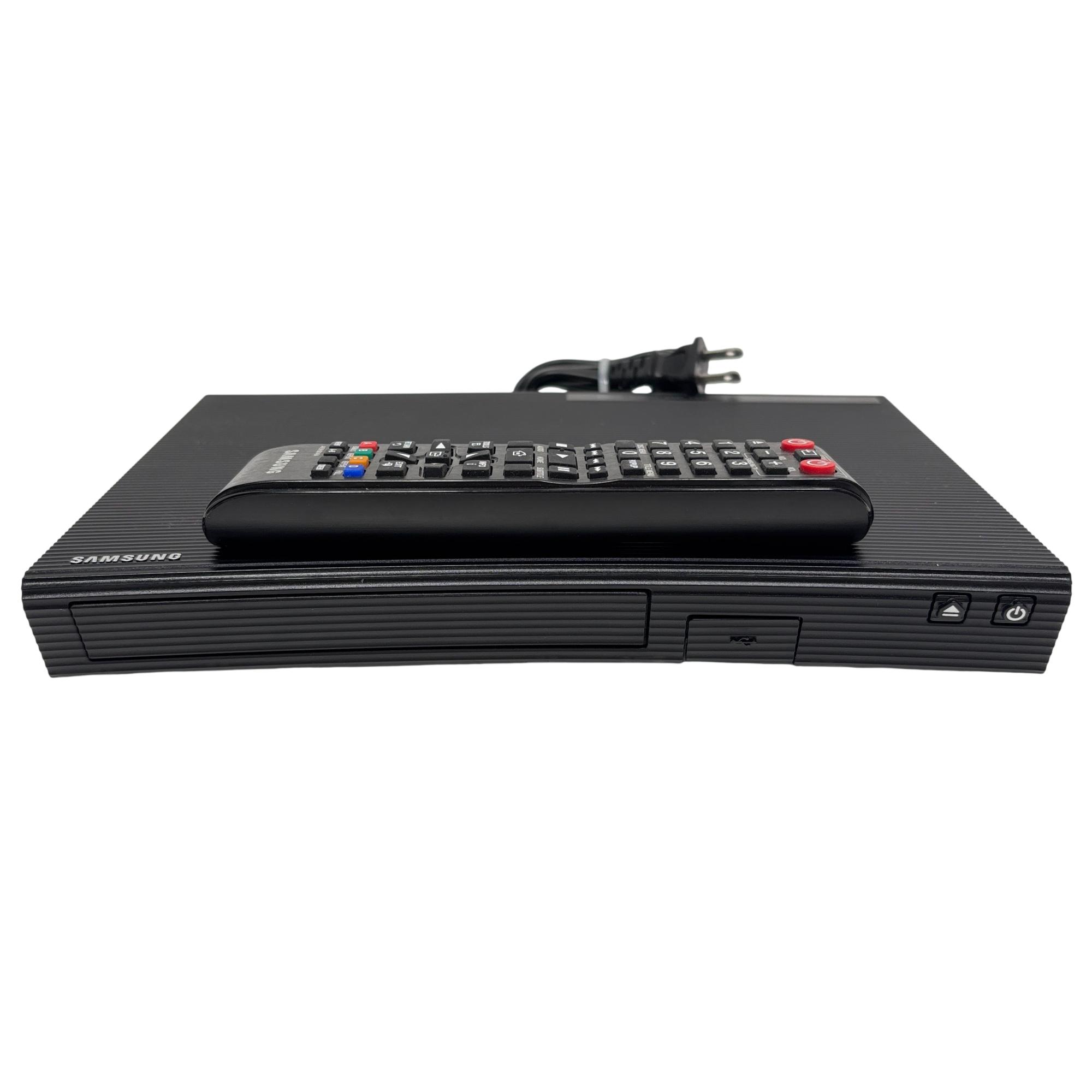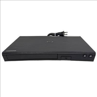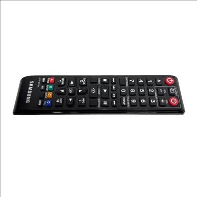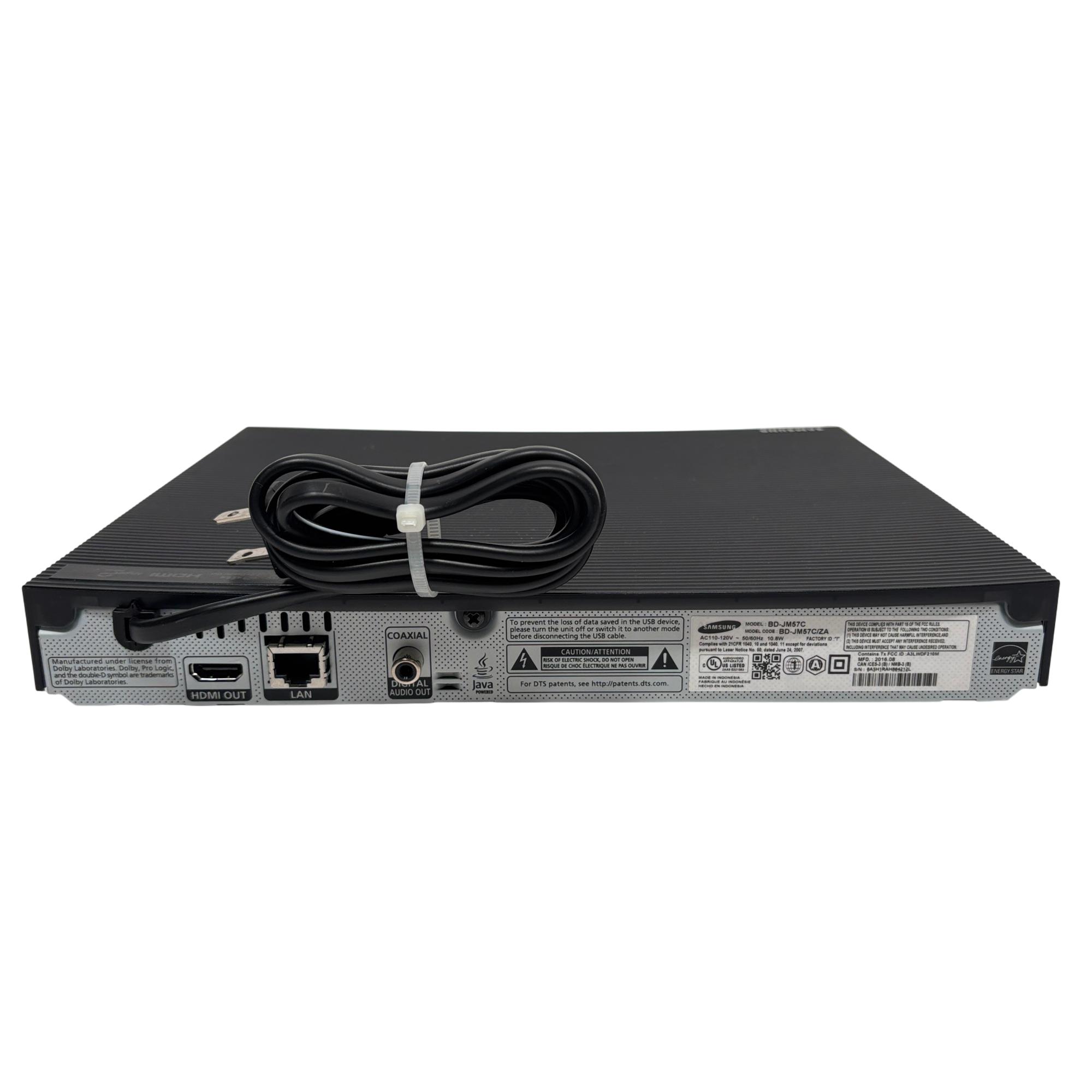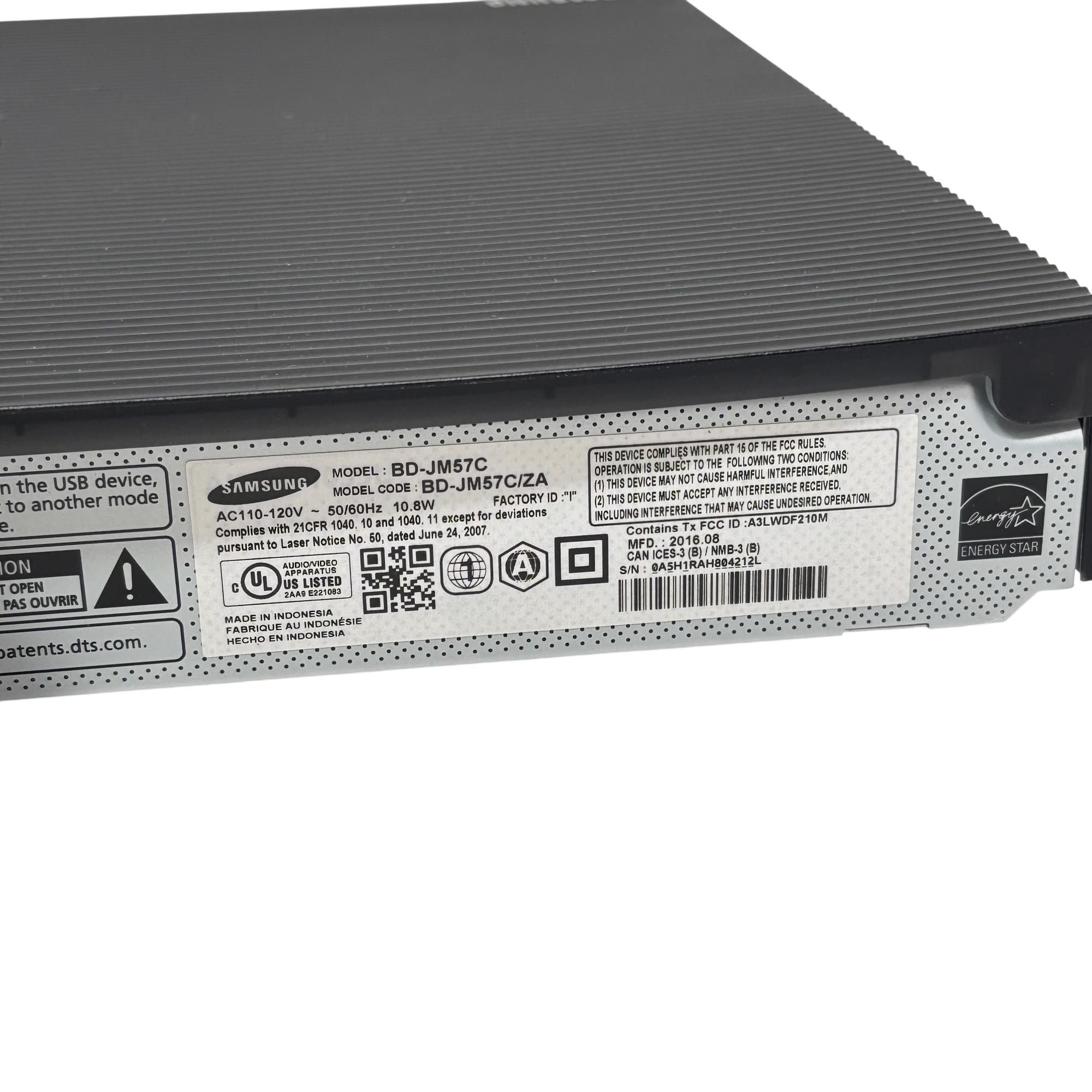 Samsung BD-JM57C Blu-ray Disc Player with Remote Control, Model BD-JM57C/ZA delivers high-definition playback with support for various disc formats, enhancing home entertainment experiences. This black rectangular device features HDMI and coaxial outputs along with LAN connectivity, allowing versatile integration with audio and video systems. Designed for efficient operation with a sleek interface, it complies with energy standards and FCC regulations.
