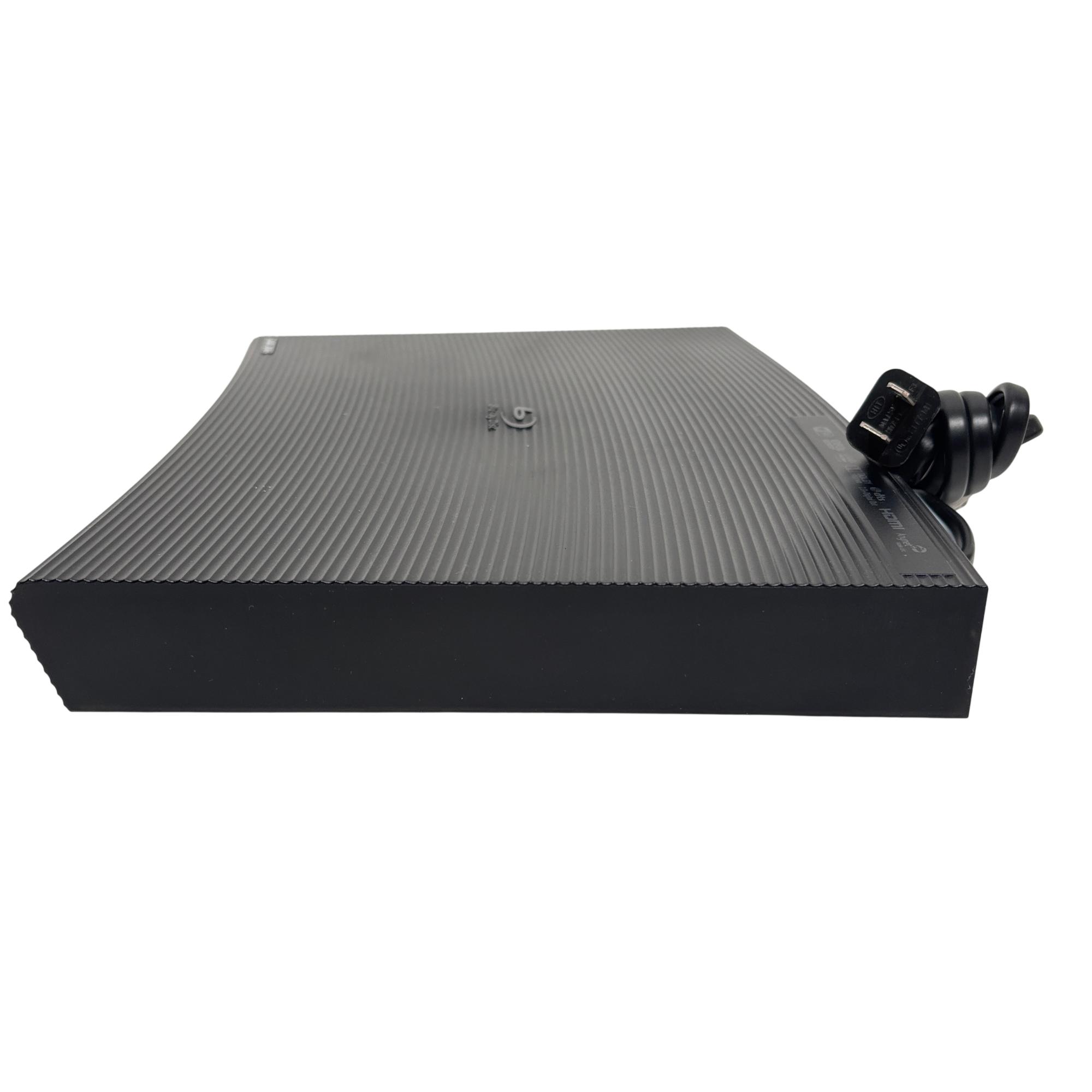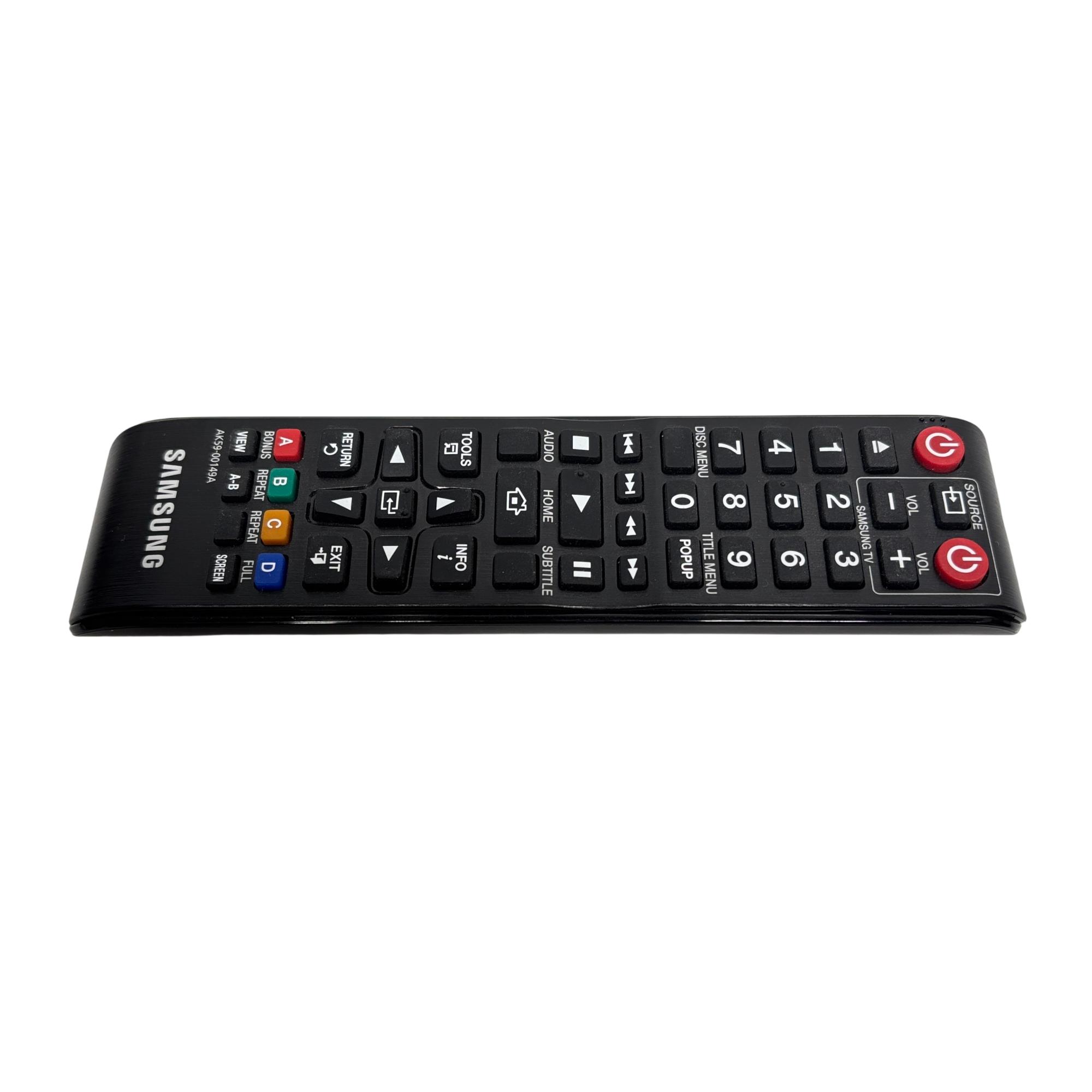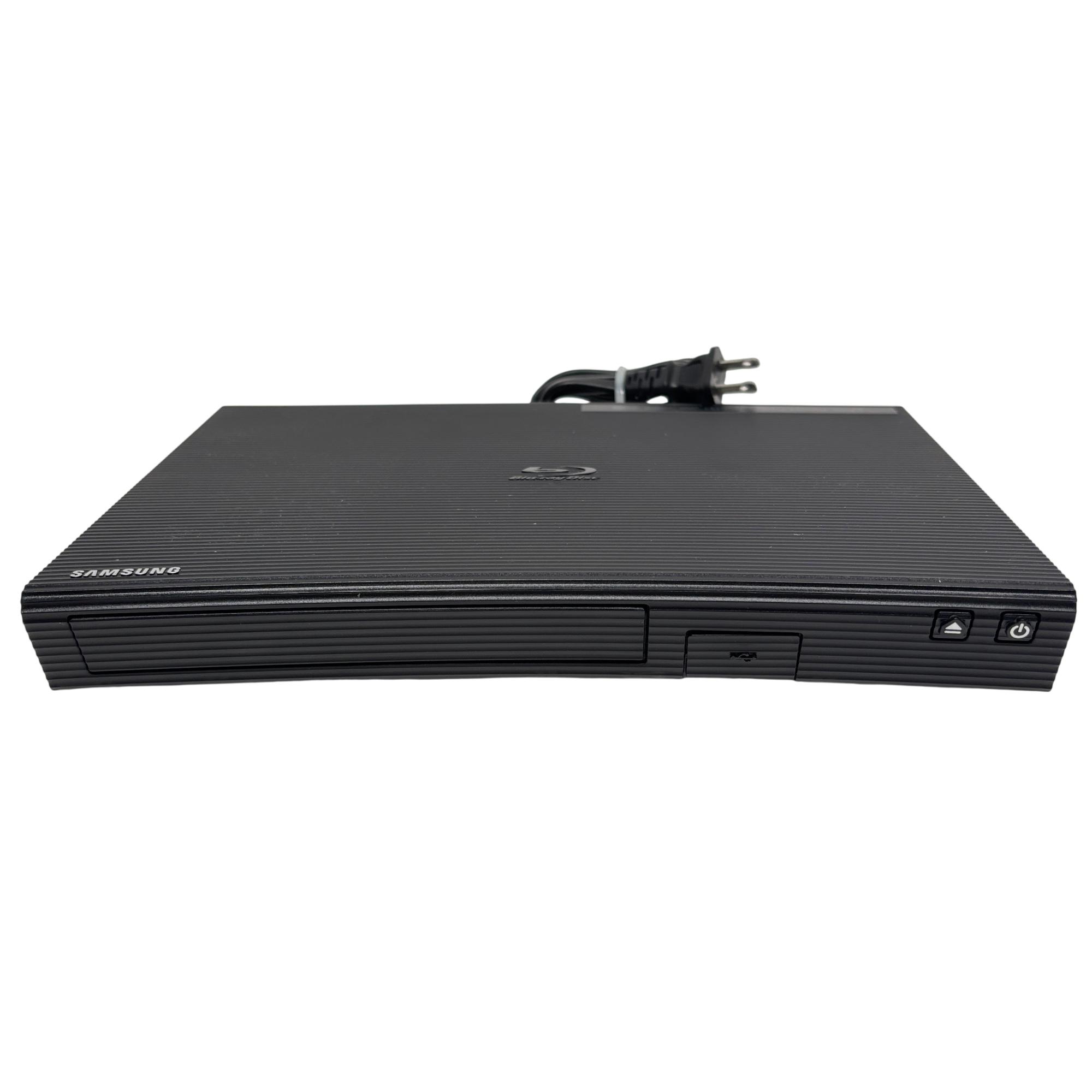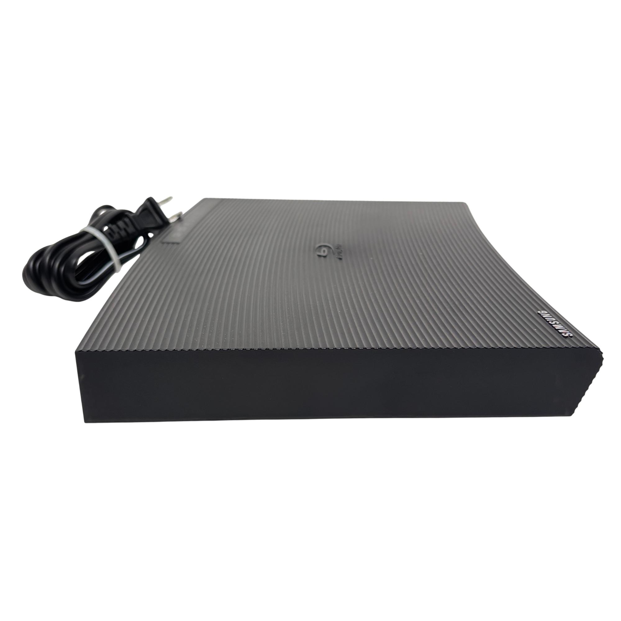 Samsung BD-JM57C Blu-ray Disc Player with Remote Control, Model BD-JM57C/ZA delivers high-definition playback with support for various disc formats, enhancing home entertainment experiences. This black rectangular device features HDMI and coaxial outputs along with LAN connectivity, allowing versatile integration with audio and video systems. Designed for efficient operation with a sleek interface, it complies with energy standards and FCC regulations.
