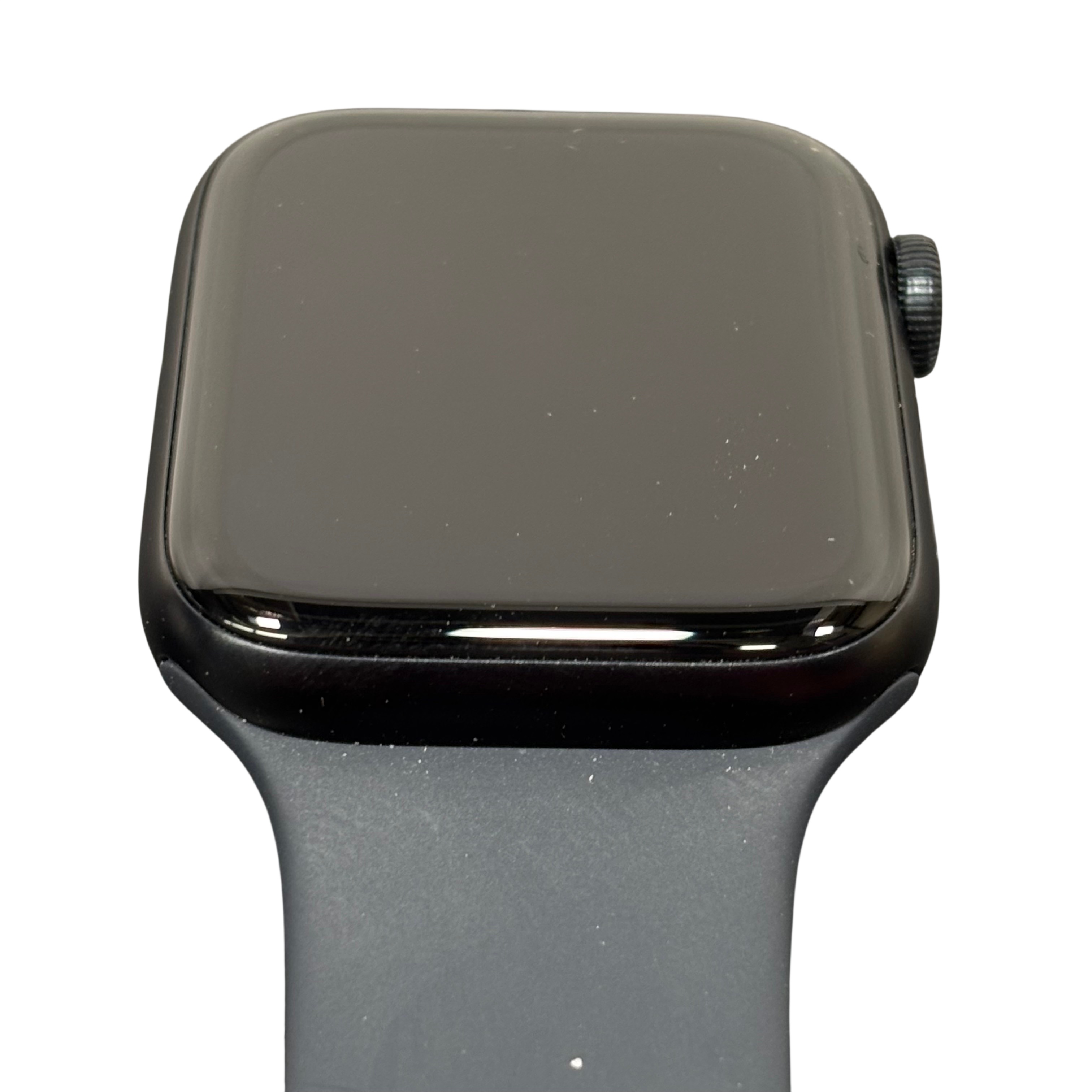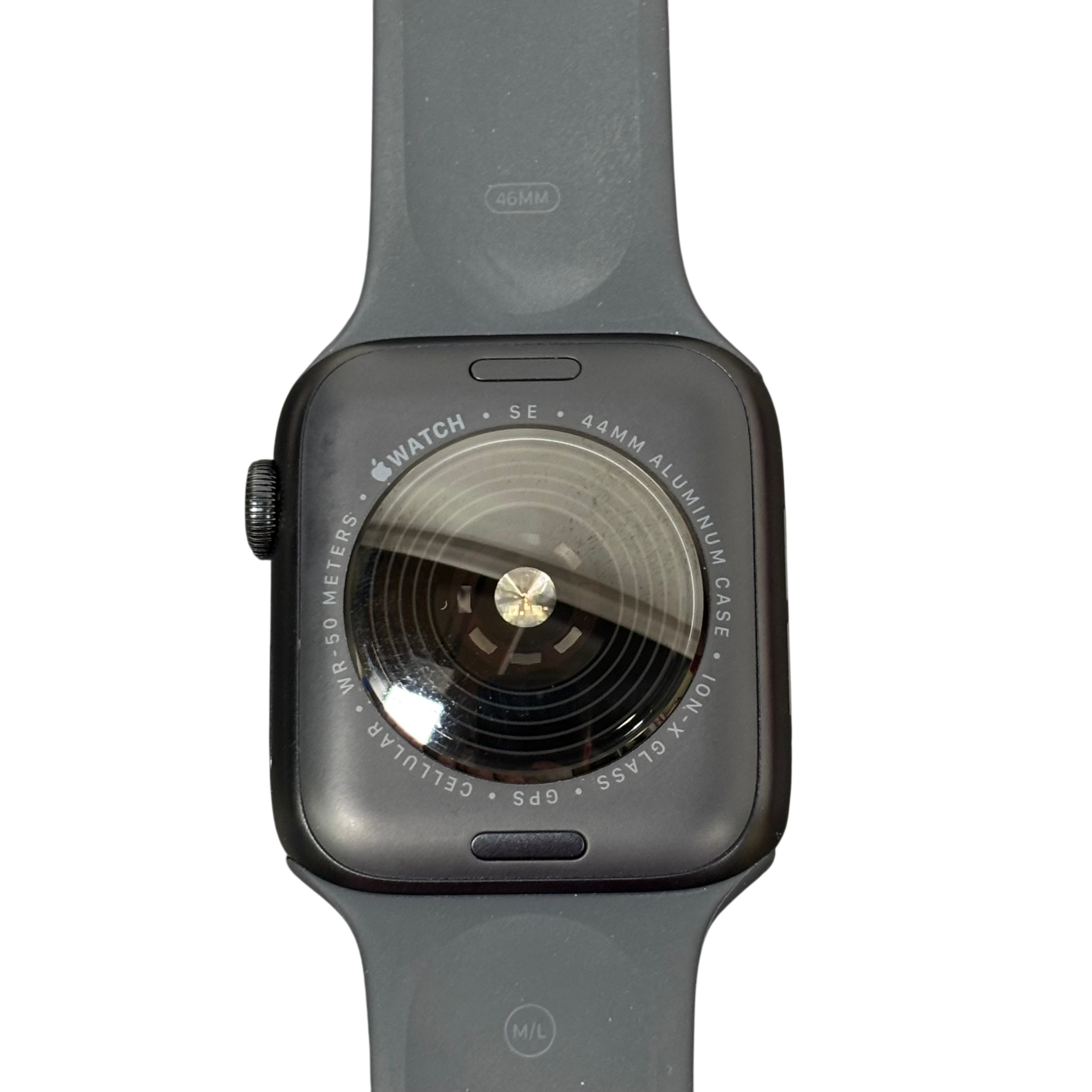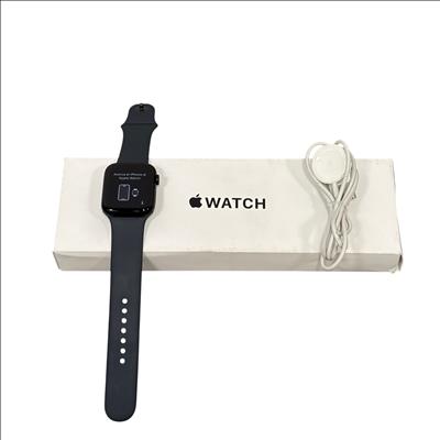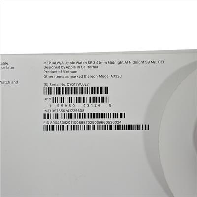 Apple Watch SE 3 44mm (Model A3328) in Midnight Aluminum features a durable Ion-X glass display and water resistance up to 50 meters. This GPS + Cellular smartwatch includes a medium/large band and offers seamless connectivity for calls, messages, and fitness tracking. The package includes the Apple Watch SE 3 and a magnetic charging cable, making it an ideal wearable for health monitoring and staying connected on the go.