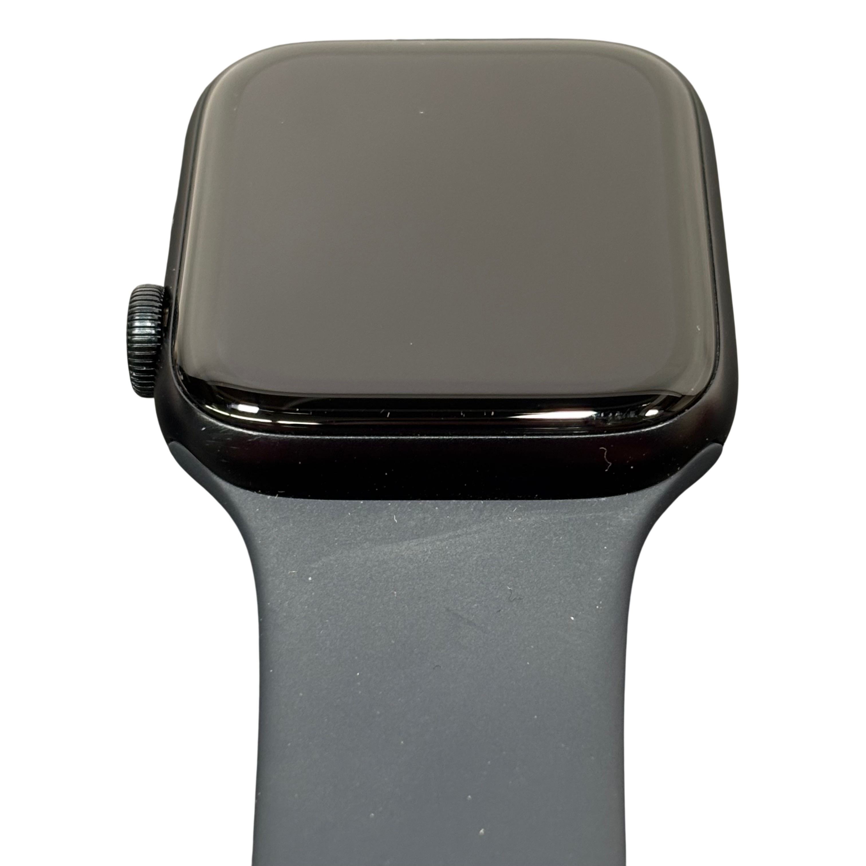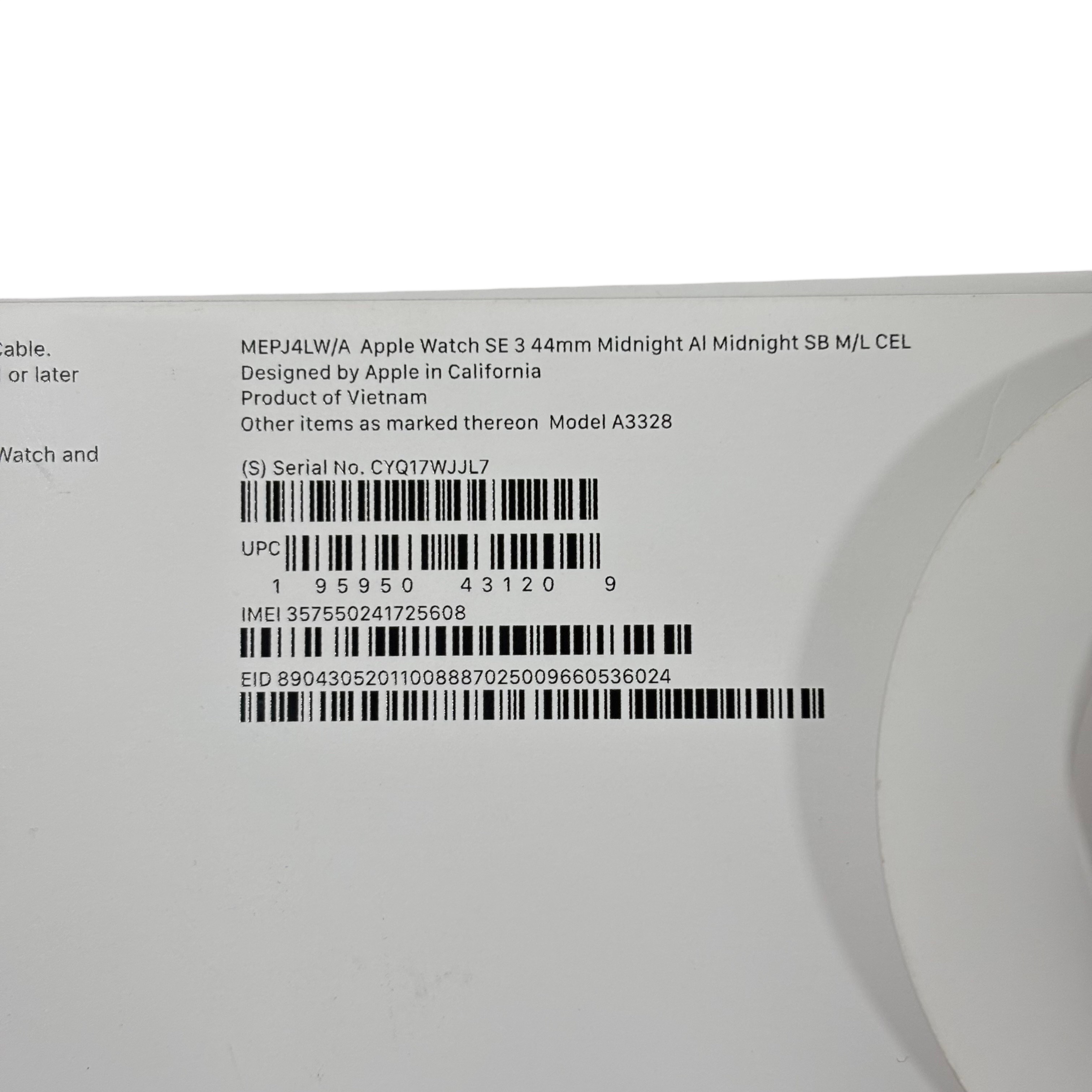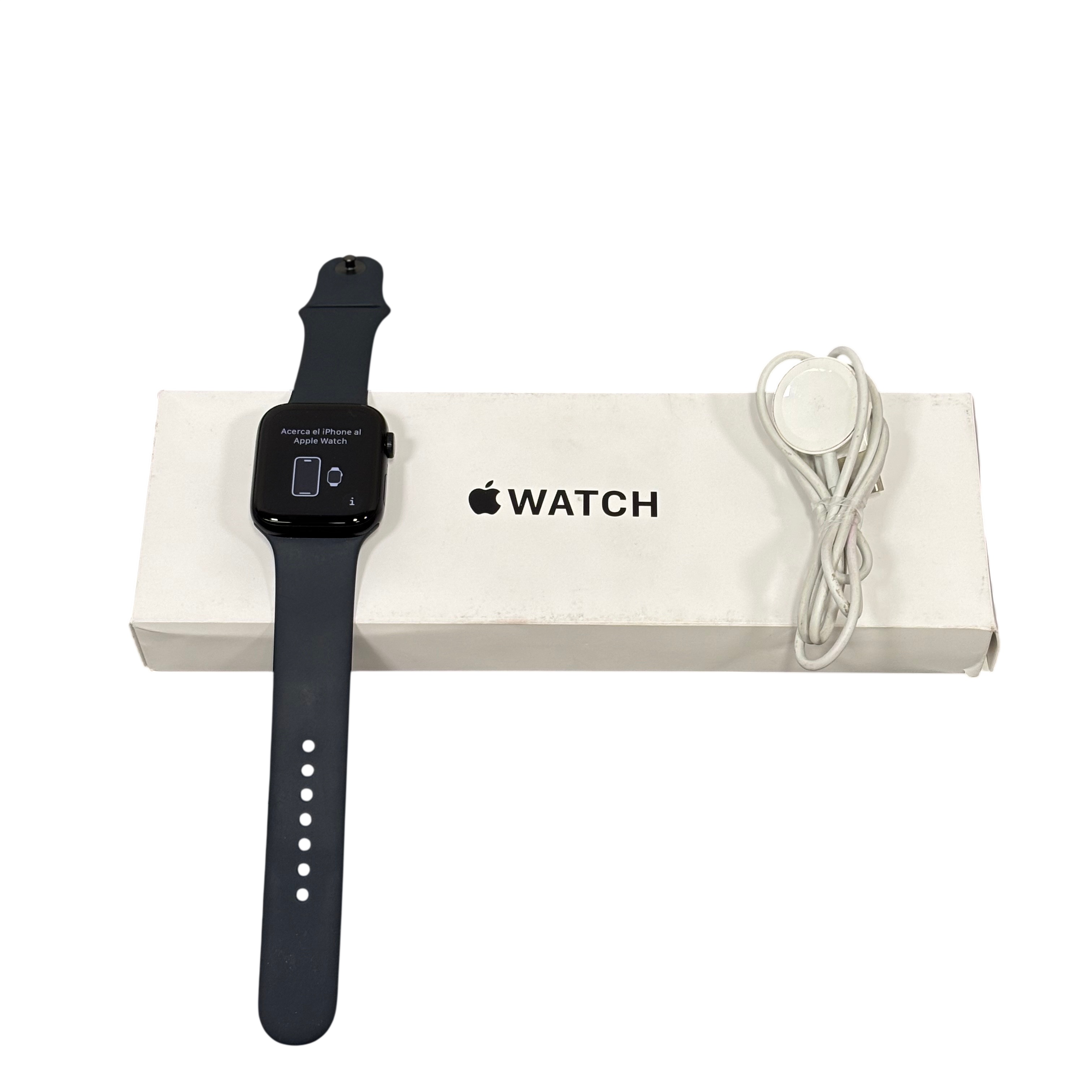 Apple Watch SE 3 44mm (Model A3328) in Midnight Aluminum features a durable Ion-X glass display and water resistance up to 50 meters. This GPS + Cellular smartwatch includes a medium/large band and offers seamless connectivity for calls, messages, and fitness tracking. The package includes the Apple Watch SE 3 and a magnetic charging cable, making it an ideal wearable for health monitoring and staying connected on the go.