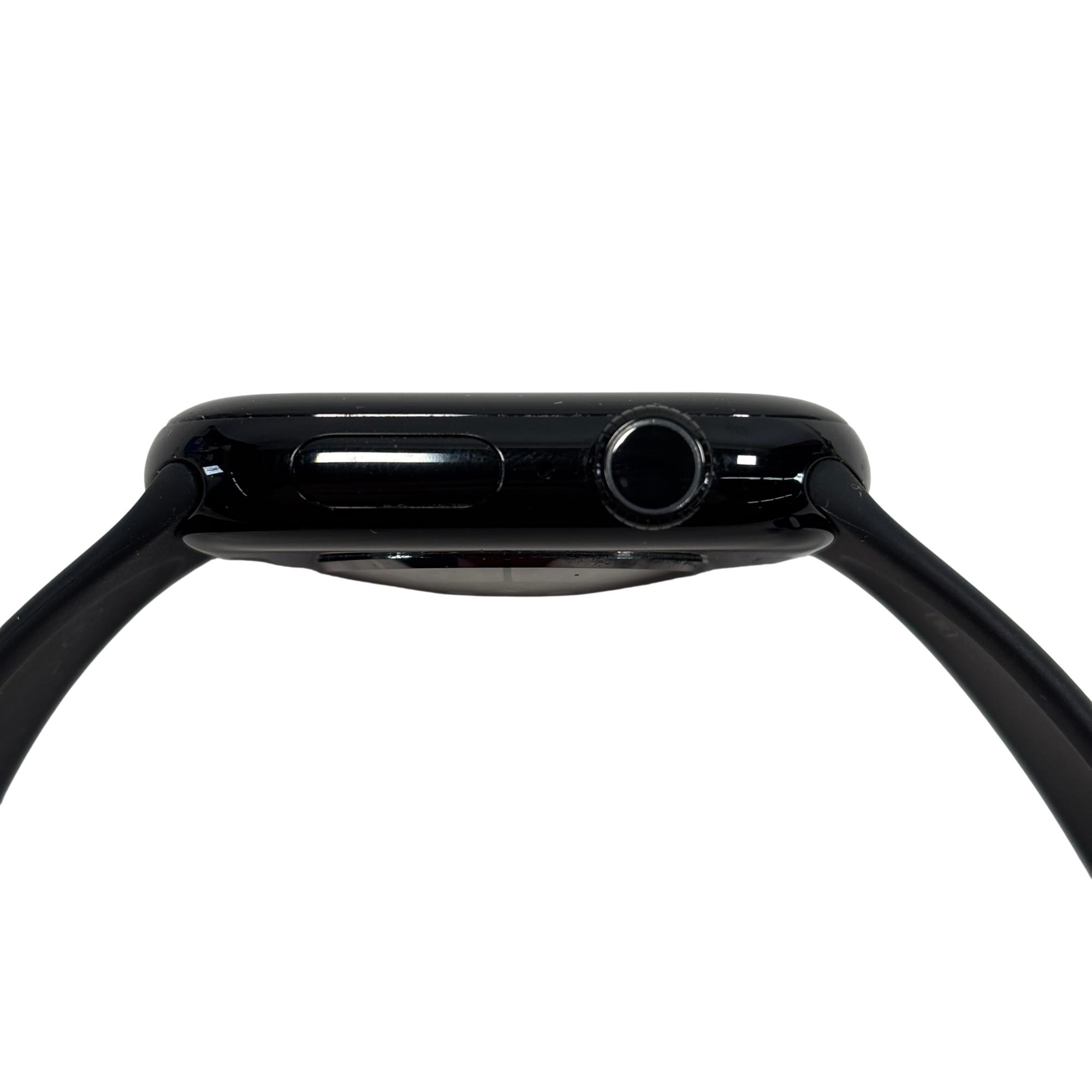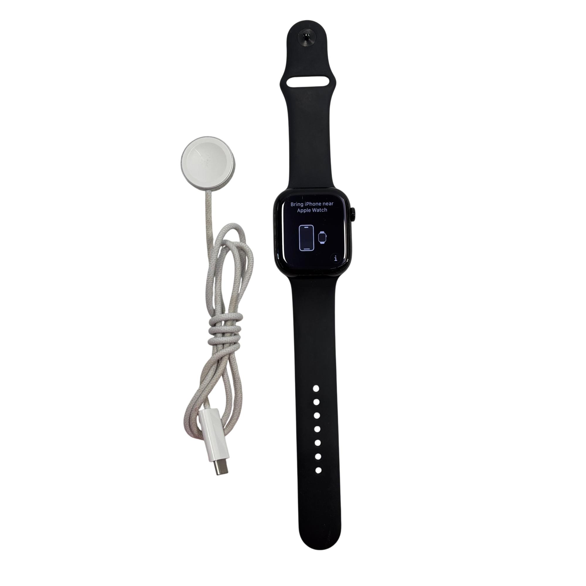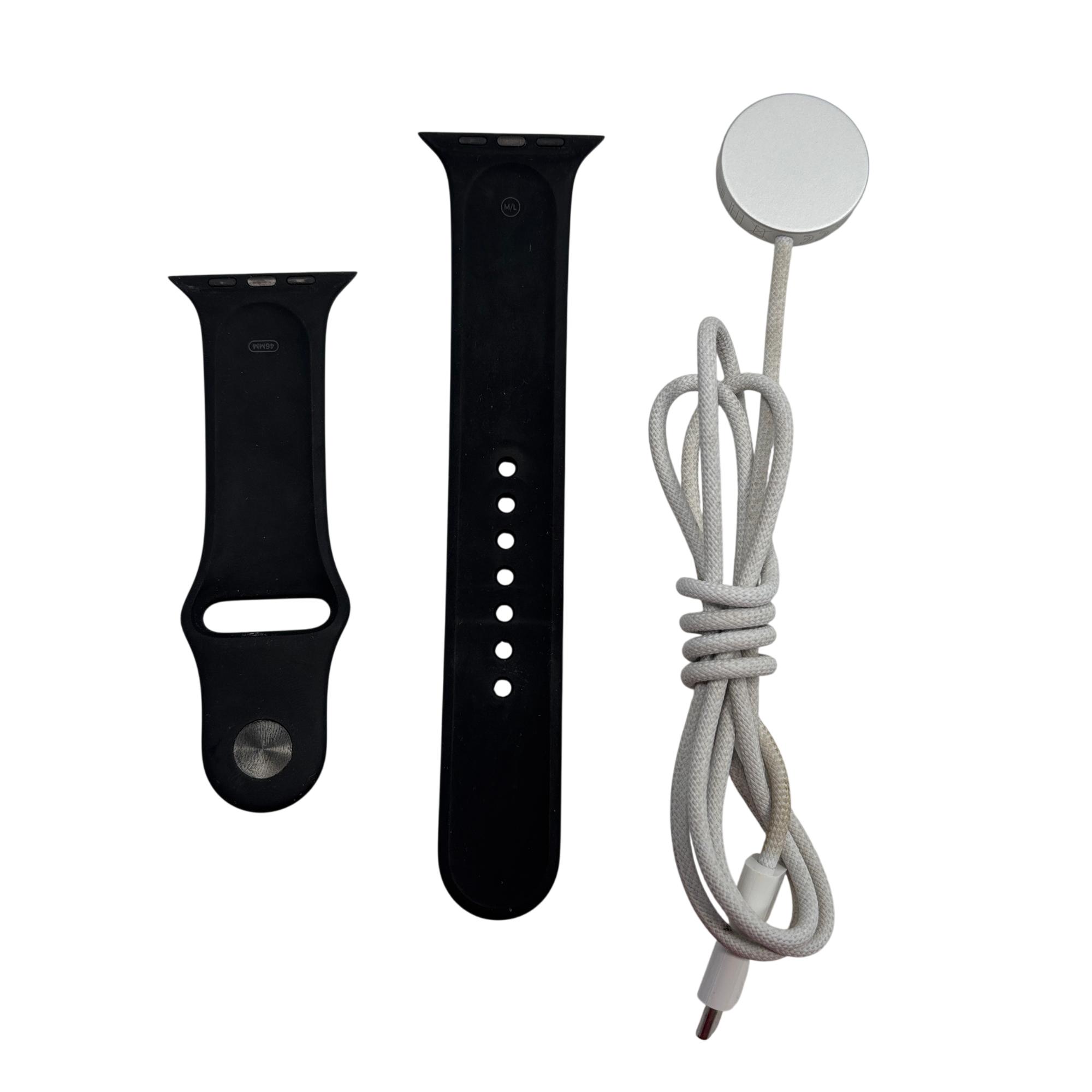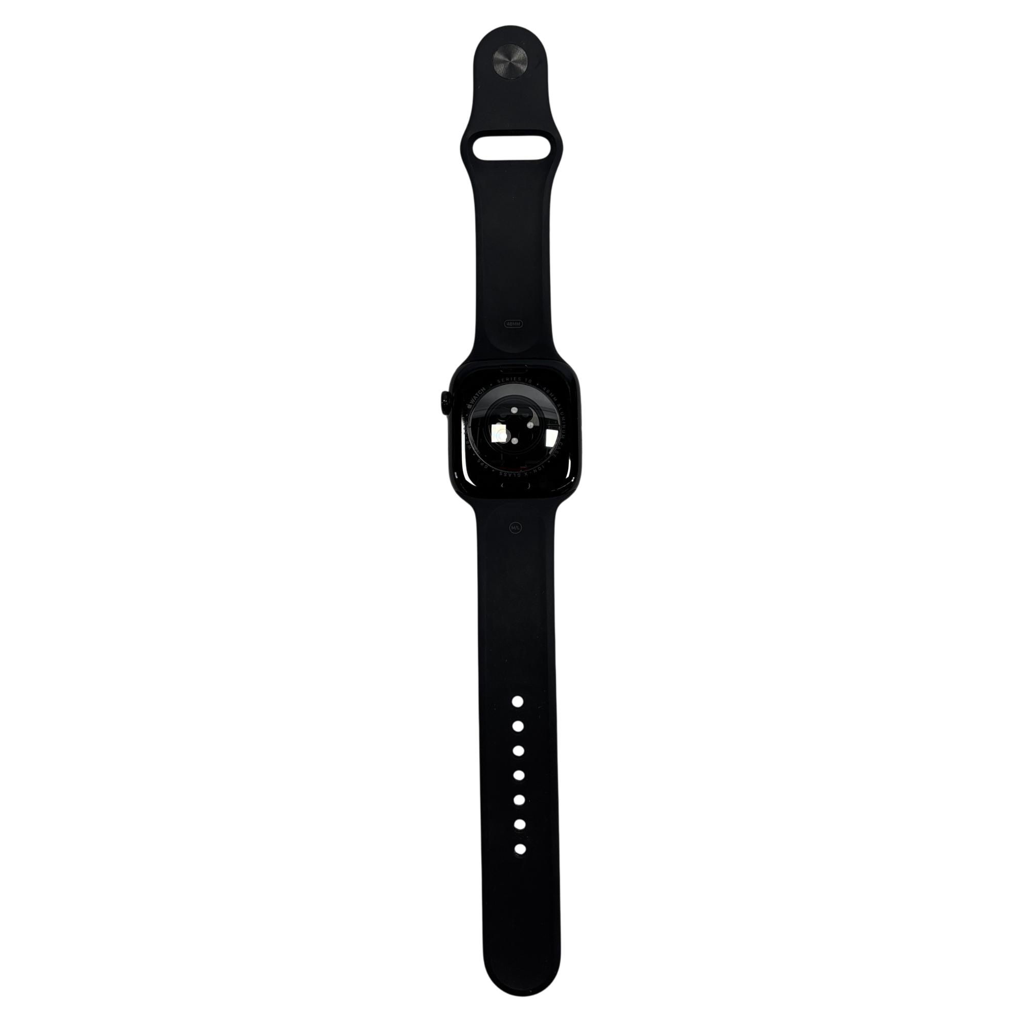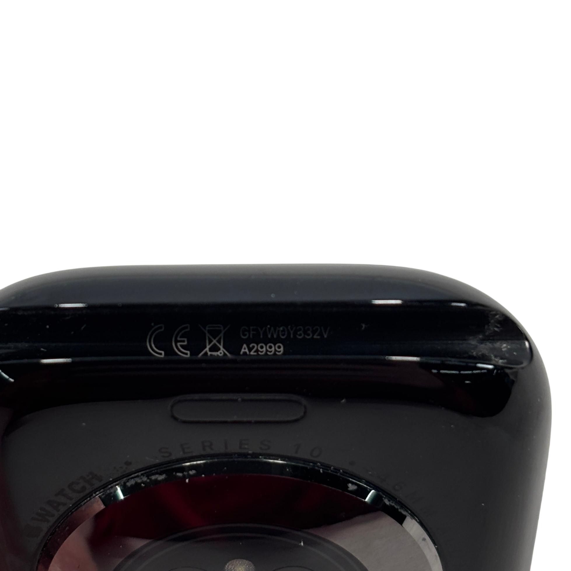 The Apple Watch Series 10 (GPS) 46mm Aluminum Jet Black Smartwatch A2999 features a sleek black aluminum case with a durable Ion-X glass display measuring 46mm, designed for enhanced durability and clarity. This advanced smartwatch offers GPS functionality and water resistance up to 50 meters, making it suitable for everyday activities and fitness tracking with precise sensor technology.