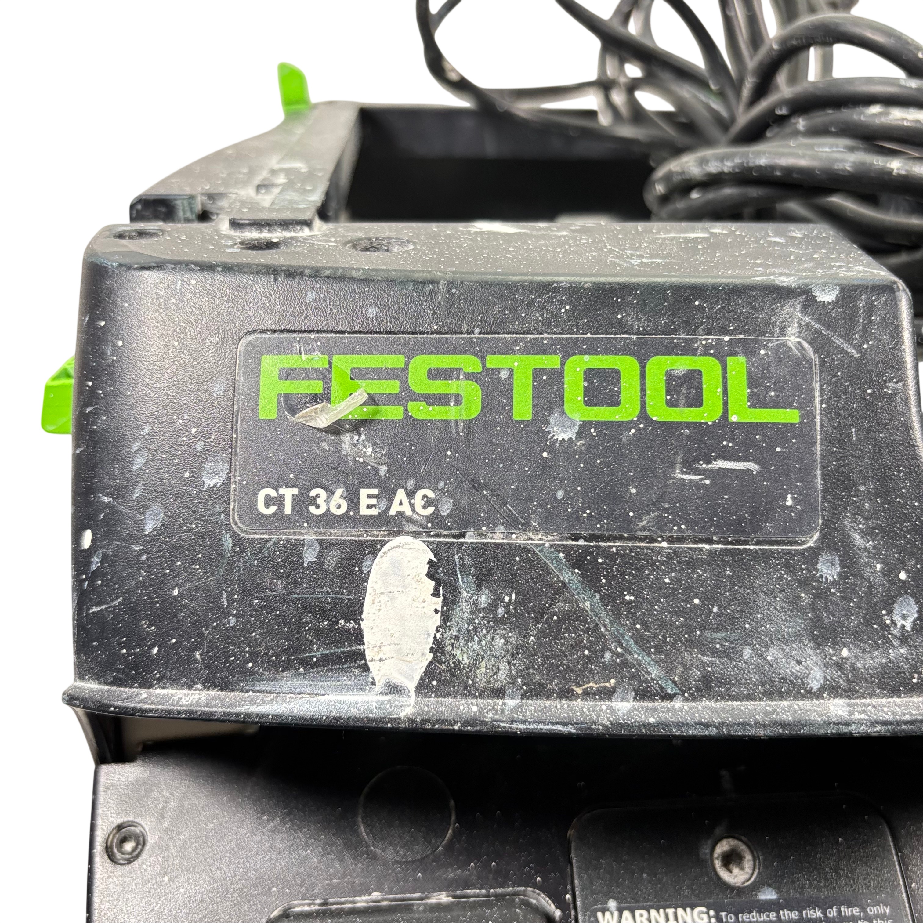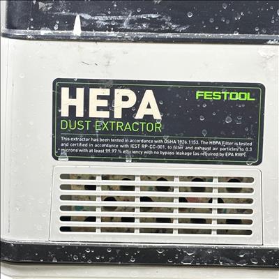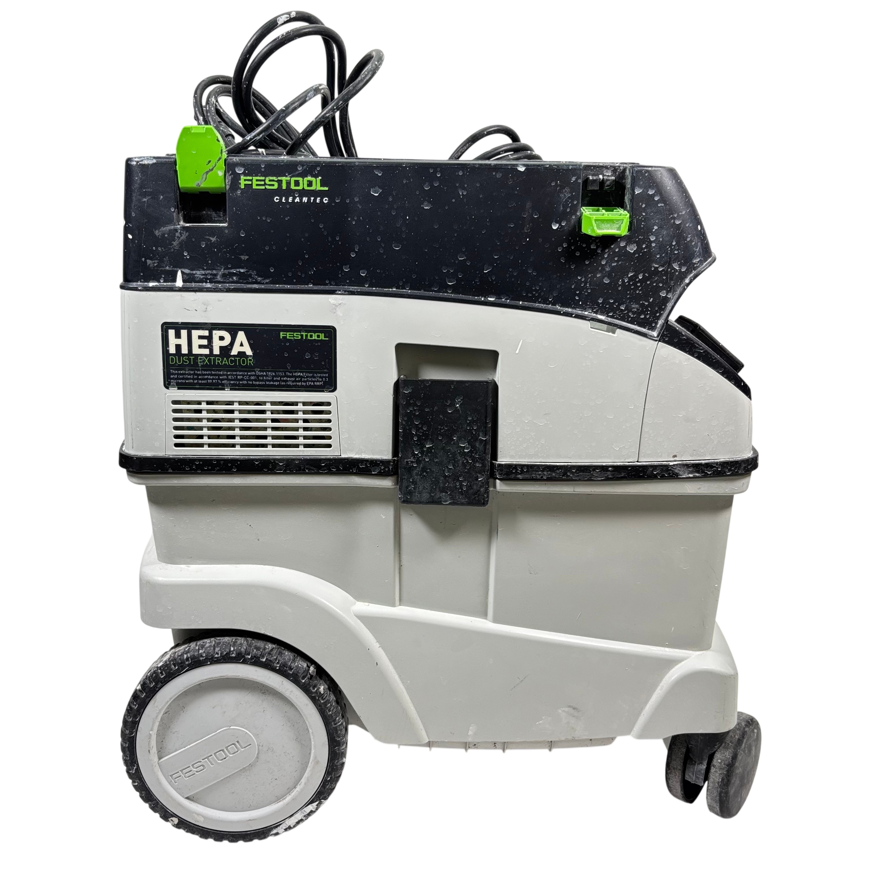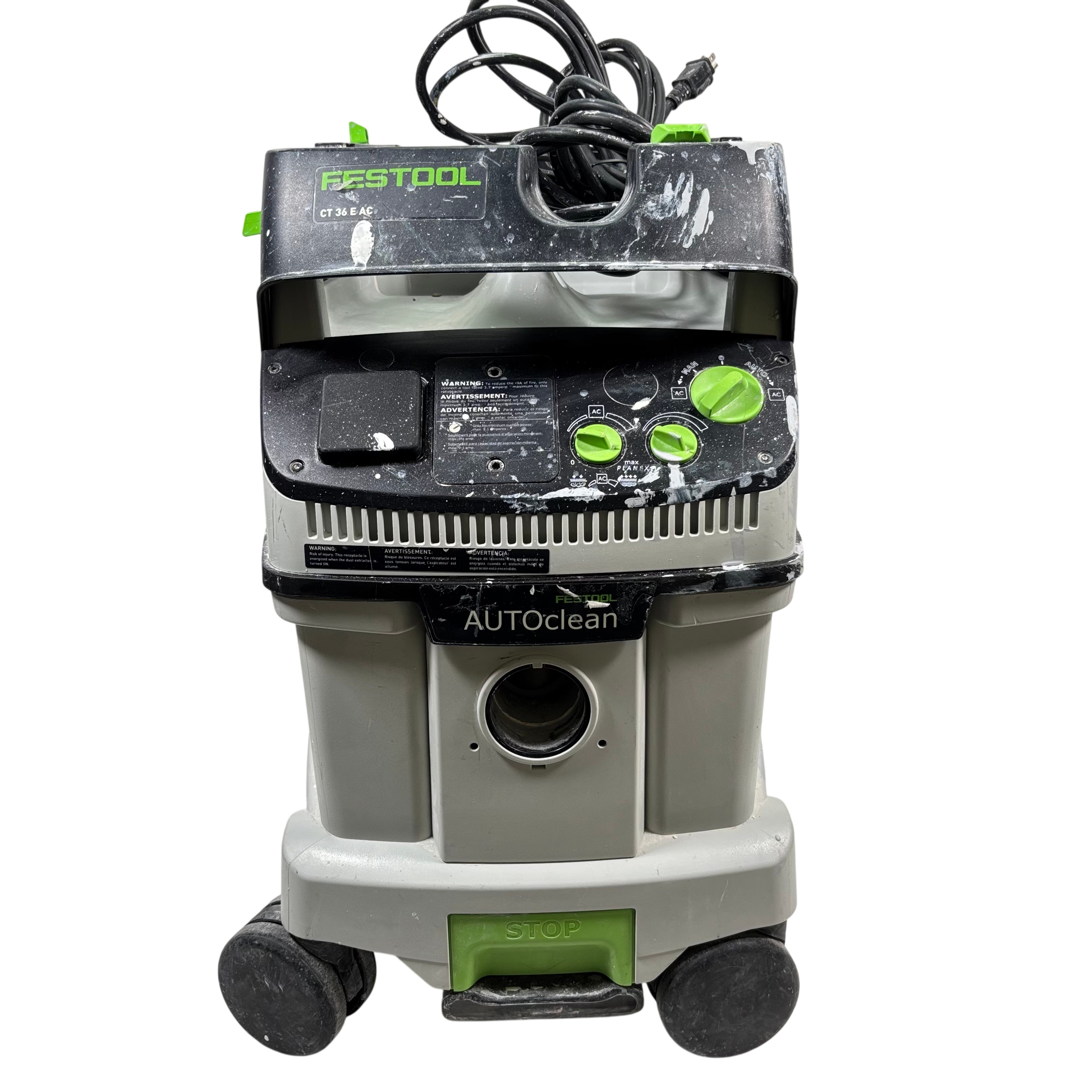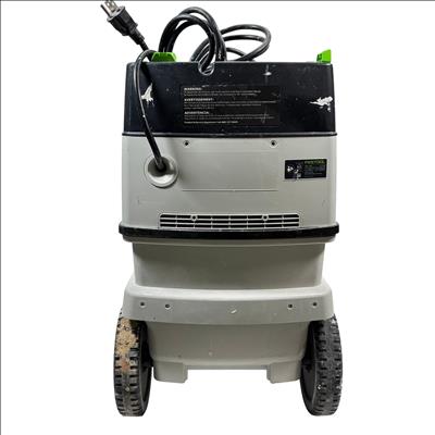 The Festool CT 36 E AC Dust Extractor is a professional-grade dust vacuum designed for efficient dust collection on job sites. Featuring a HEPA filter tested to OSHA and IEST standards, it captures 99.97% of particles down to 0.3 microns, ensuring cleaner air and safer working conditions. The unit offers both manual and automatic suction control modes, along with an AUTOclean function to maintain filter performance. Its robust design with large wheels provides easy mobility, making it ideal for woodworking, construction, and renovation tasks. This used unit shows typical wear but remains fully functional for demanding dust extraction needs.