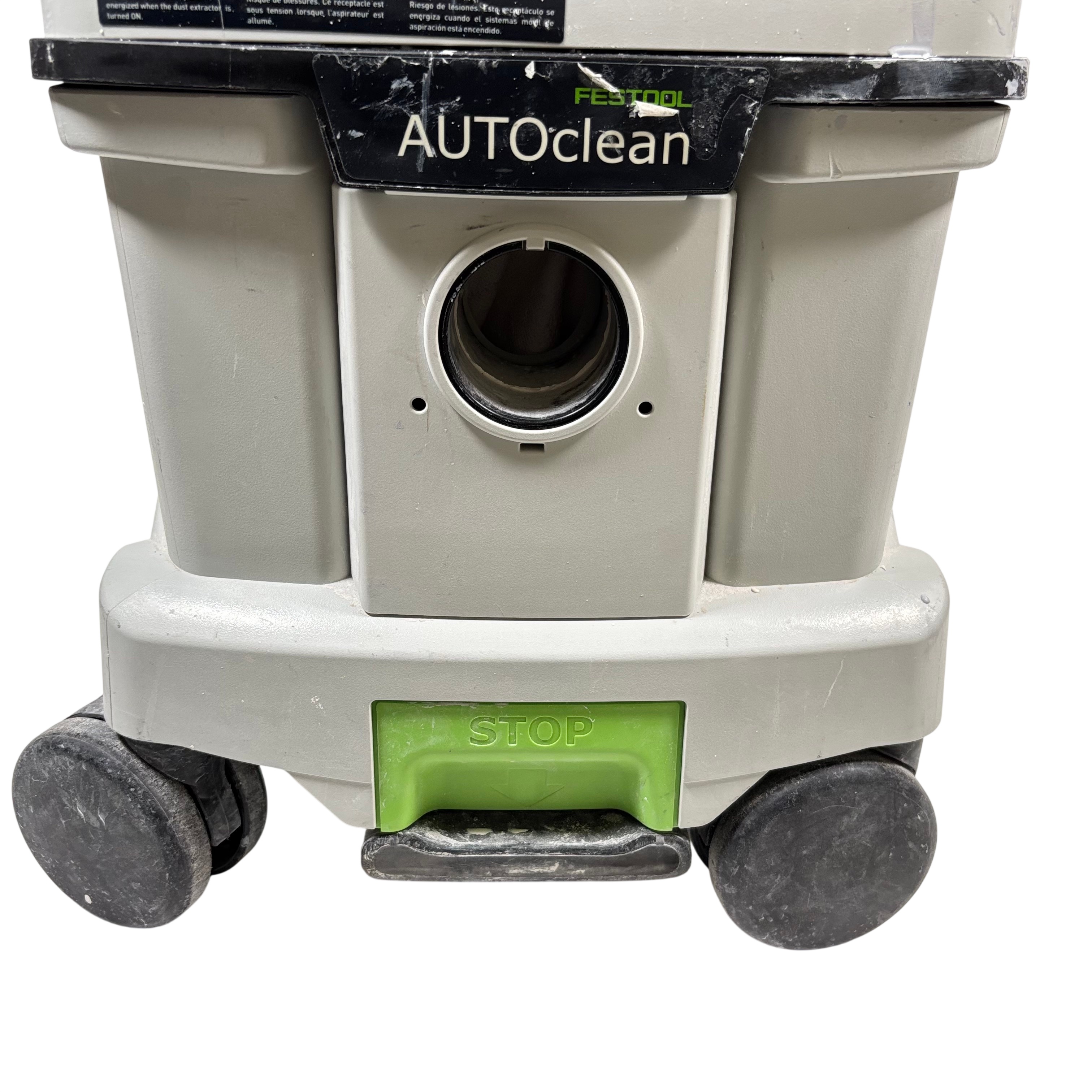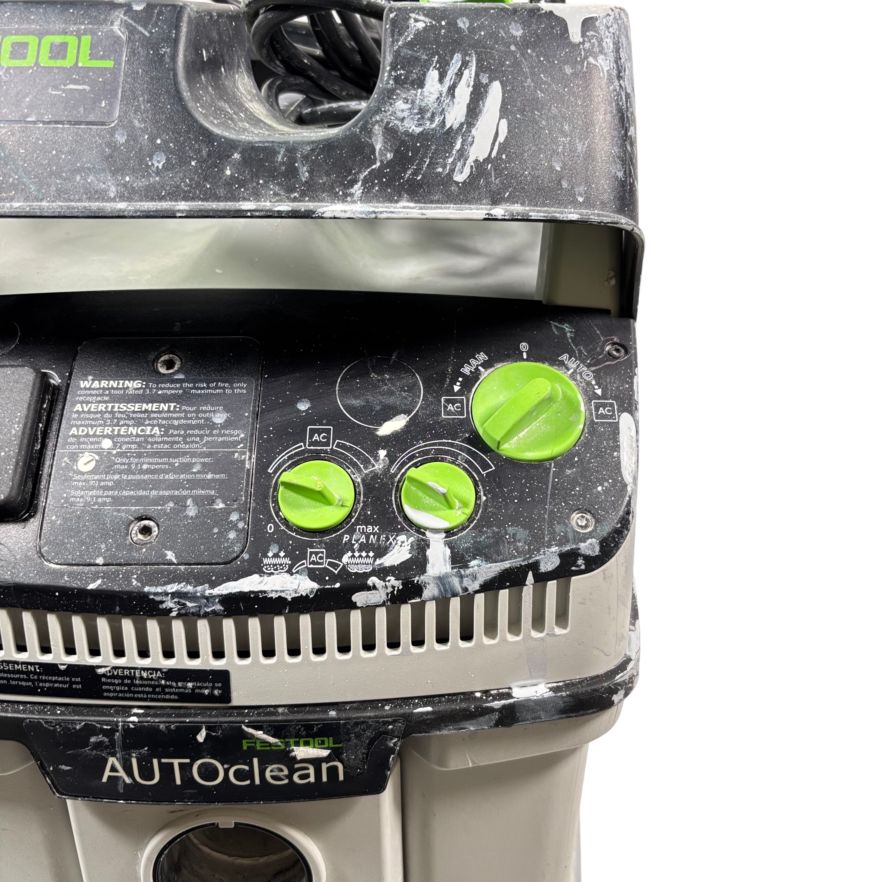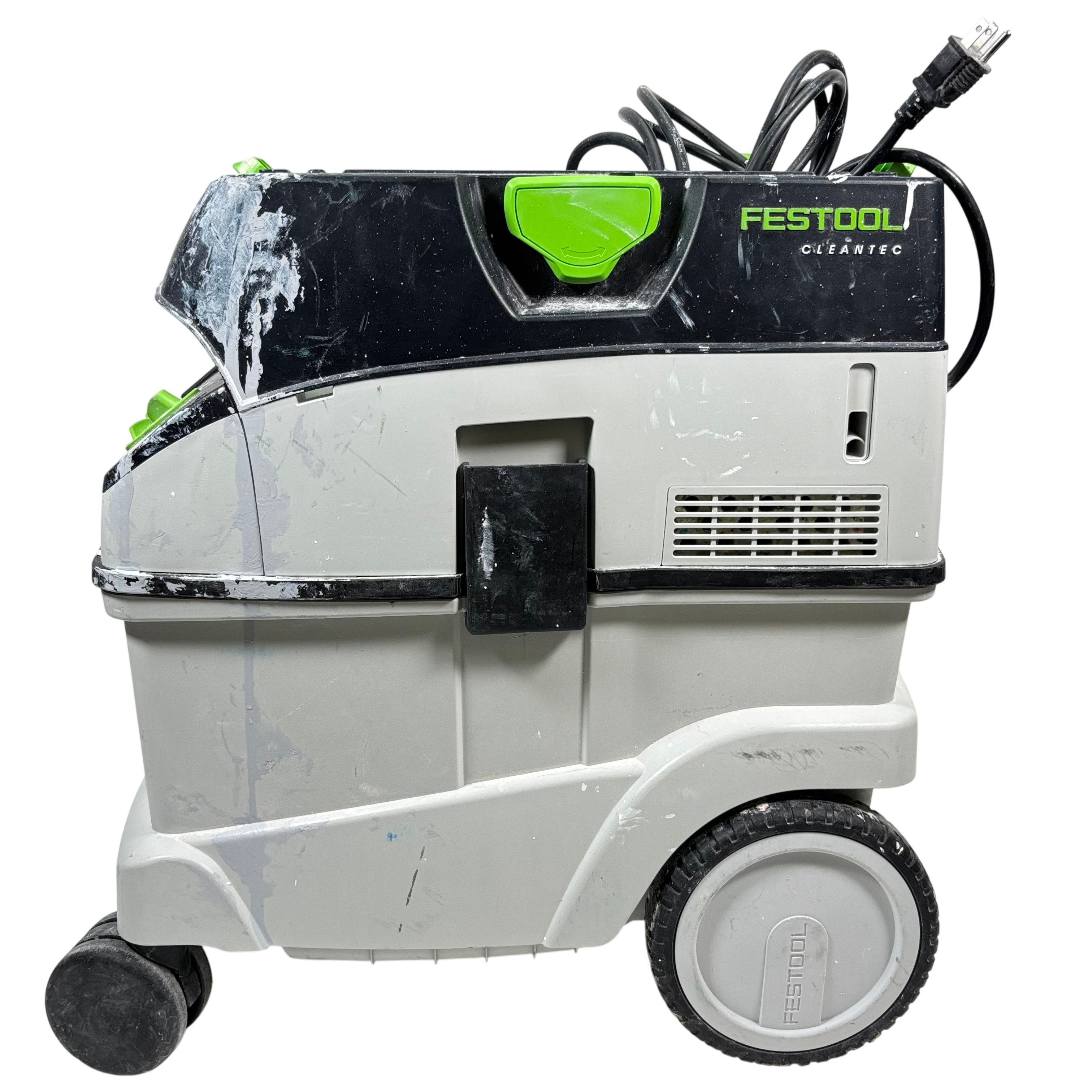 The Festool CT 36 E AC Dust Extractor is a professional-grade dust vacuum designed for efficient dust collection on job sites. Featuring a HEPA filter tested to OSHA and IEST standards, it captures 99.97% of particles down to 0.3 microns, ensuring cleaner air and safer working conditions. The unit offers both manual and automatic suction control modes, along with an AUTOclean function to maintain filter performance. Its robust design with large wheels provides easy mobility, making it ideal for woodworking, construction, and renovation tasks. This used unit shows typical wear but remains fully functional for demanding dust extraction needs.