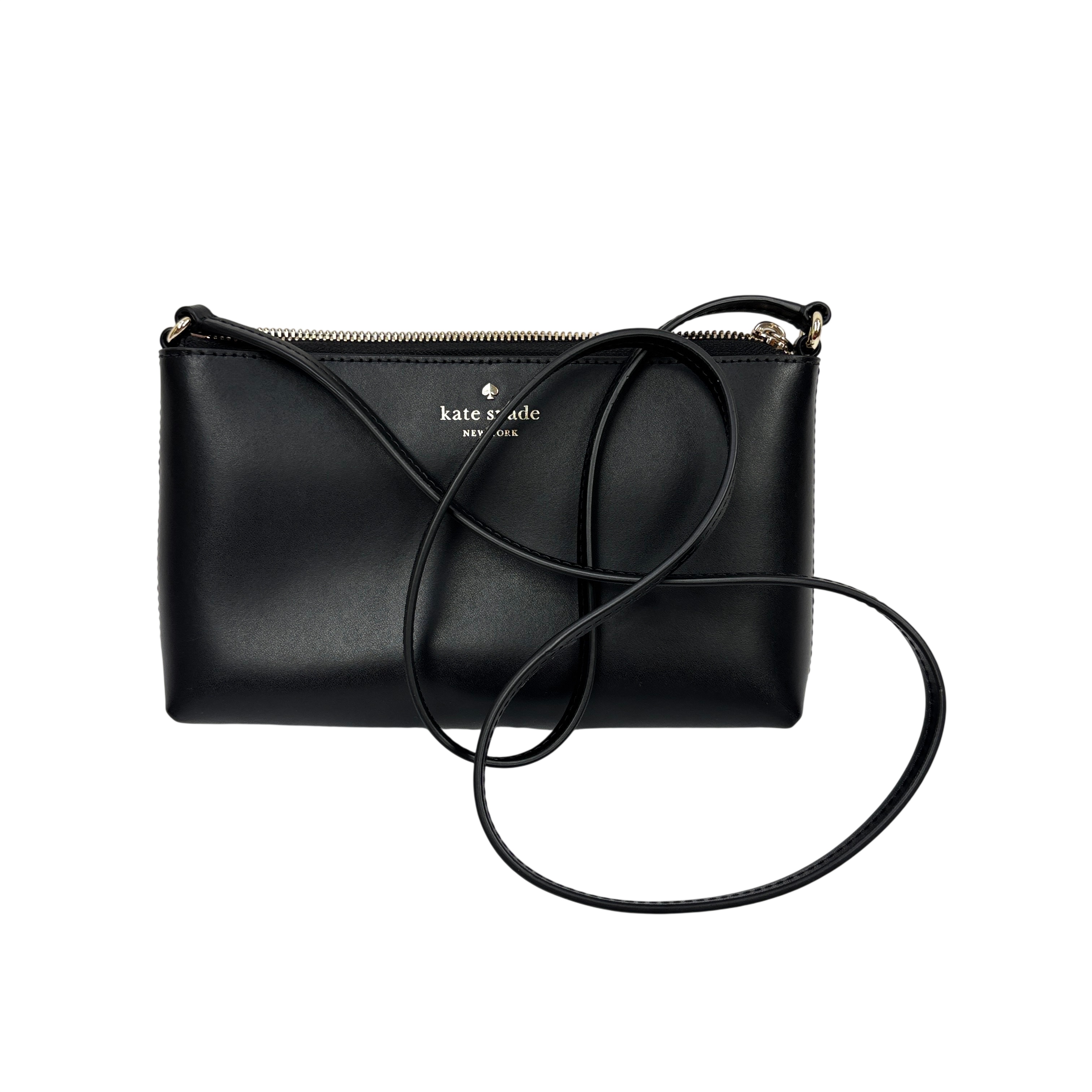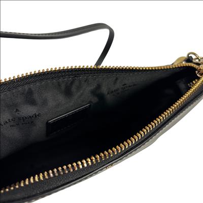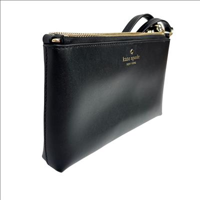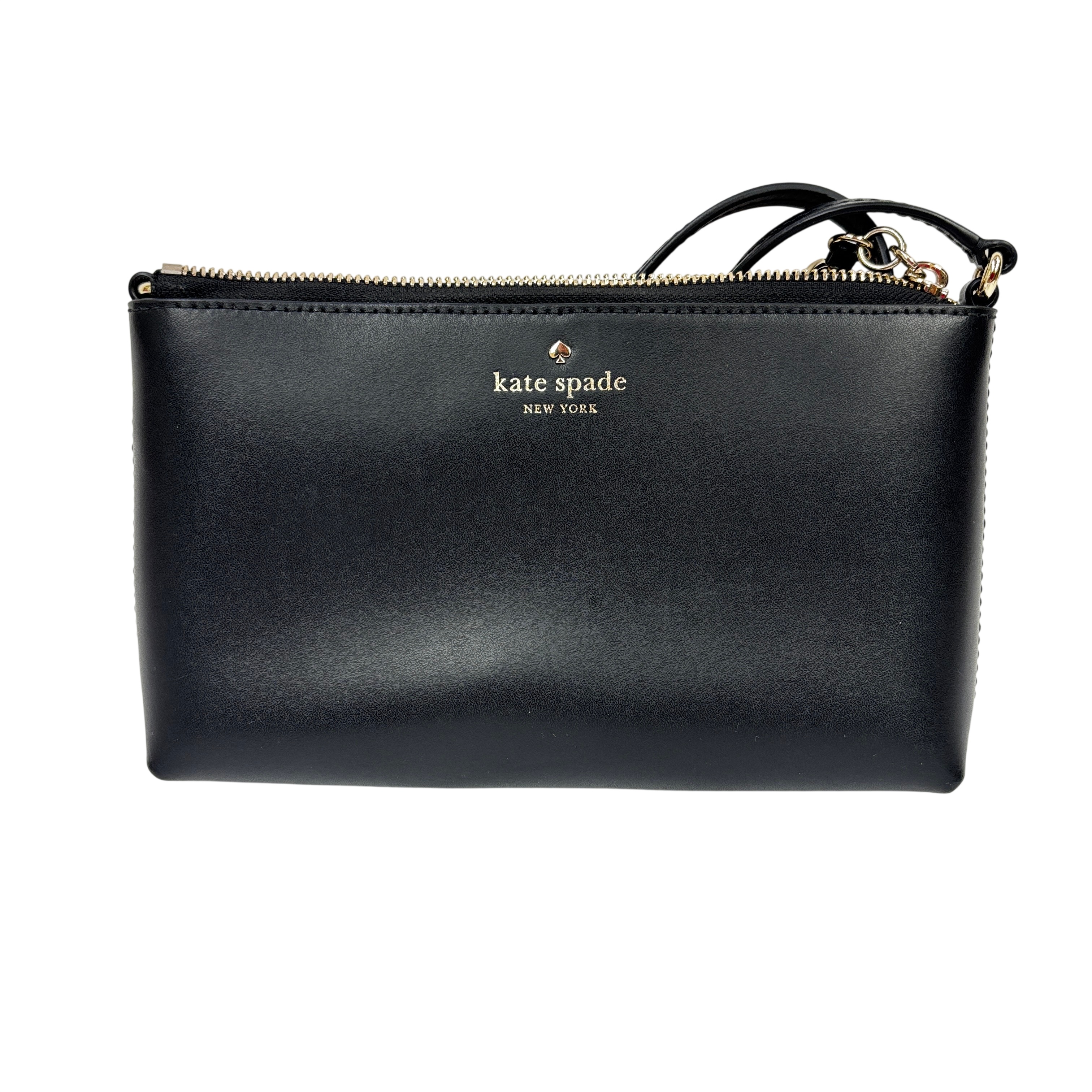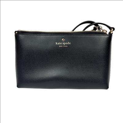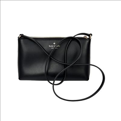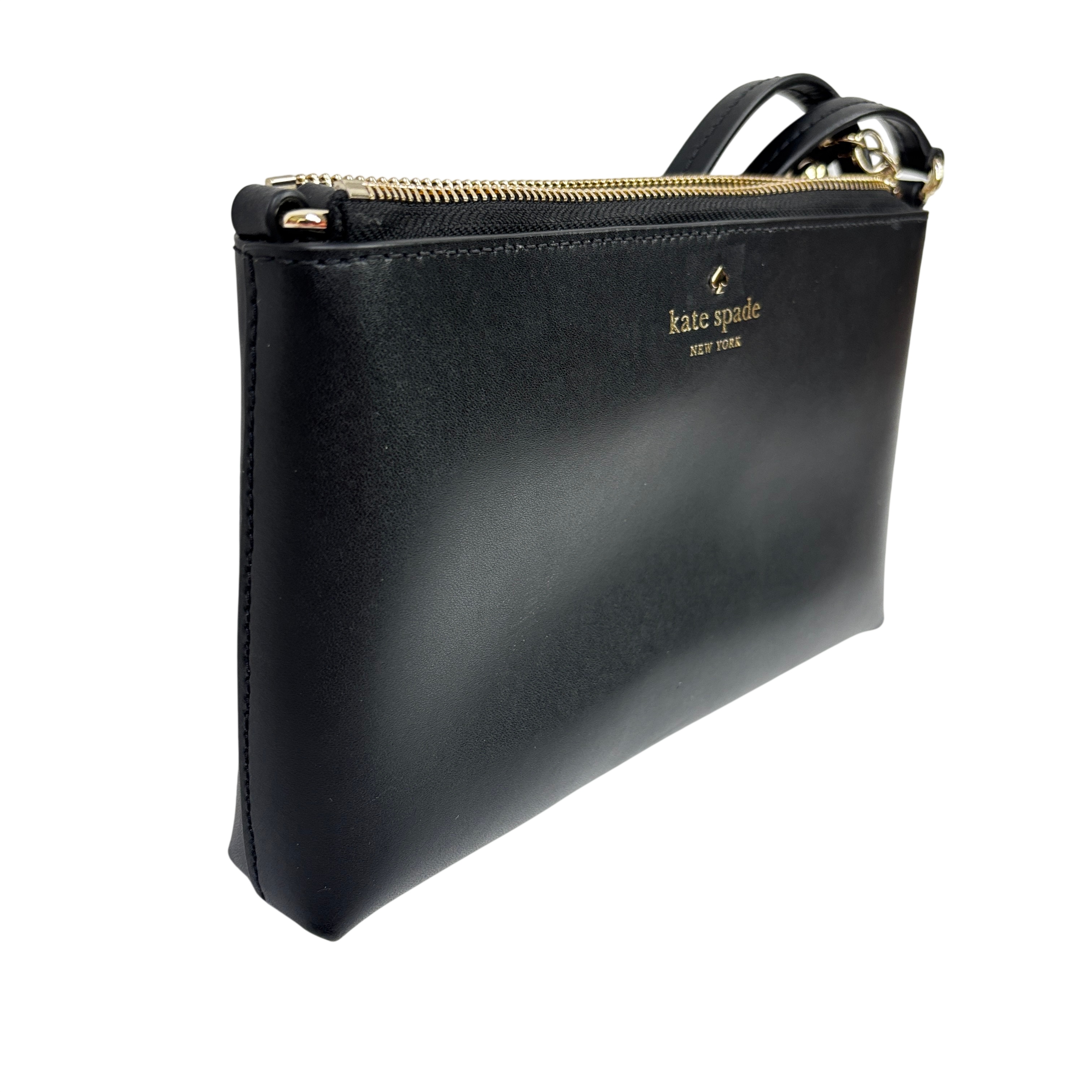 The Kate Spade New York Ivy Street Amy is a sleek, black smooth leather rectangular crossbody bag. It features gold-plated hardware, a distinctive leather tassel zip pull, and a 22-inch adjustable strap. Compact yet functional, it includes a top zip closure, interior lining, and a foil-embossed logo