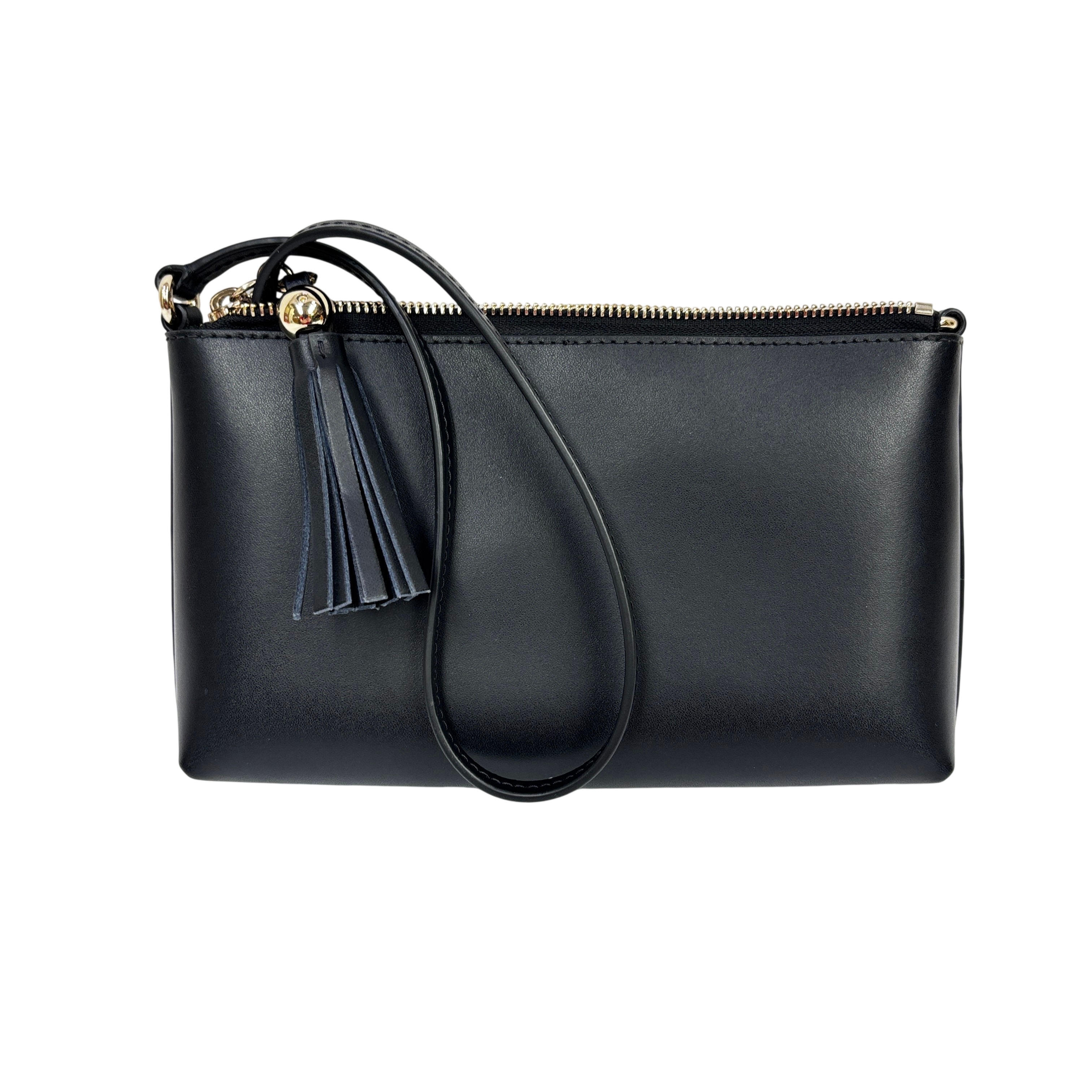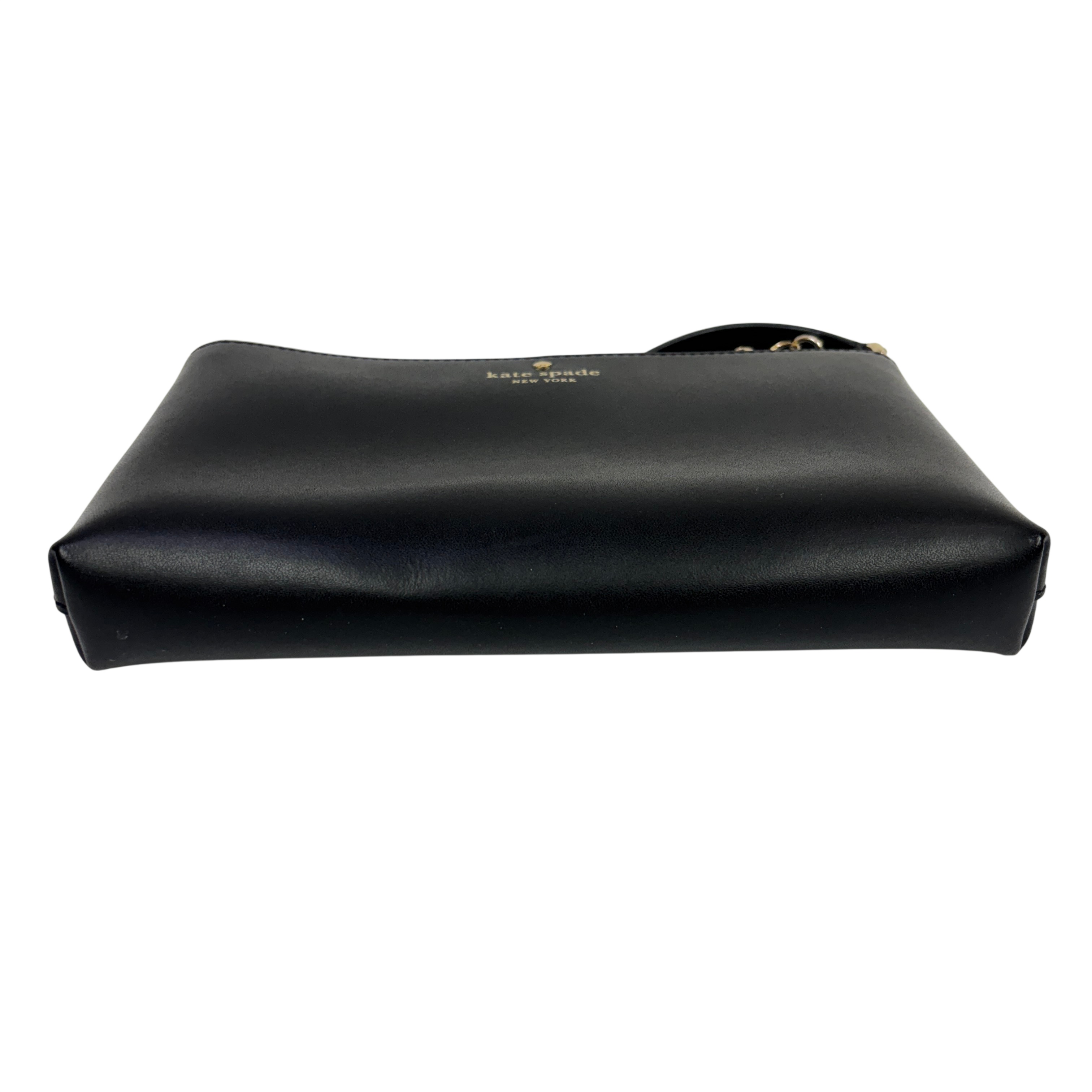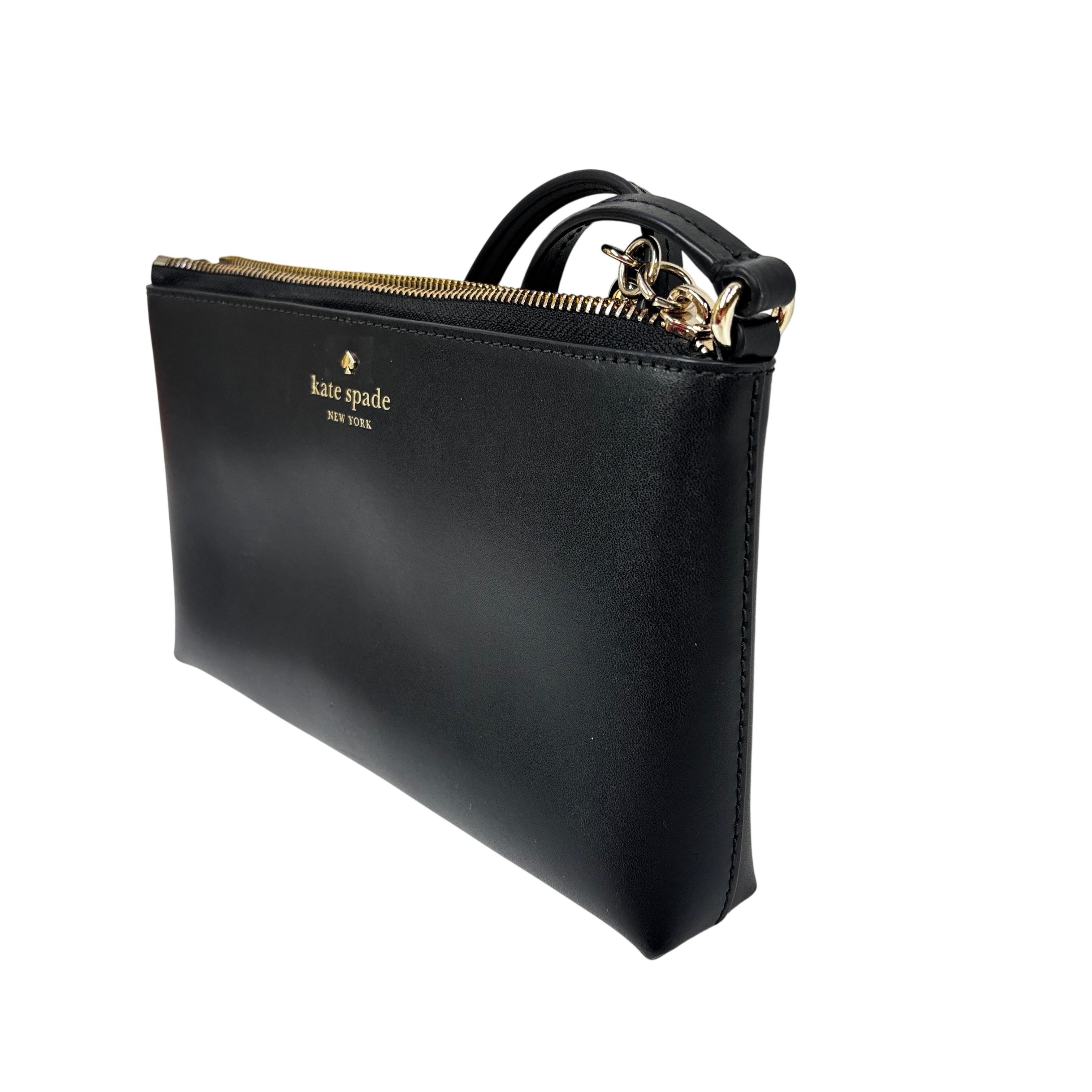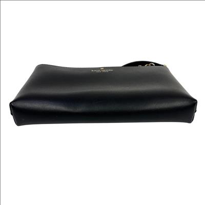 The Kate Spade New York Ivy Street Amy is a sleek, black smooth leather rectangular crossbody bag. It features gold-plated hardware, a distinctive leather tassel zip pull, and a 22-inch adjustable strap. Compact yet functional, it includes a top zip closure, interior lining, and a foil-embossed logo