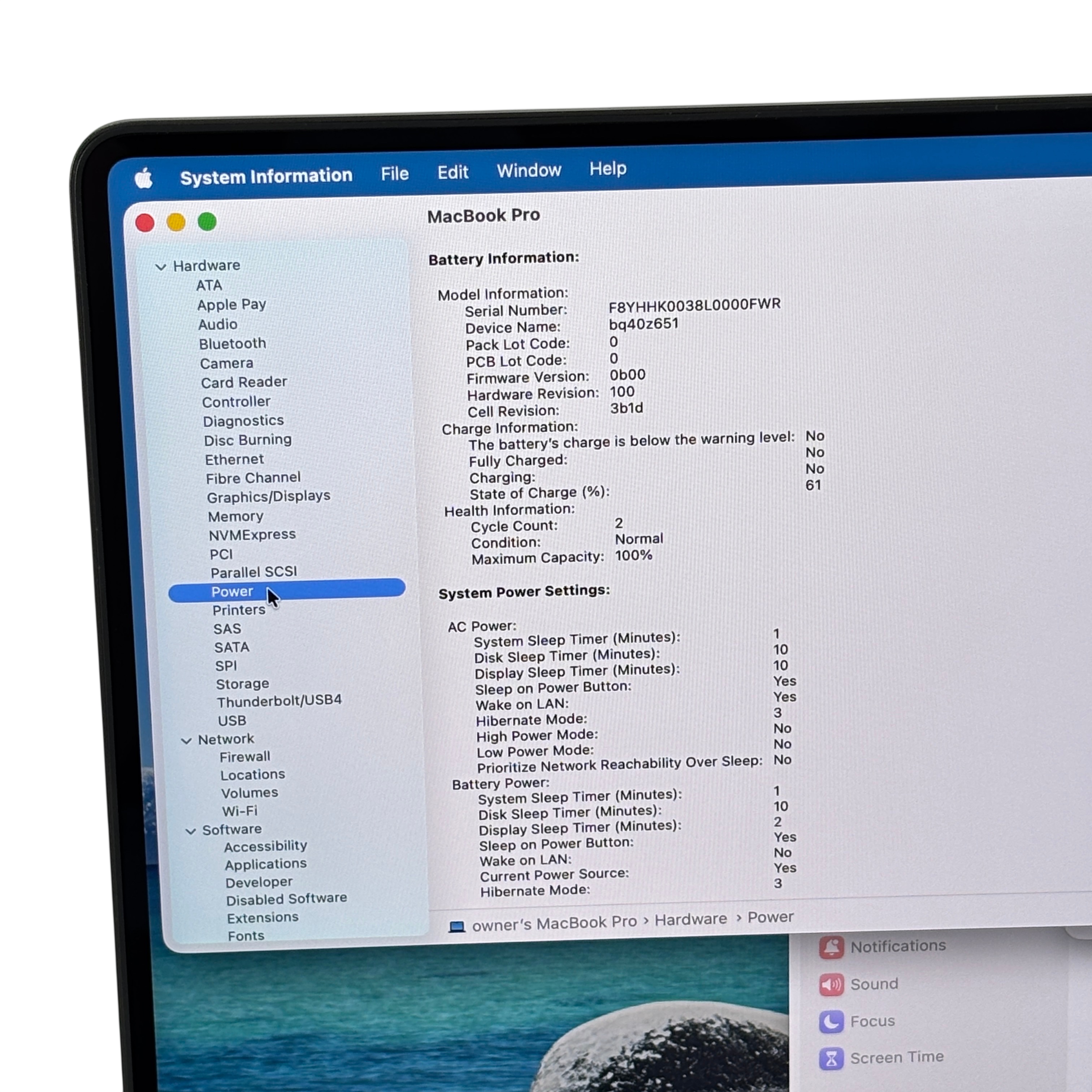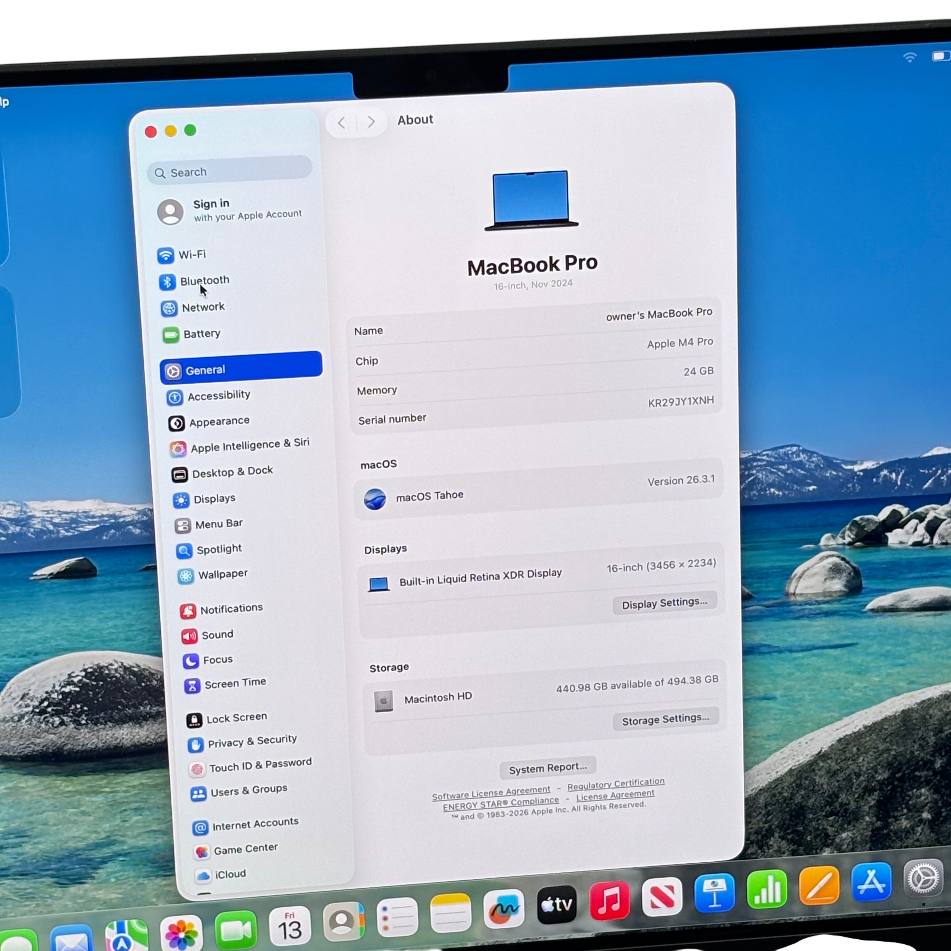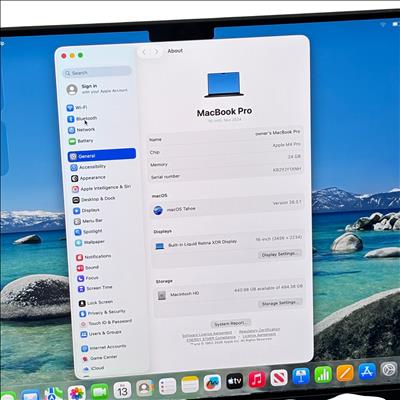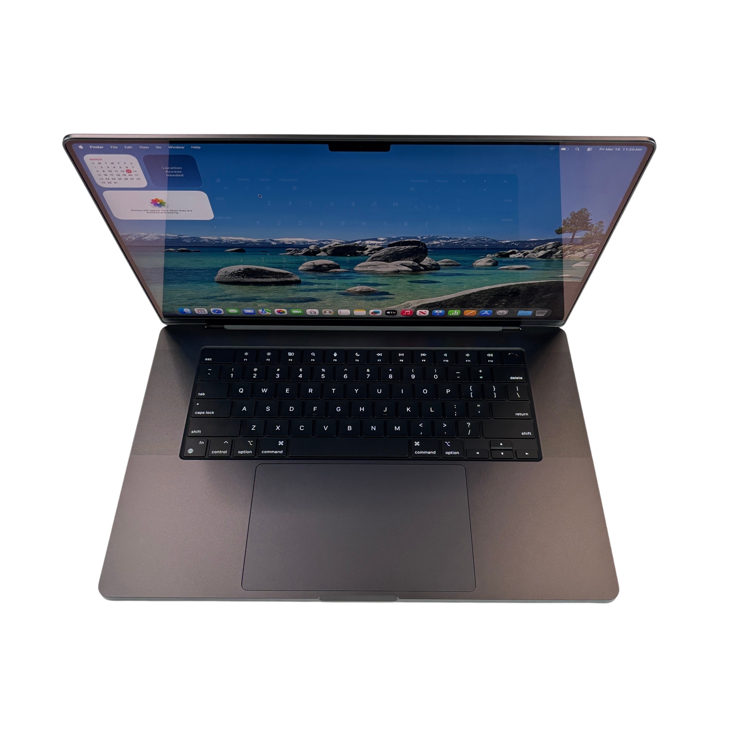 The 2024 Apple MacBook Pro 16-Inch features a 4.5 GHz Apple M4 Pro processor with 14 CPU cores and a 20-core GPU, paired with 24GB of RAM and a 512GB SSD. It has a 16.2" Liquid Retina XDR display with 3456x2234 resolution, 1,000,000:1 contrast ratio, and up to 1600 nits peak brightness. The laptop includes a 12MP Center Stage camera, six-speaker high-fidelity sound system with force-cancelling woofers, backlit keyboard with Touch ID, and a Force Touch trackpad. Connectivity options include Wi-Fi 6E, Bluetooth 5.3, three Thunderbolt 5 ports, HDMI 2.1, SDXC card slot, 3.5mm headphone jack, and MagSafe 3 charging.