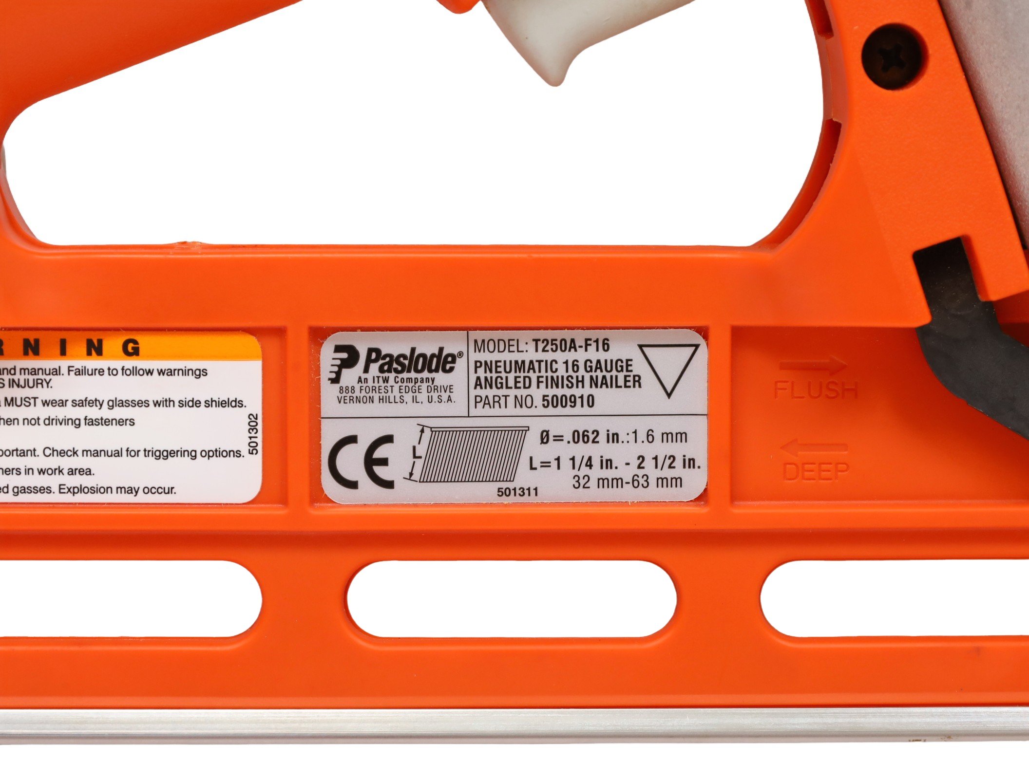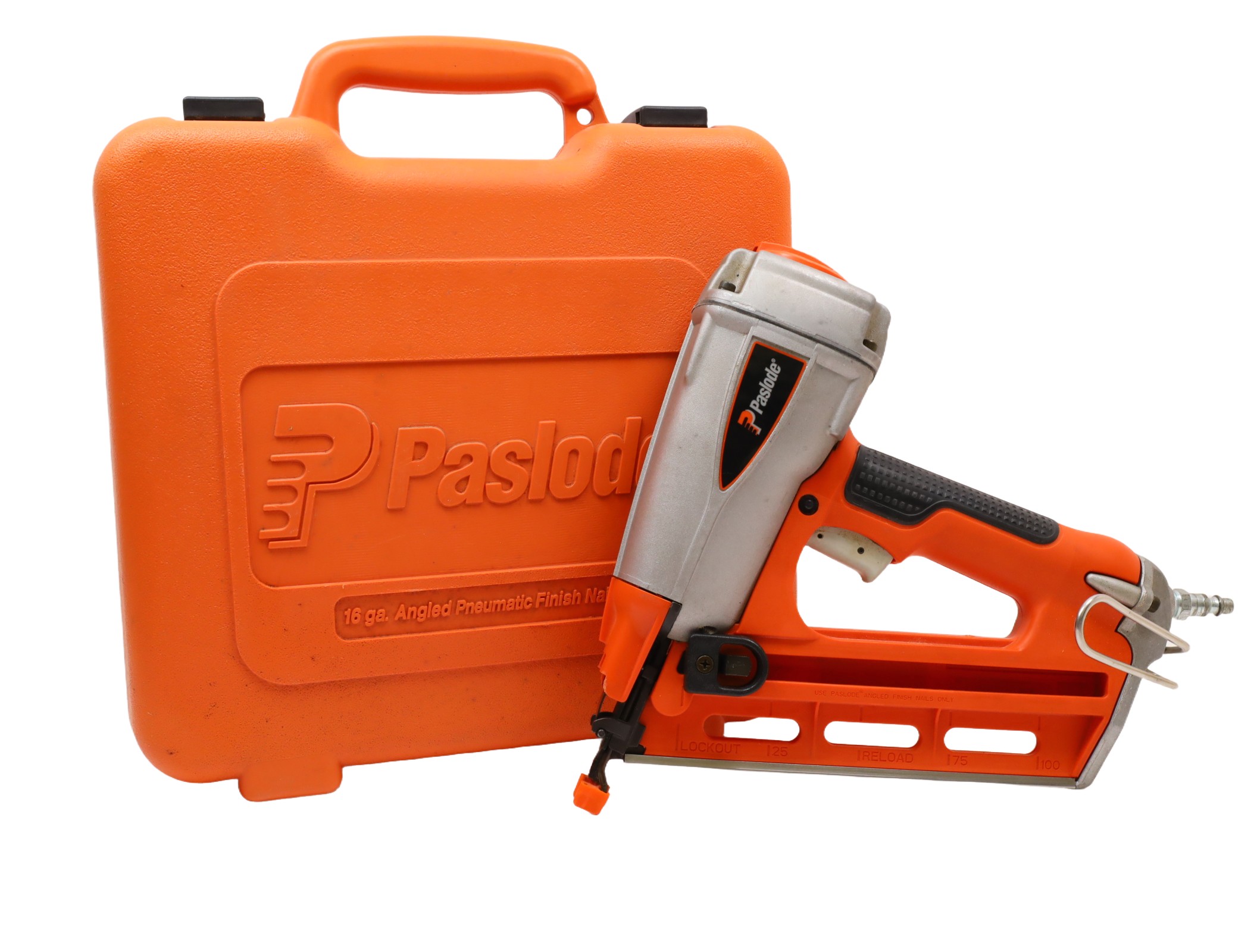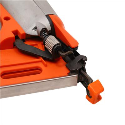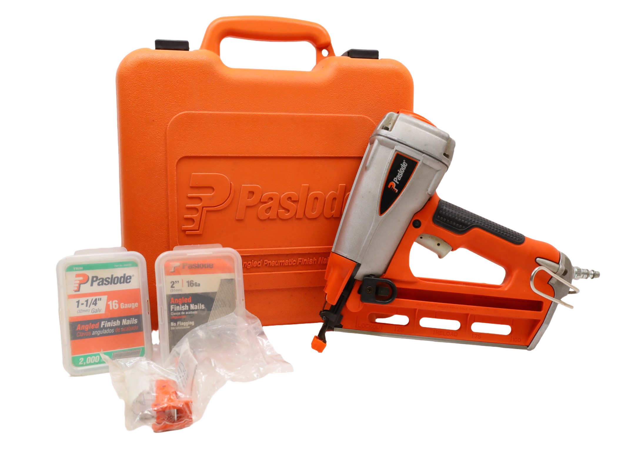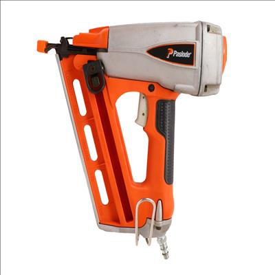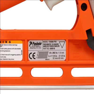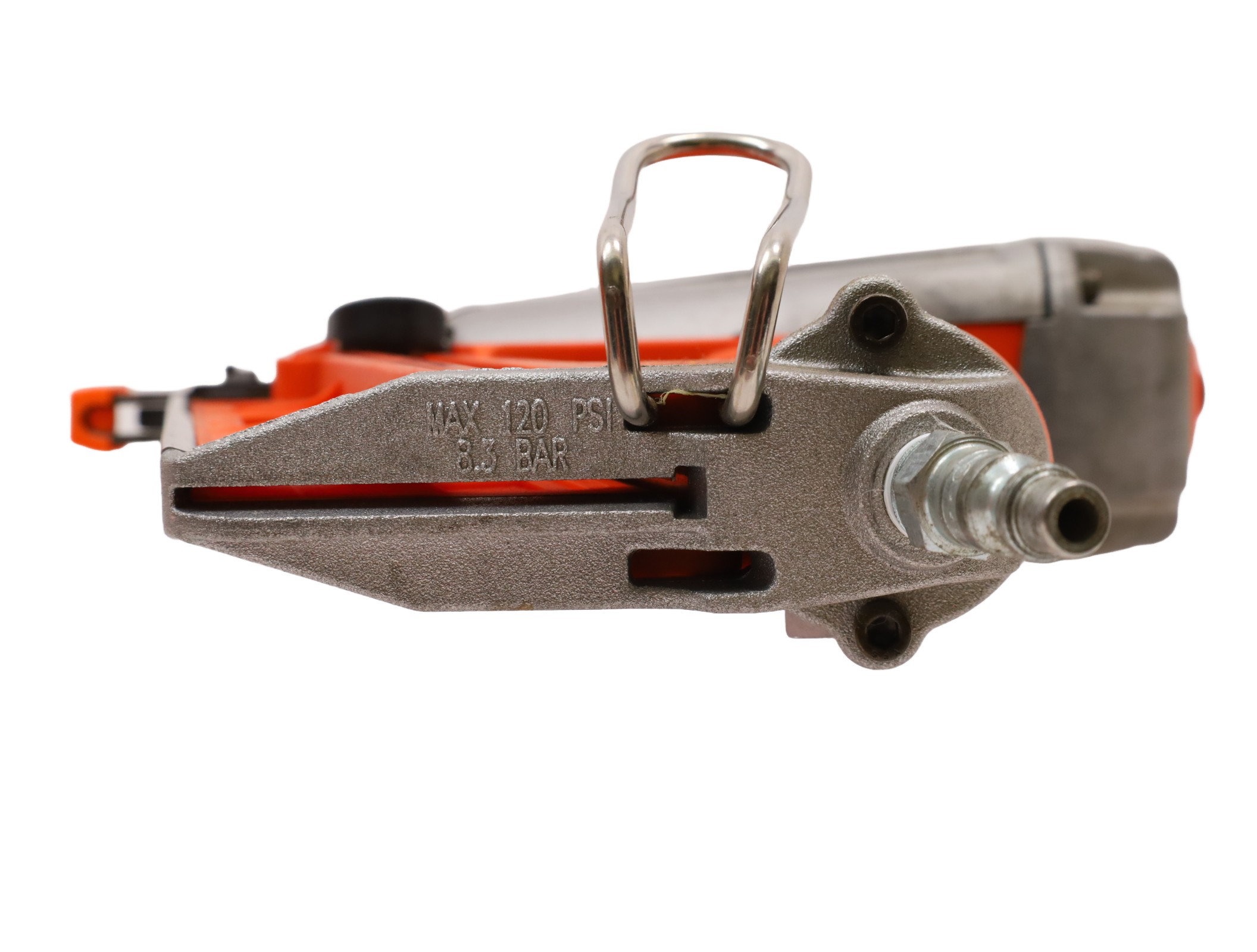 A 16-gauge pneumatic air angled finish nailer designed for fasteners ranging from 1-1/4 inches to 2-1/2 inches. It features a magnesium housing and operates within a pressure range of 80 to 120 PSI through a 3/8-inch NPT air inlet. The tool utilizes a trigger actuated firing type and drives 16 gauge nails to reduce wood splitting and leave smaller nail holes. This compact angled trim tool reaches into tighter areas compared to straight finish tools and weighs less than 4 pounds to assist in reducing user fatigue. The construction is durable and rugged for job site demands.