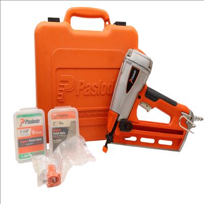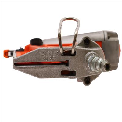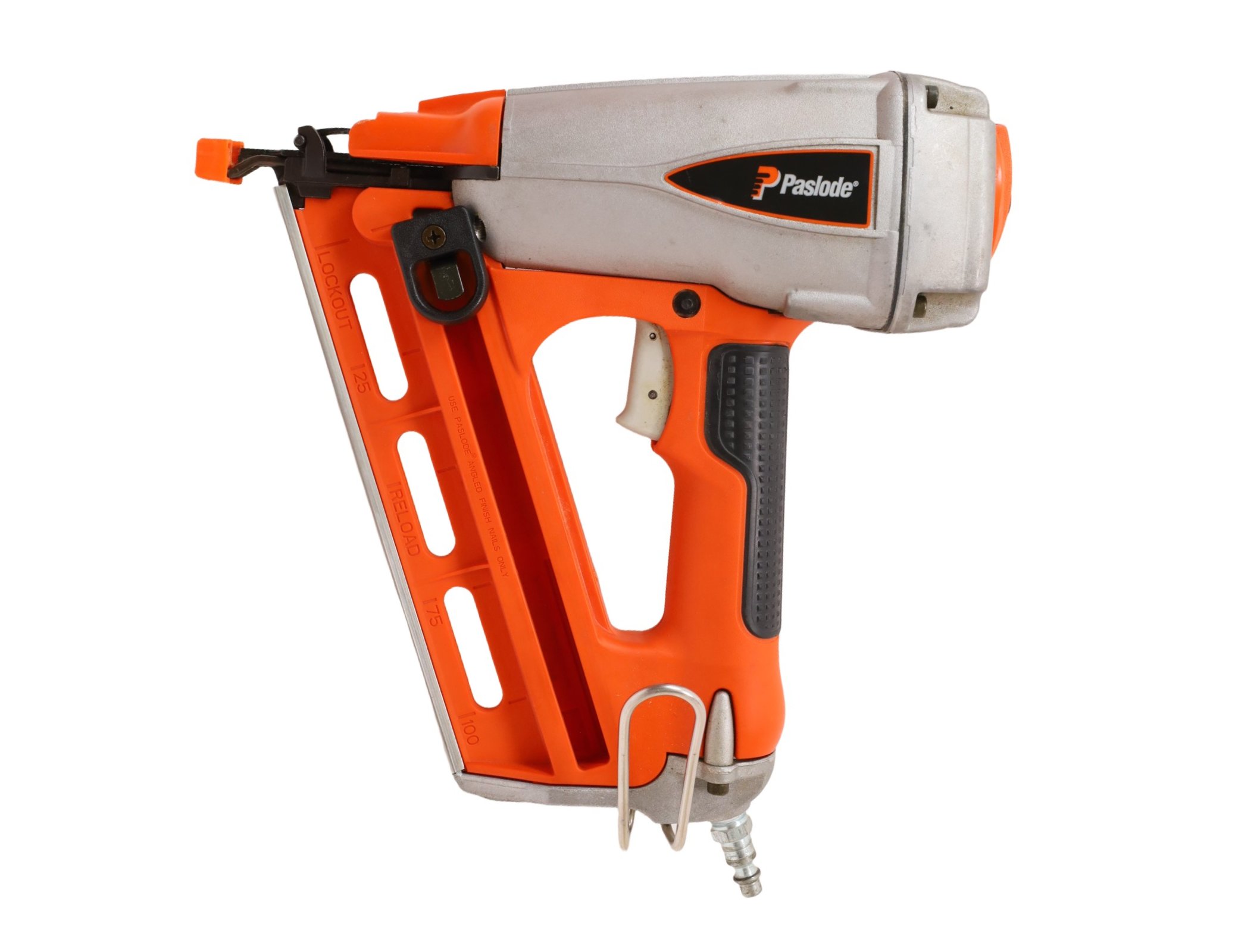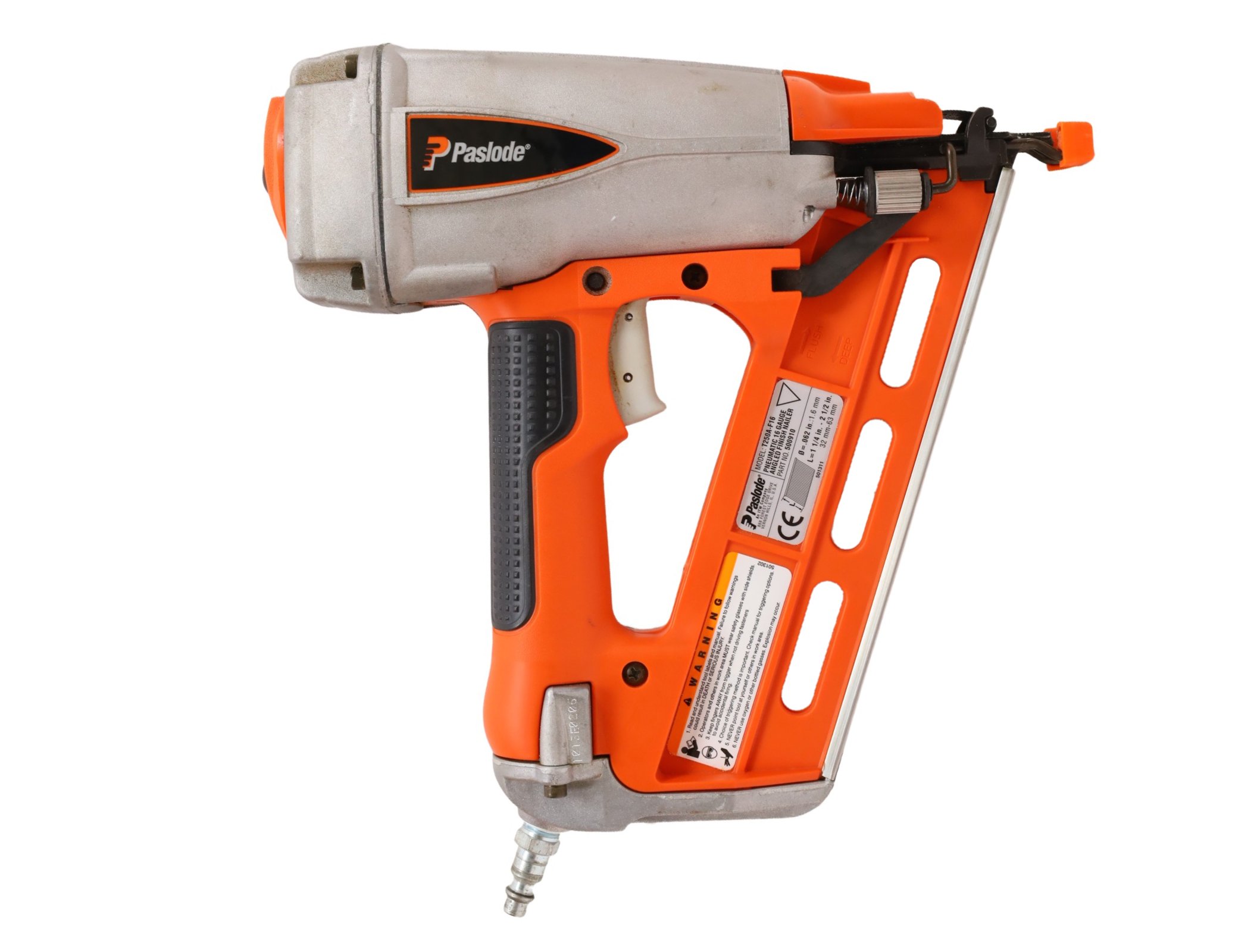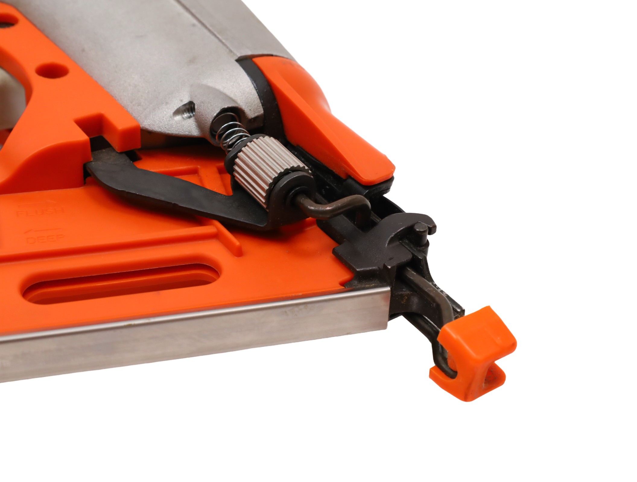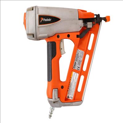 A 16-gauge pneumatic air angled finish nailer designed for fasteners ranging from 1-1/4 inches to 2-1/2 inches. It features a magnesium housing and operates within a pressure range of 80 to 120 PSI through a 3/8-inch NPT air inlet. The tool utilizes a trigger actuated firing type and drives 16 gauge nails to reduce wood splitting and leave smaller nail holes. This compact angled trim tool reaches into tighter areas compared to straight finish tools and weighs less than 4 pounds to assist in reducing user fatigue. The construction is durable and rugged for job site demands.