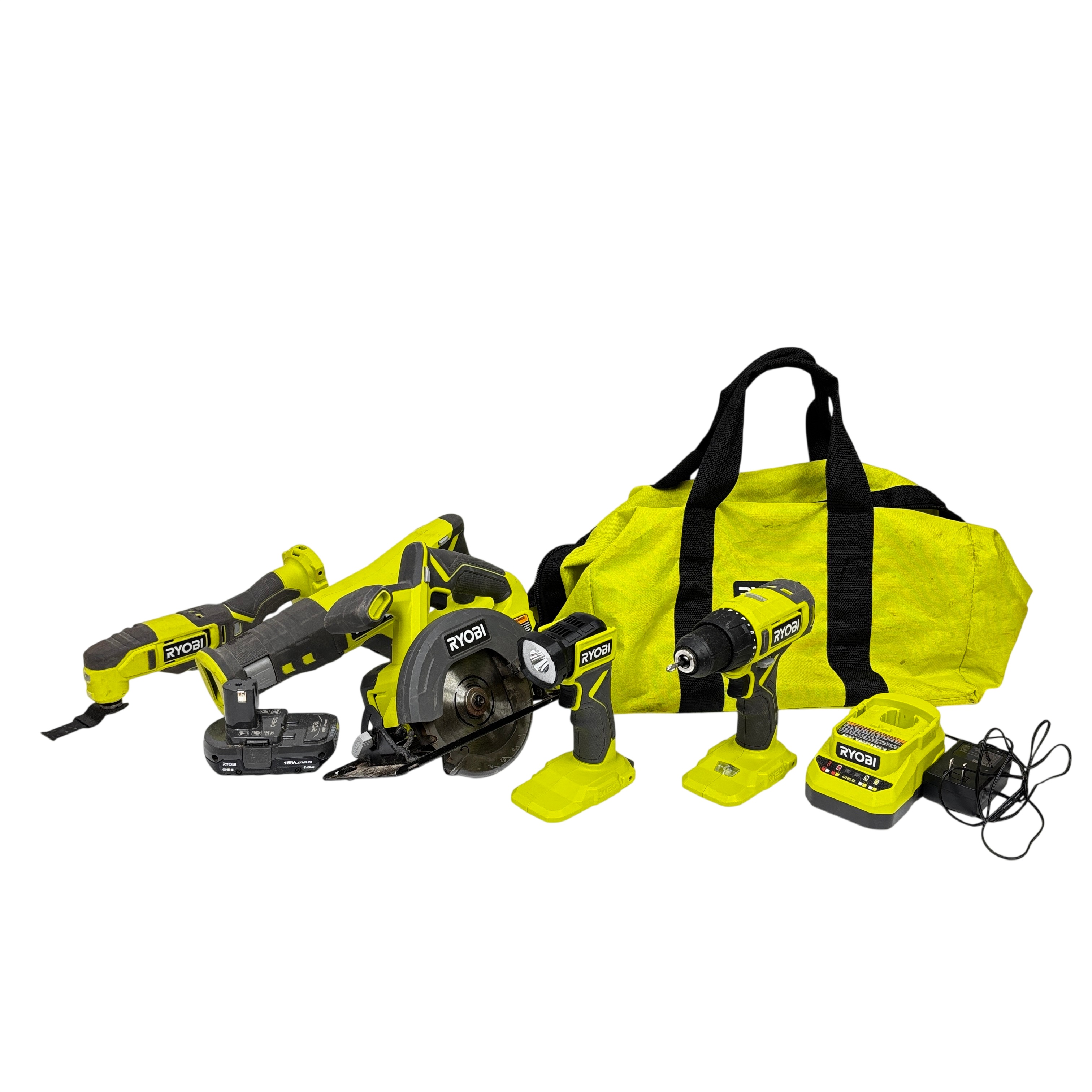 The Ryobi 18V Cordless 5-Piece Tool Set offers a versatile collection of power tools designed for both DIY enthusiasts and professionals. Featuring an 18V lithium-ion cordless drill with a 1/2 inch keyless chuck, this kit also includes a flashlight, circular saw, oscillating multi-tool, battery charger, and a durable carrying bag. Each tool is designed for ease of use with variable speed control and LED lighting on the drill for enhanced visibility. This compact and lightweight set provides reliable performance and convenience for a wide range of home improvement and repair projects.