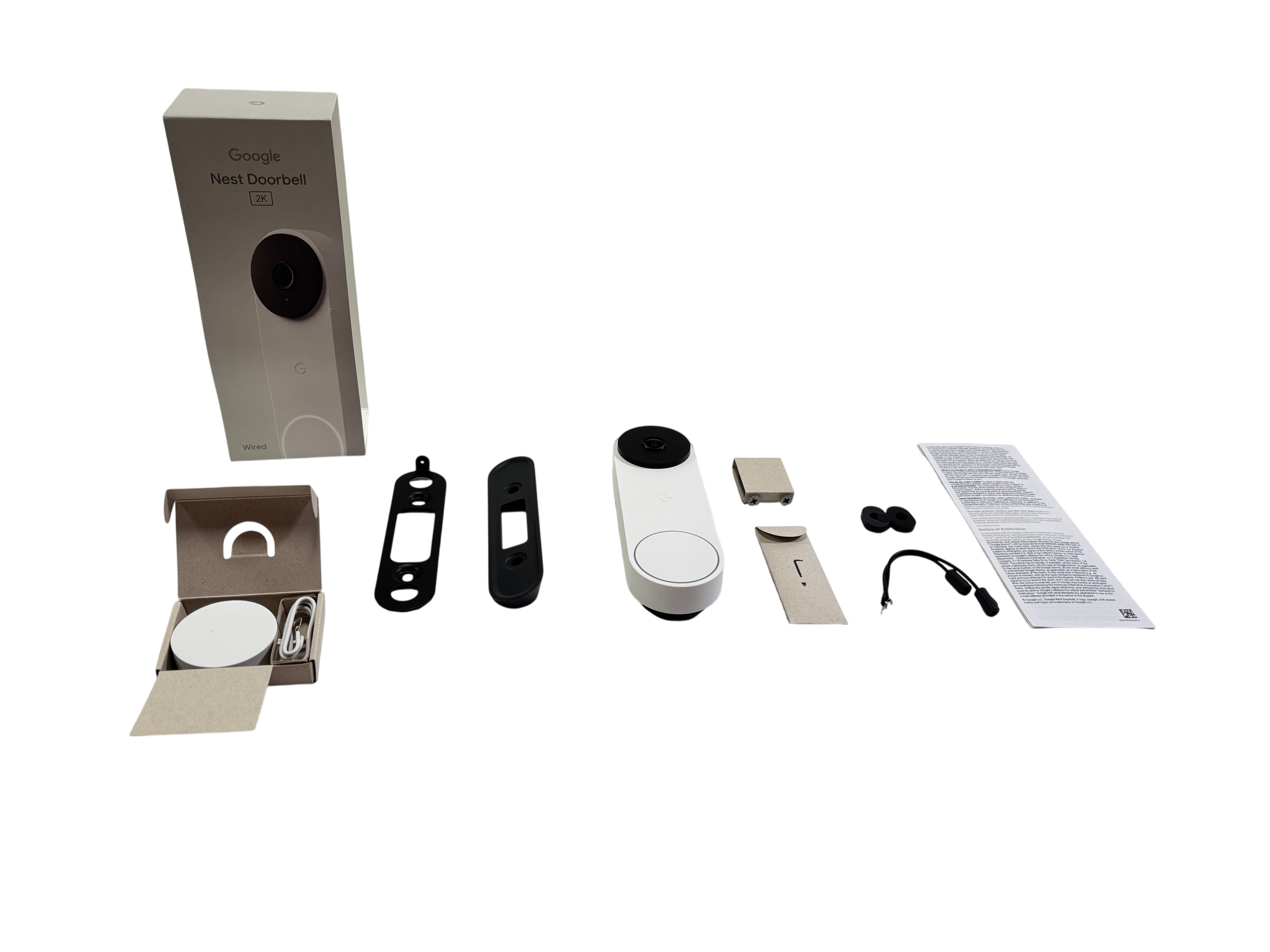 Google Nest Doorbell G6PPP is a wired smart doorbell camera featuring 2K video resolution for clear and detailed video monitoring. This device includes night vision, motion detection, and two-way audio to help you see and communicate with visitors from anywhere. The package comes complete with mounting brackets, chime connector, security screw, and a USB cable for setup. Ideal for enhancing home security with seamless Google Assistant compatibility and reliable wired power.